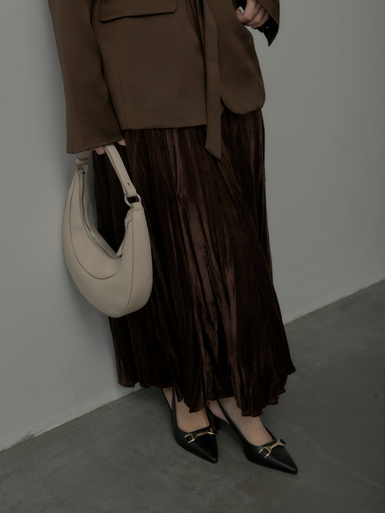 艶のあるベロア素材にワッシャープリーツ加工を施したスカート。軽やかな揺れ感と上品な光沢がシーズンムードを引き立てます。ウエストゴム仕様で穿き心地も良く、ニットやブラウスと合わせて幅広く活躍する一枚。