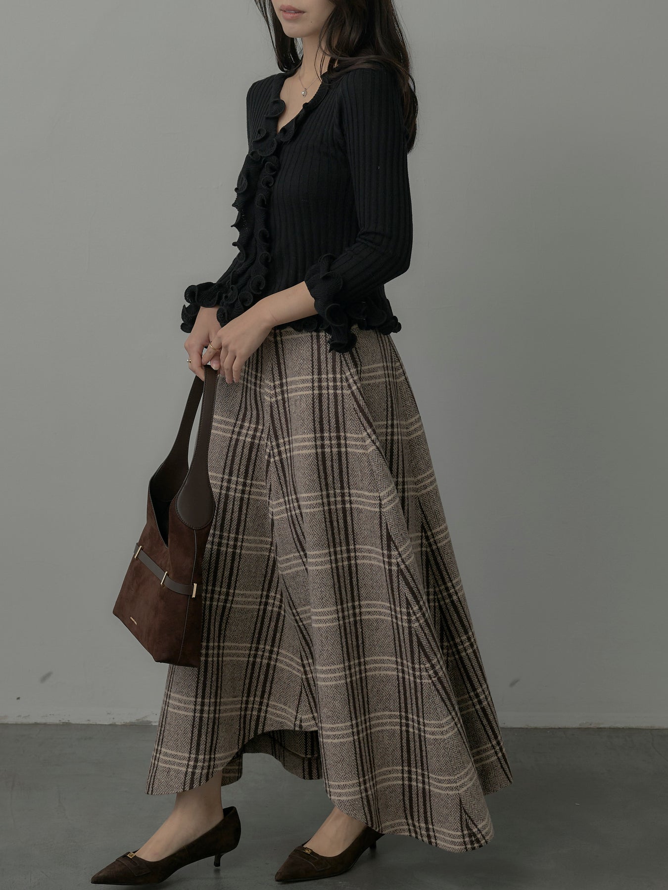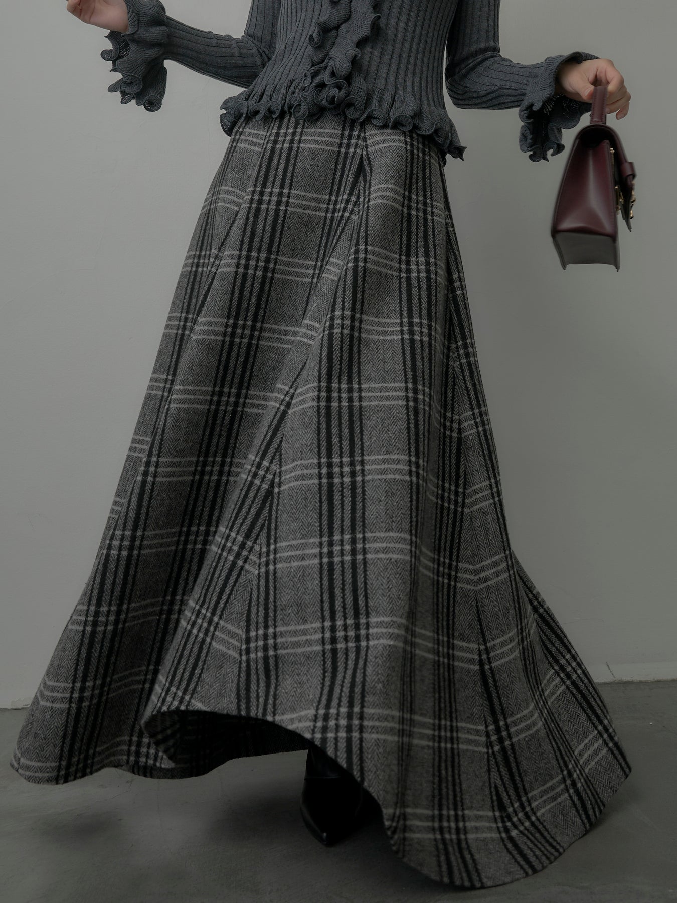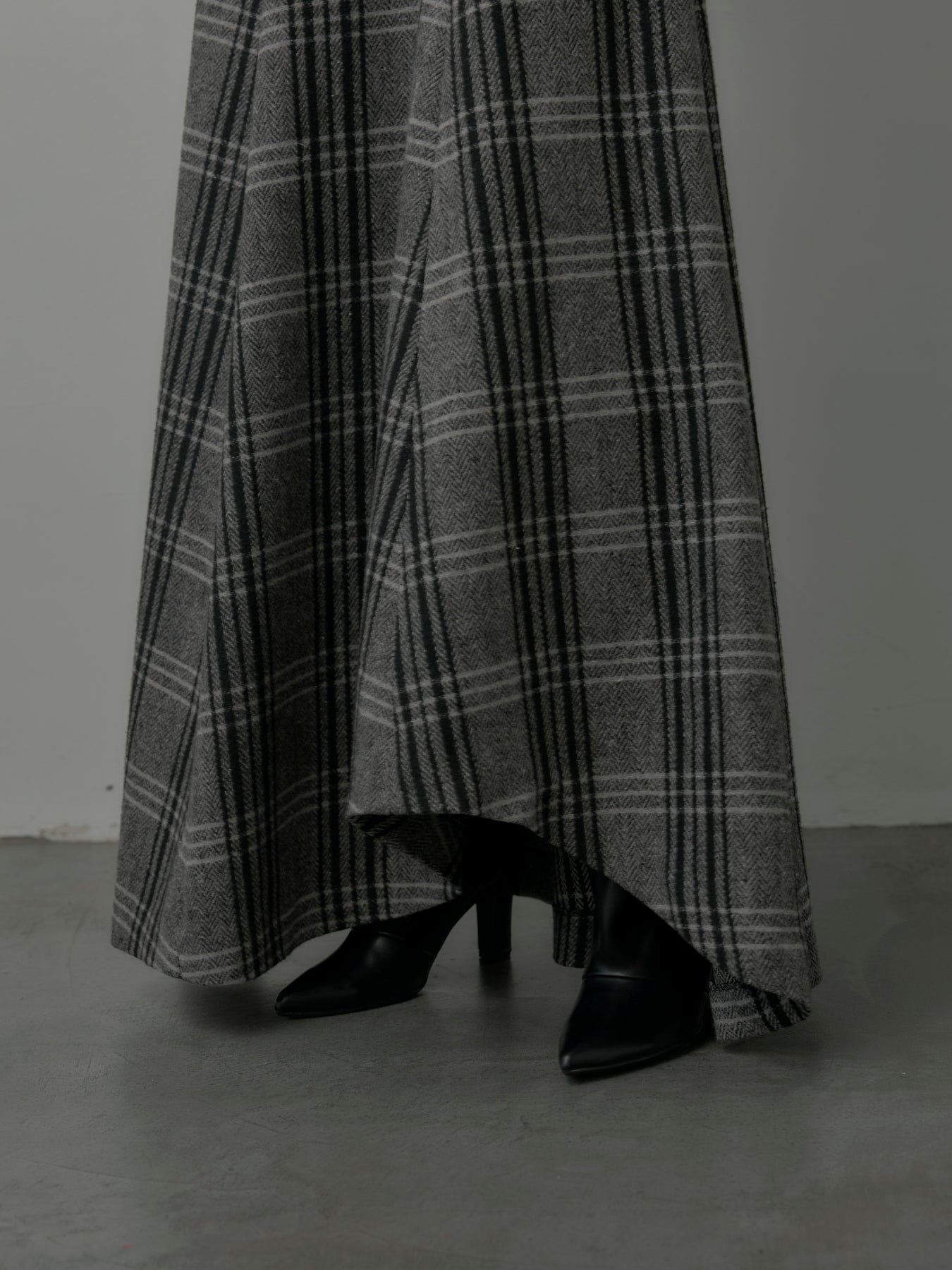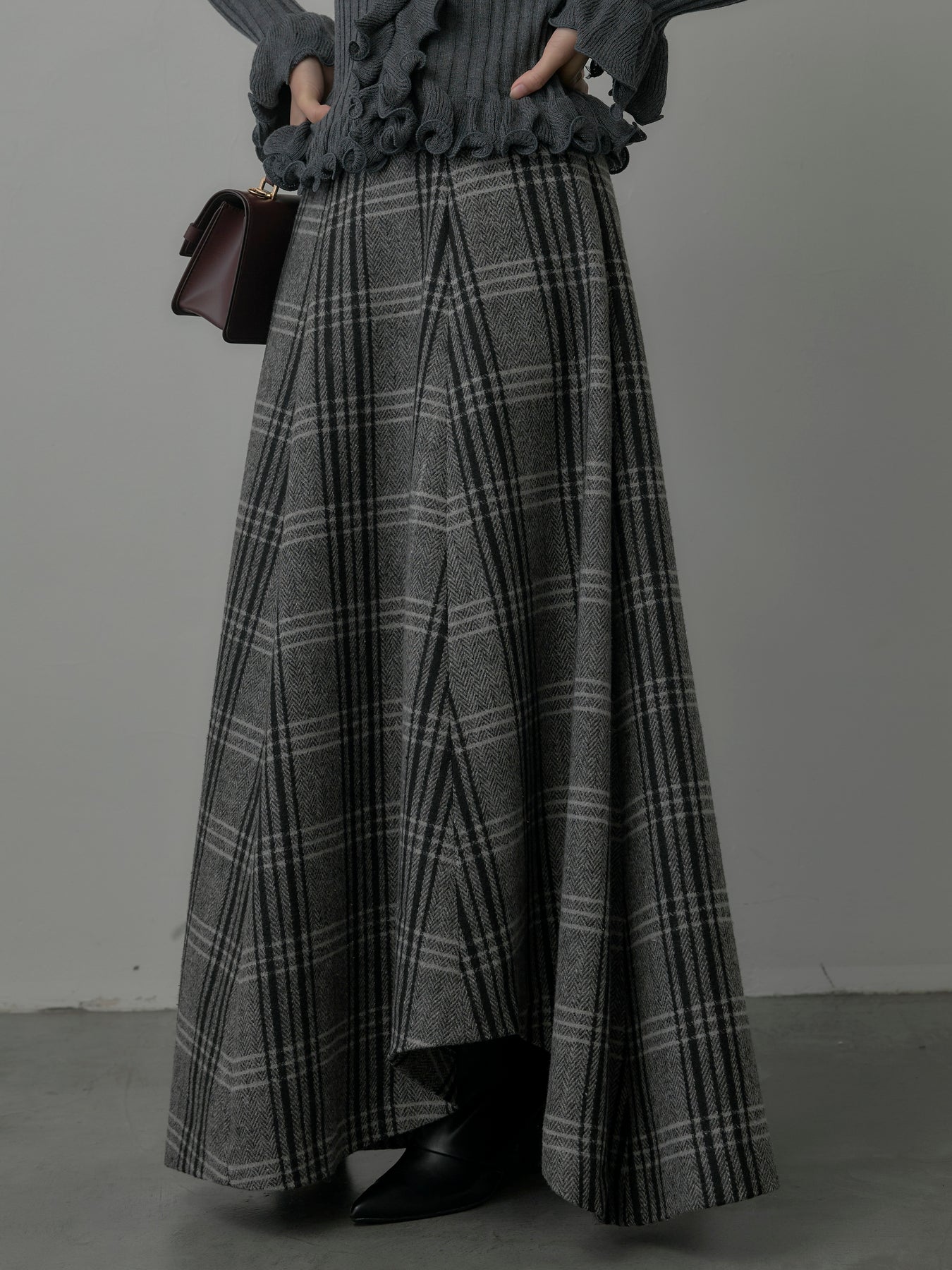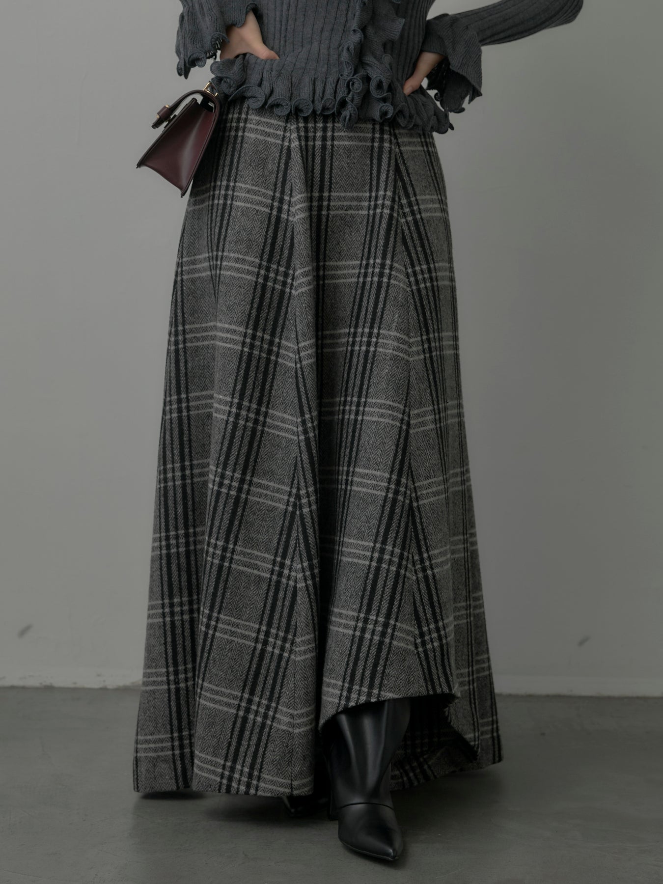 肉厚の生地をたっぷり使ったチェック柄スカート。フロント部分はあえて足首が見えるようにアシンメトリーのデザインに。
