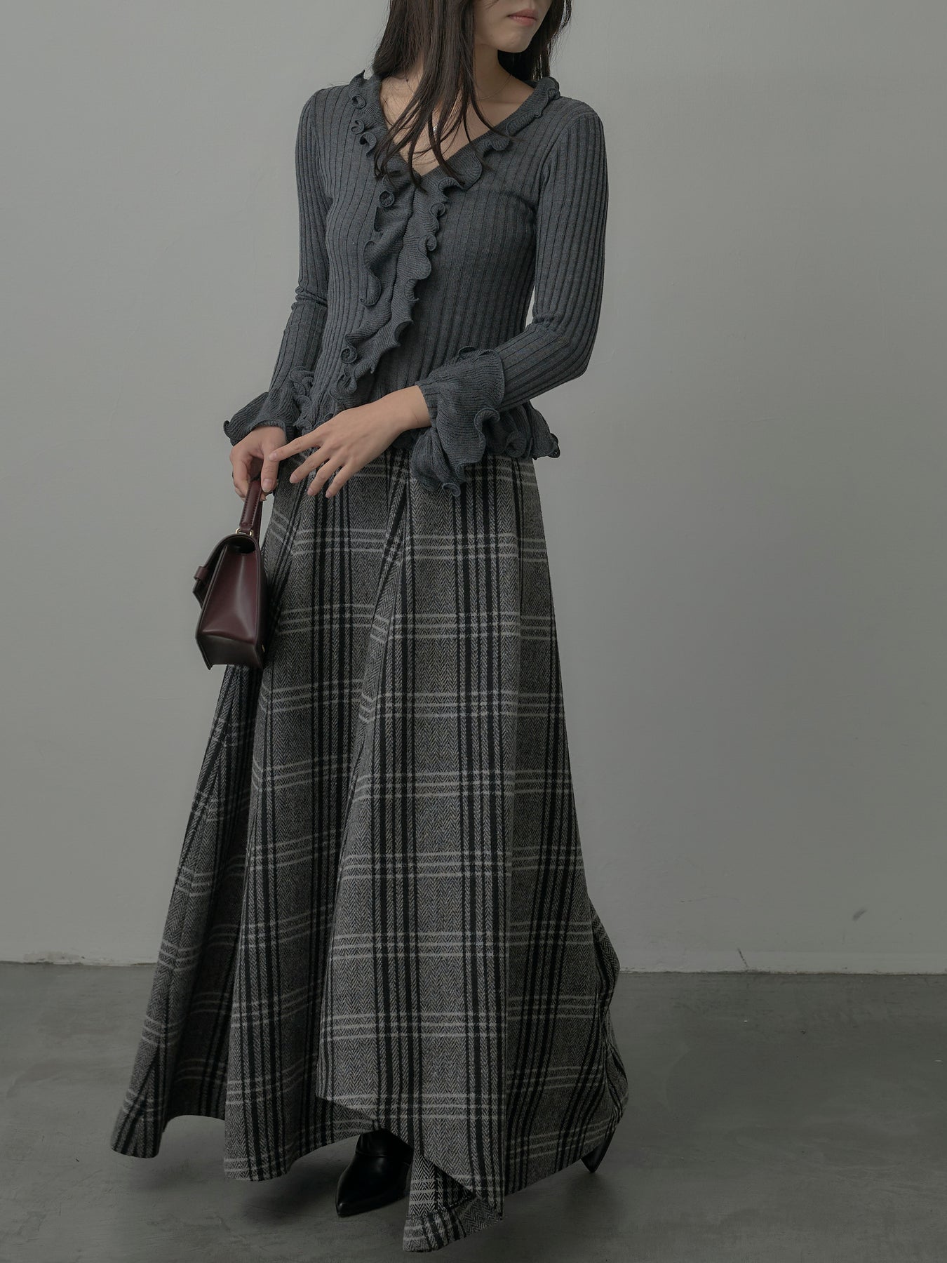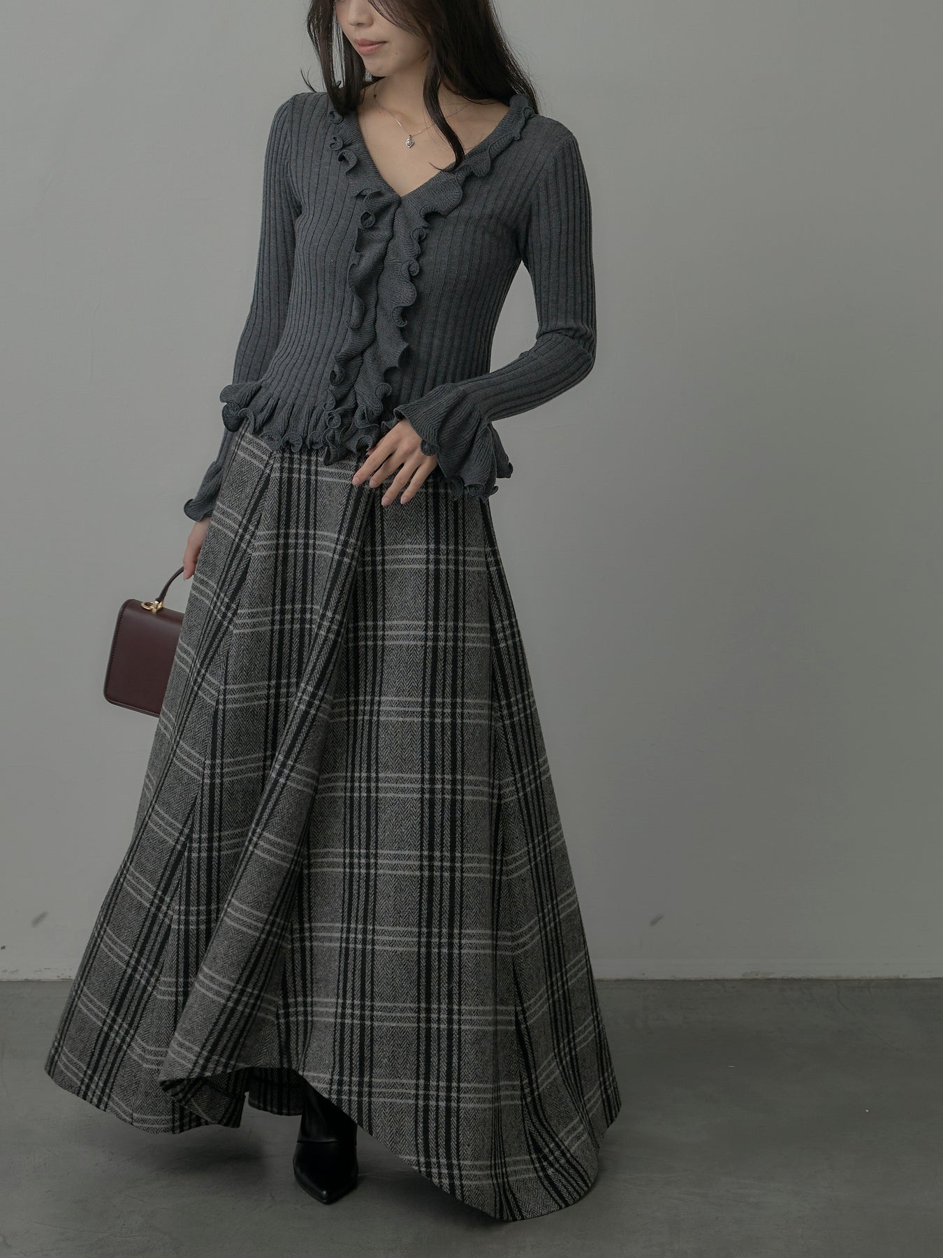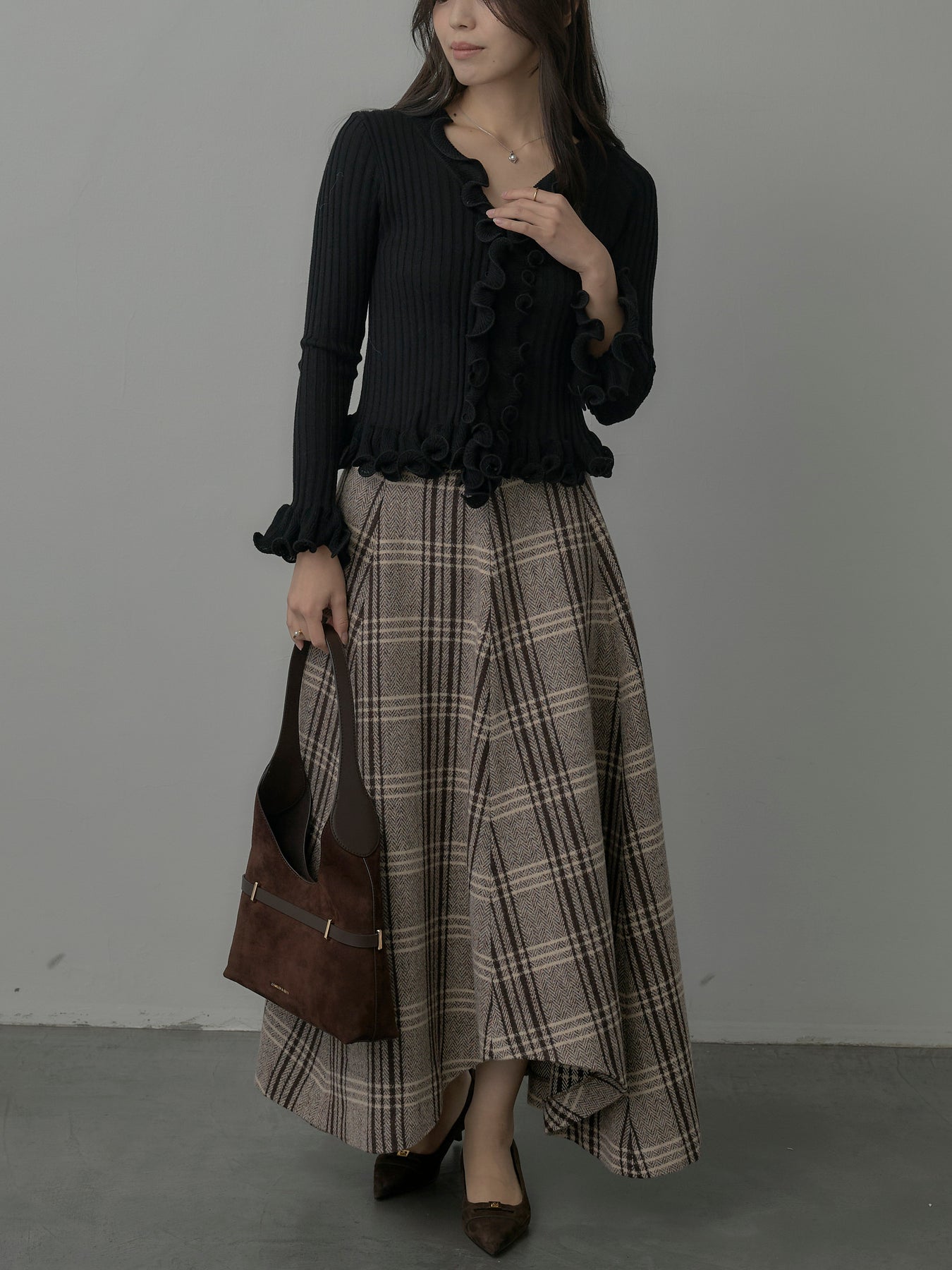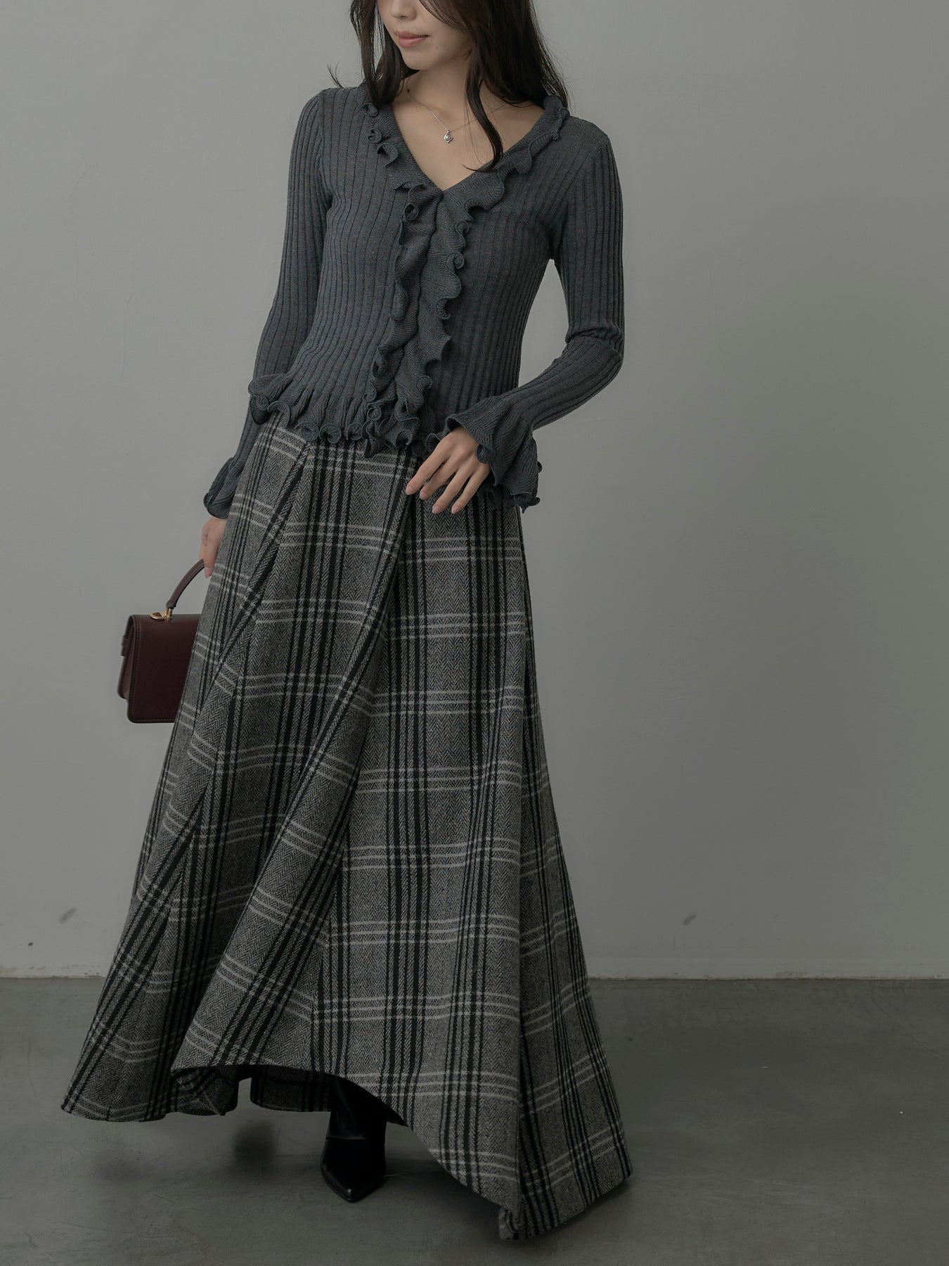 肉厚の生地をたっぷり使ったチェック柄スカート。フロント部分はあえて足首が見えるようにアシンメトリーのデザインに。