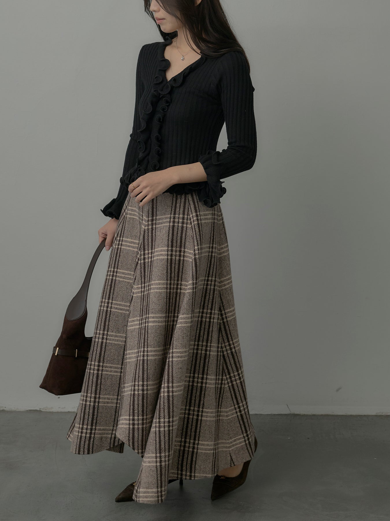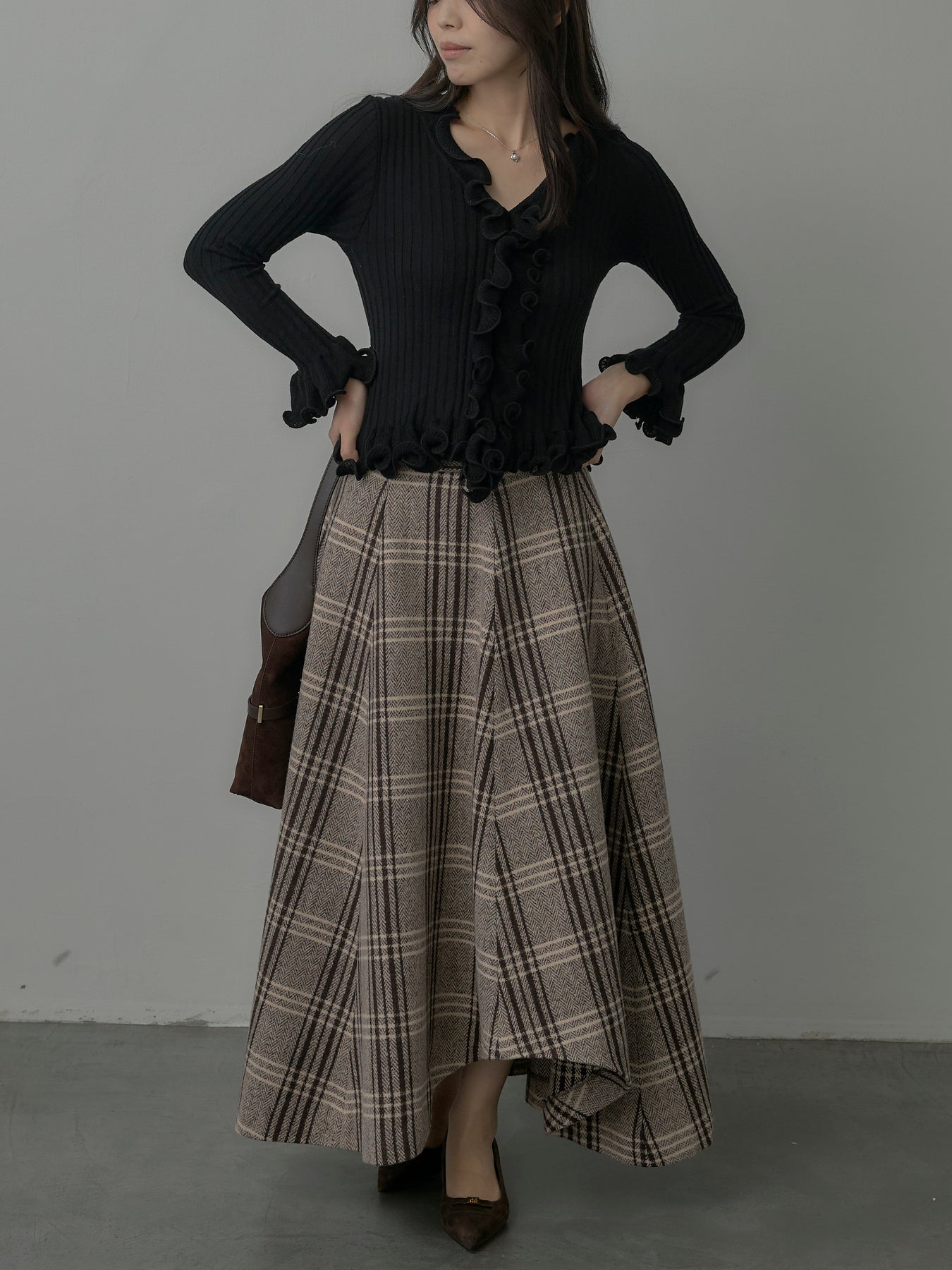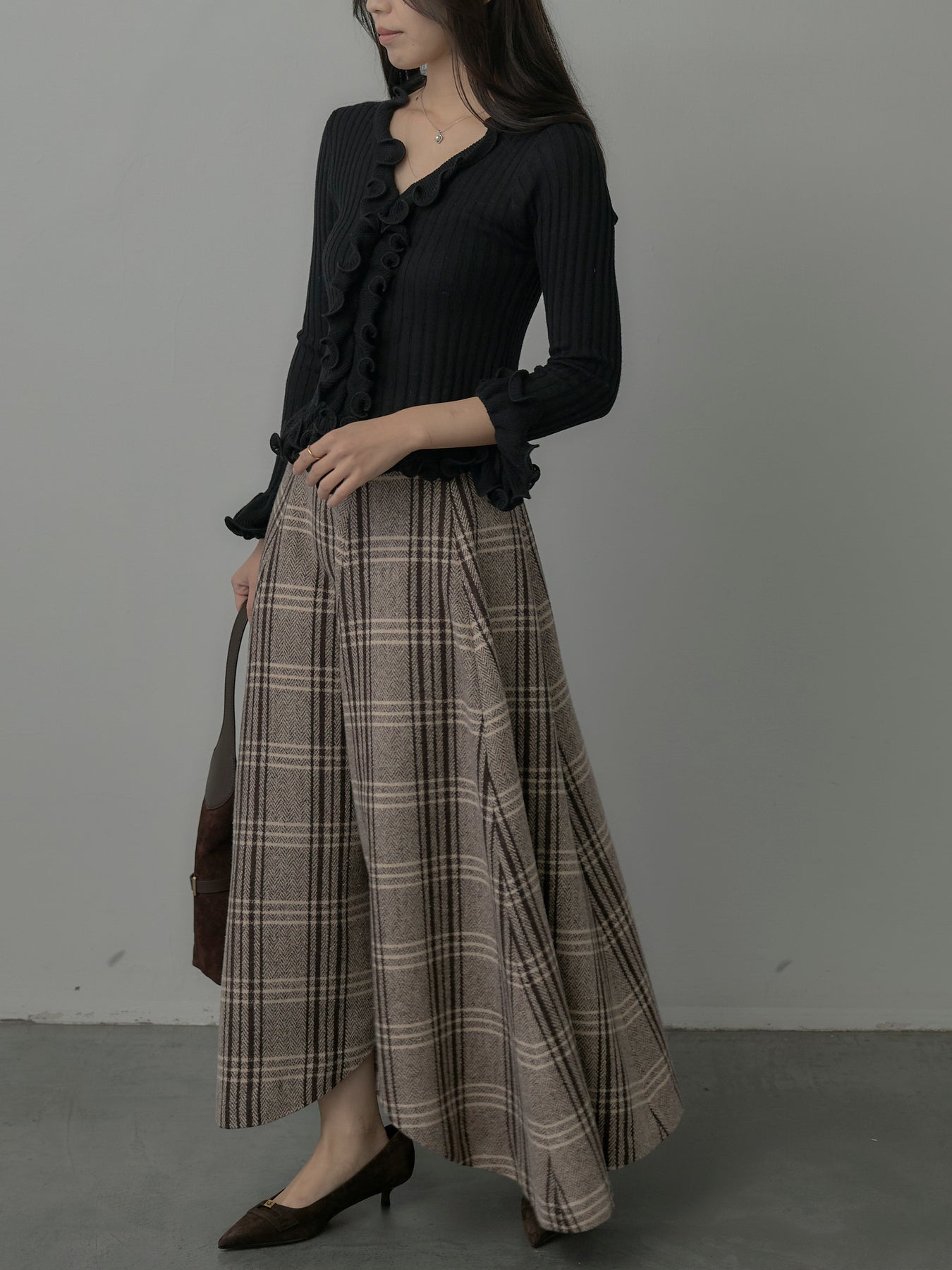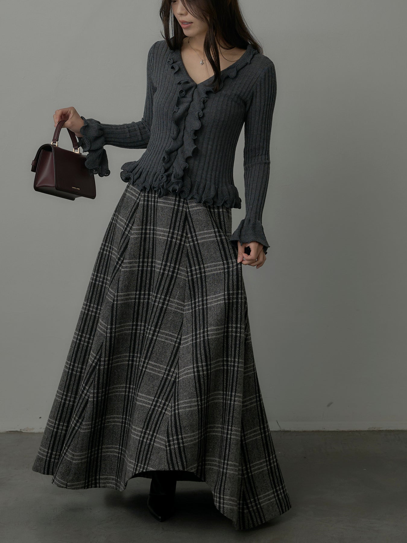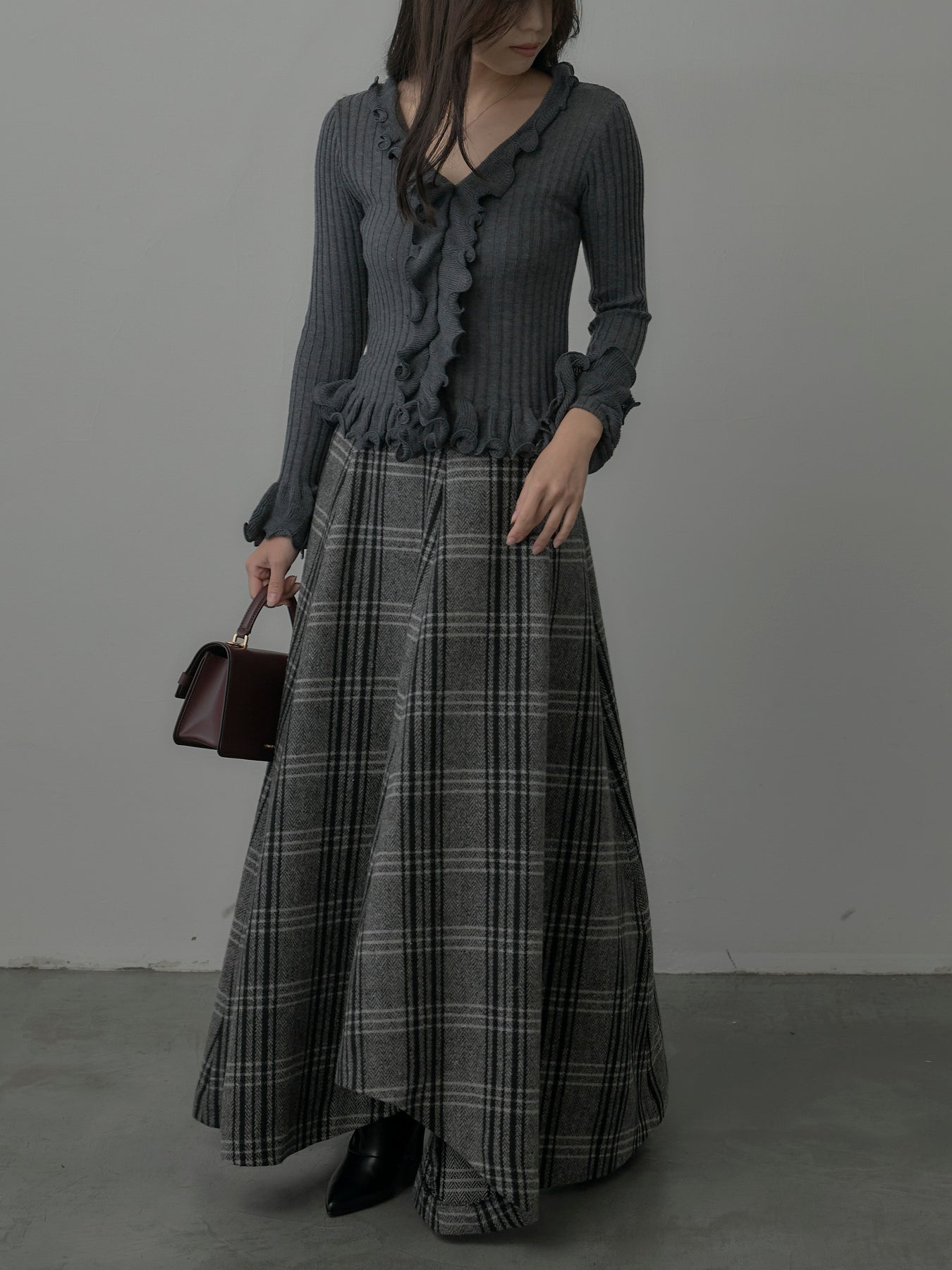 肉厚の生地をたっぷり使ったチェック柄スカート。フロント部分はあえて足首が見えるようにアシンメトリーのデザインに。