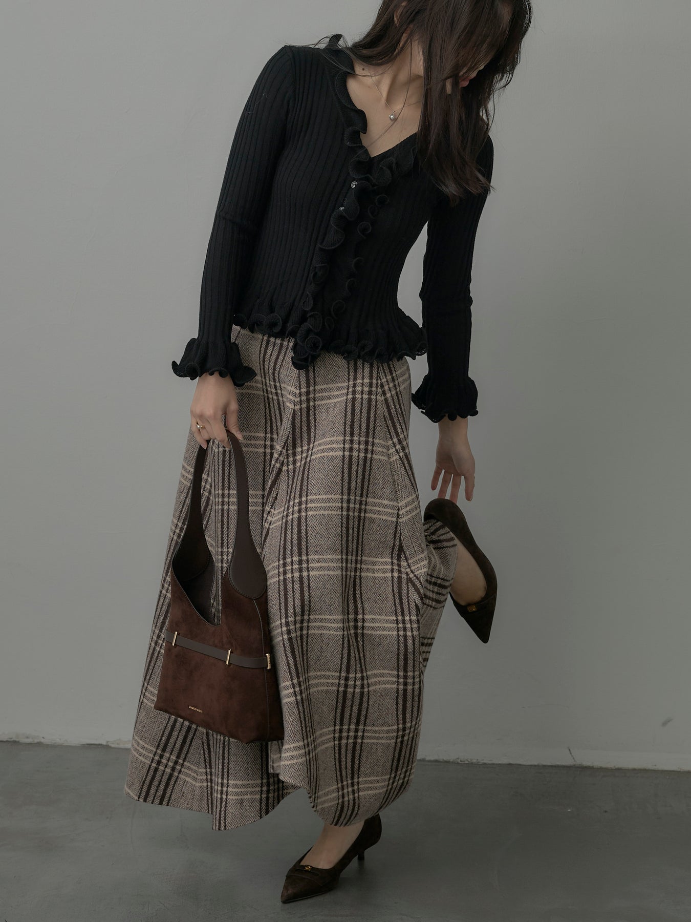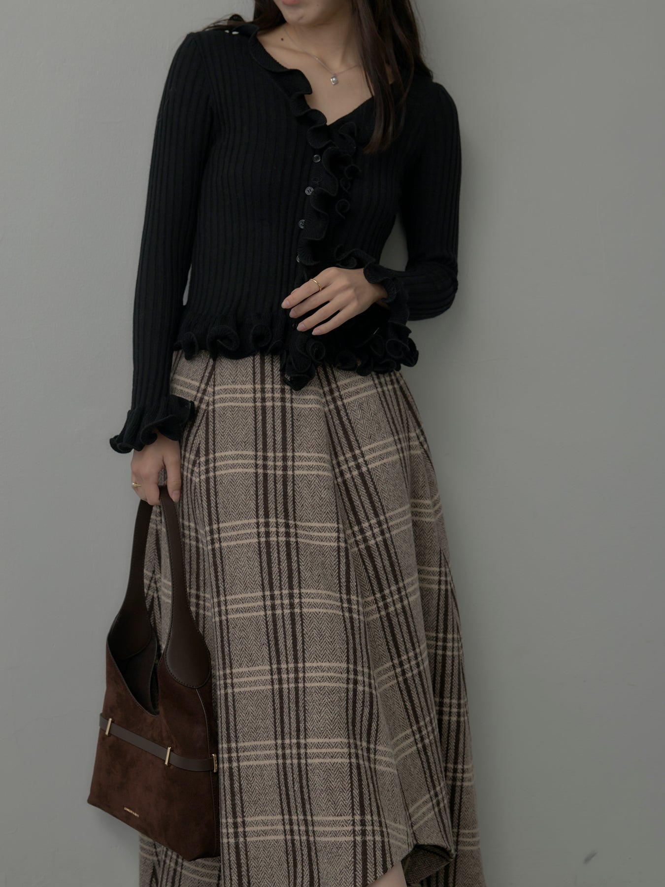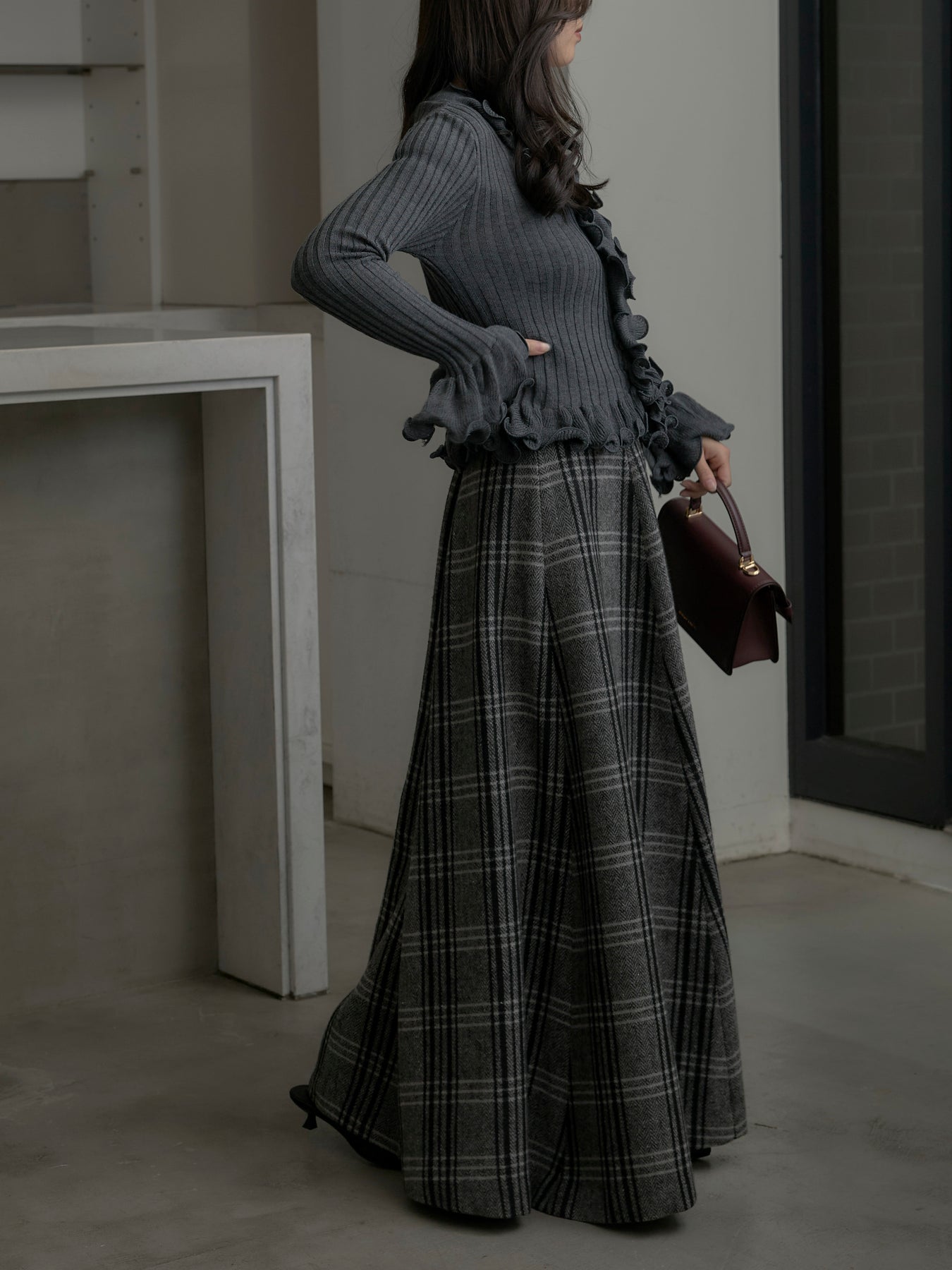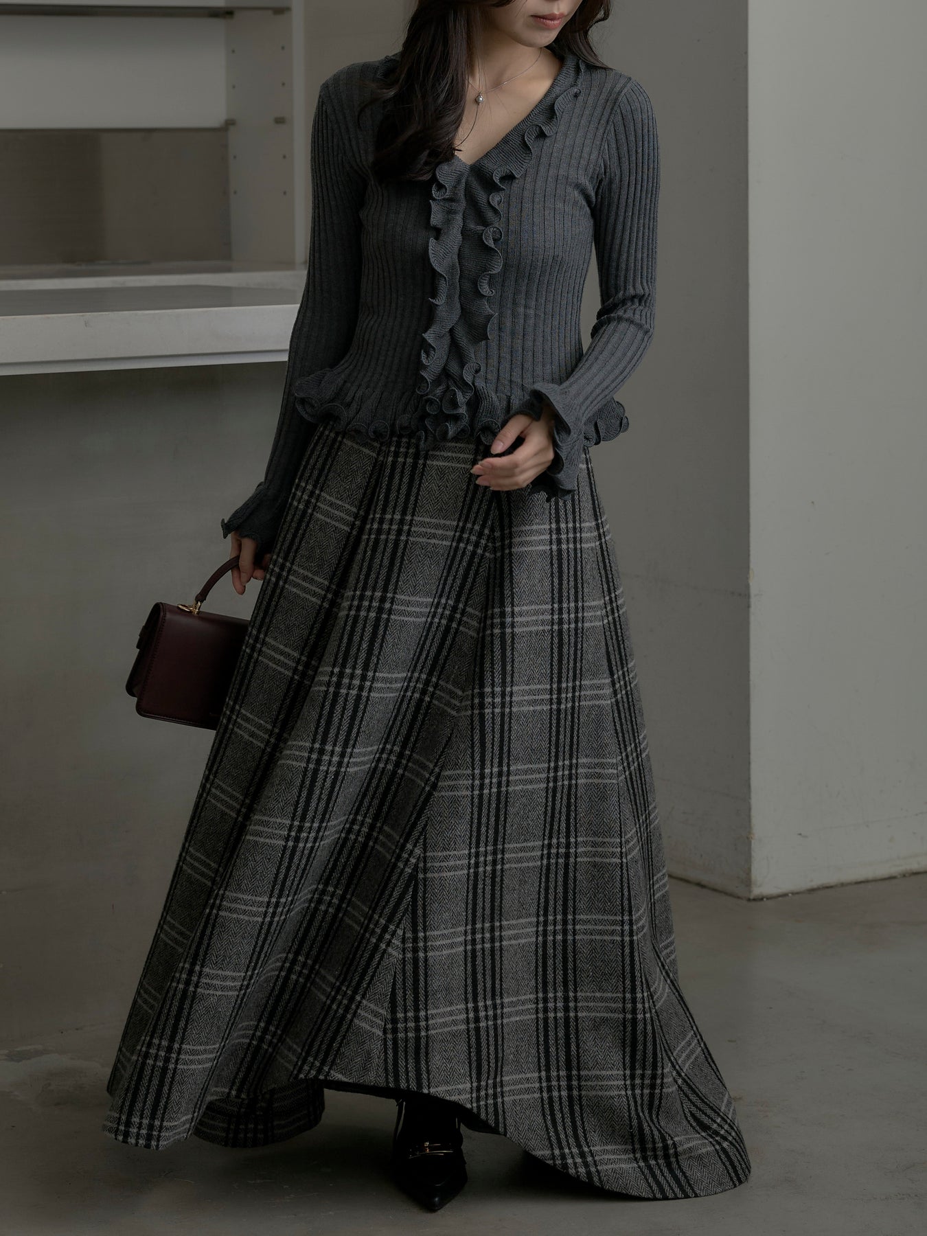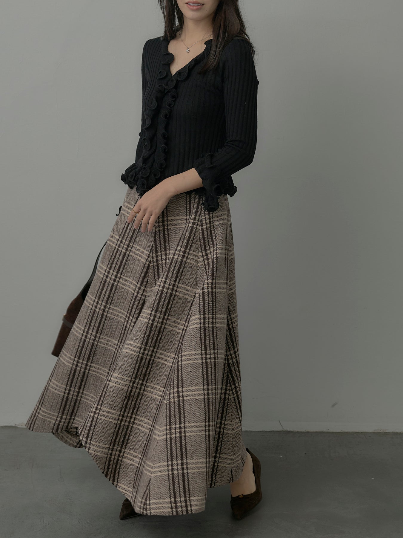 肉厚の生地をたっぷり使ったチェック柄スカート。フロント部分はあえて足首が見えるようにアシンメトリーのデザインに。