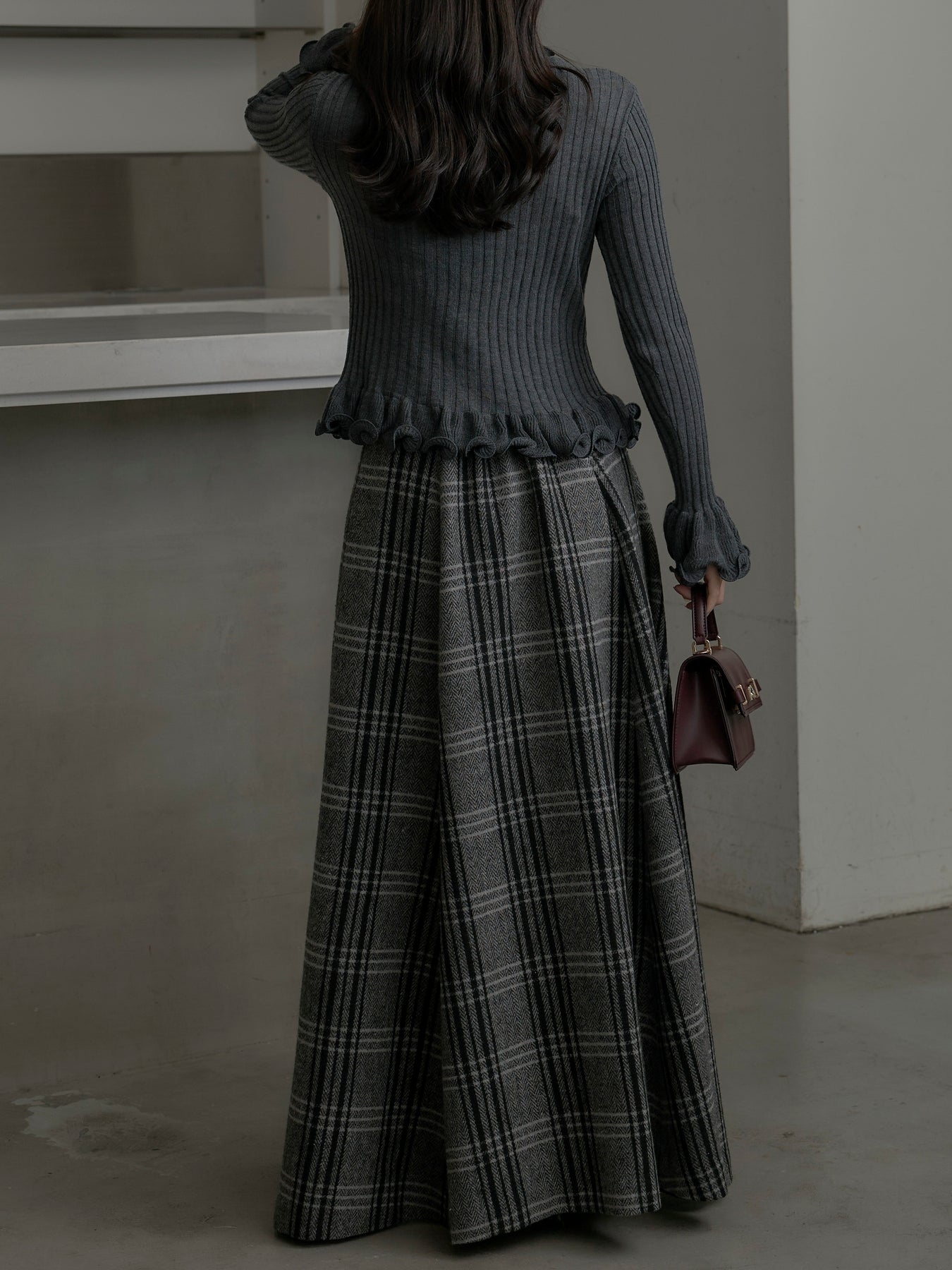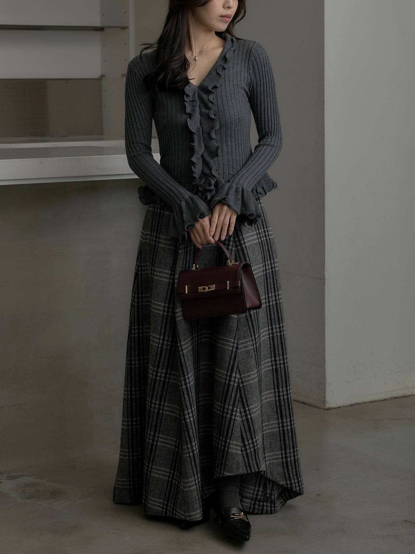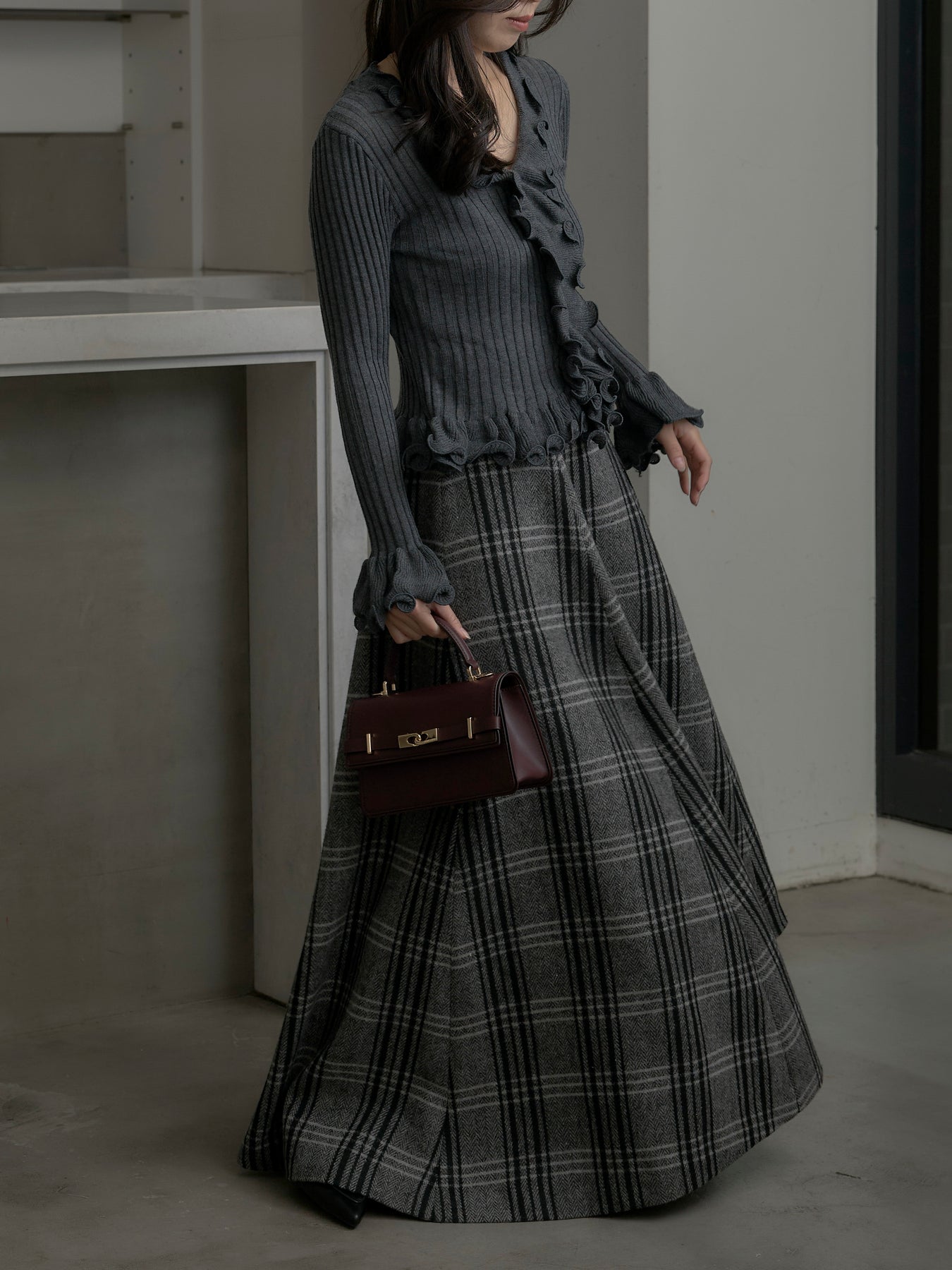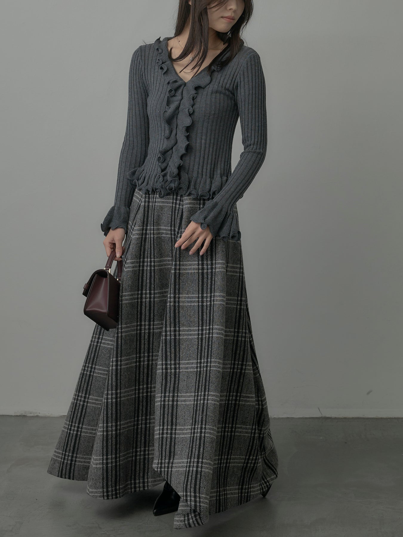 肉厚の生地をたっぷり使ったチェック柄スカート。フロント部分はあえて足首が見えるようにアシンメトリーのデザインに。