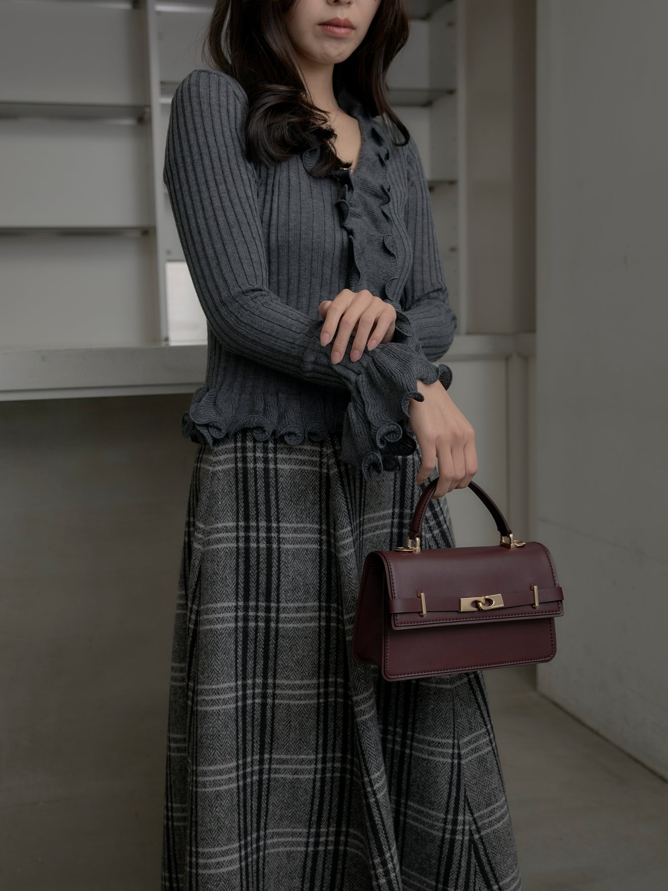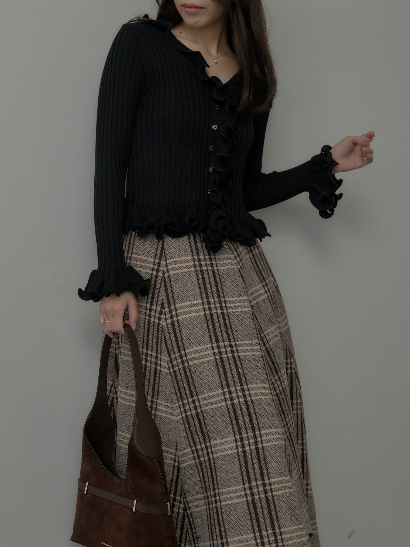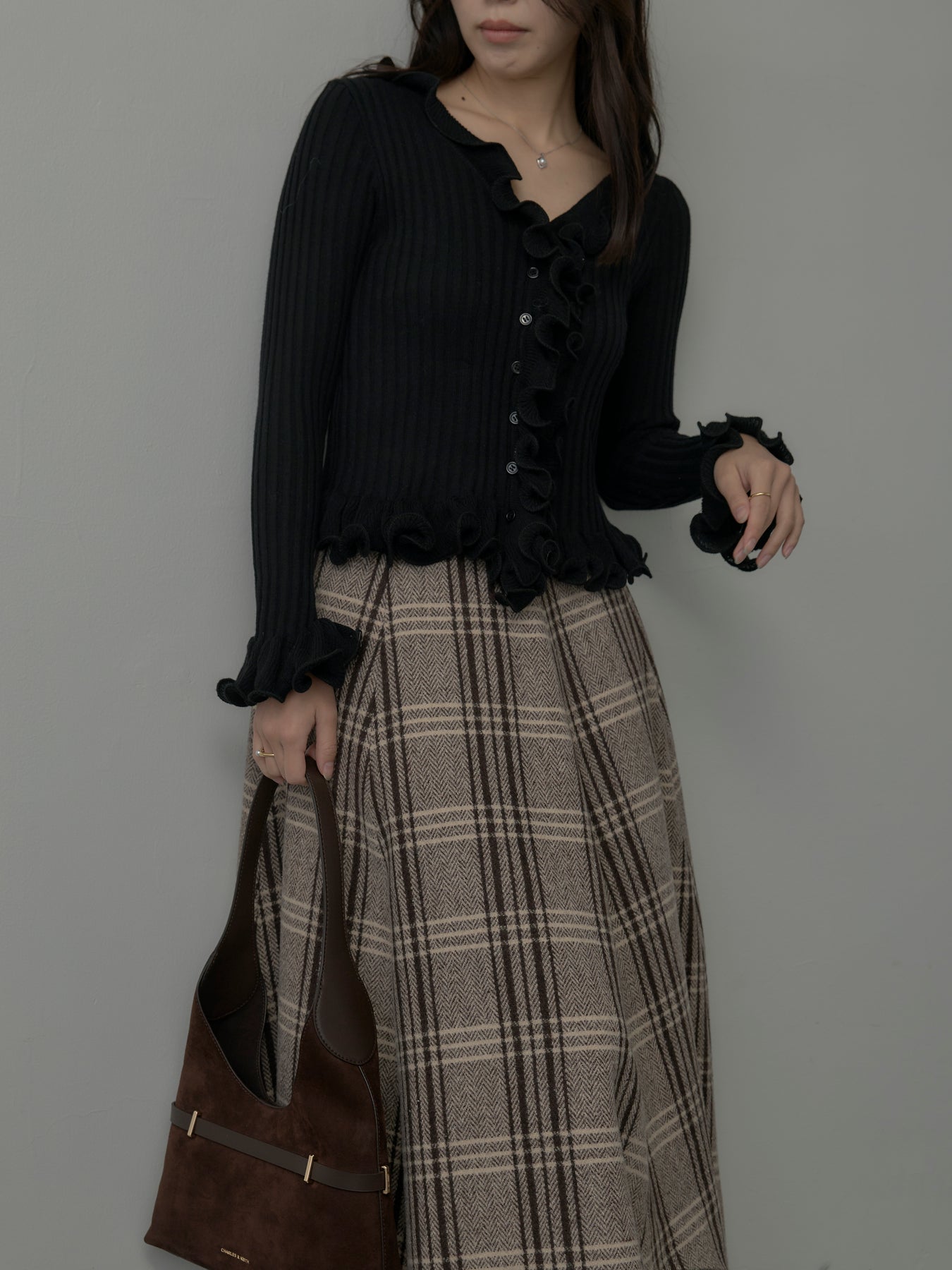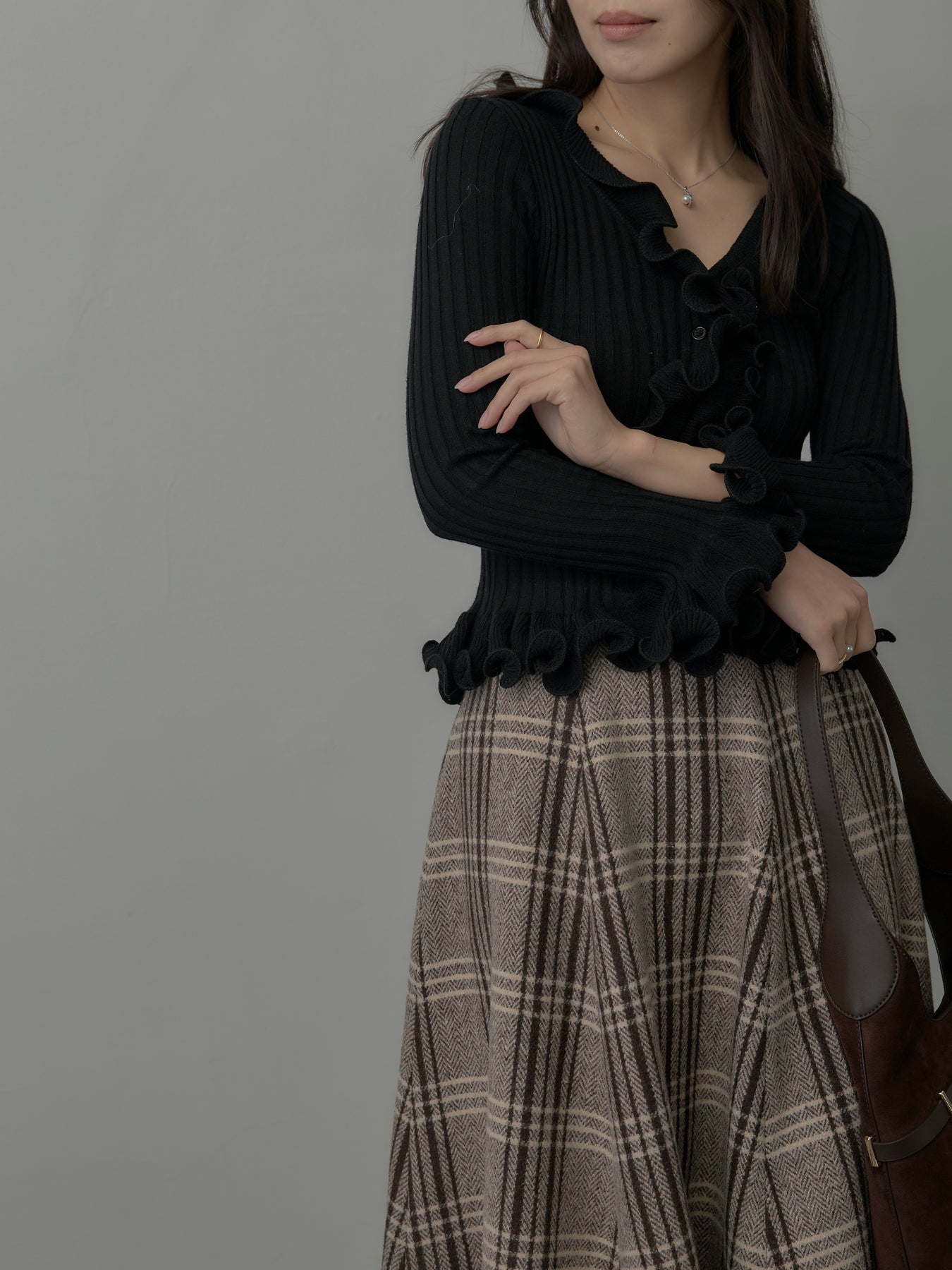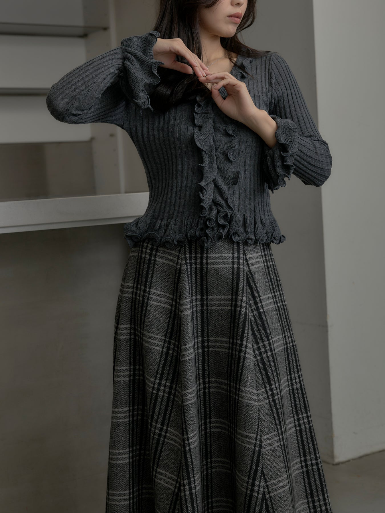 肉厚の生地をたっぷり使ったチェック柄スカート。フロント部分はあえて足首が見えるようにアシンメトリーのデザインに。