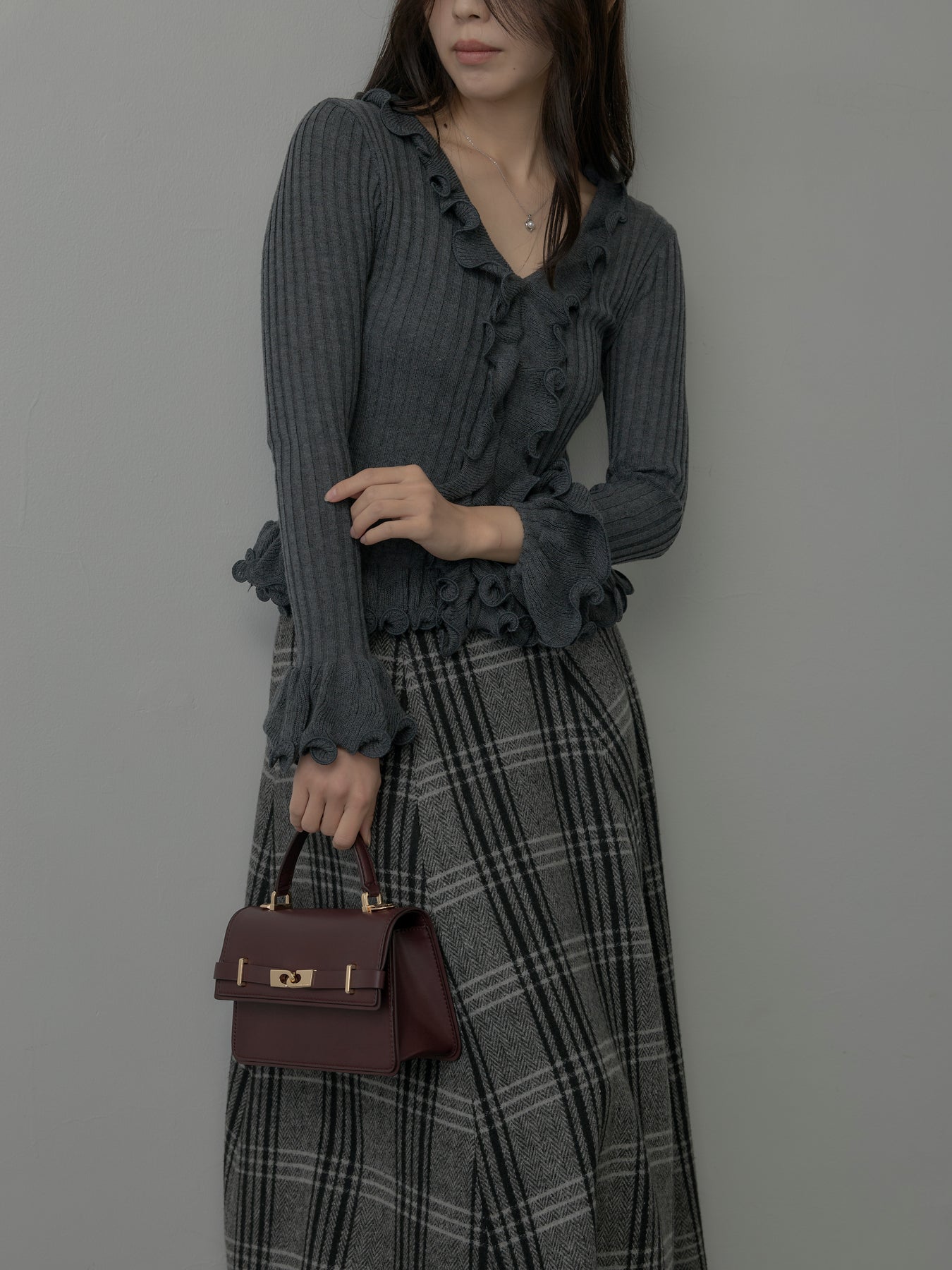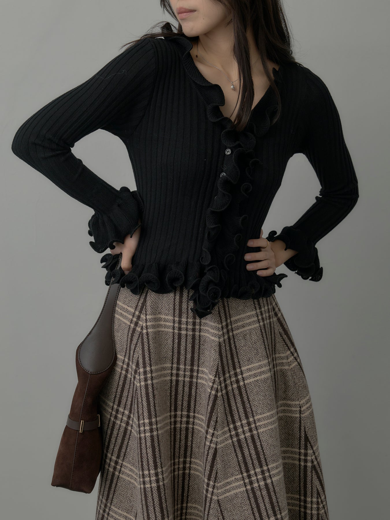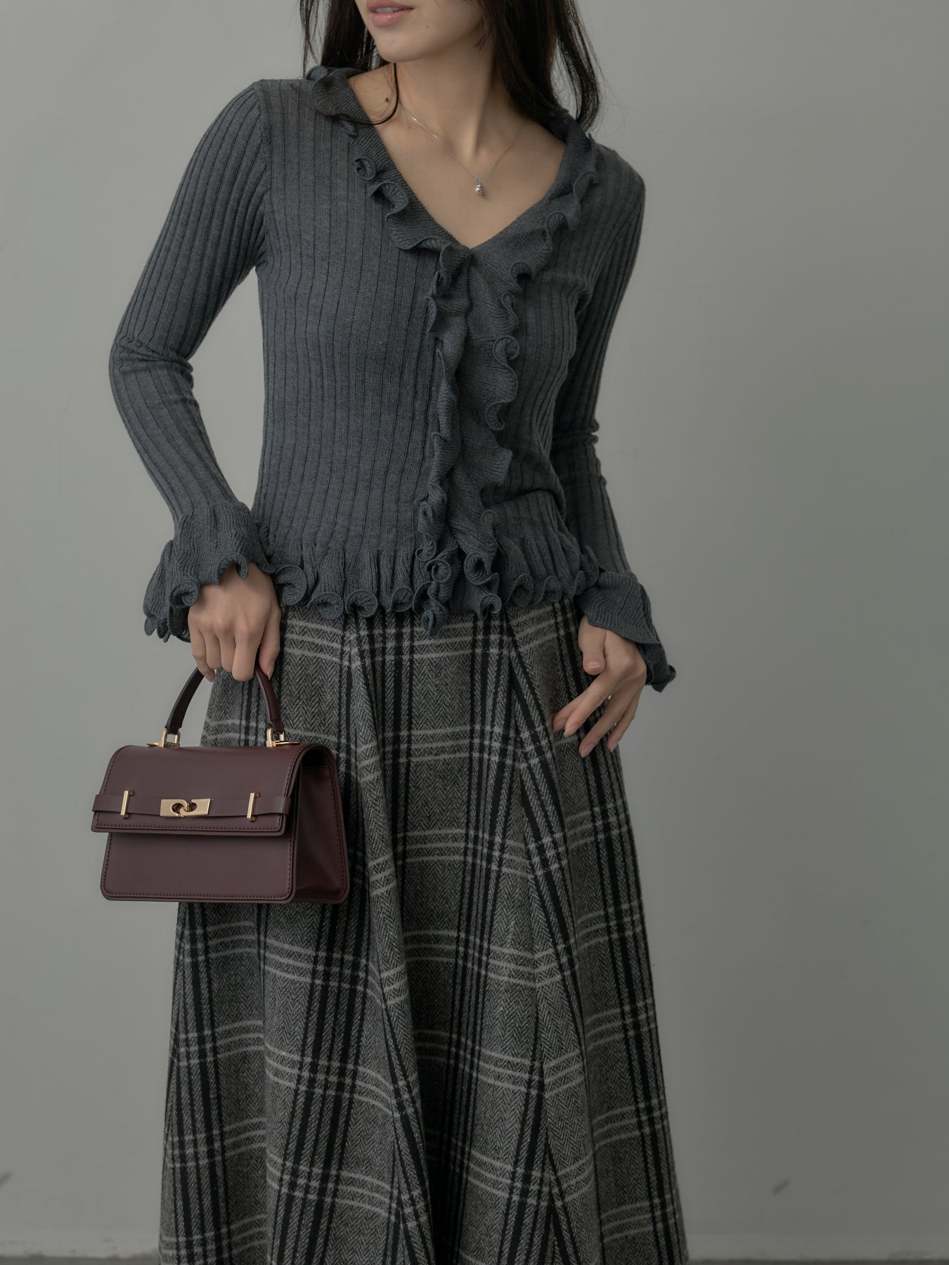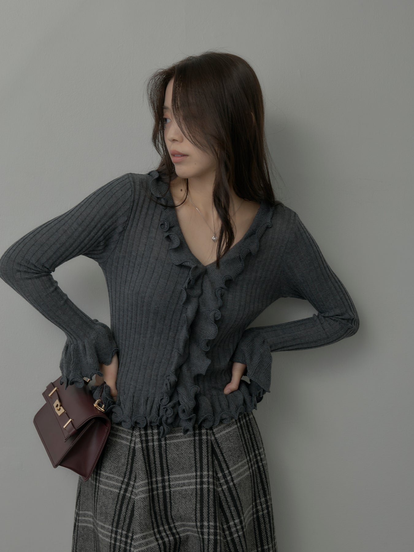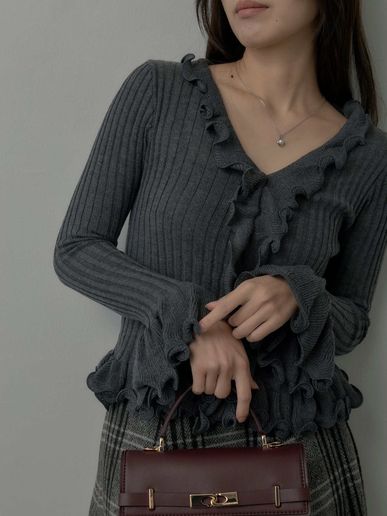 フリルディテールが華やかさを添えるVネックニットトップス。
