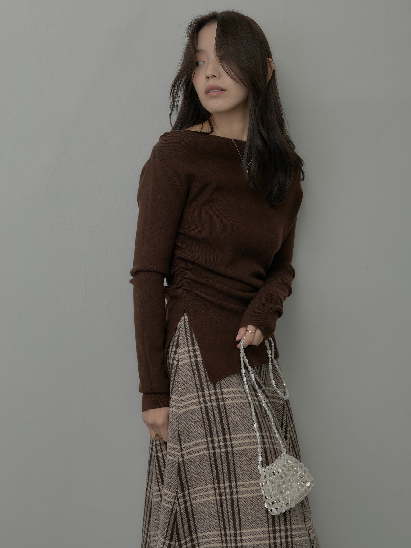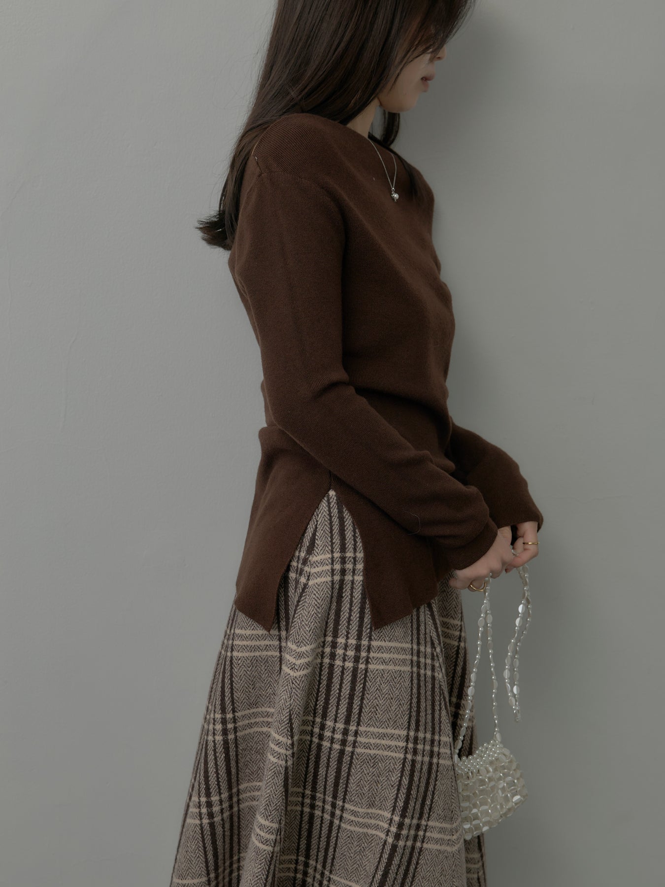 デコルテラインをきれいに見せるボートネックニットトップス。トレンドのサイドスリットデザインが抜け感を生み、軽やかな印象に仕上げます。