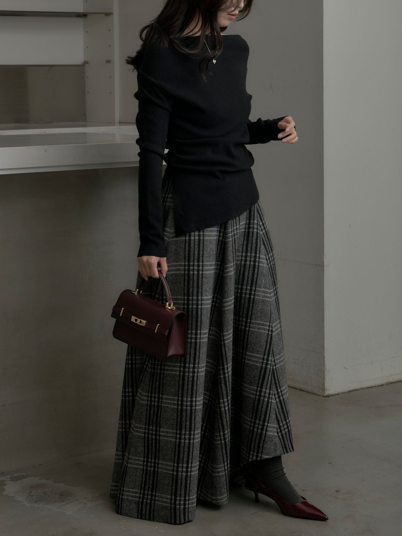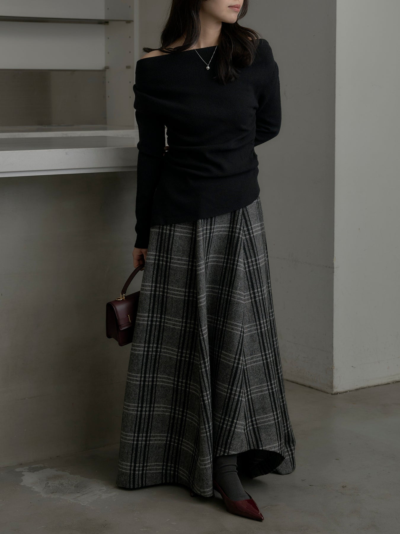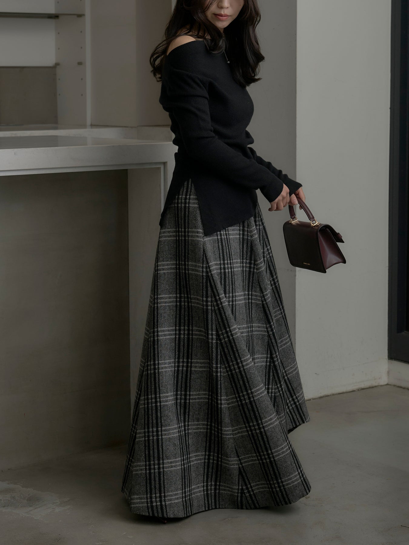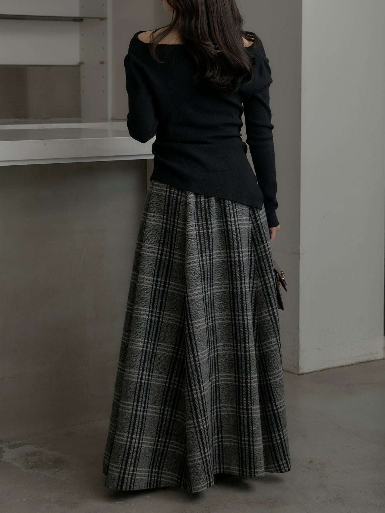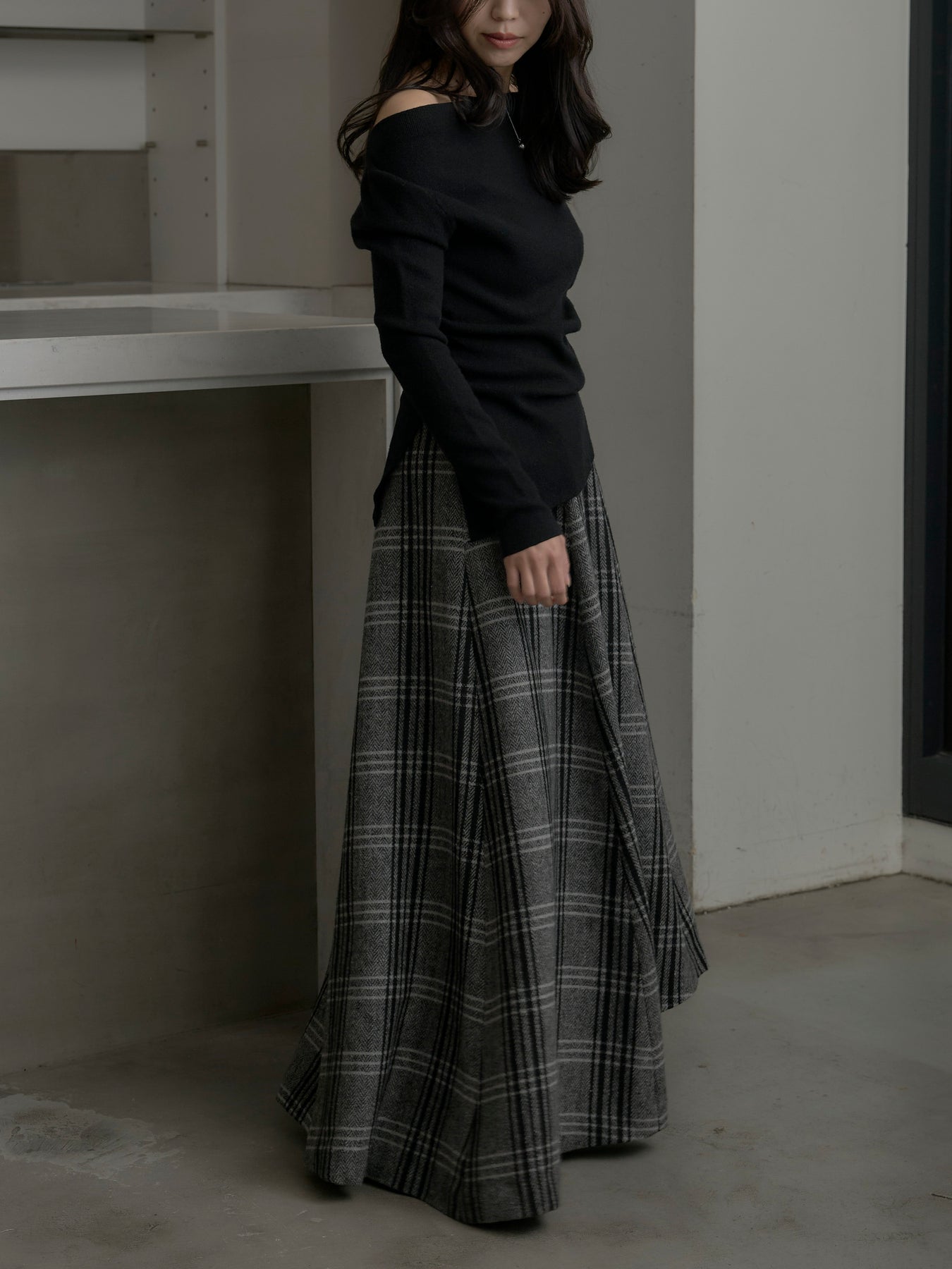 肉厚の生地をたっぷり使ったチェック柄スカート。フロント部分はあえて足首が見えるようにアシンメトリーのデザインに。