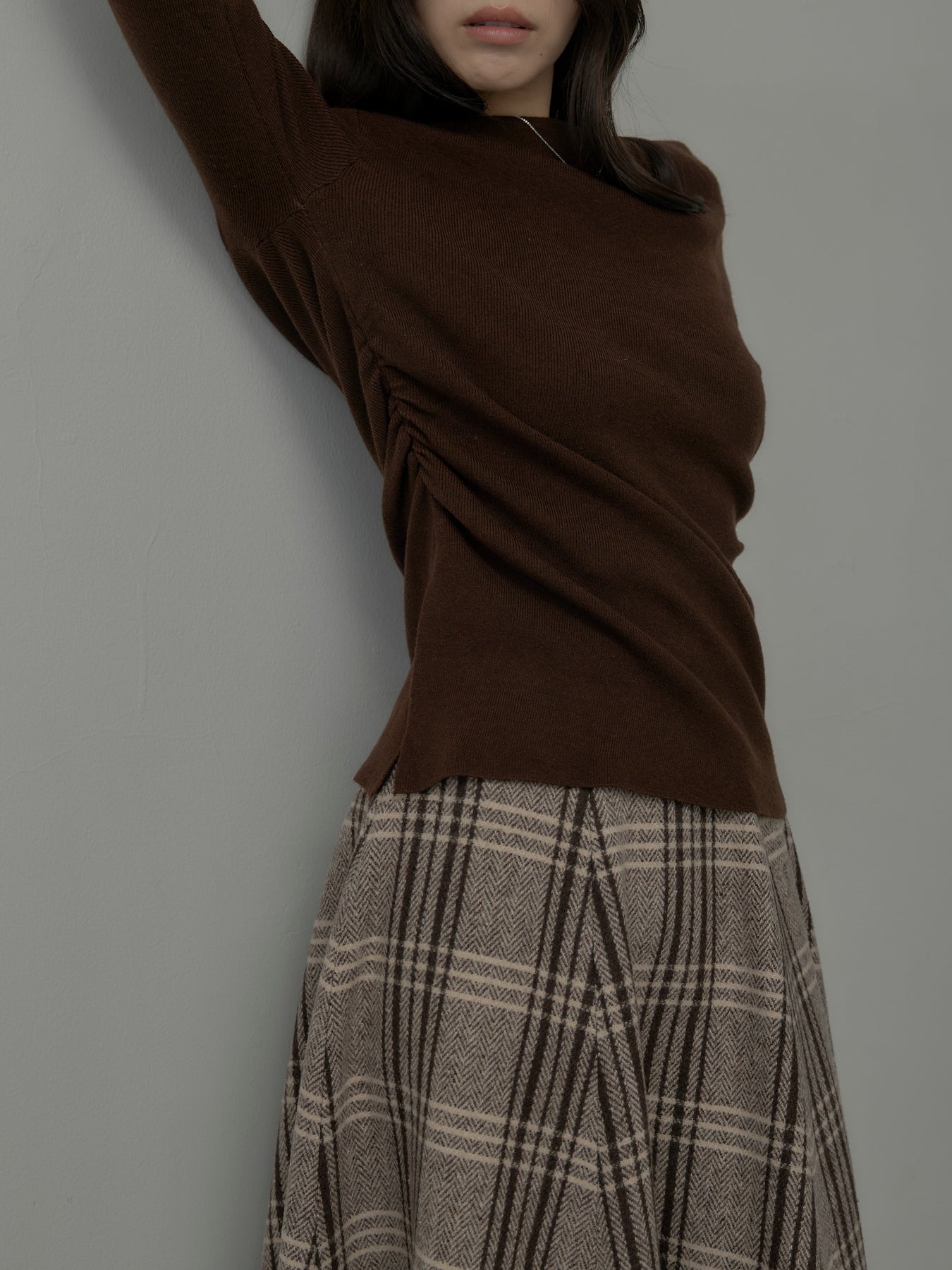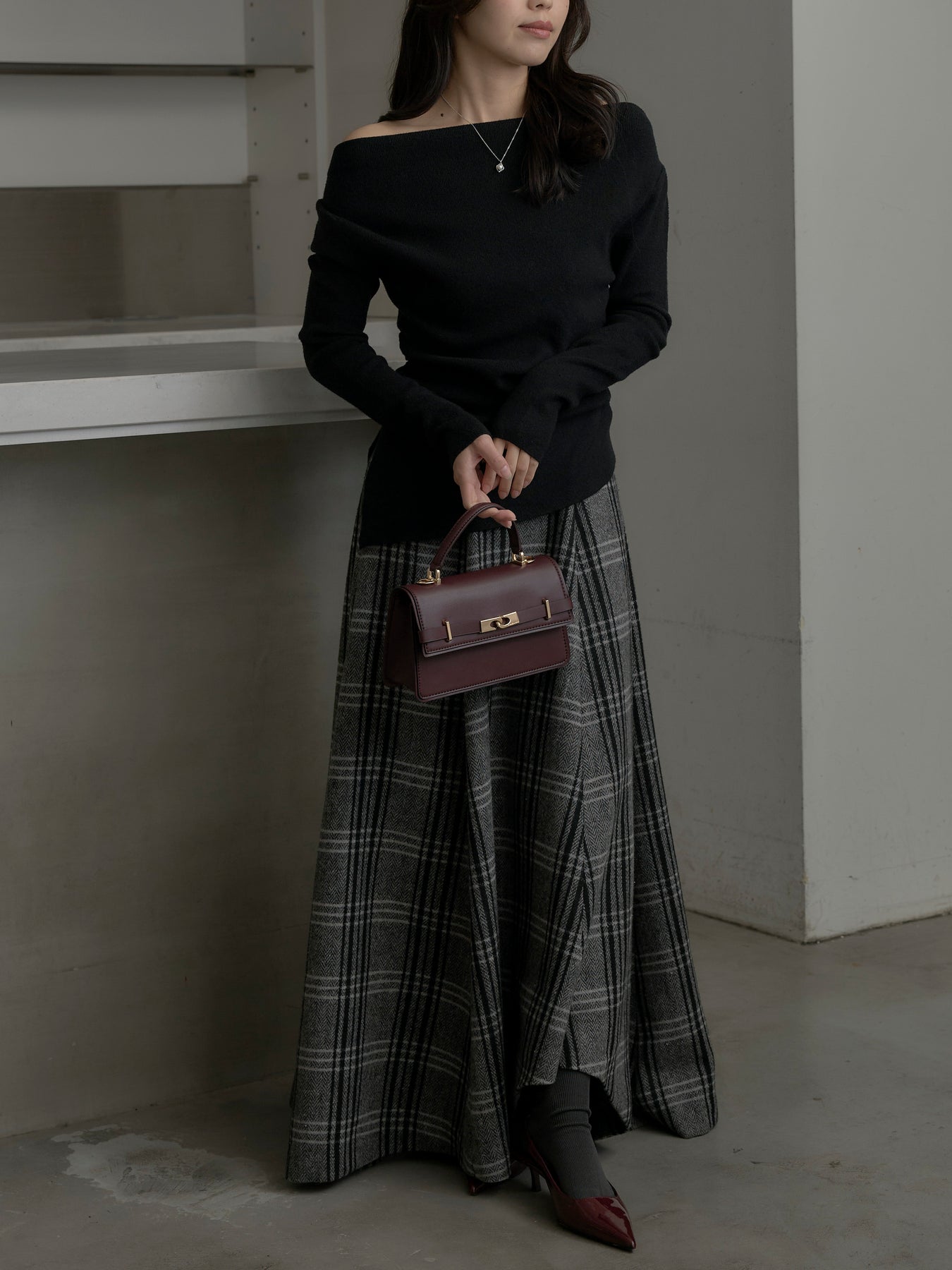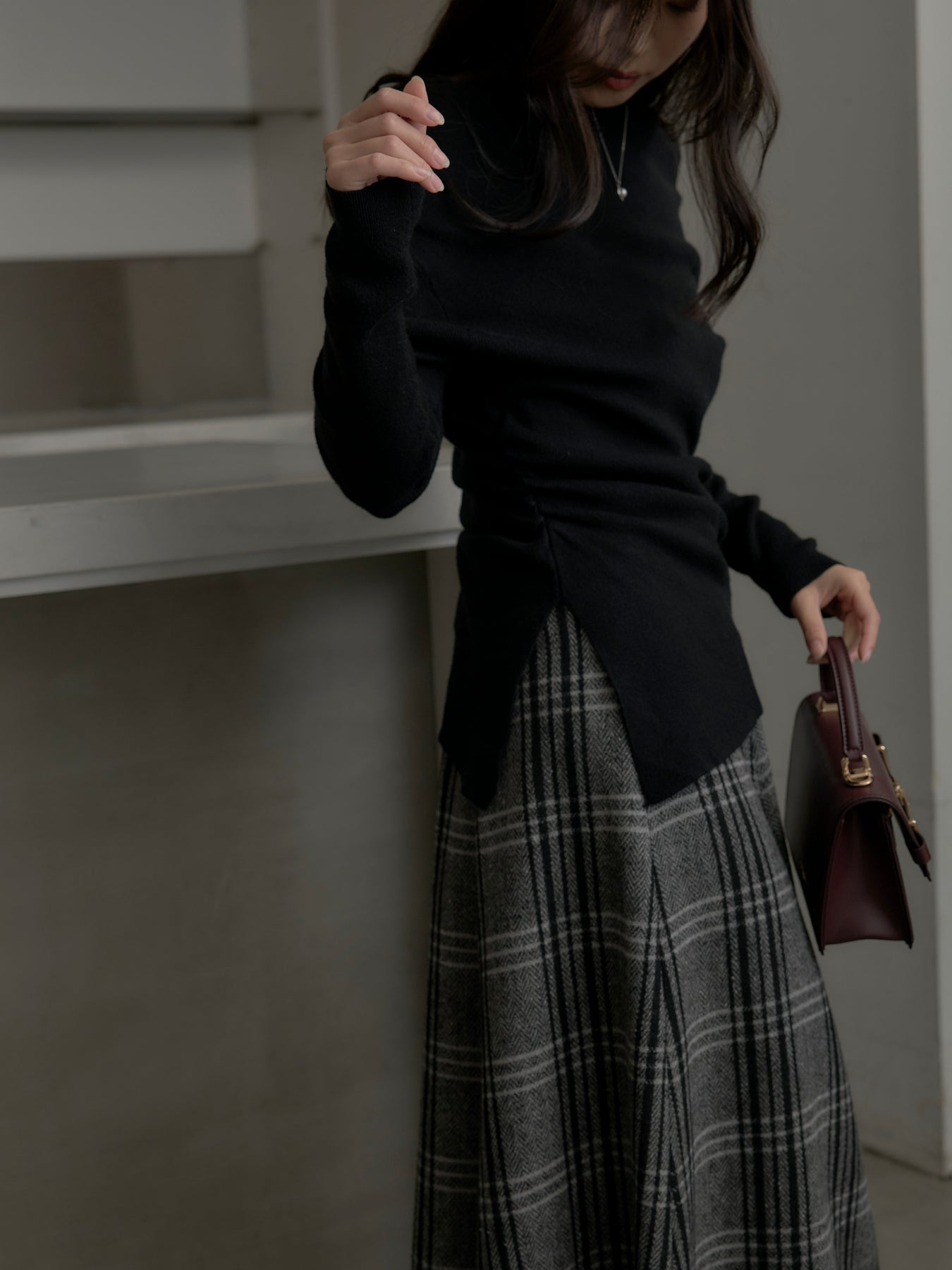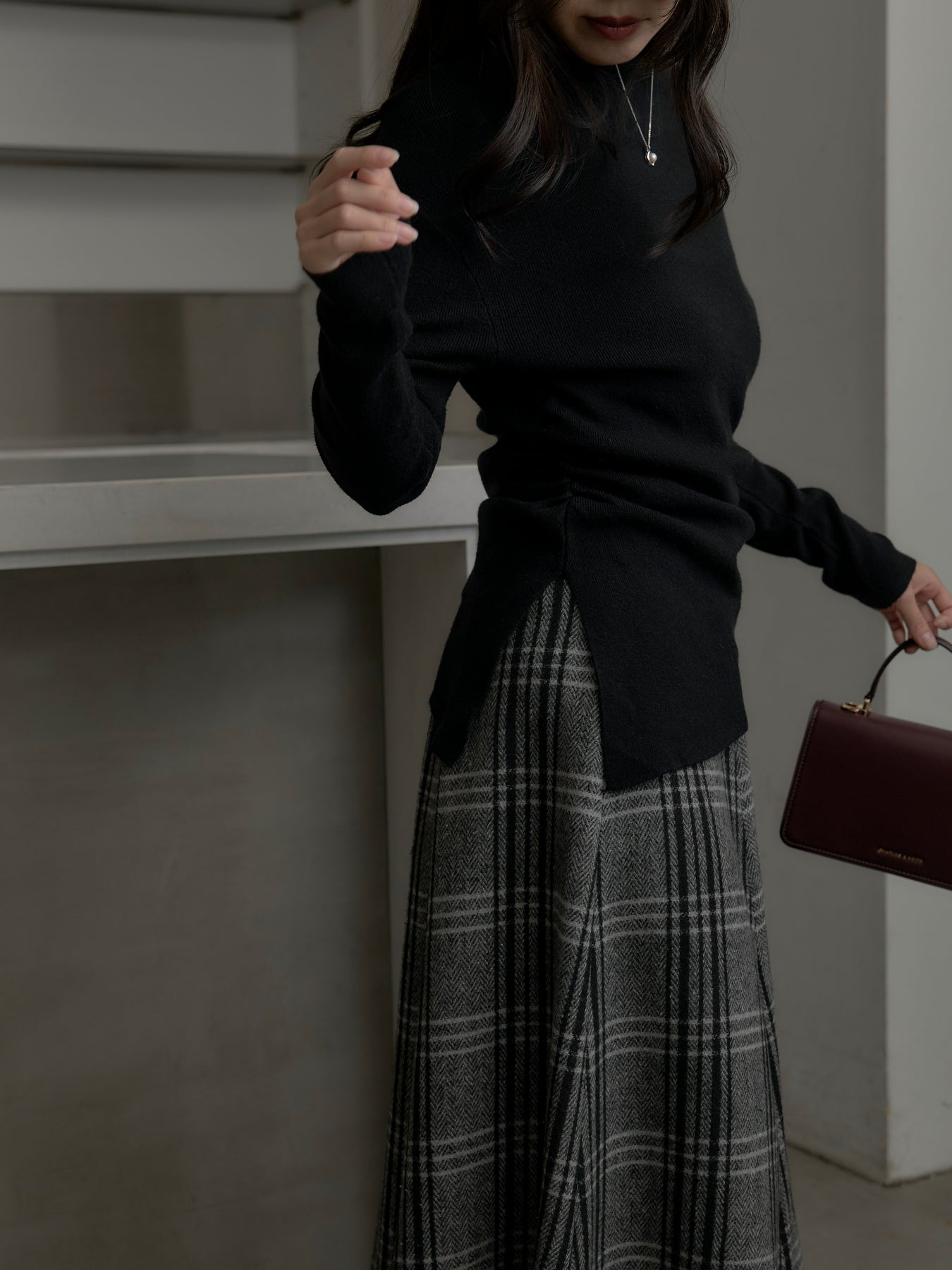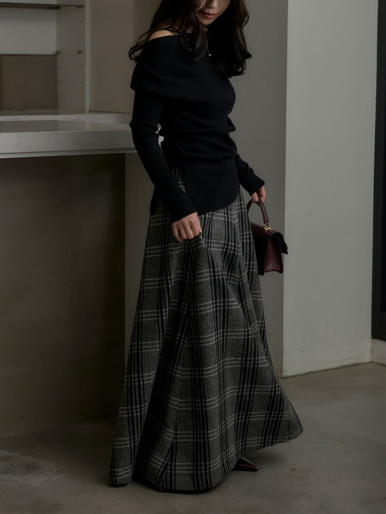 肉厚の生地をたっぷり使ったチェック柄スカート。フロント部分はあえて足首が見えるようにアシンメトリーのデザインに。