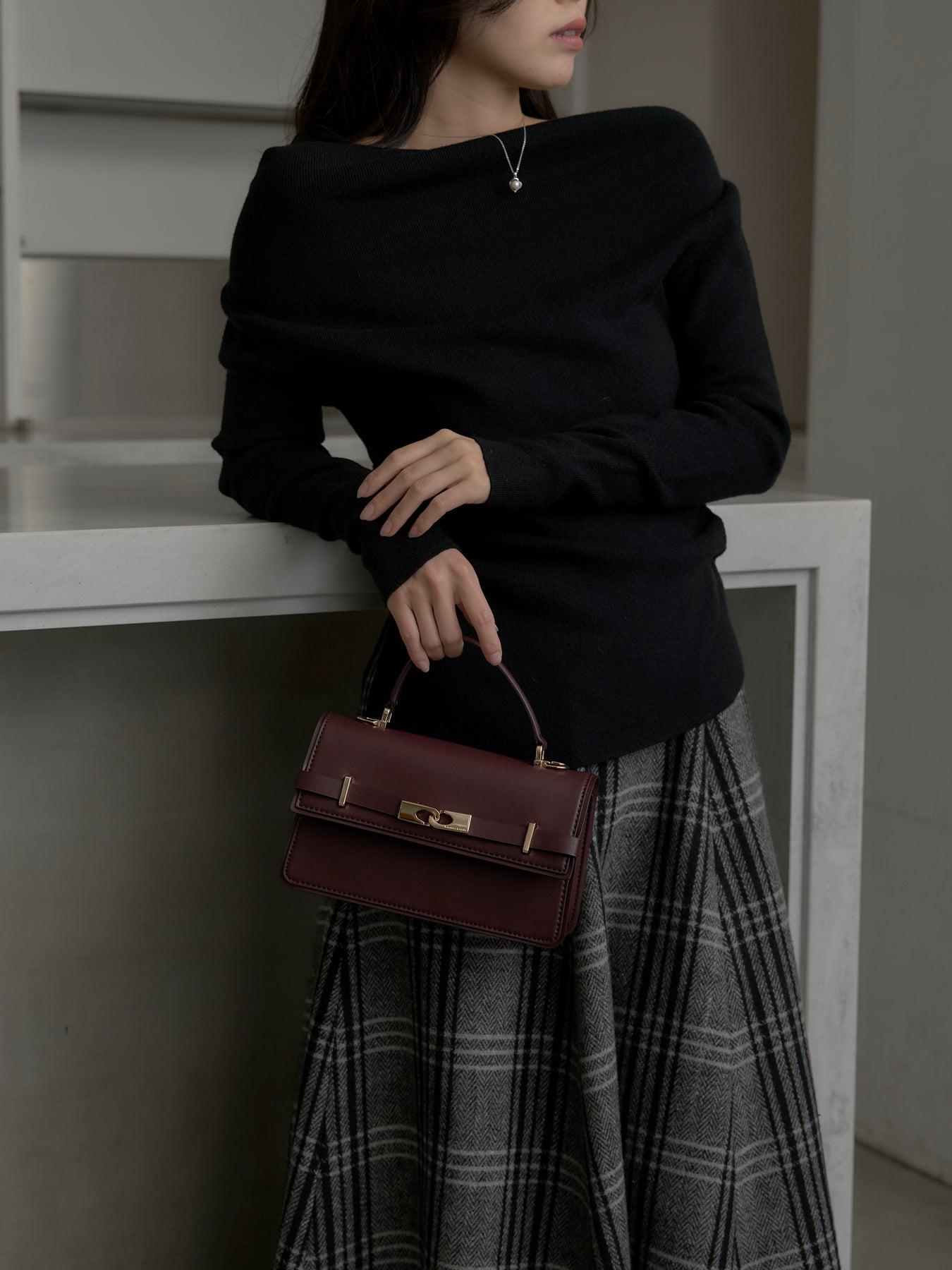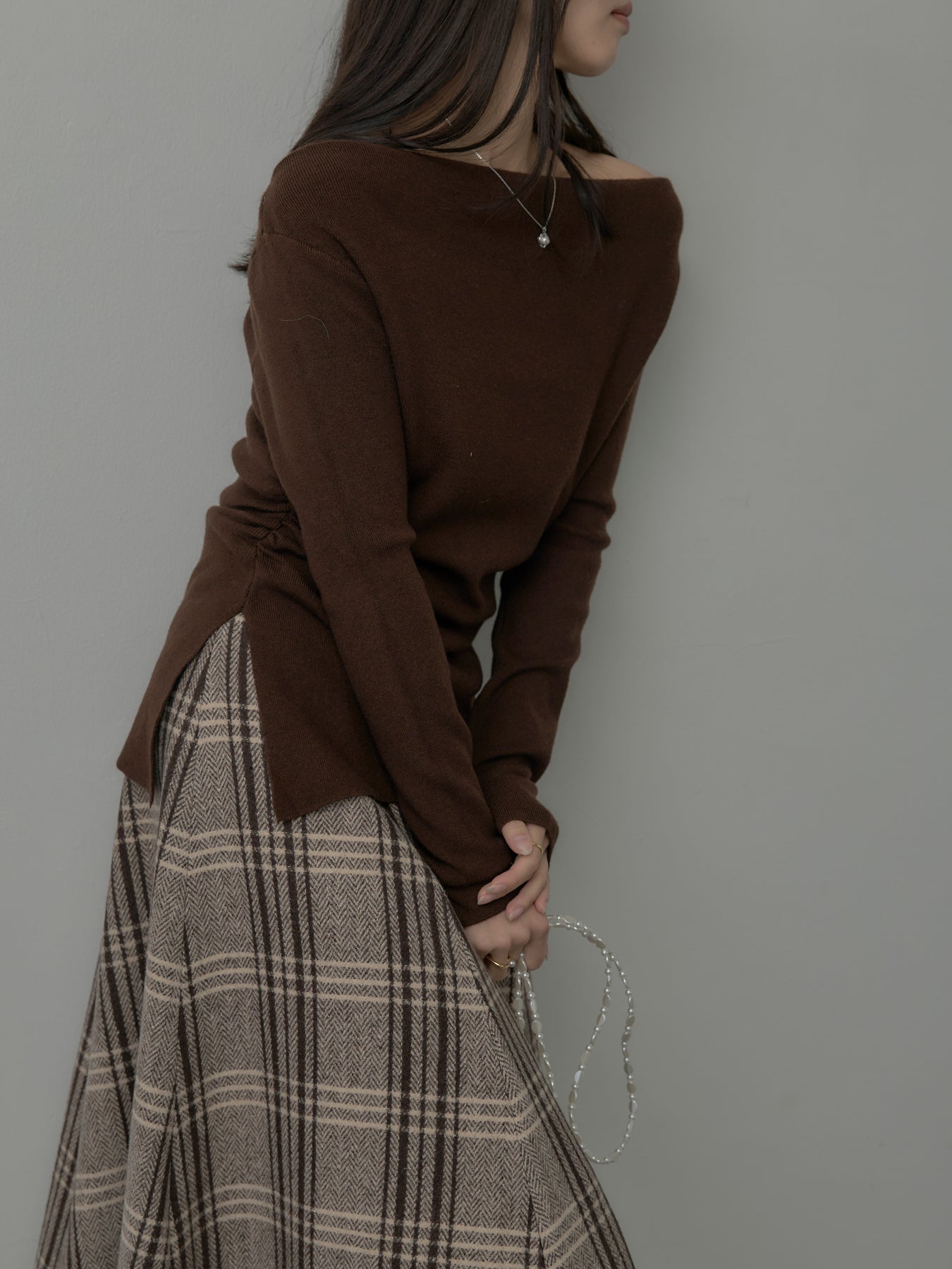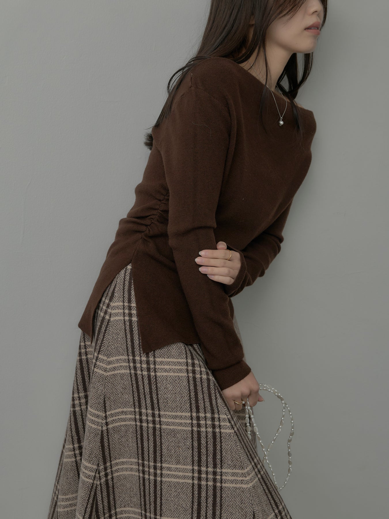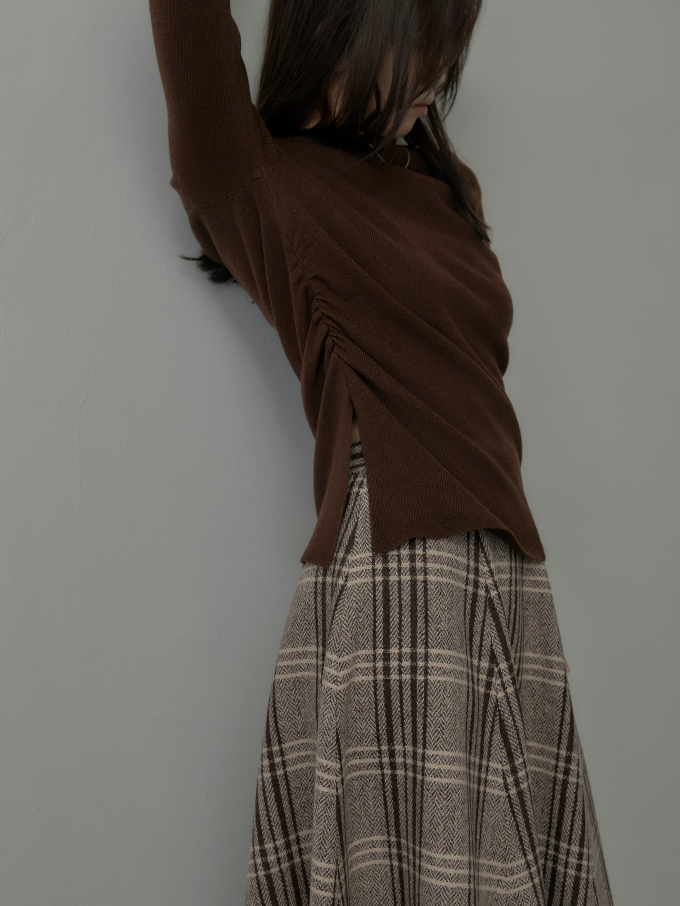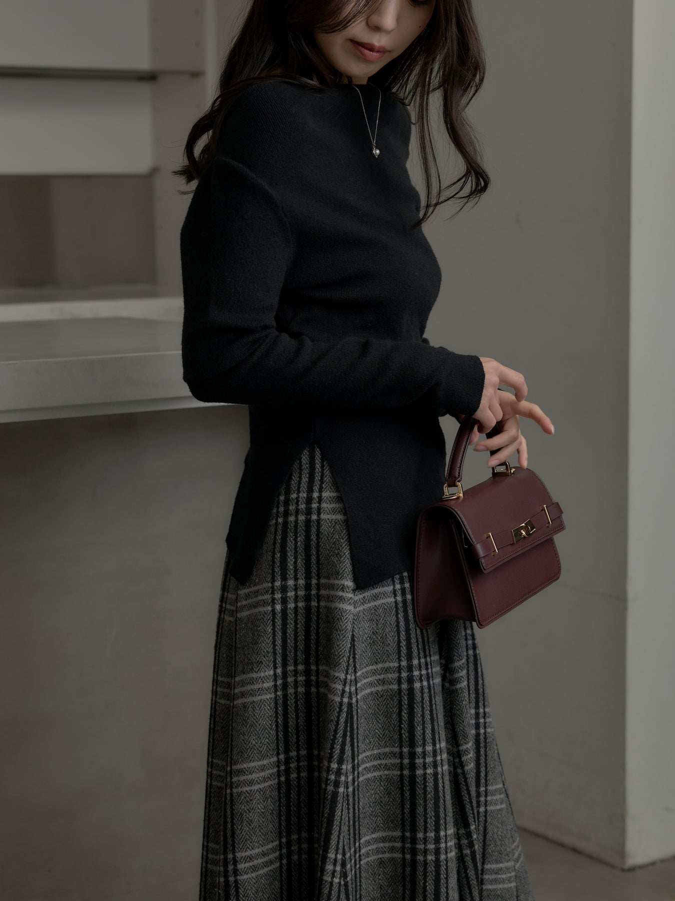 肉厚の生地をたっぷり使ったチェック柄スカート。フロント部分はあえて足首が見えるようにアシンメトリーのデザインに。