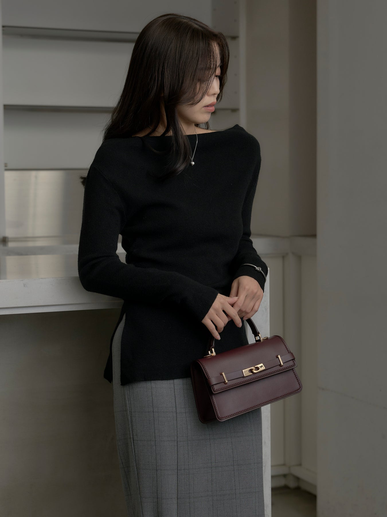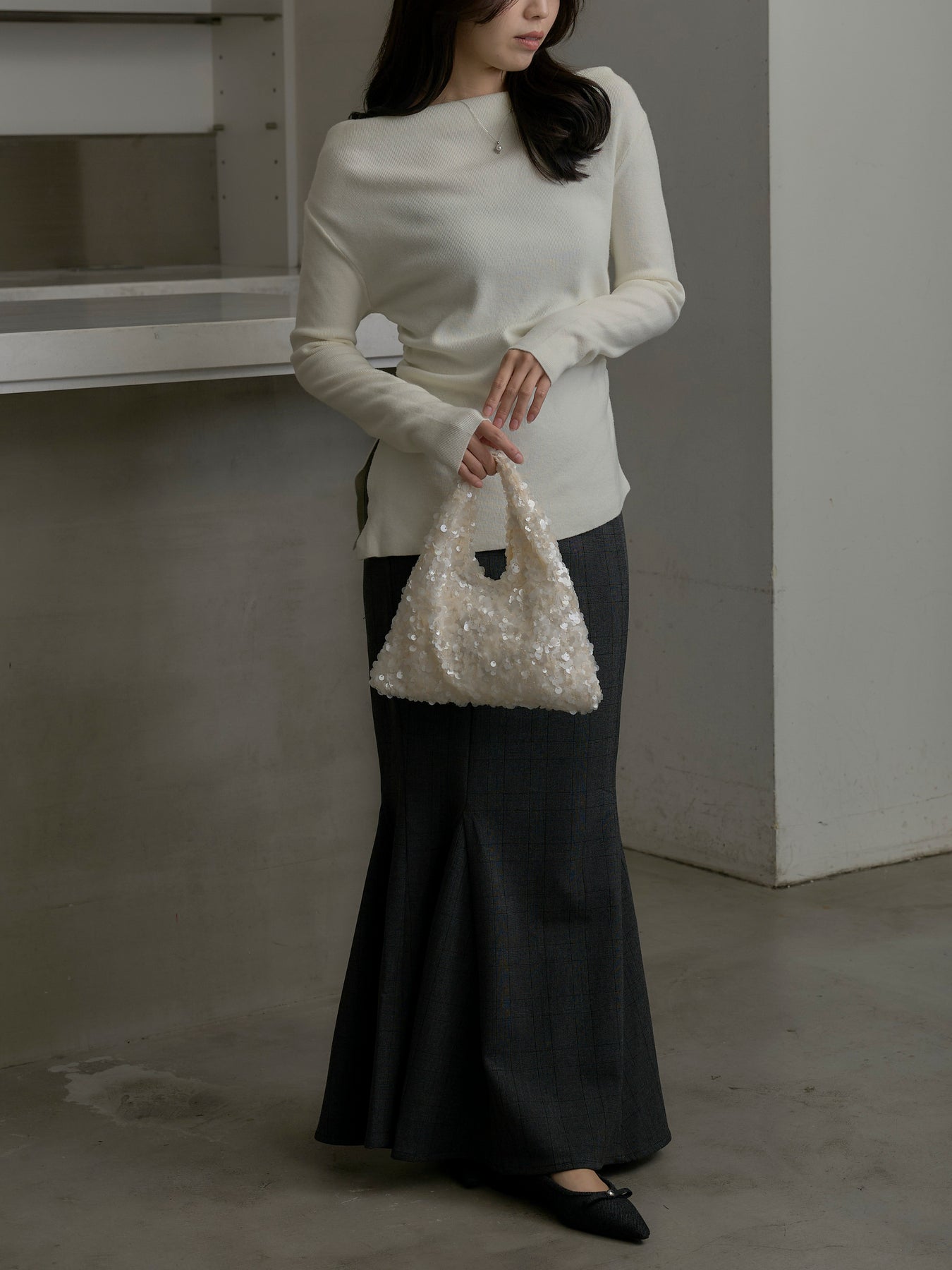 デコルテラインをきれいに見せるボートネックニットトップス。トレンドのサイドスリットデザインが抜け感を生み、軽やかな印象に仕上げます。