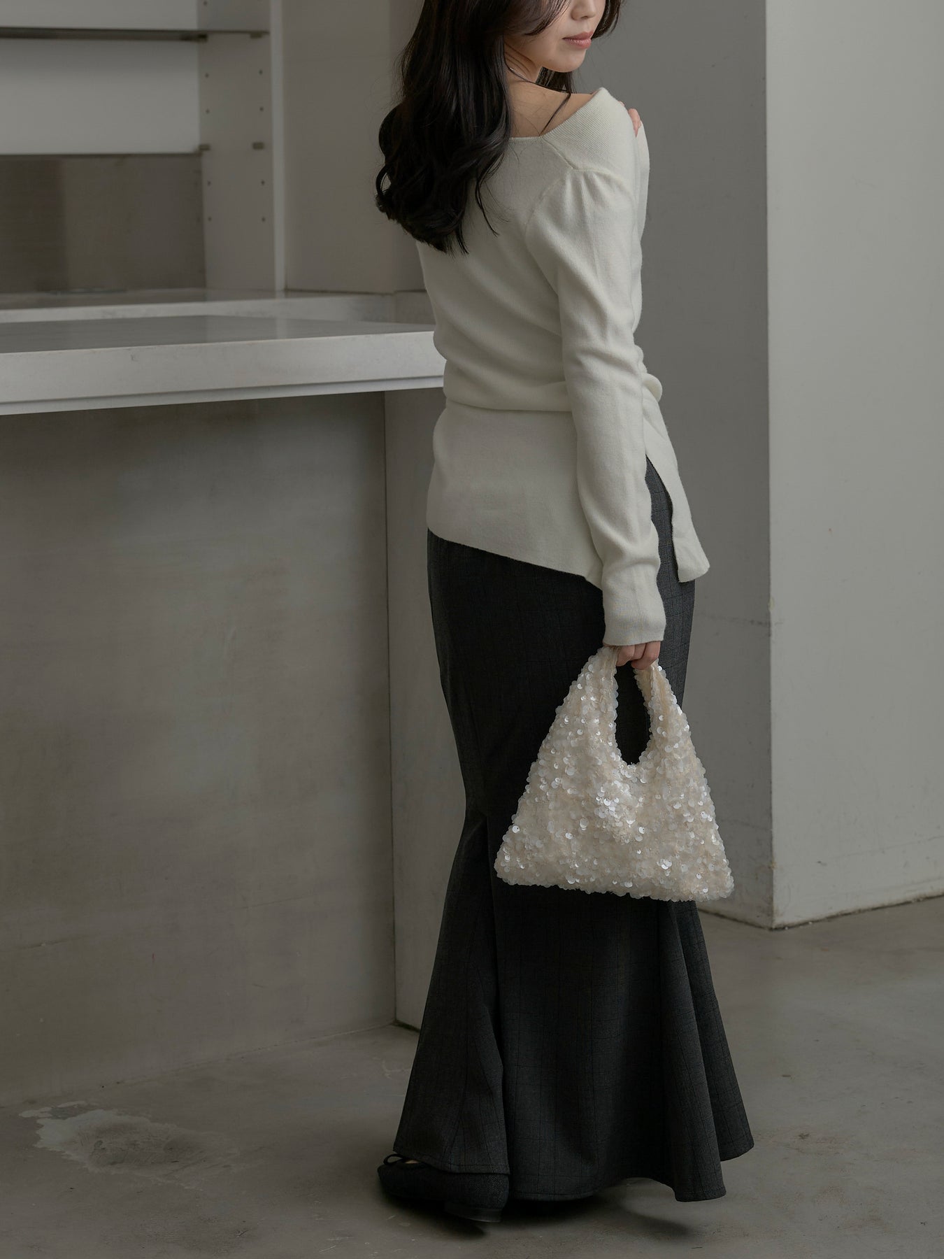 ヒップラインを美しく見せるフィット感と、裾に向かって広がるシルエットが魅力。