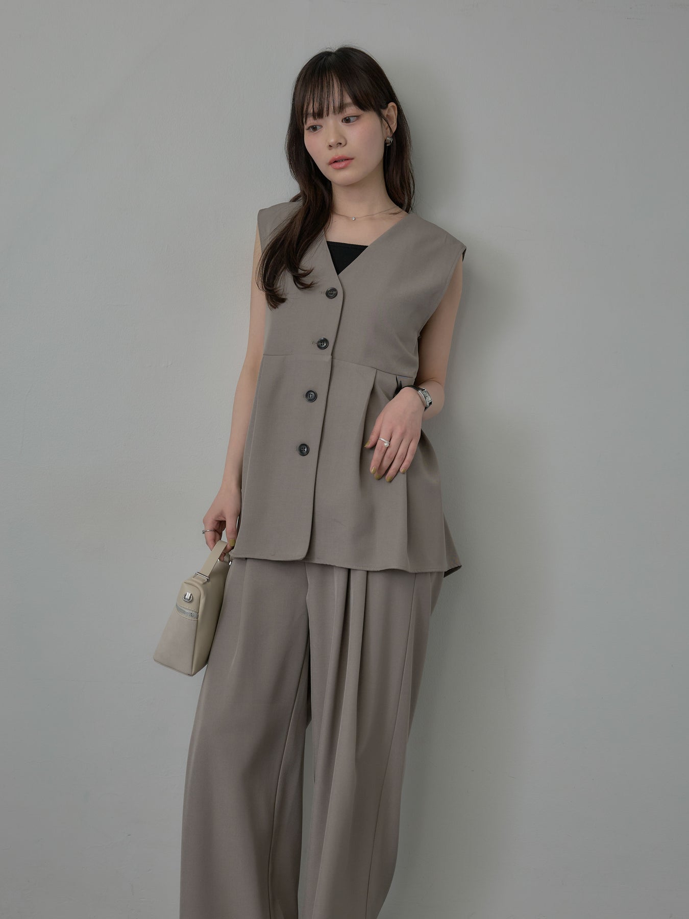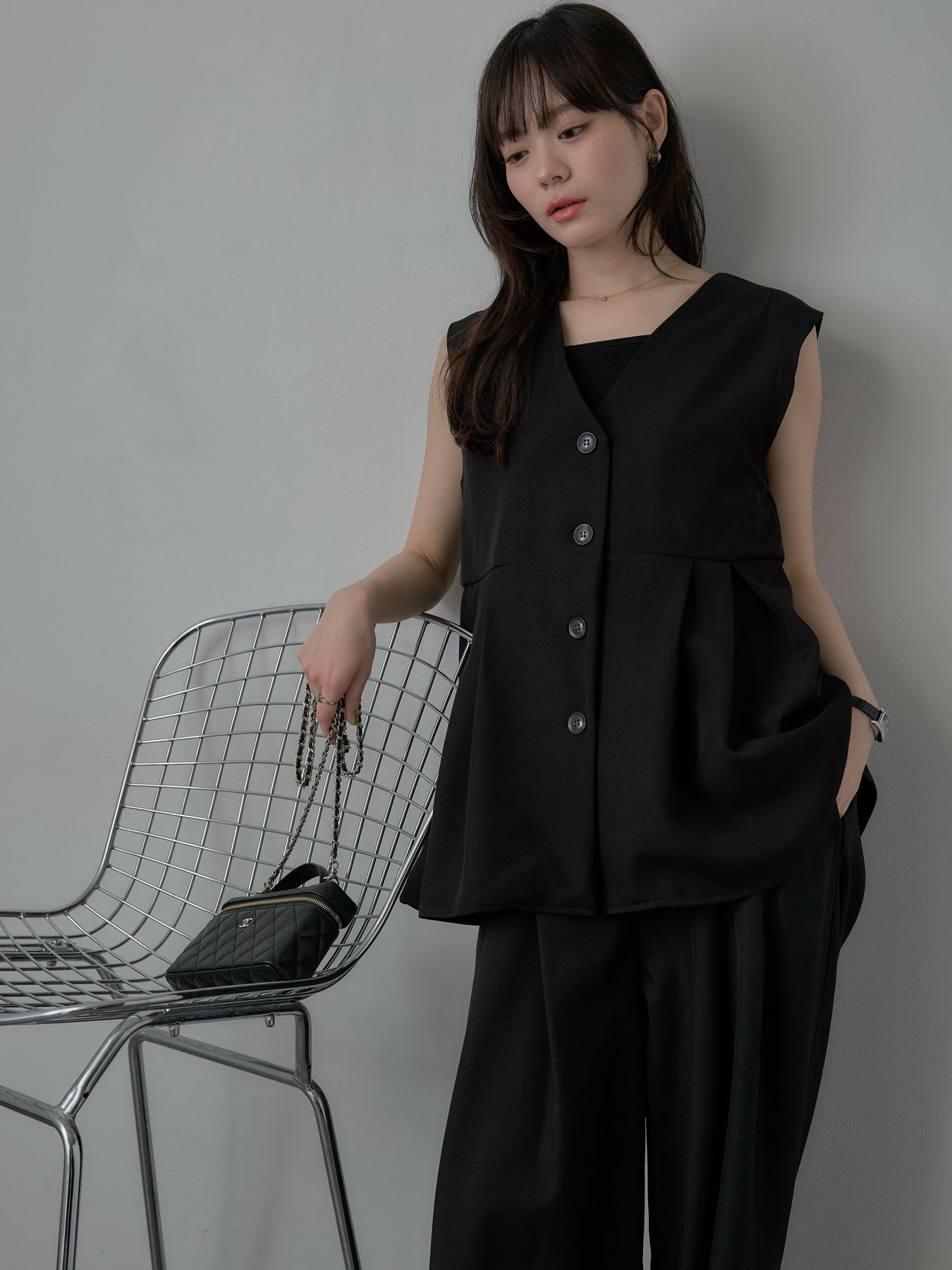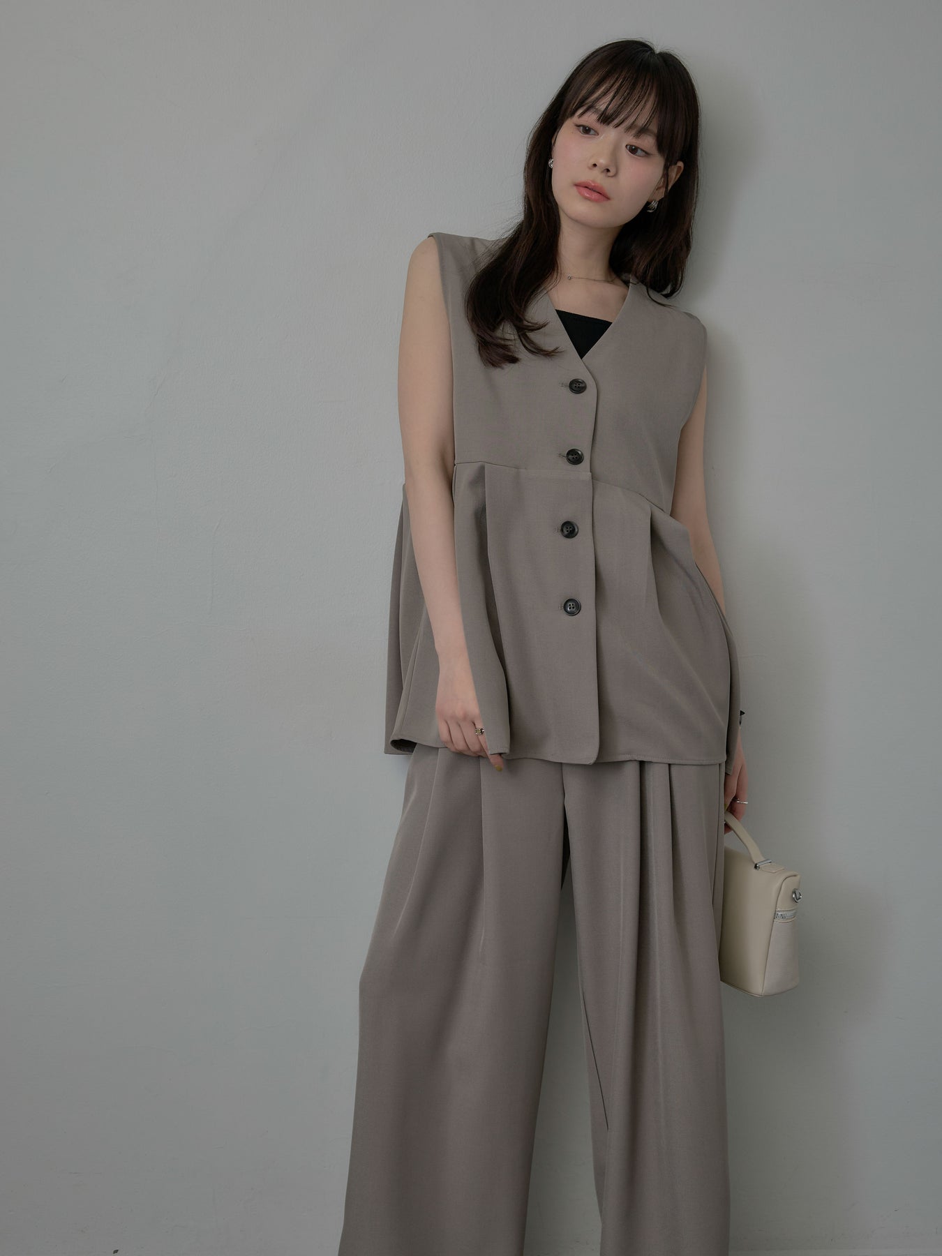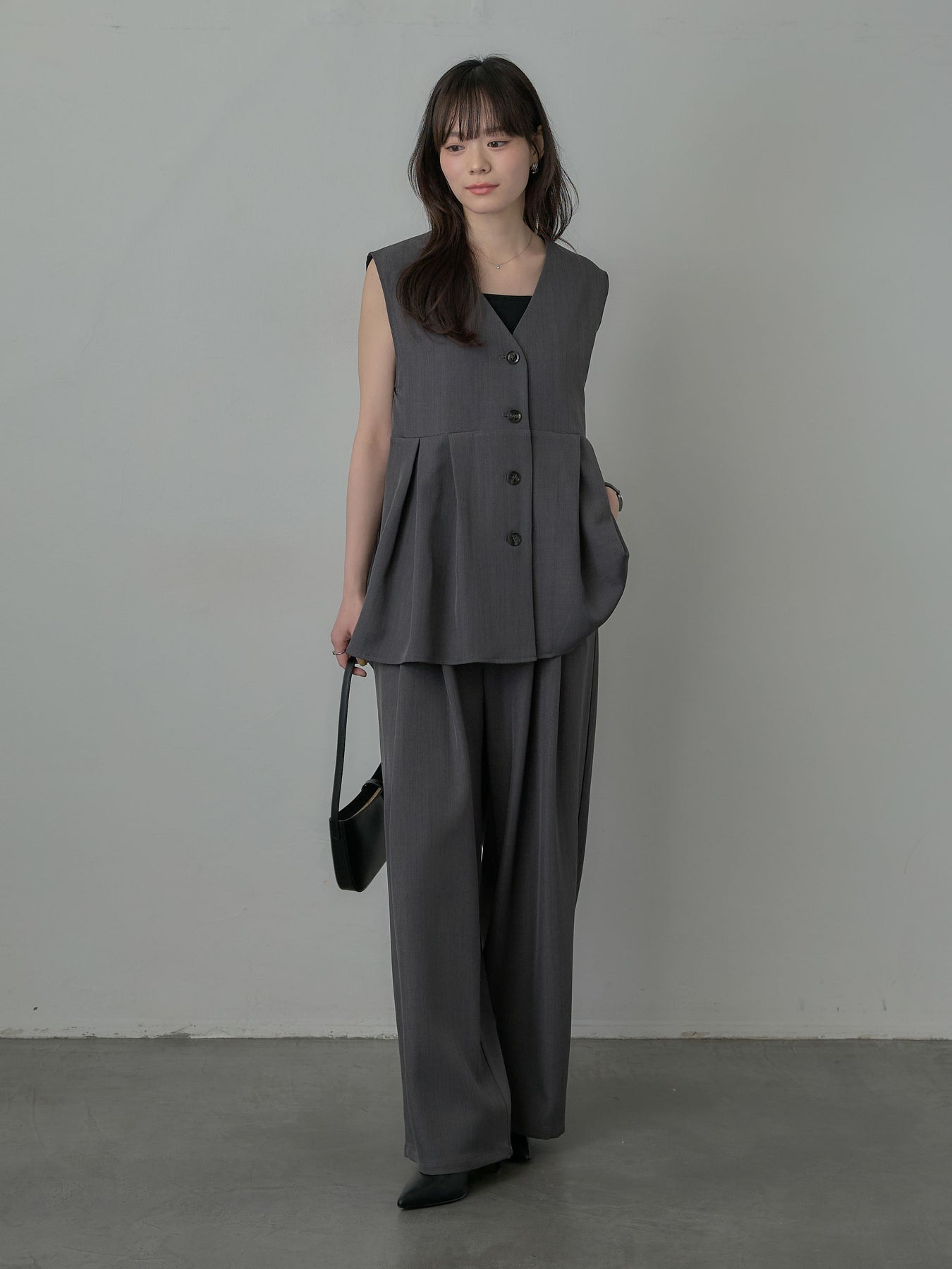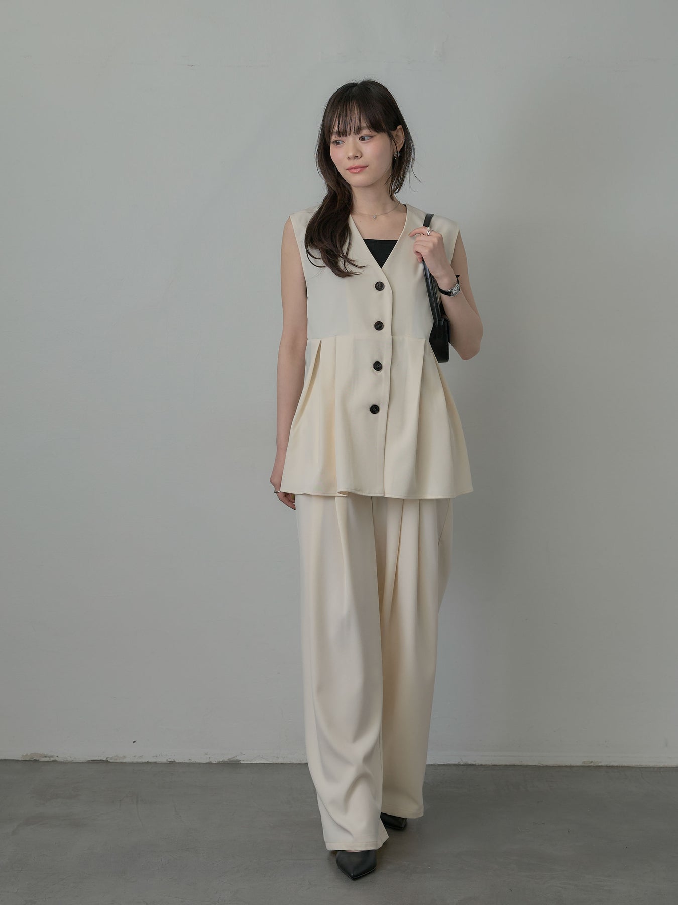 きちんと感のあるベスト。同素材のパンツとのセットアップがおすすめ。タック入りで女性らしい印象に仕上がります。ボトムスにチュールスカートなどボリューム感のあるアイテムを合わせても大人可愛く着ていただけます。
