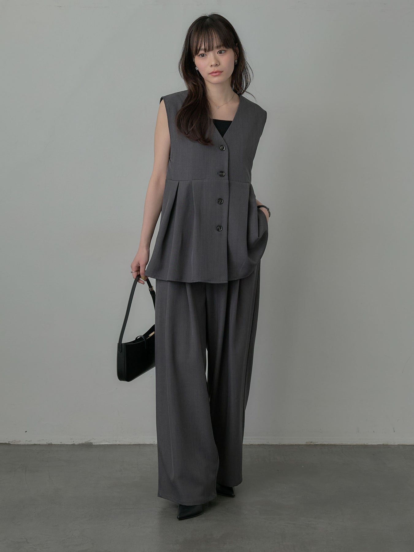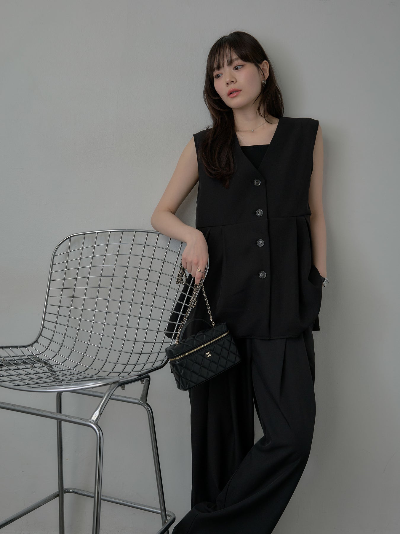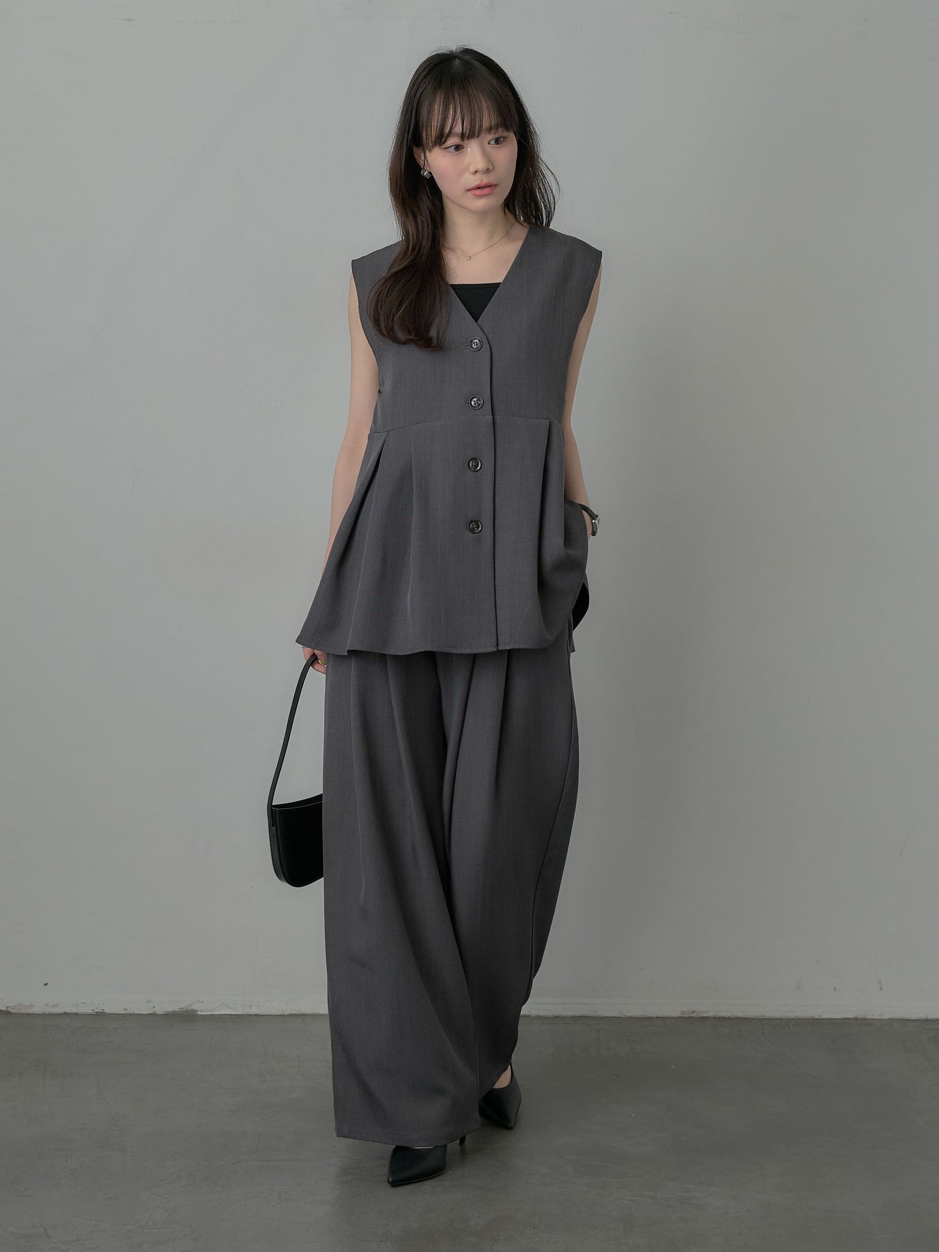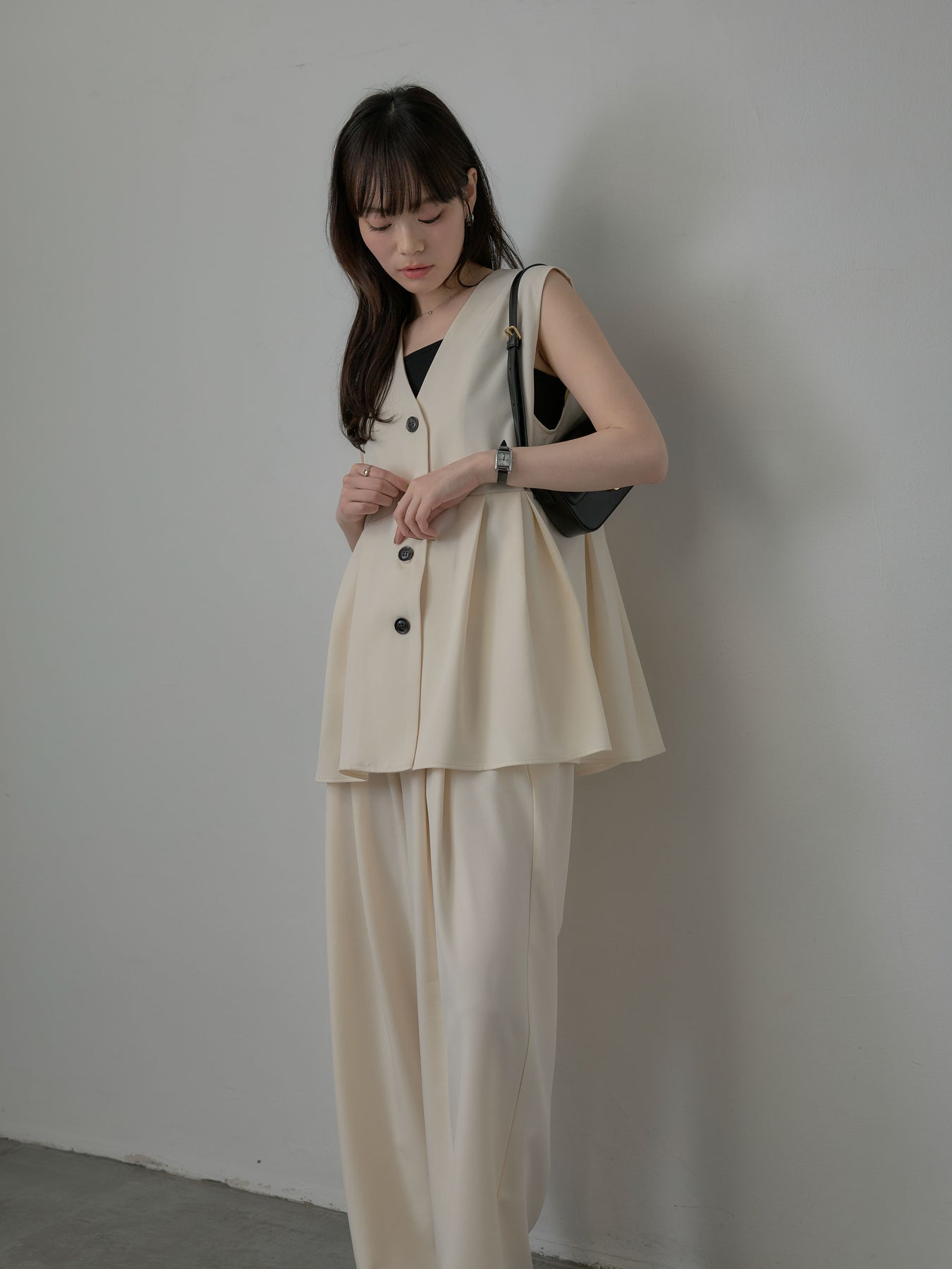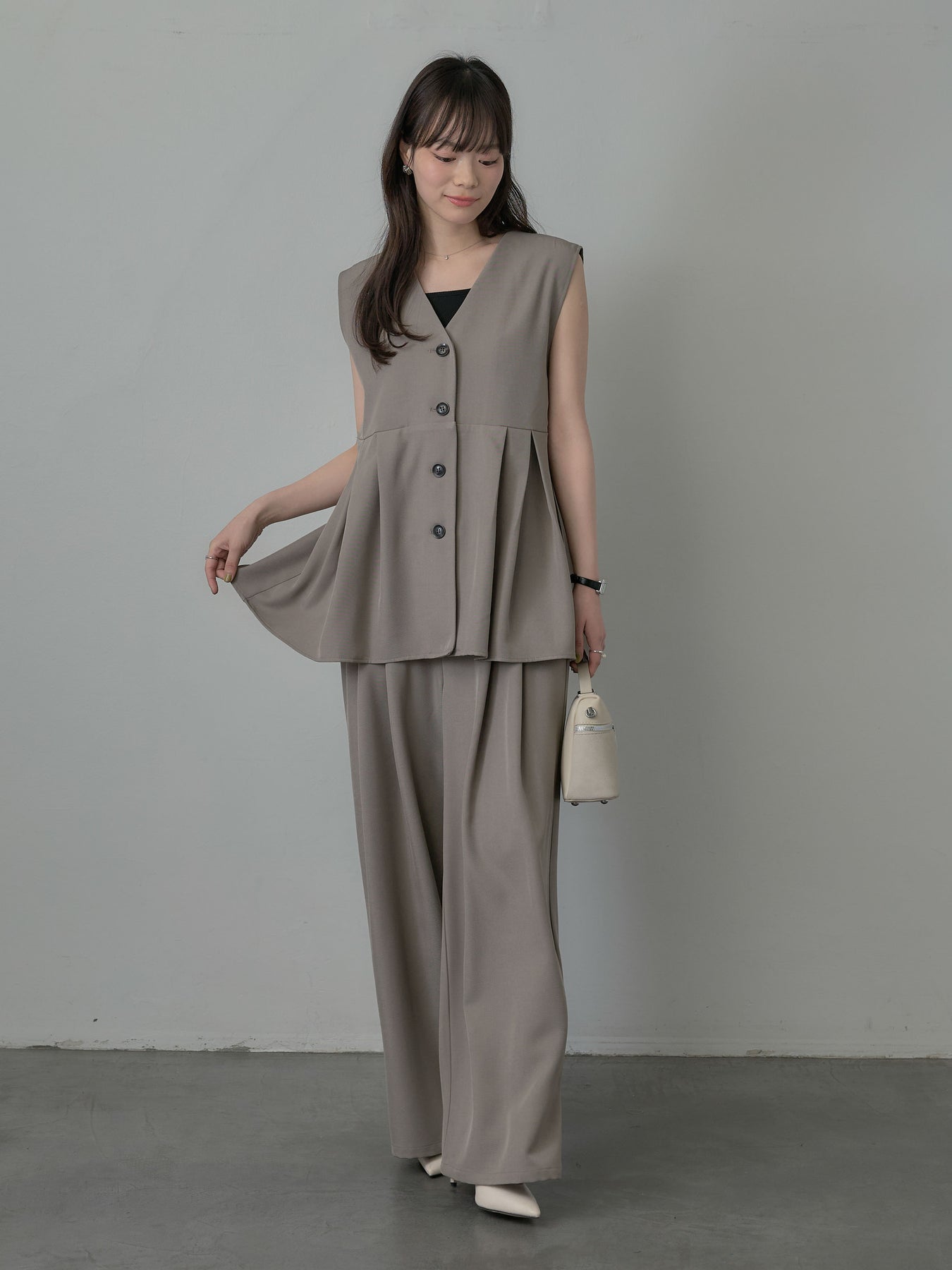 きちんと感のあるベスト。同素材のパンツとのセットアップがおすすめ。タック入りで女性らしい印象に仕上がります。ボトムスにチュールスカートなどボリューム感のあるアイテムを合わせても大人可愛く着ていただけます。