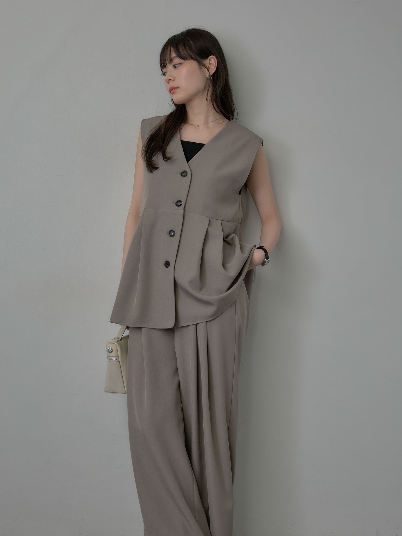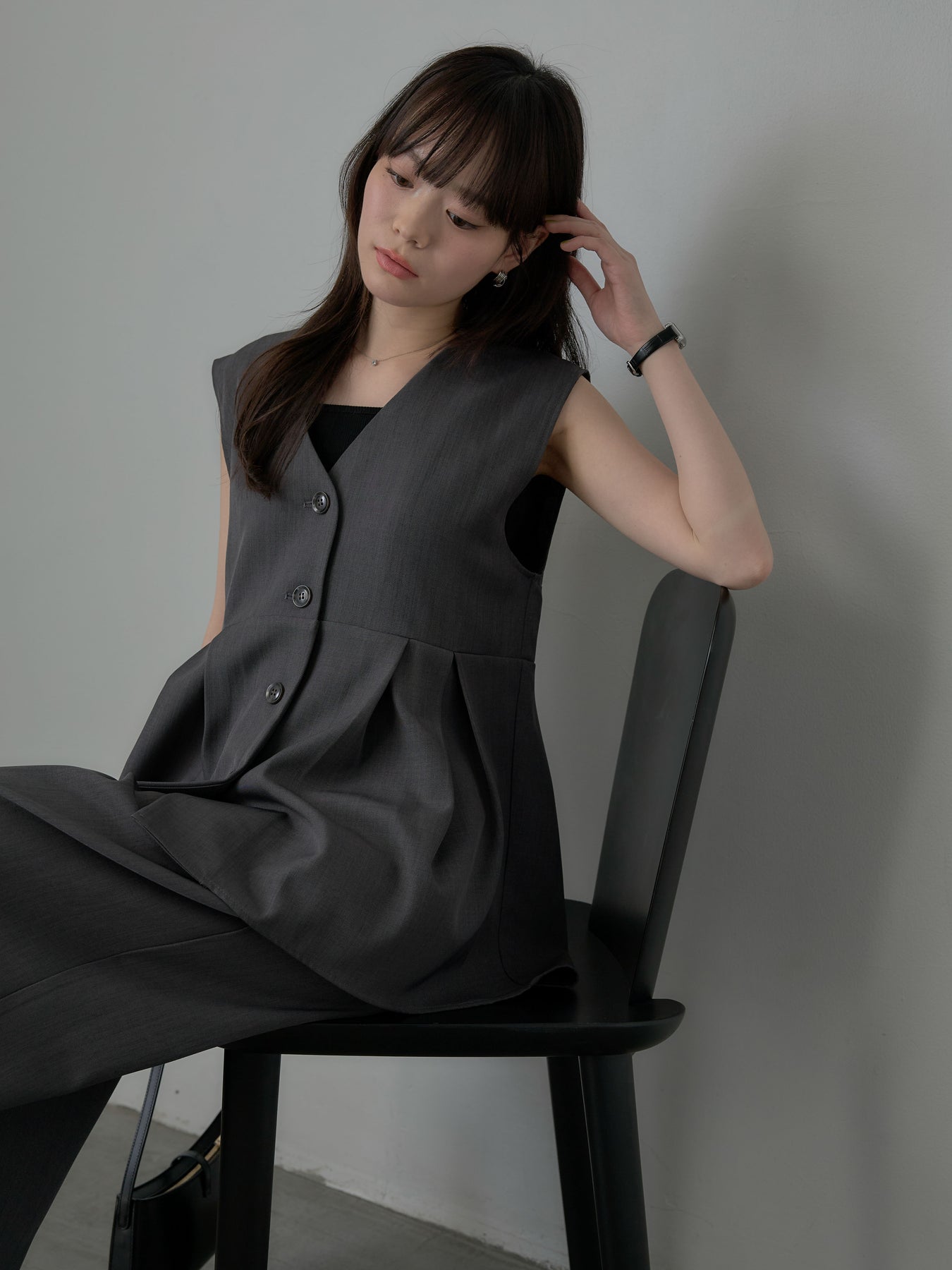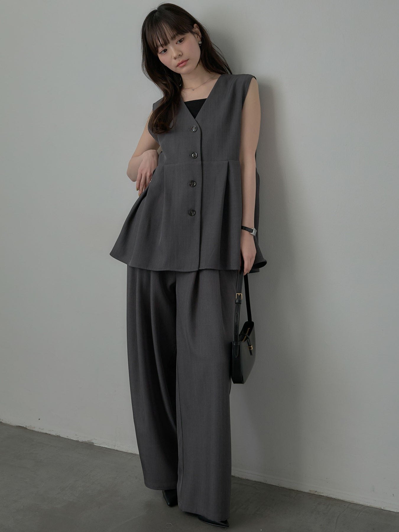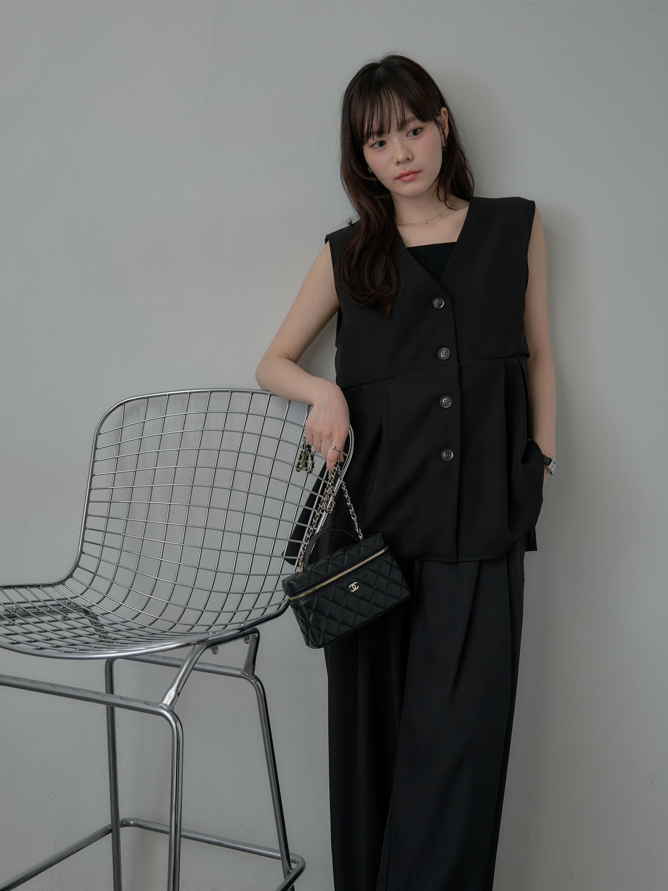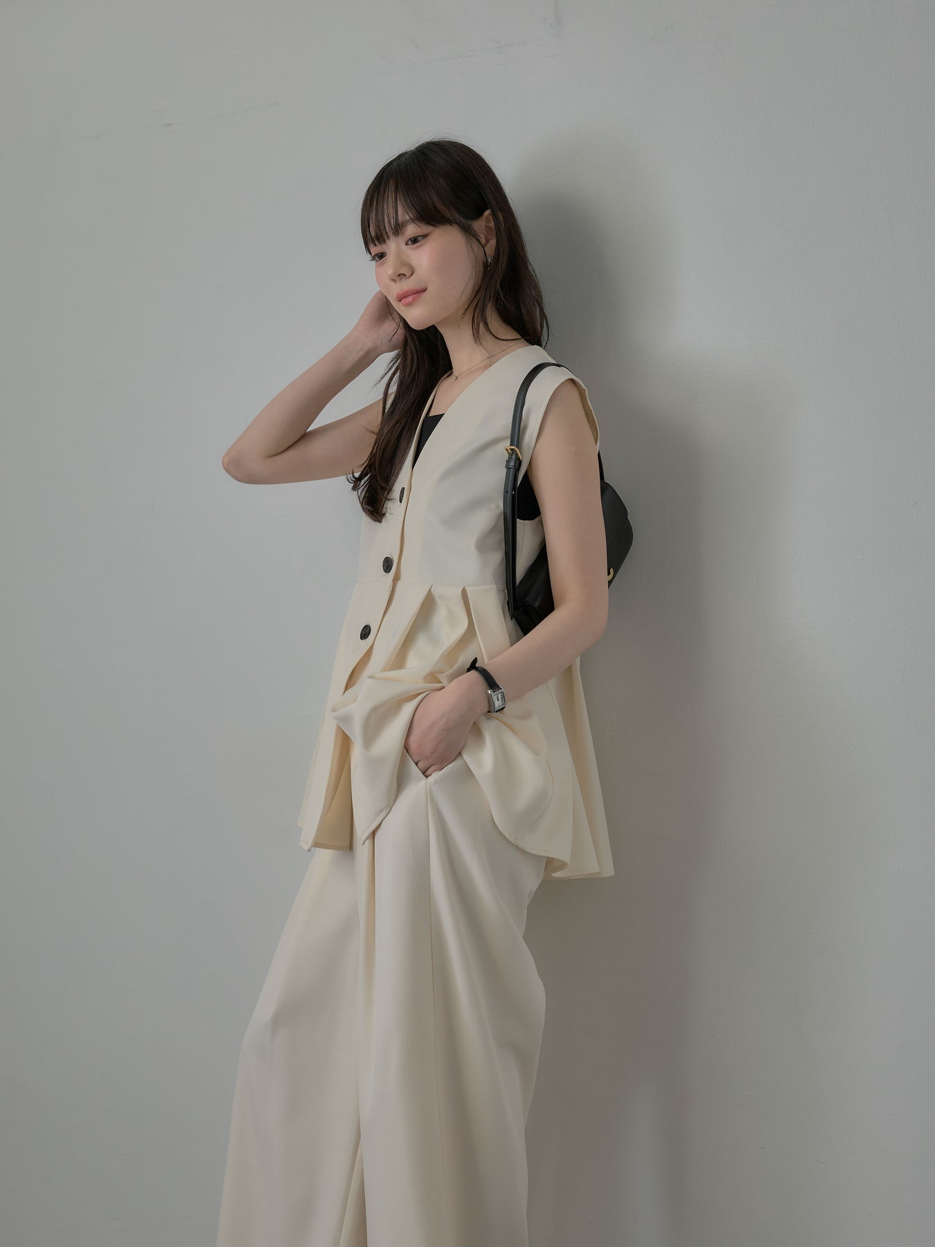 きちんと感のあるベスト。同素材のパンツとのセットアップがおすすめ。タック入りで女性らしい印象に仕上がります。ボトムスにチュールスカートなどボリューム感のあるアイテムを合わせても大人可愛く着ていただけます。
