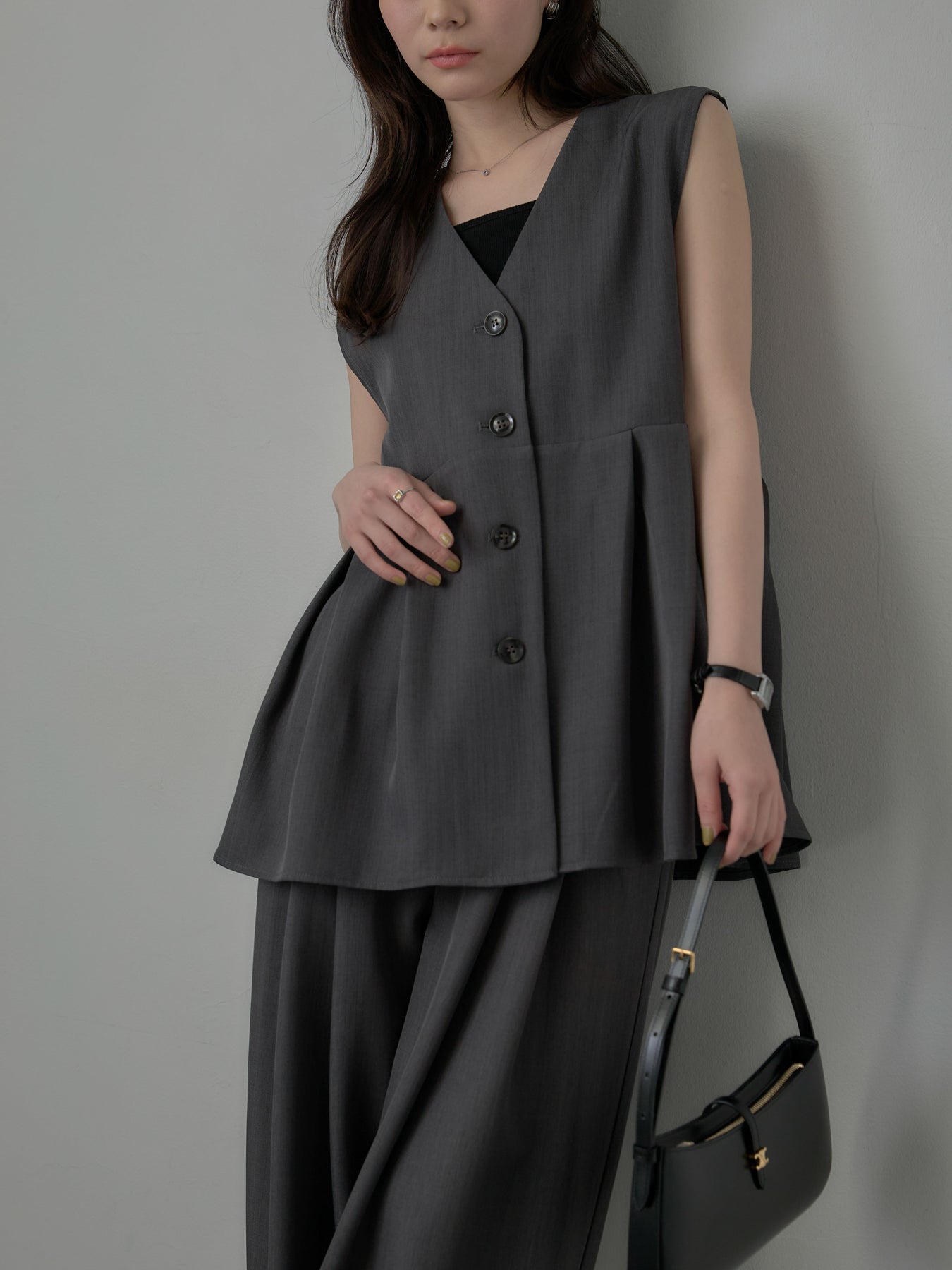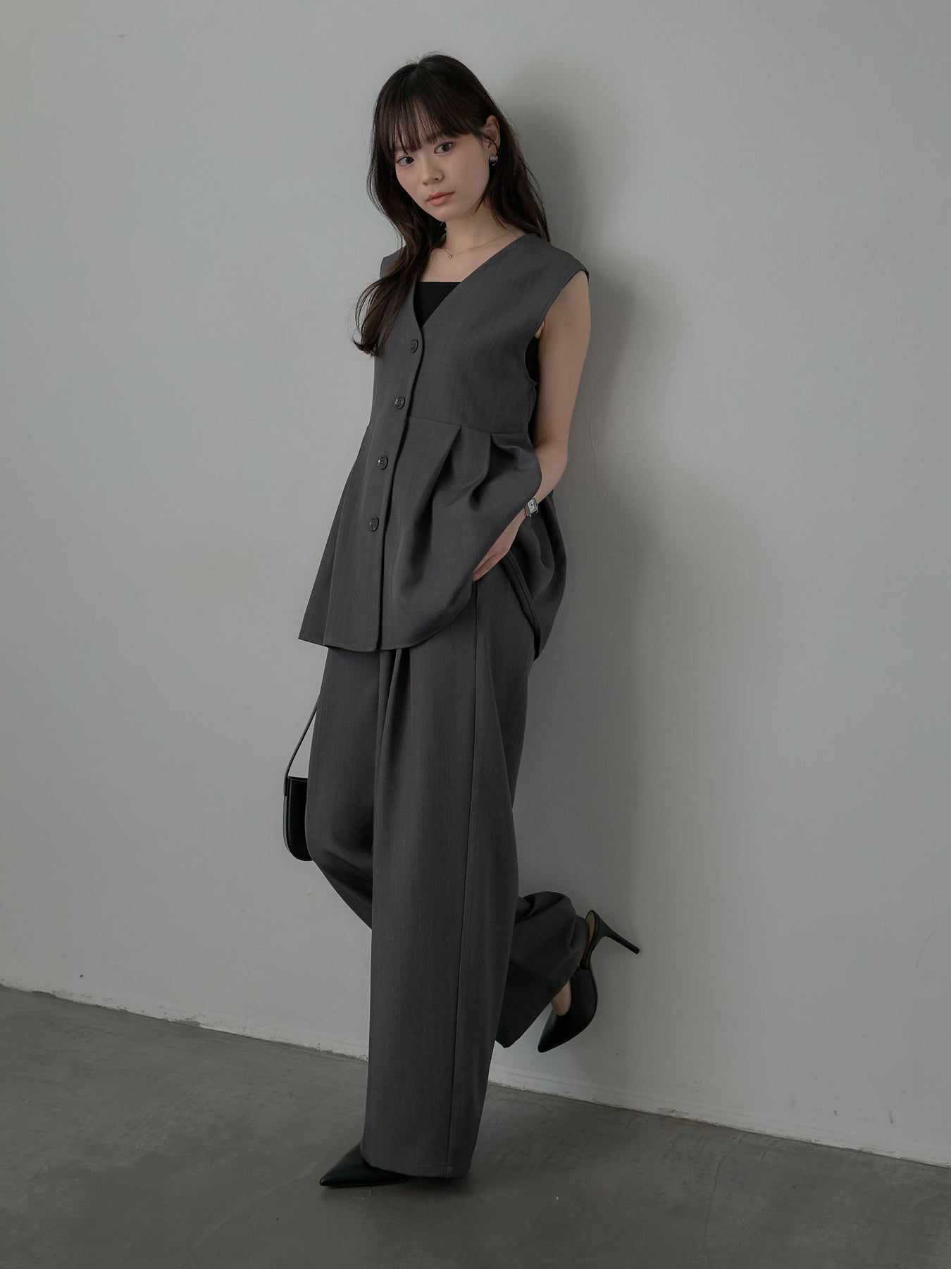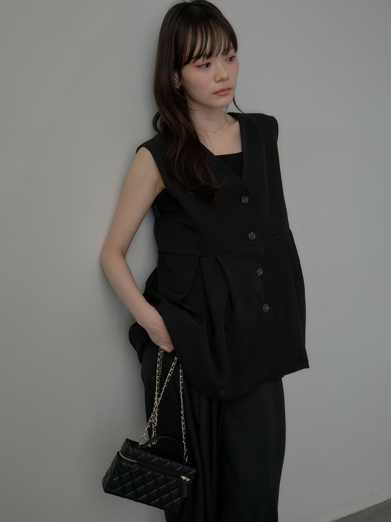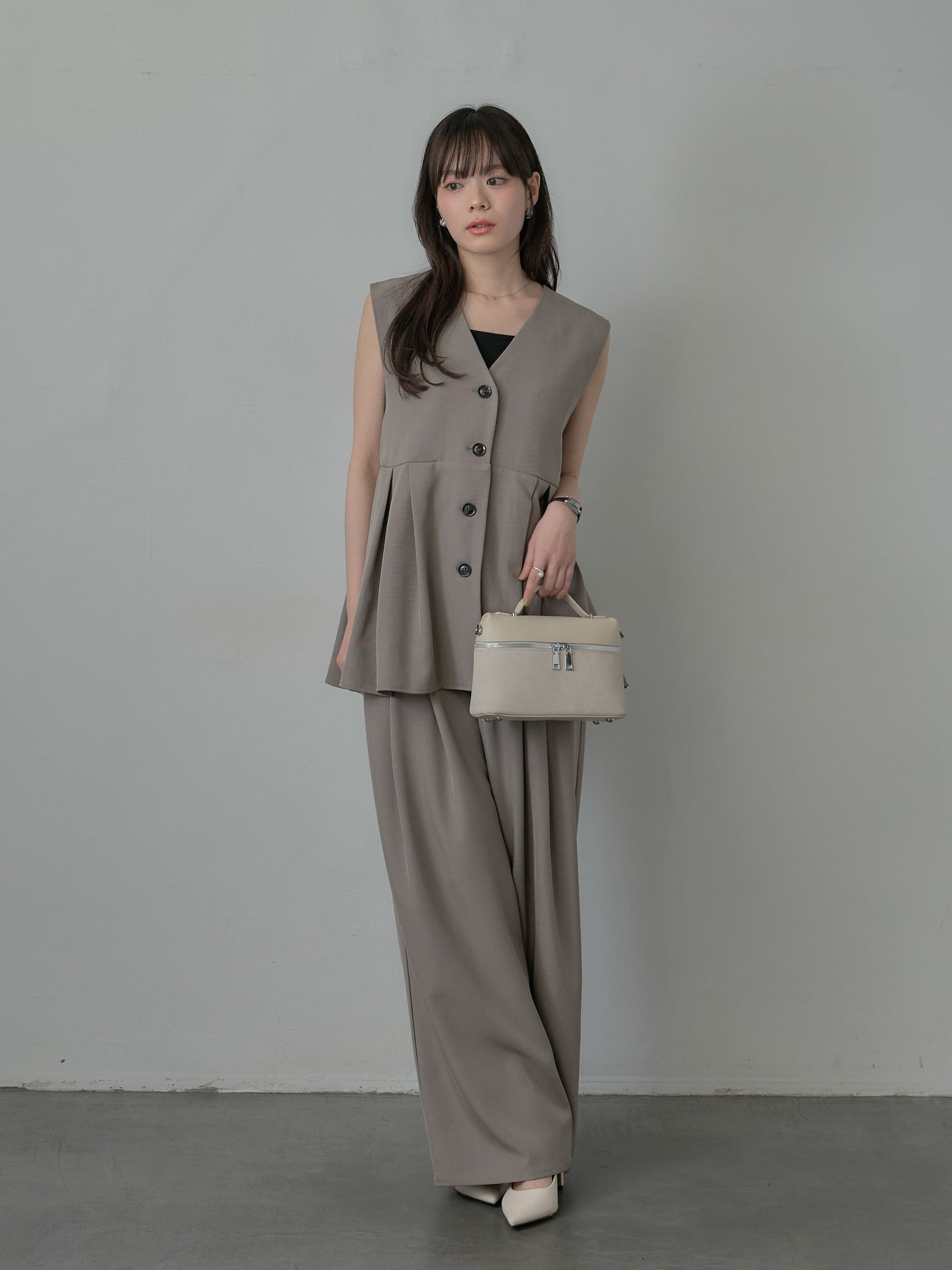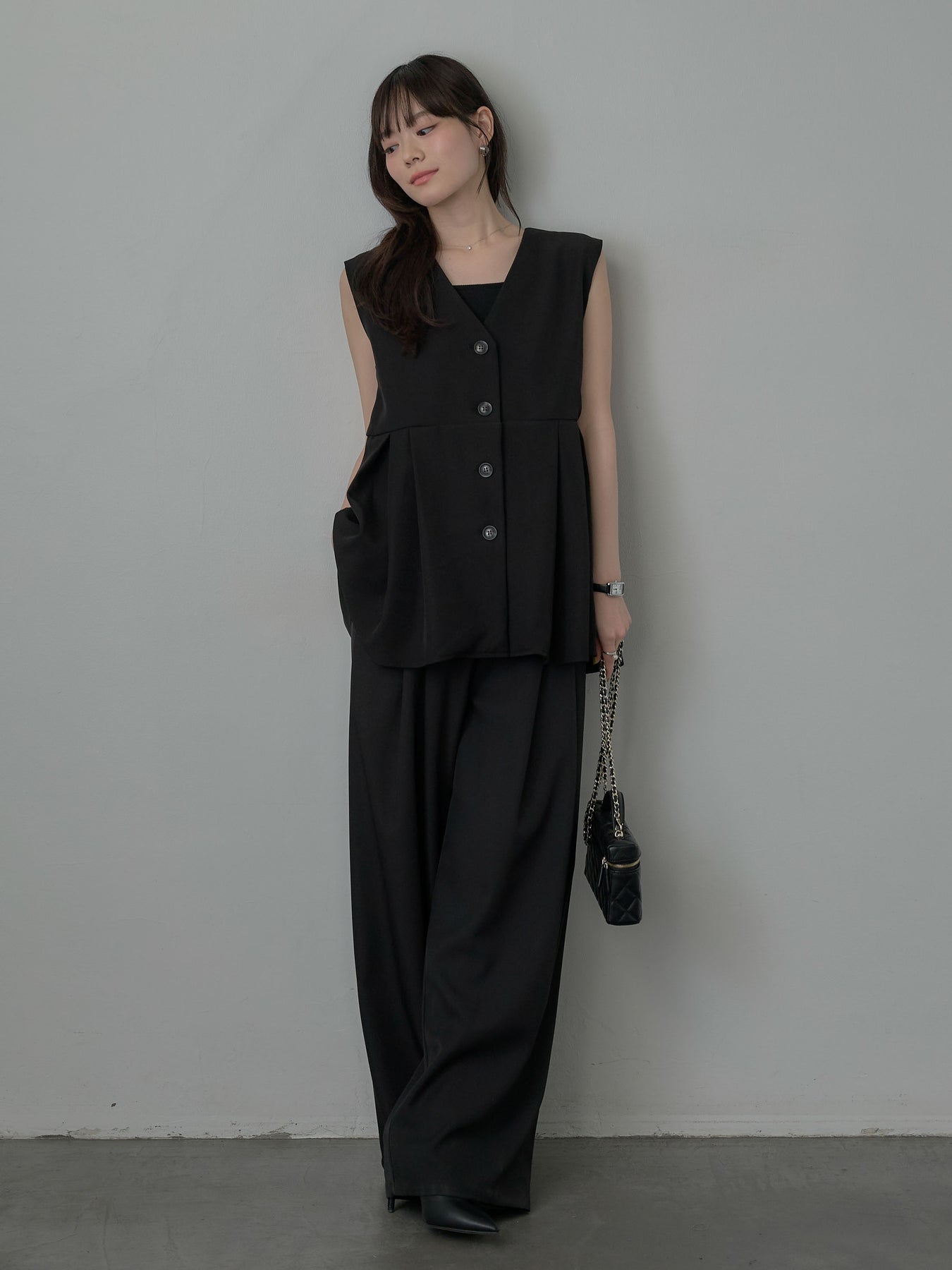 きちんと感のあるベスト。同素材のパンツとのセットアップがおすすめ。タック入りで女性らしい印象に仕上がります。ボトムスにチュールスカートなどボリューム感のあるアイテムを合わせても大人可愛く着ていただけます。