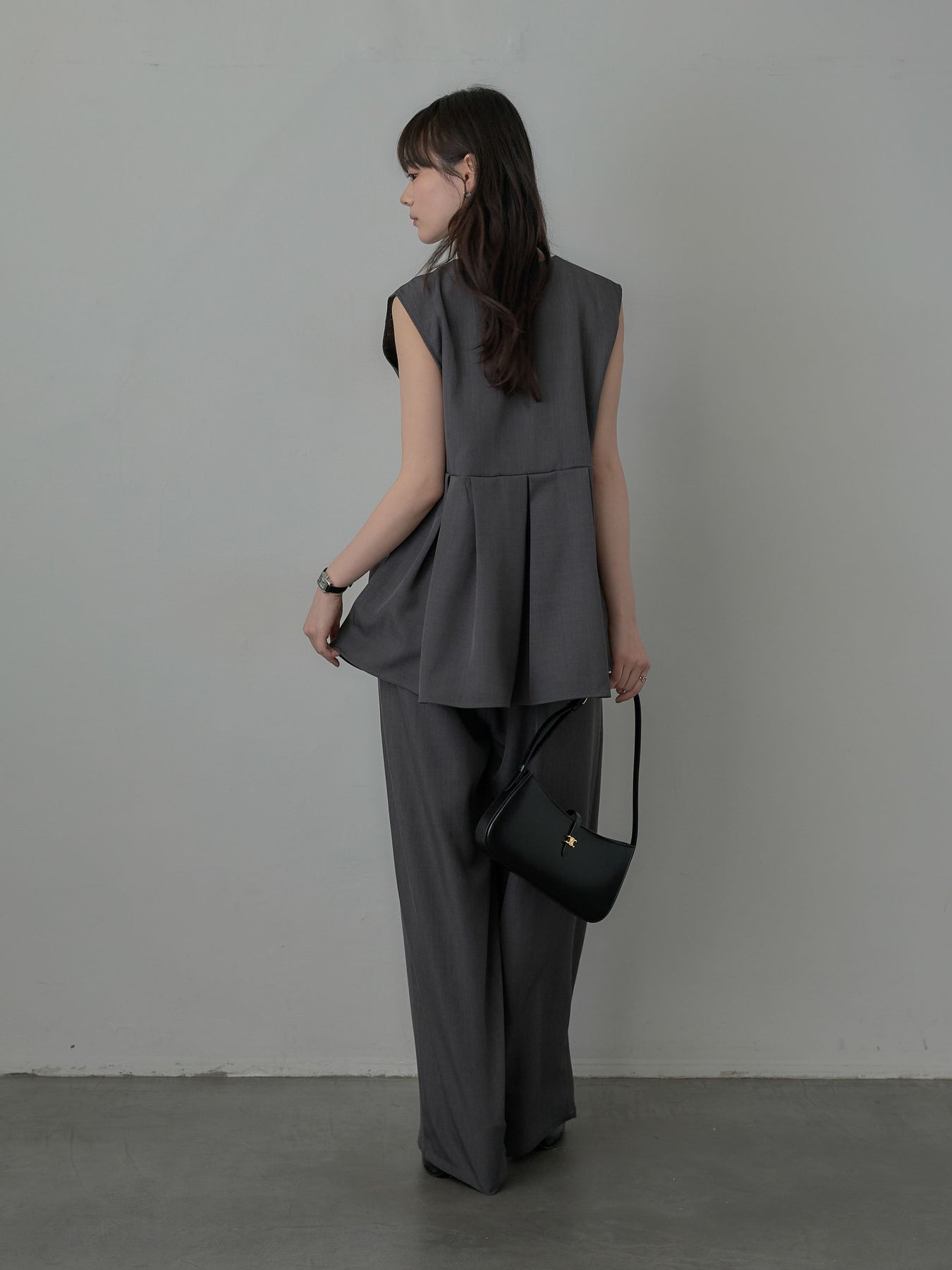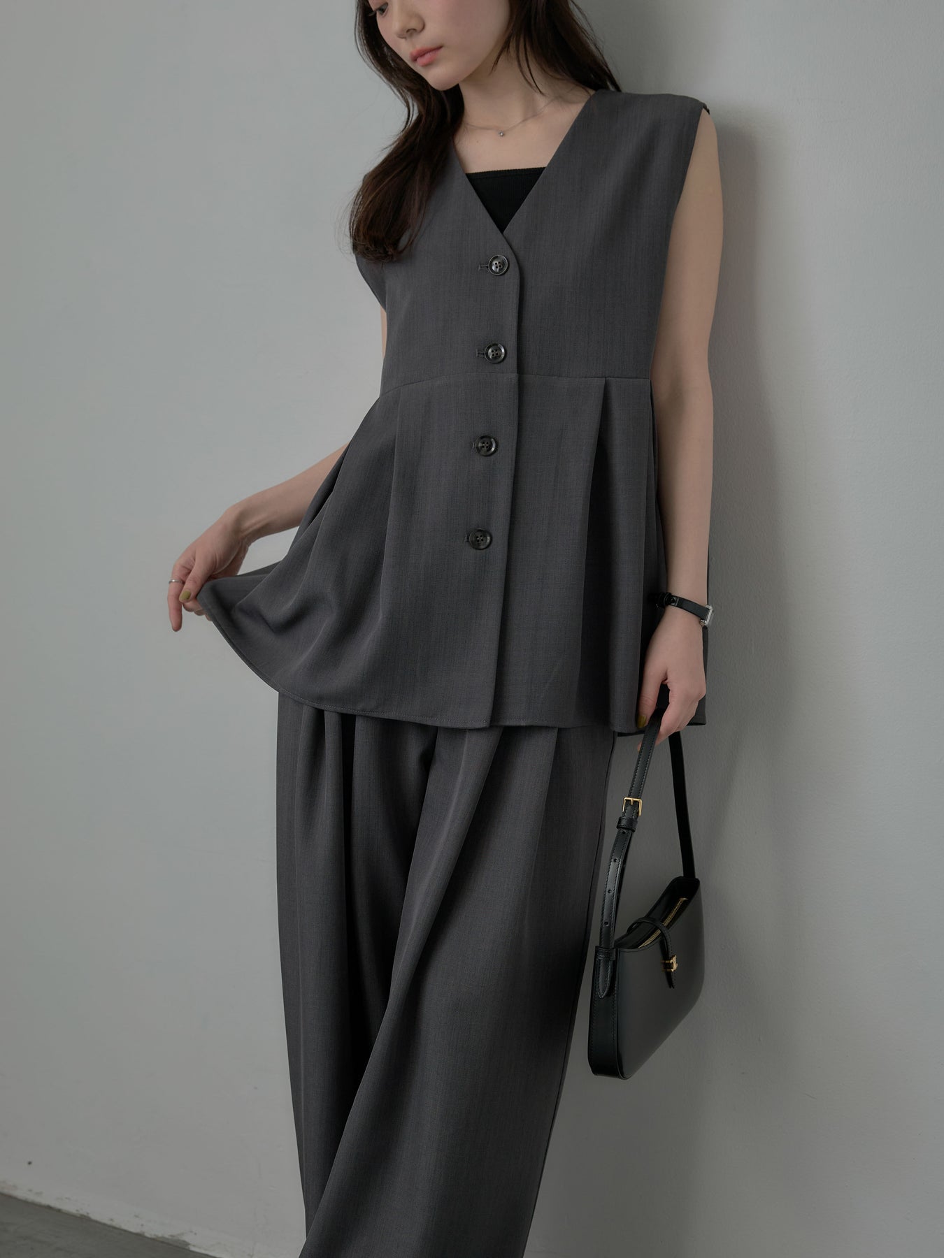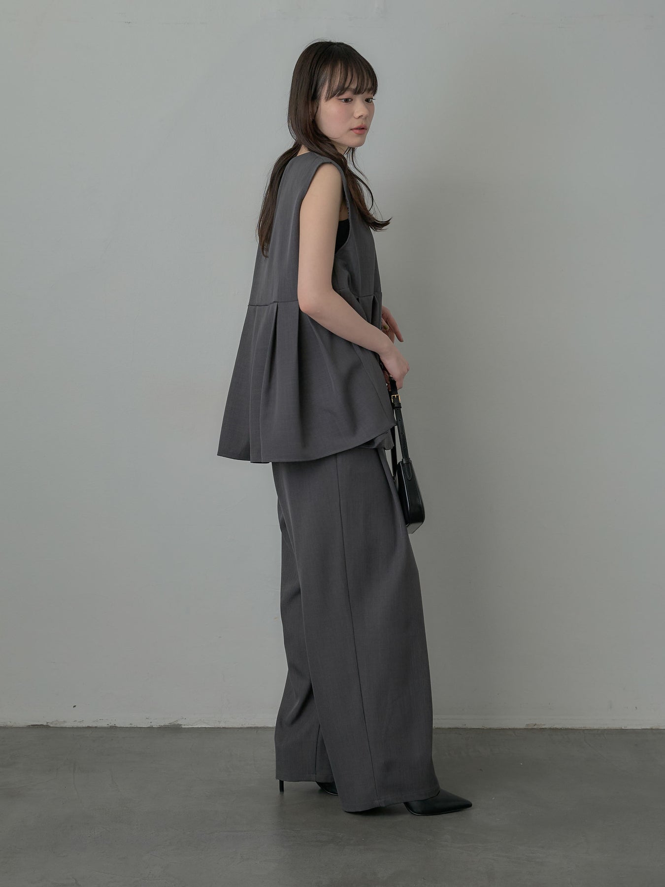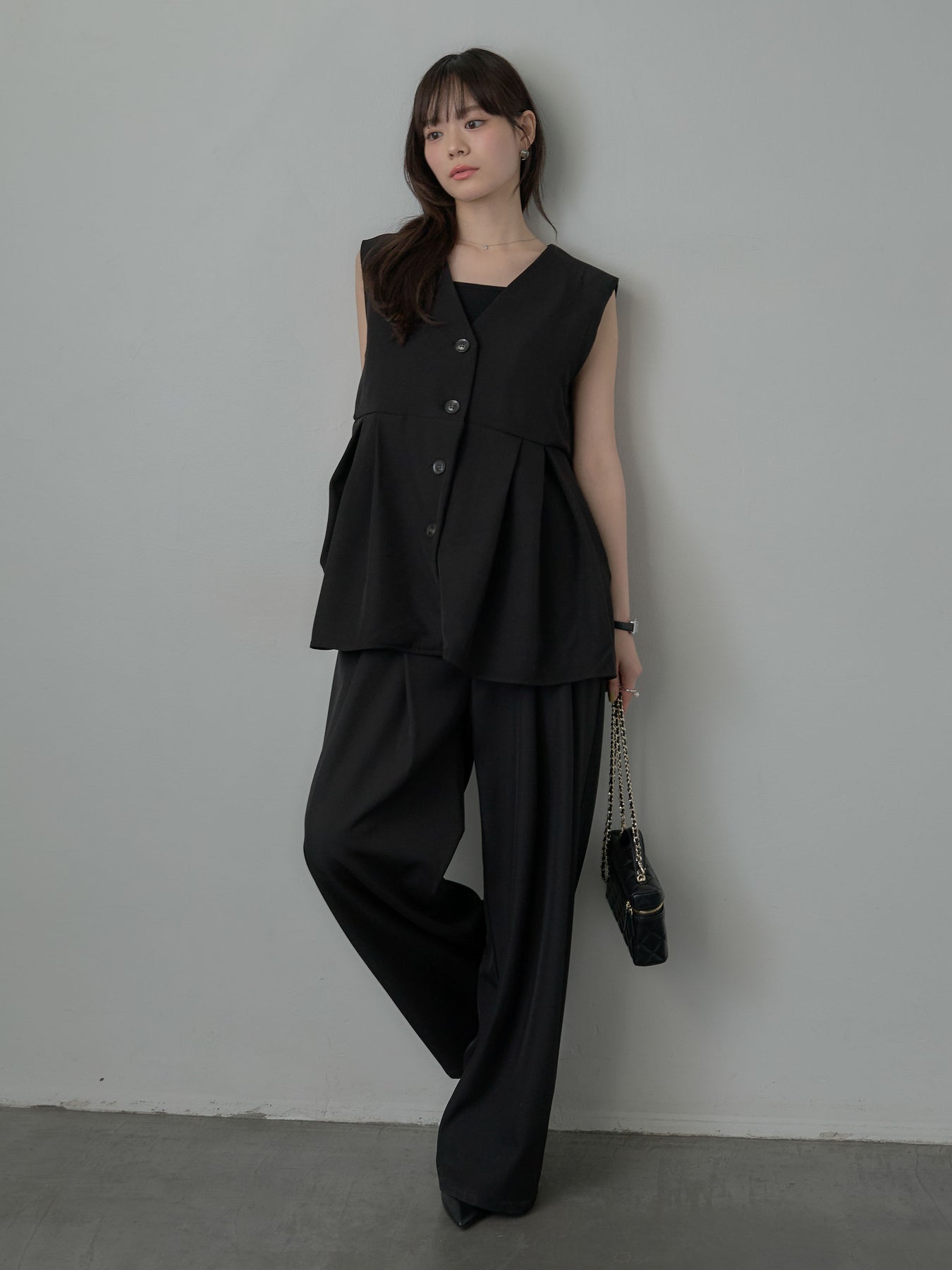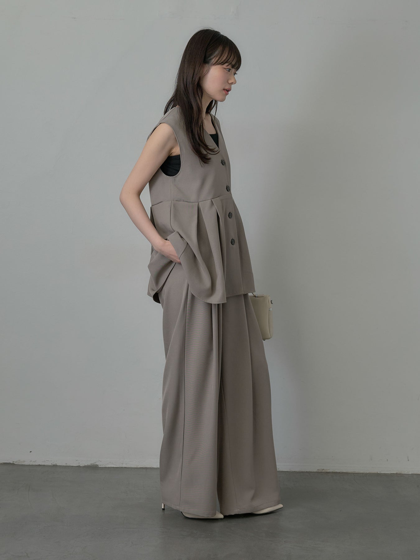 きちんと感のあるベスト。同素材のパンツとのセットアップがおすすめ。タック入りで女性らしい印象に仕上がります。ボトムスにチュールスカートなどボリューム感のあるアイテムを合わせても大人可愛く着ていただけます。
