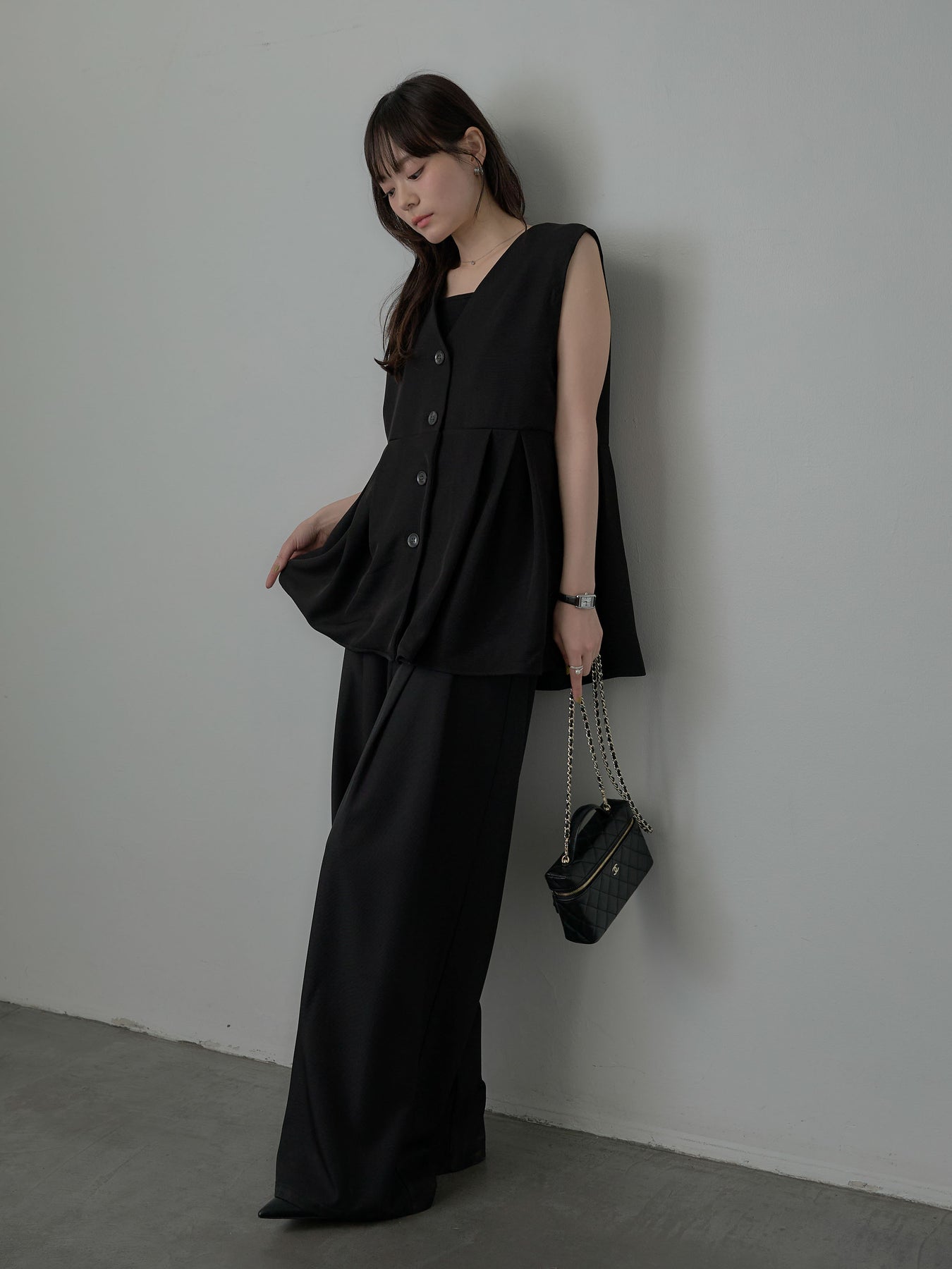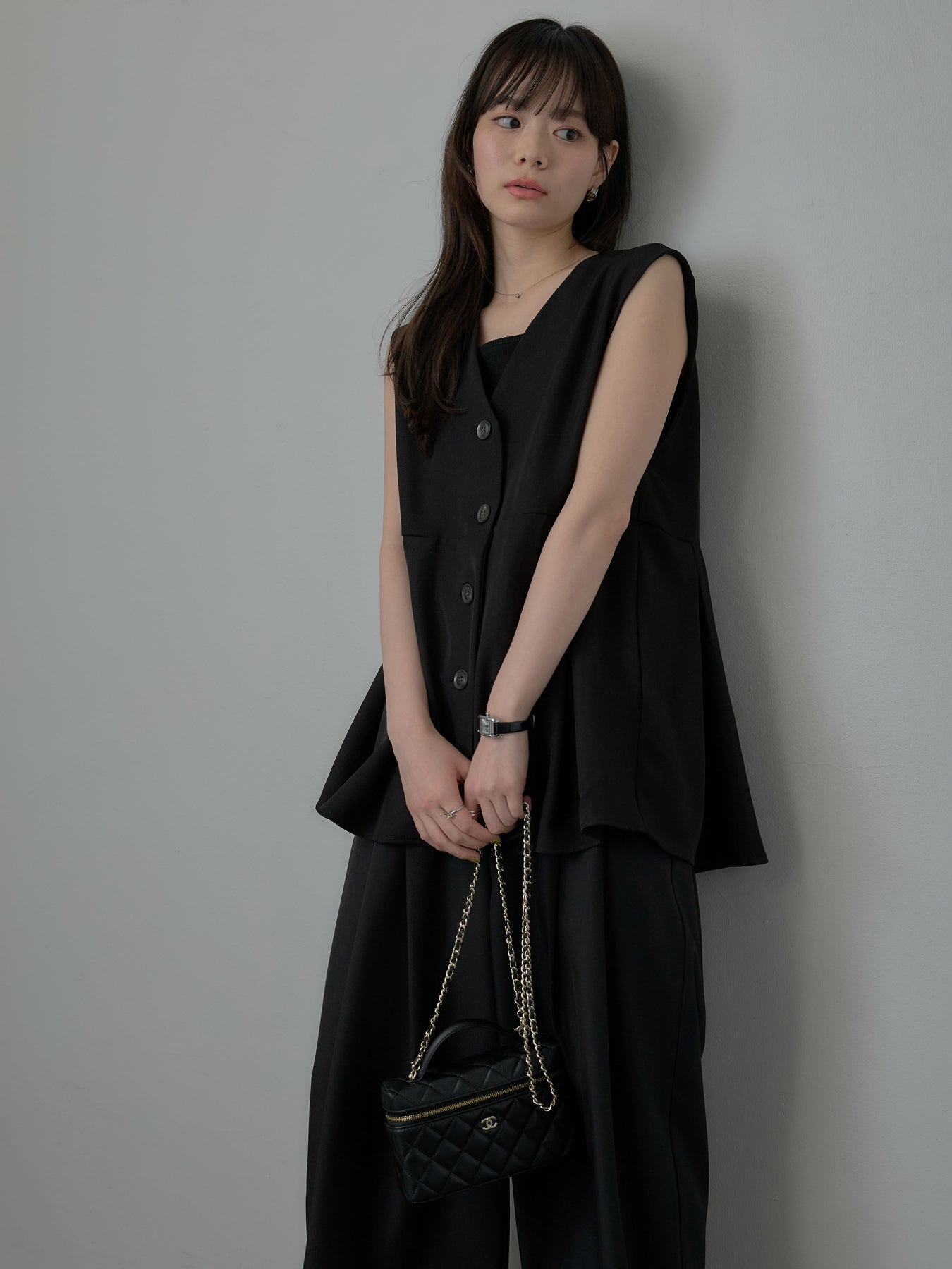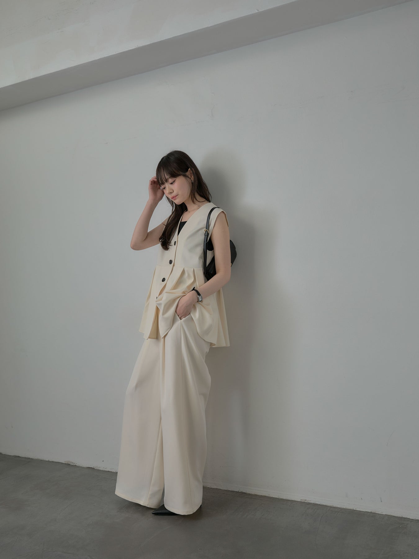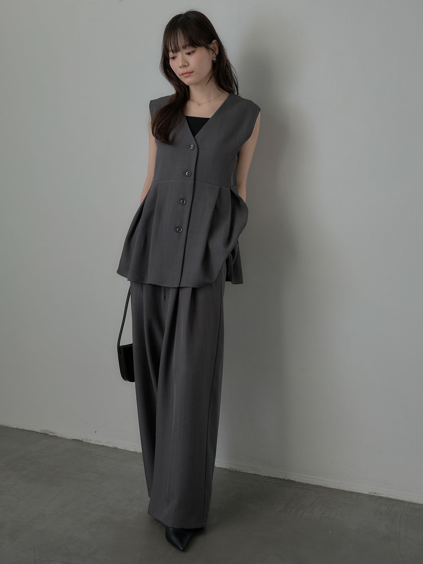 きちんと感のあるベスト。同素材のパンツとのセットアップがおすすめ。タック入りで女性らしい印象に仕上がります。ボトムスにチュールスカートなどボリューム感のあるアイテムを合わせても大人可愛く着ていただけます。