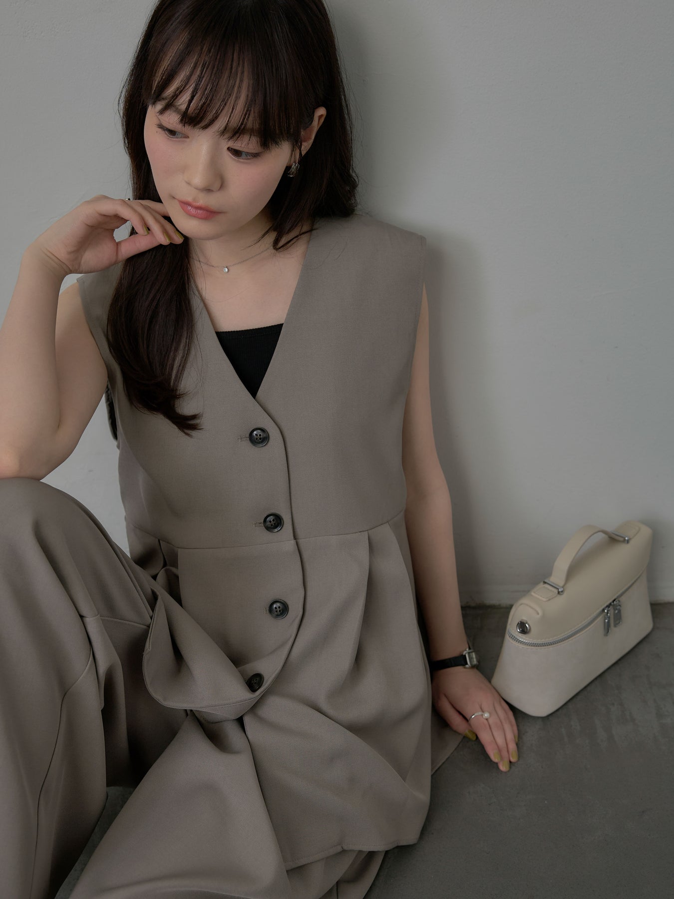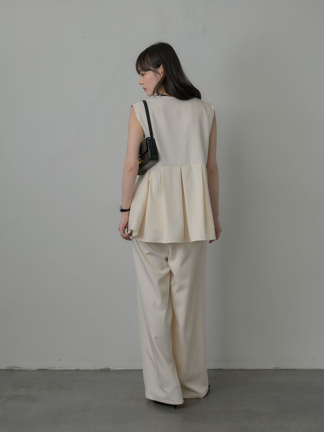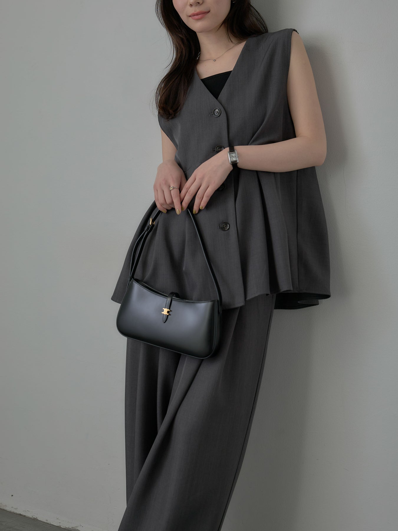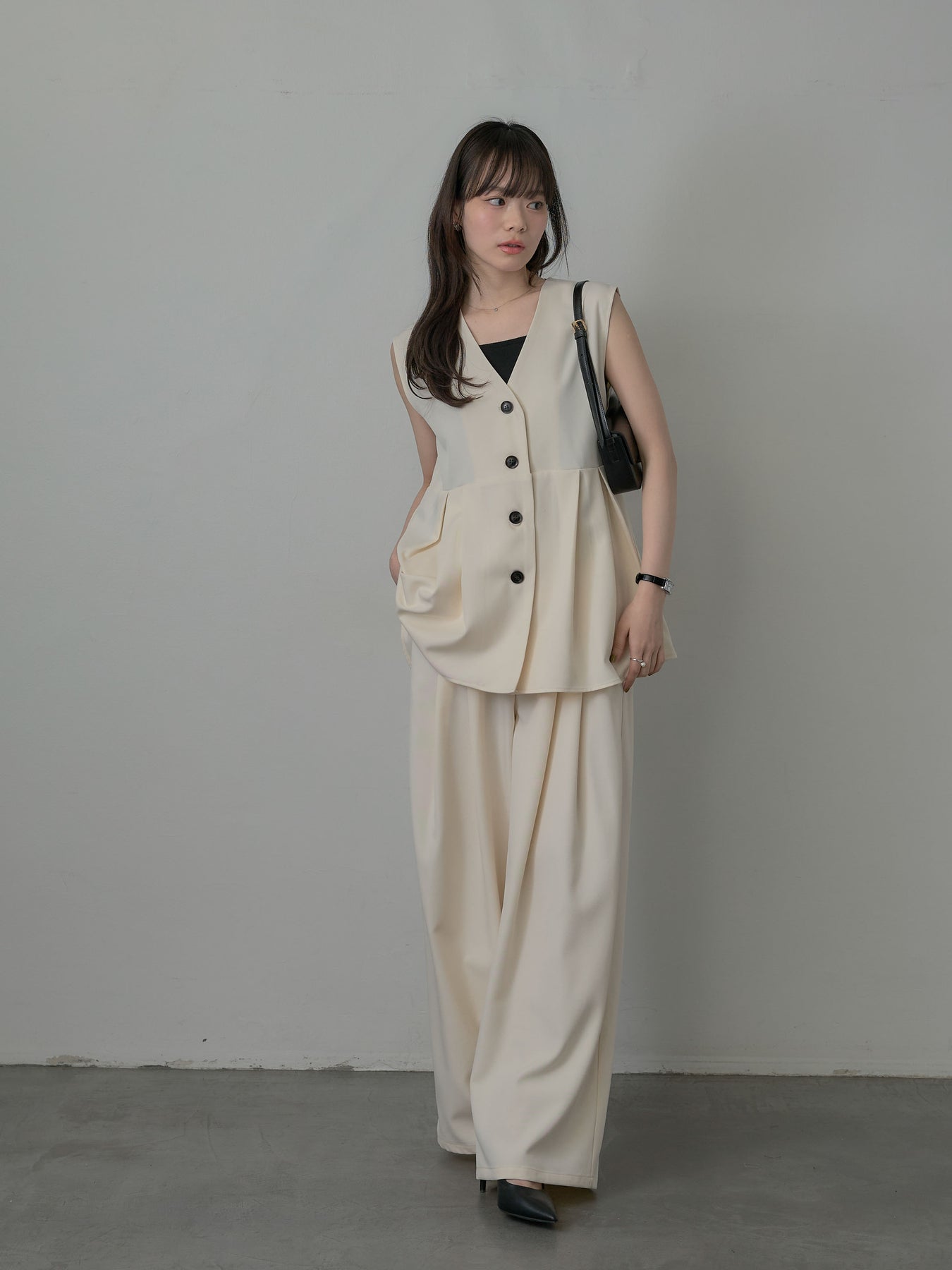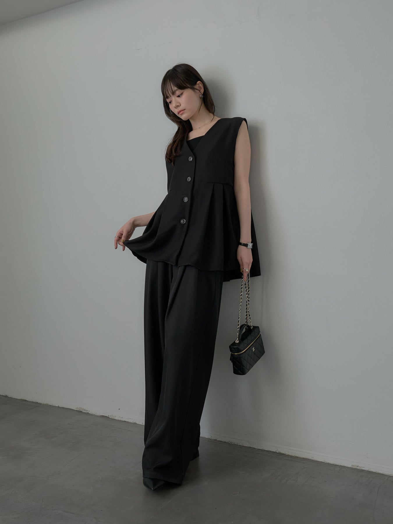 きちんと感のあるベスト。同素材のパンツとのセットアップがおすすめ。タック入りで女性らしい印象に仕上がります。ボトムスにチュールスカートなどボリューム感のあるアイテムを合わせても大人可愛く着ていただけます。