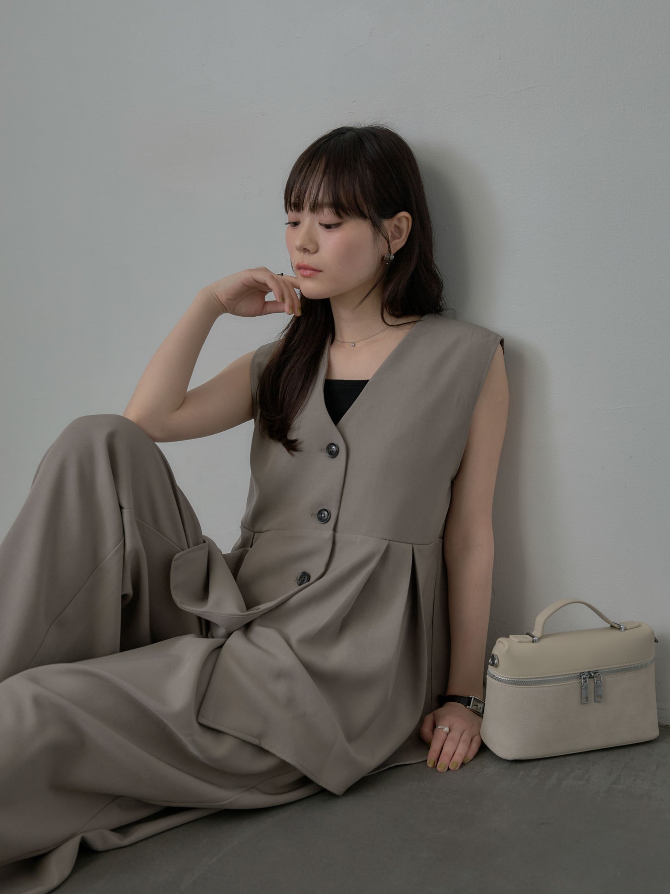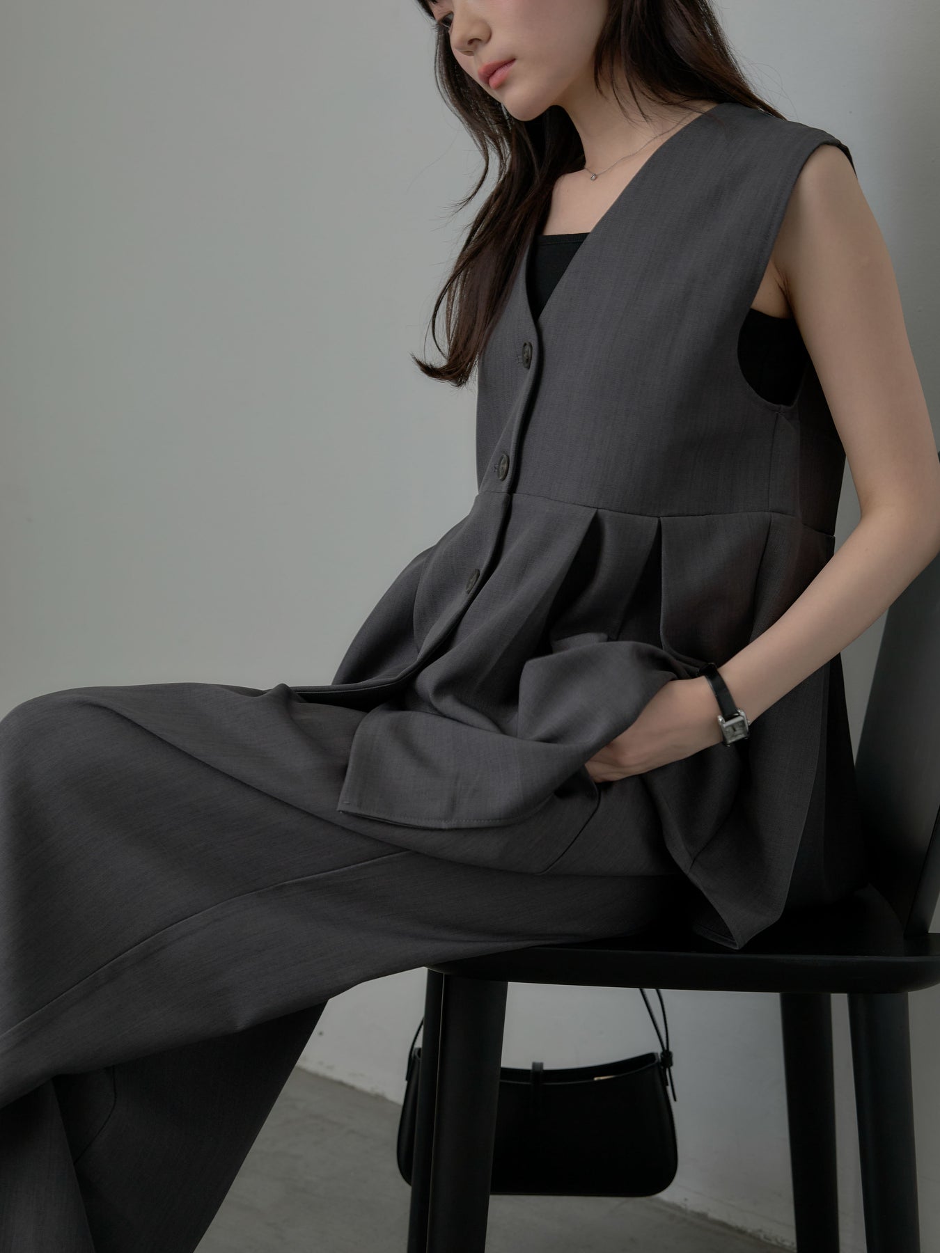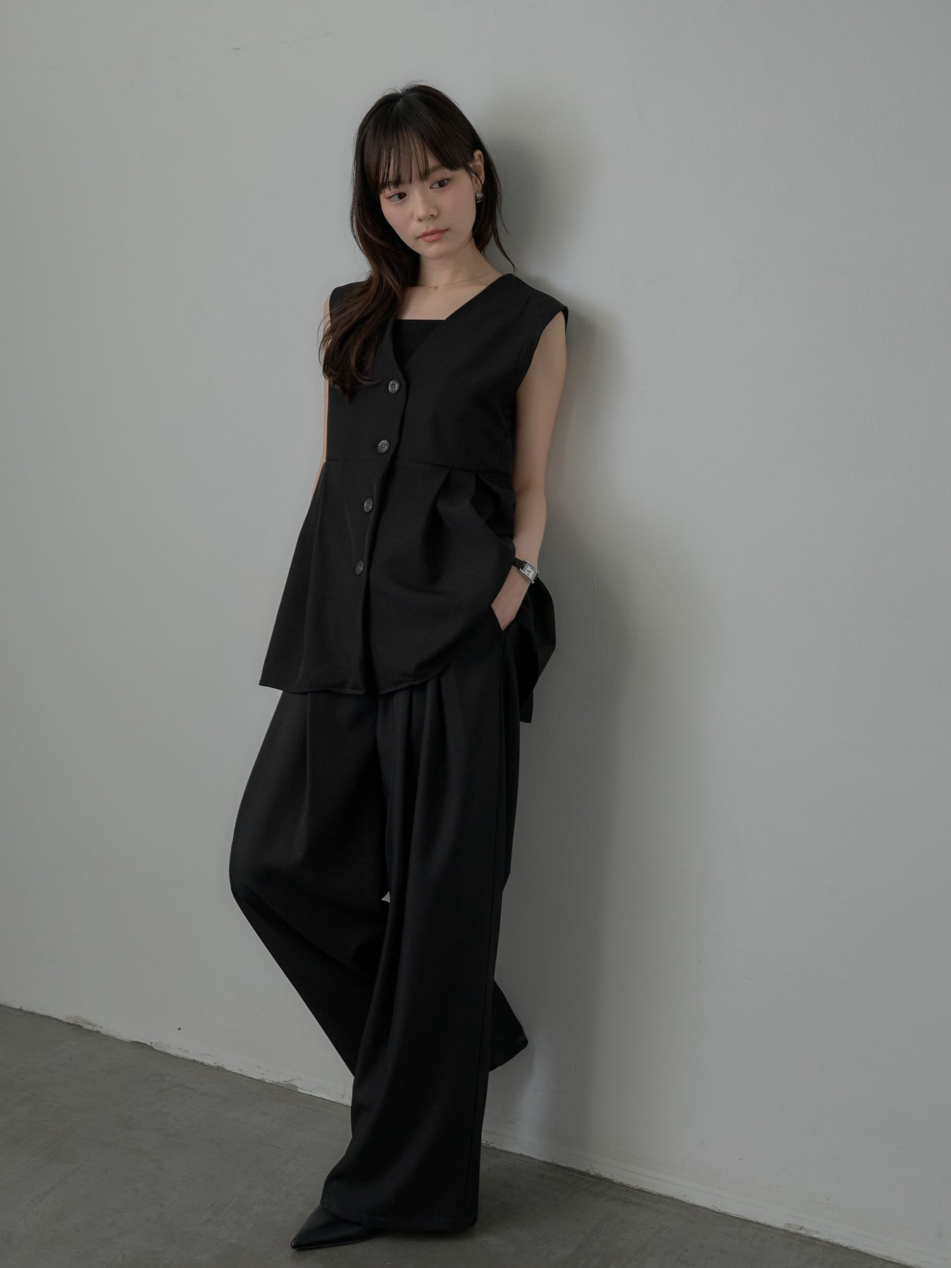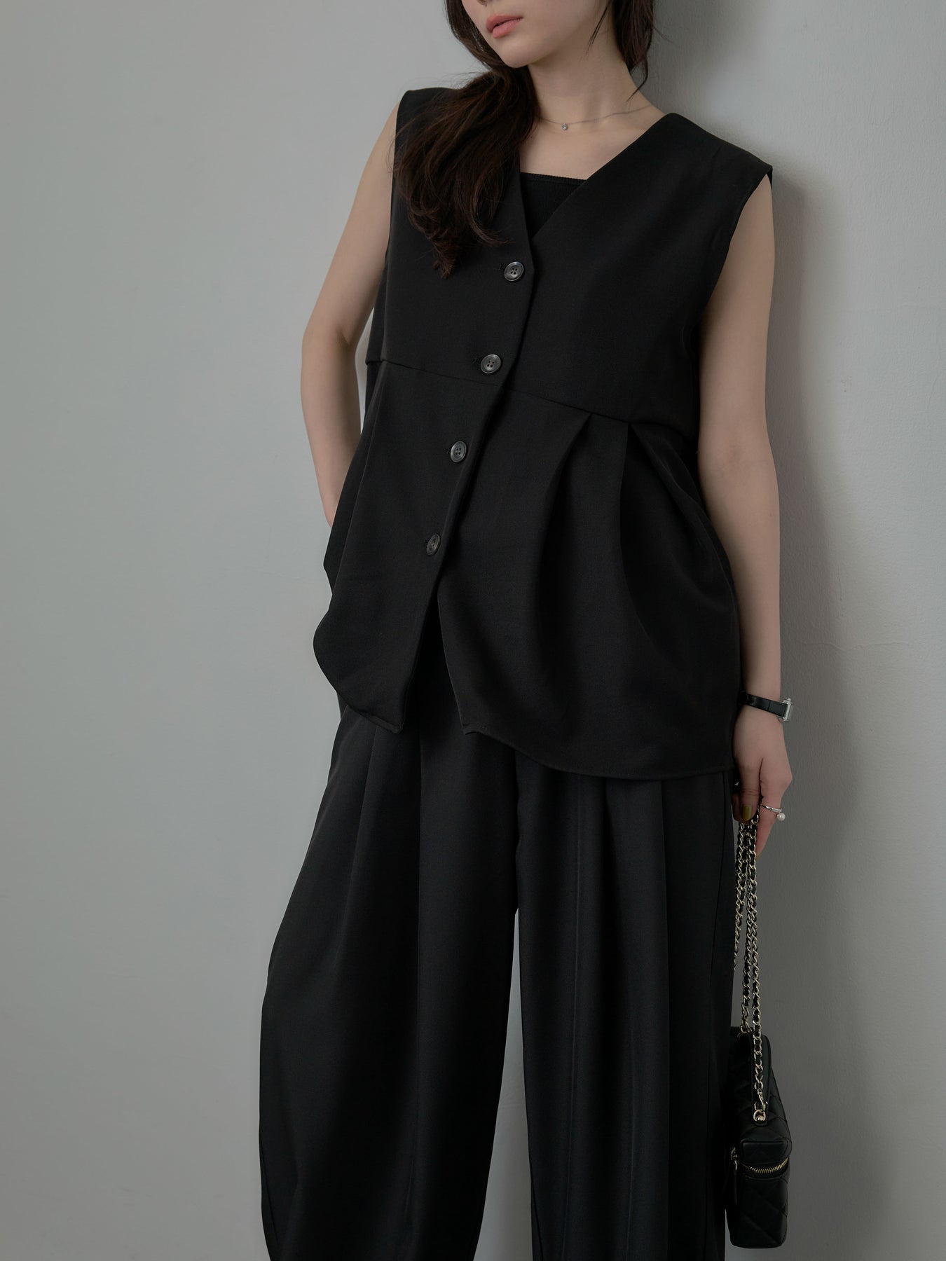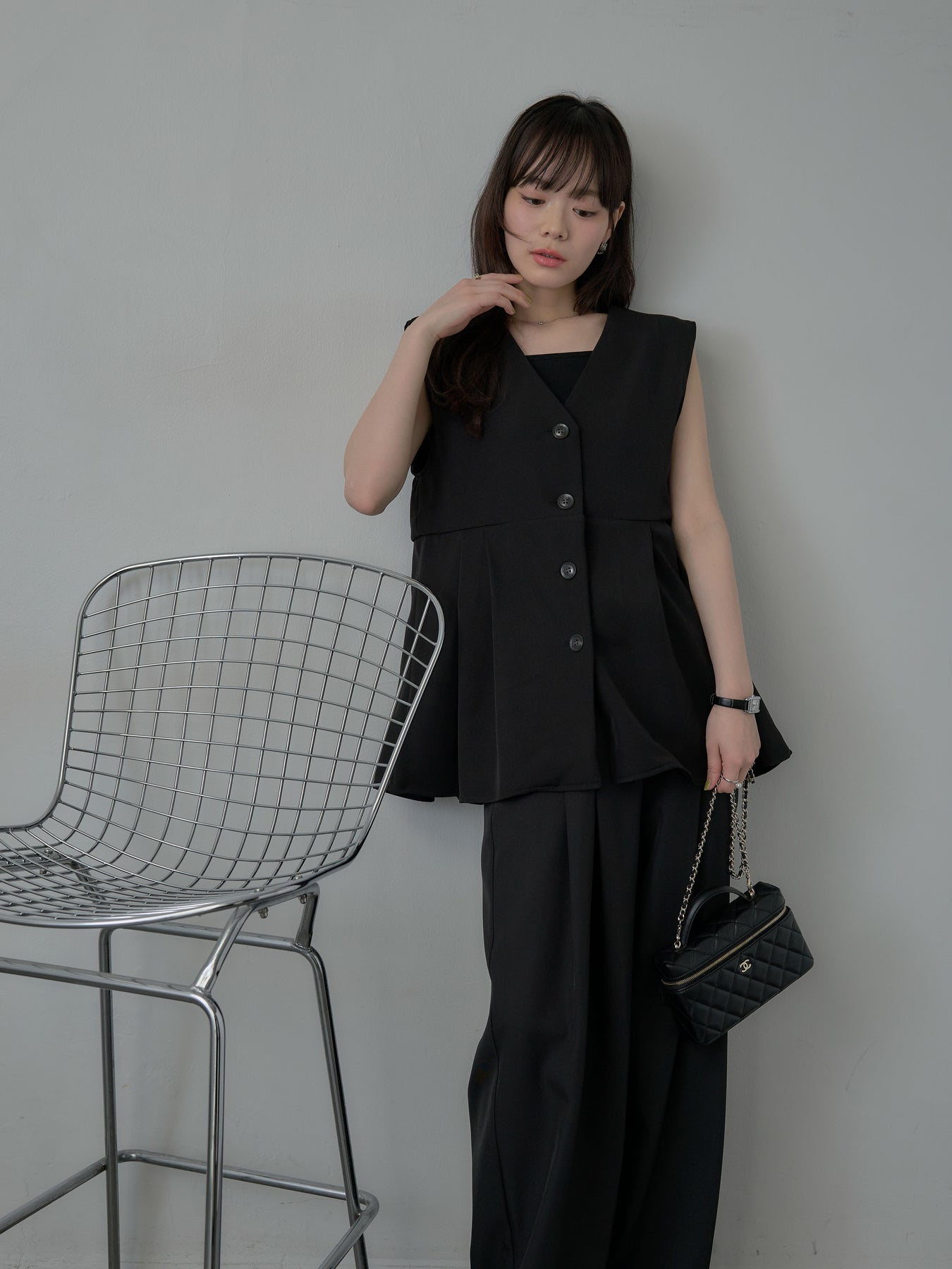 きちんと感のあるベスト。同素材のパンツとのセットアップがおすすめ。タック入りで女性らしい印象に仕上がります。ボトムスにチュールスカートなどボリューム感のあるアイテムを合わせても大人可愛く着ていただけます。