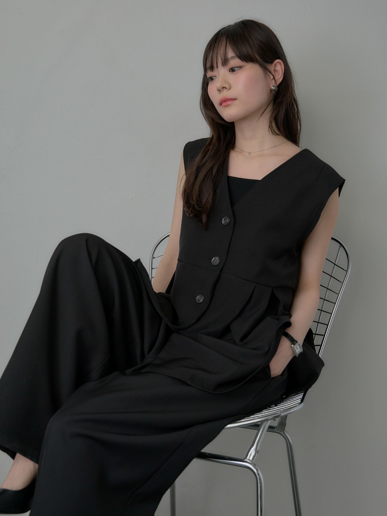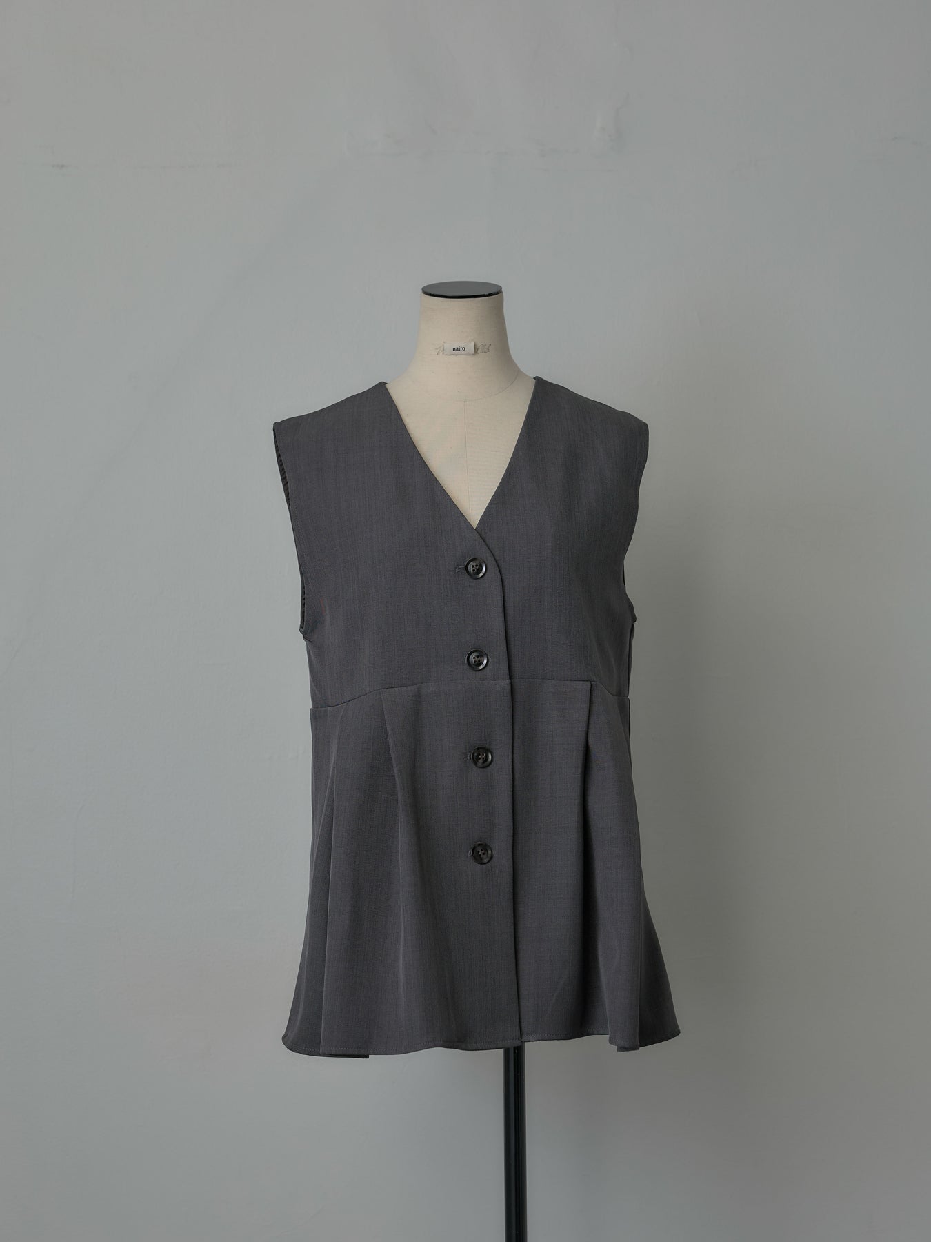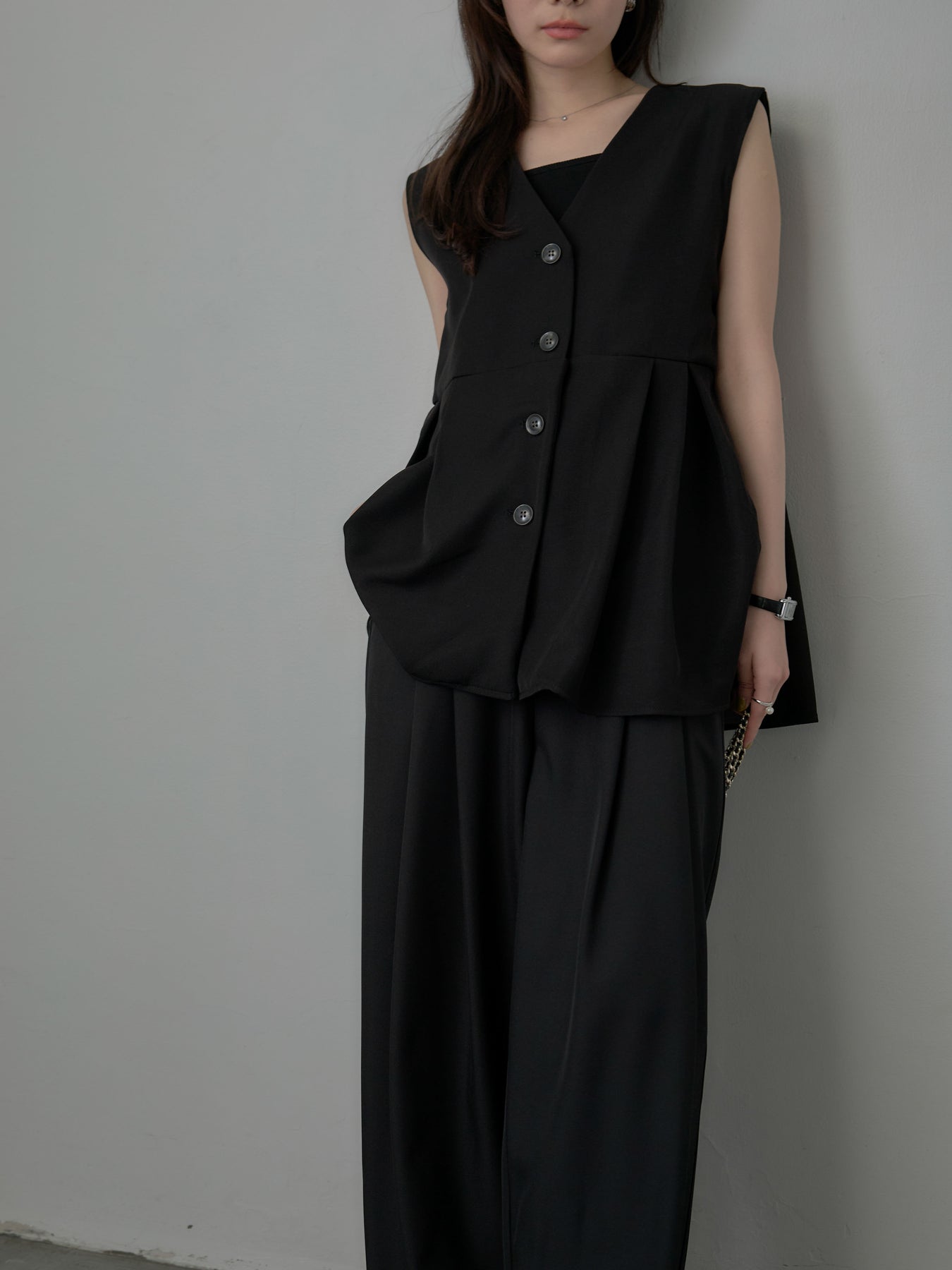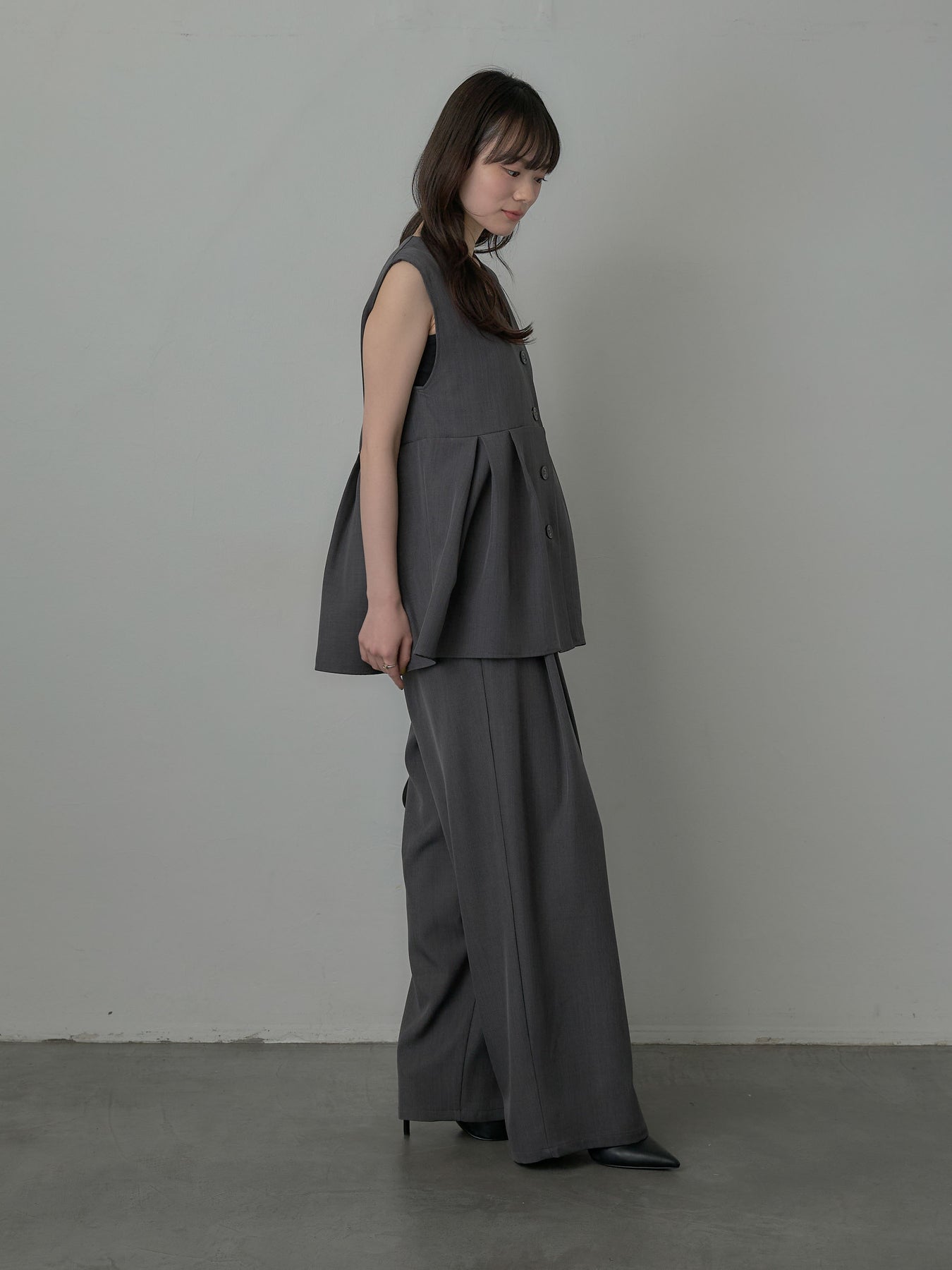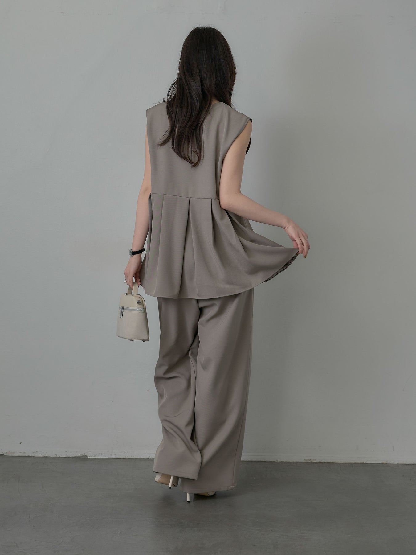 きちんと感のあるベスト。同素材のパンツとのセットアップがおすすめ。タック入りで女性らしい印象に仕上がります。ボトムスにチュールスカートなどボリューム感のあるアイテムを合わせても大人可愛く着ていただけます。