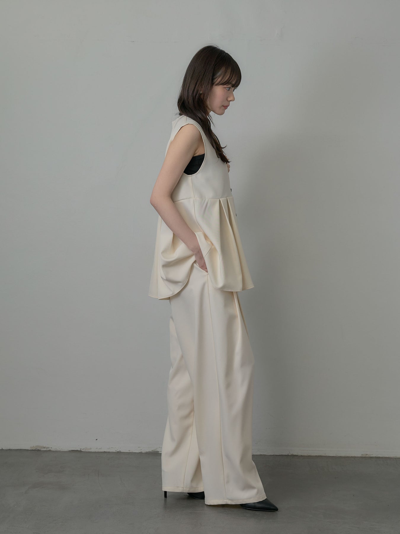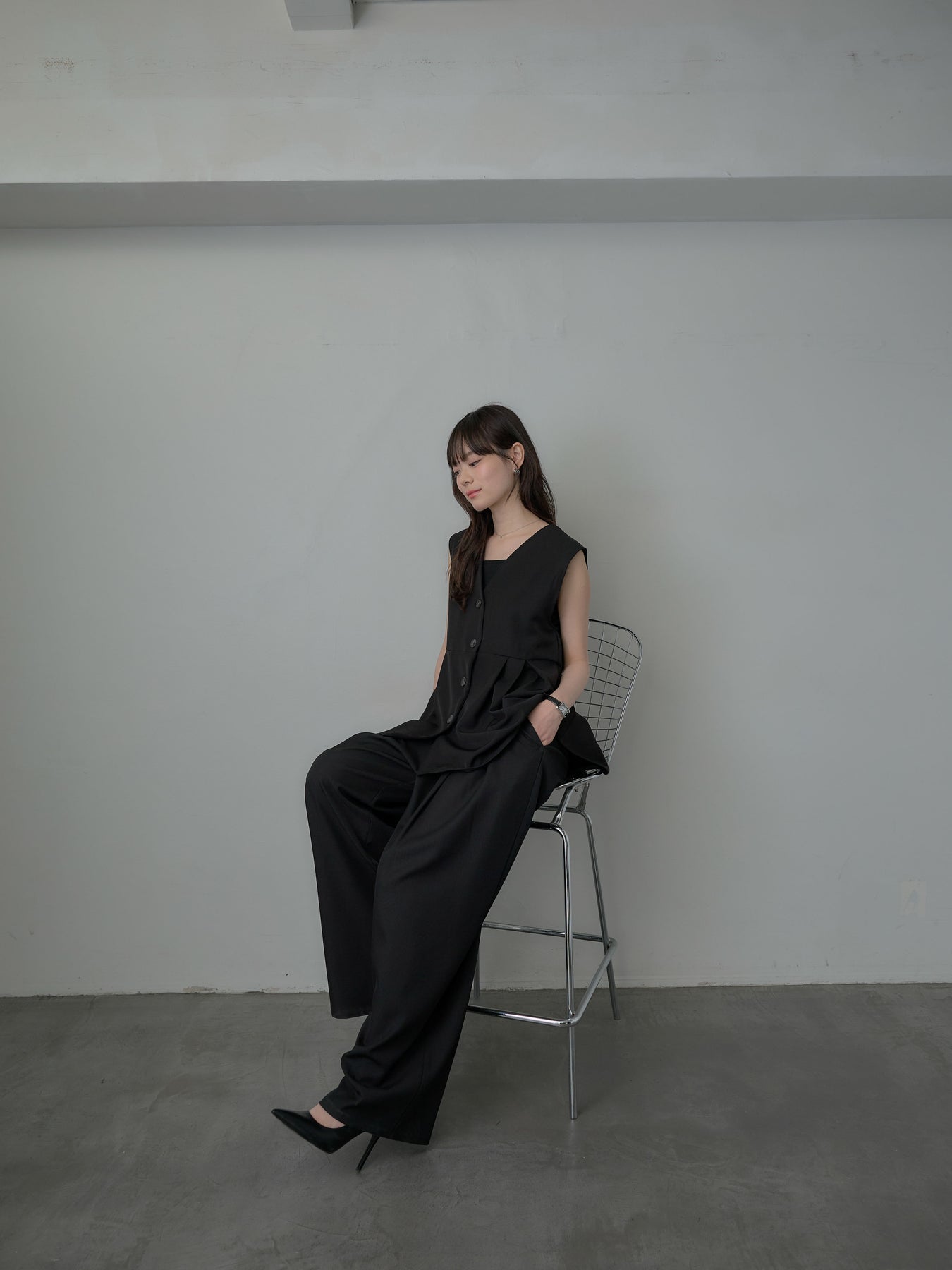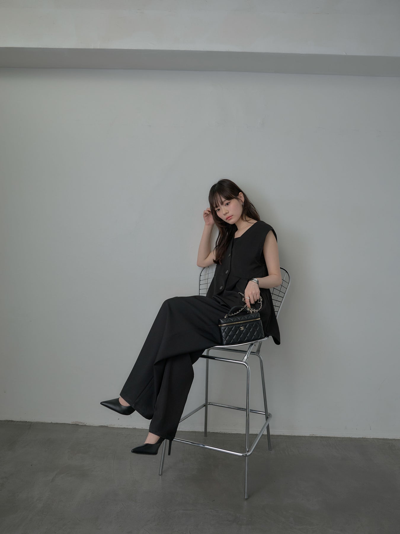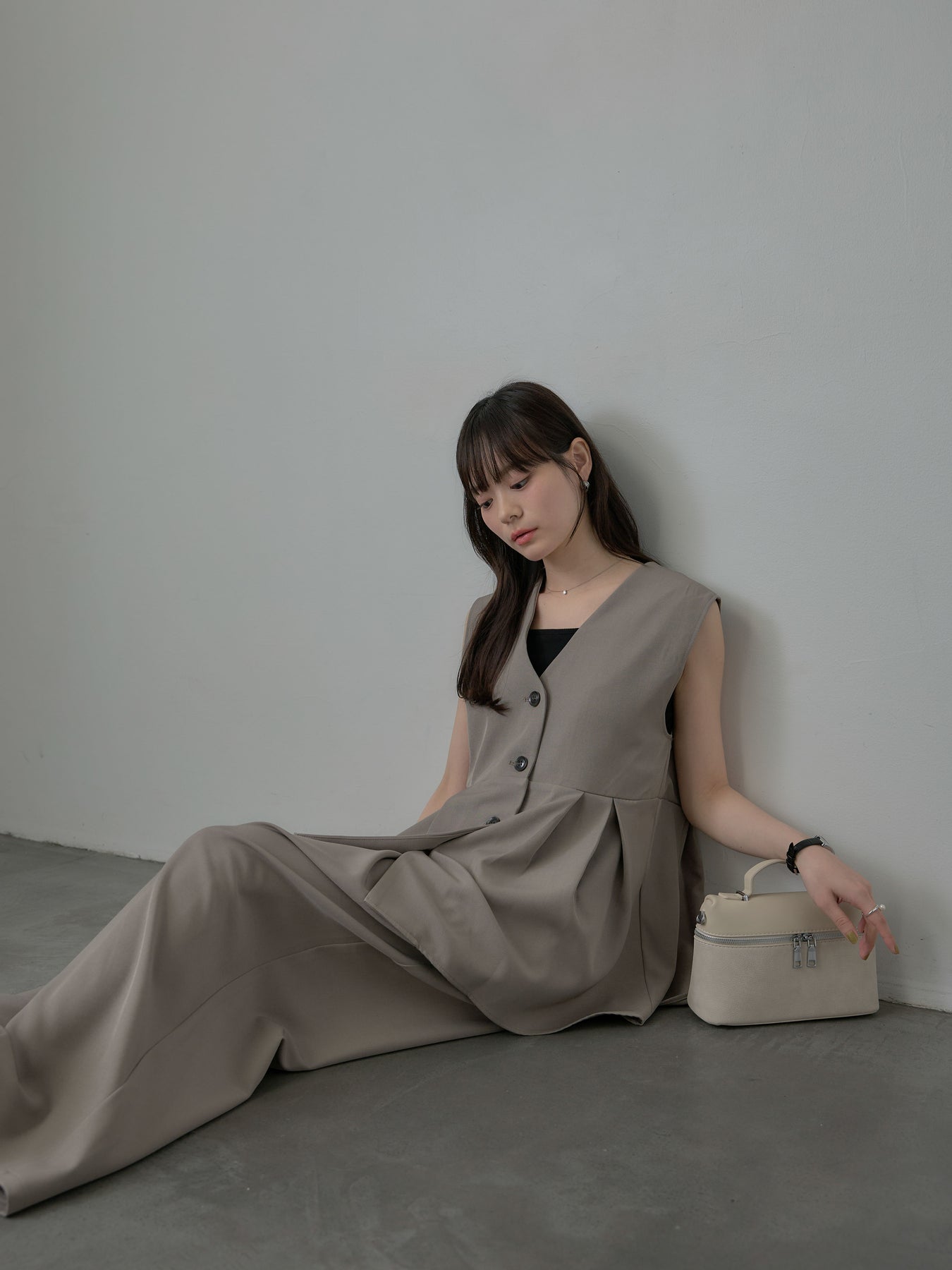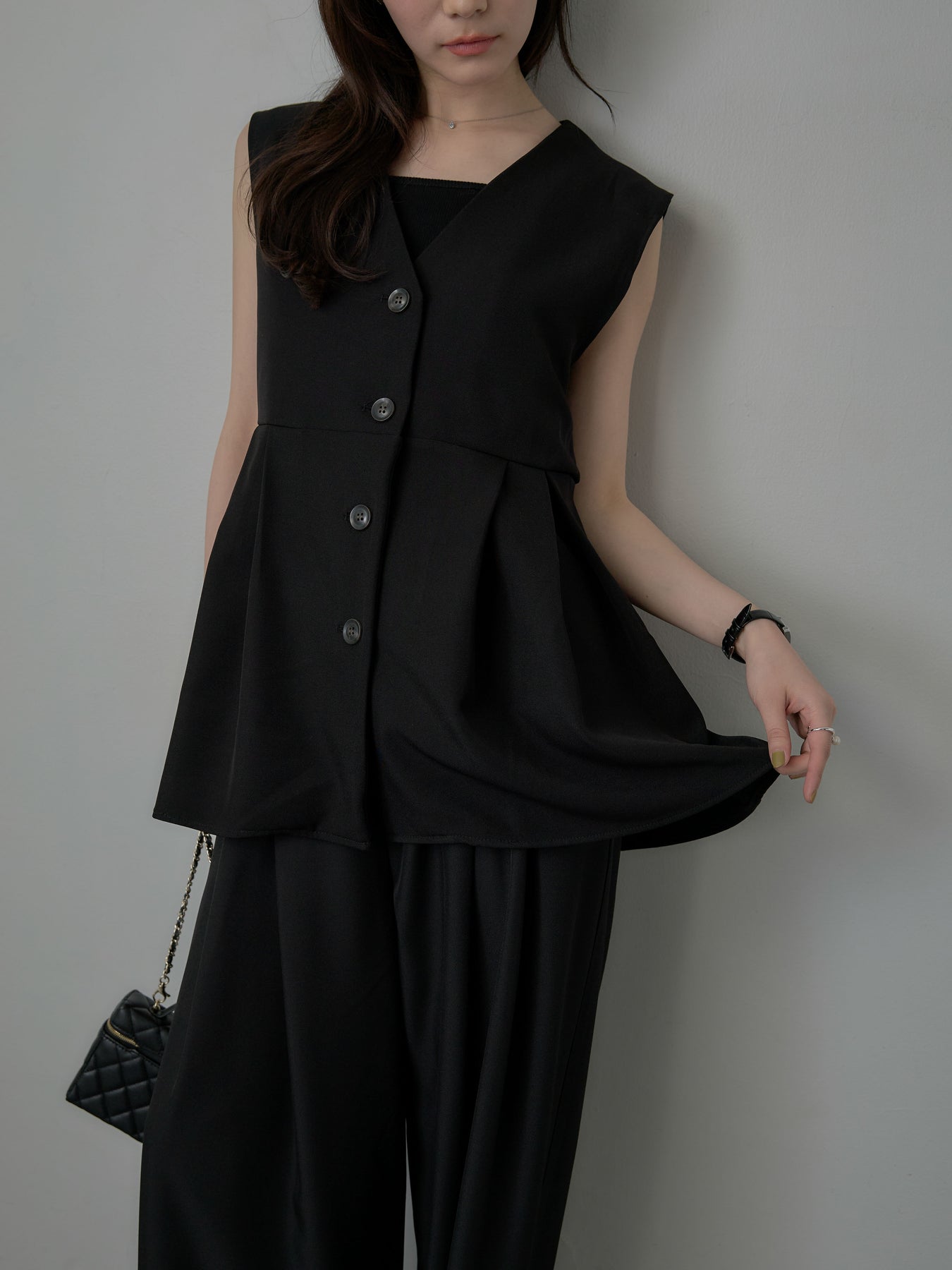 きちんと感のあるベスト。同素材のパンツとのセットアップがおすすめ。タック入りで女性らしい印象に仕上がります。ボトムスにチュールスカートなどボリューム感のあるアイテムを合わせても大人可愛く着ていただけます。