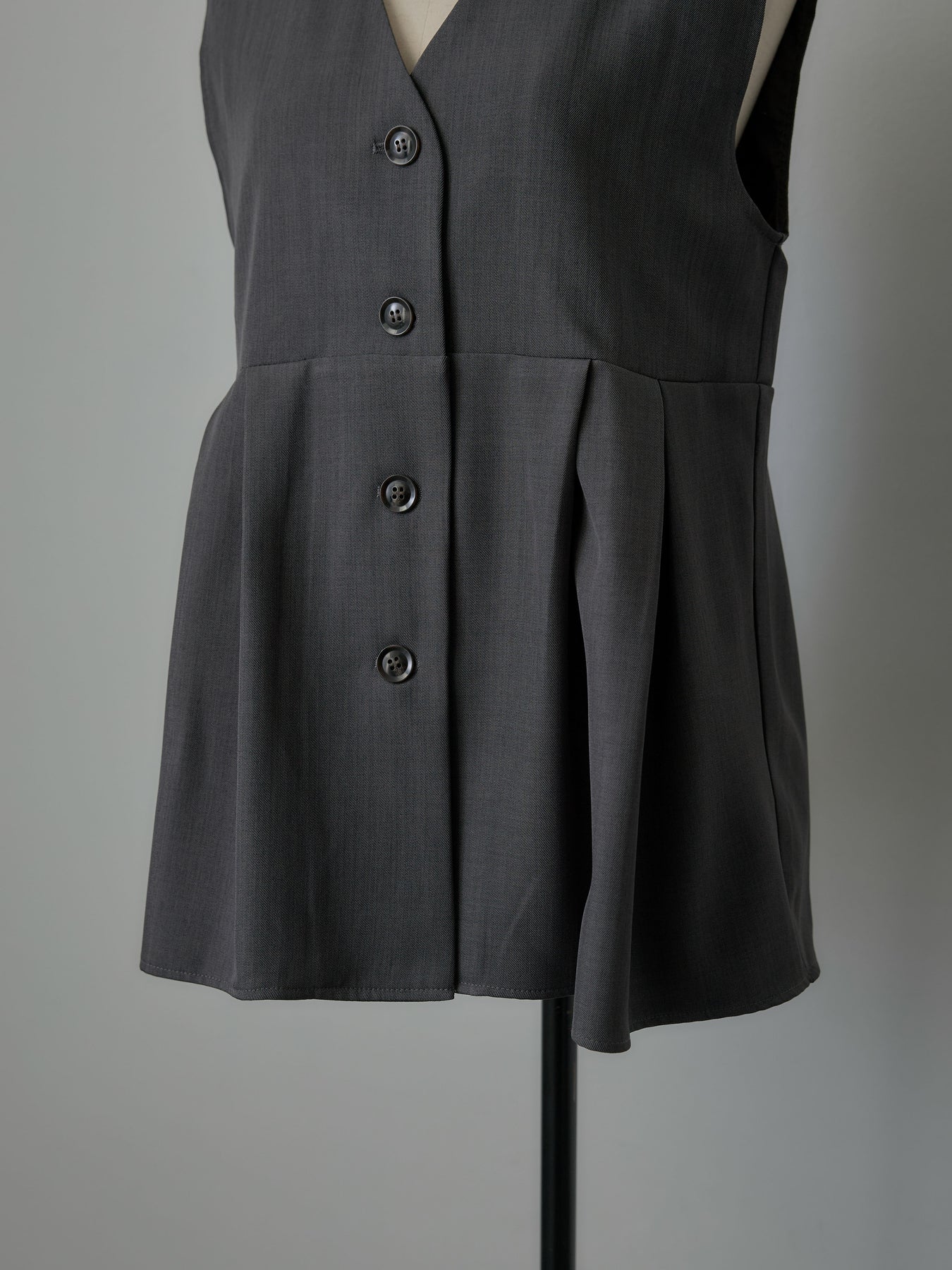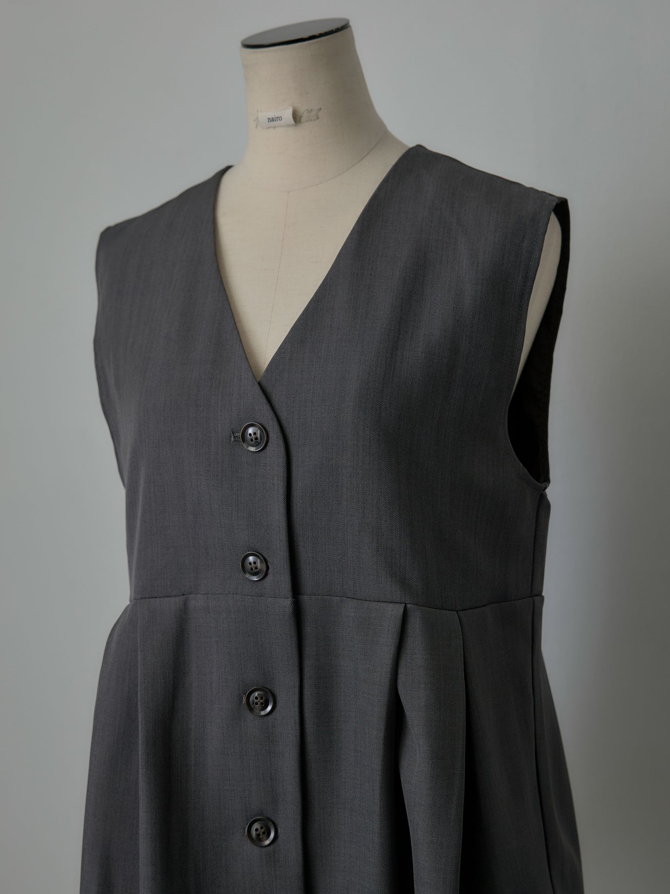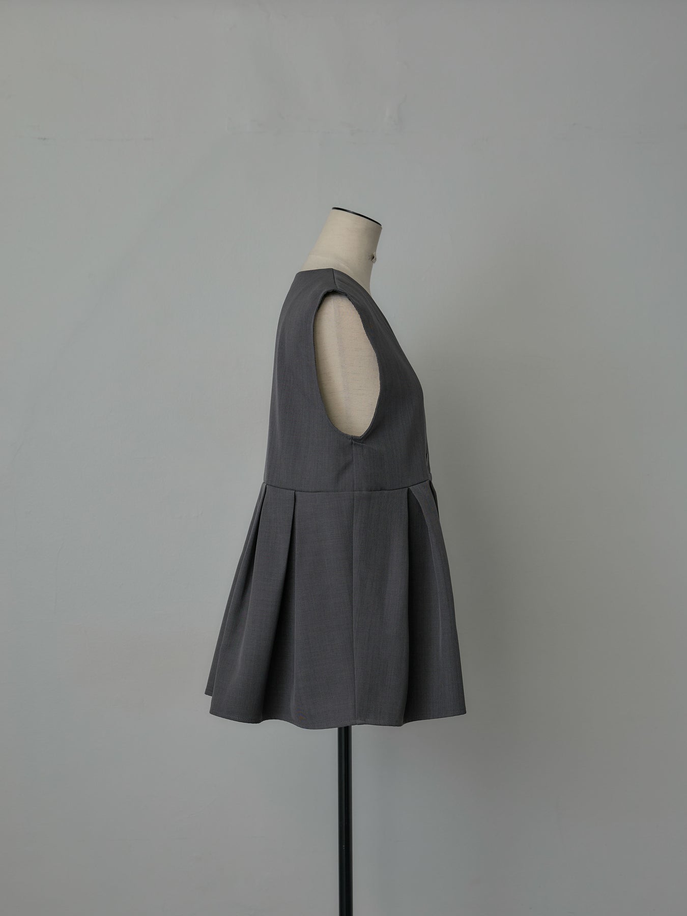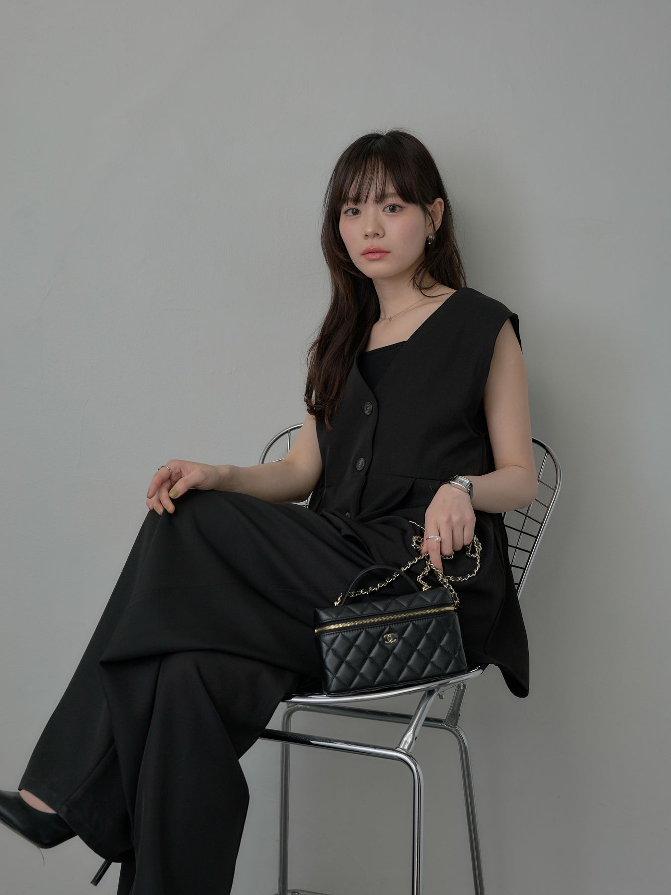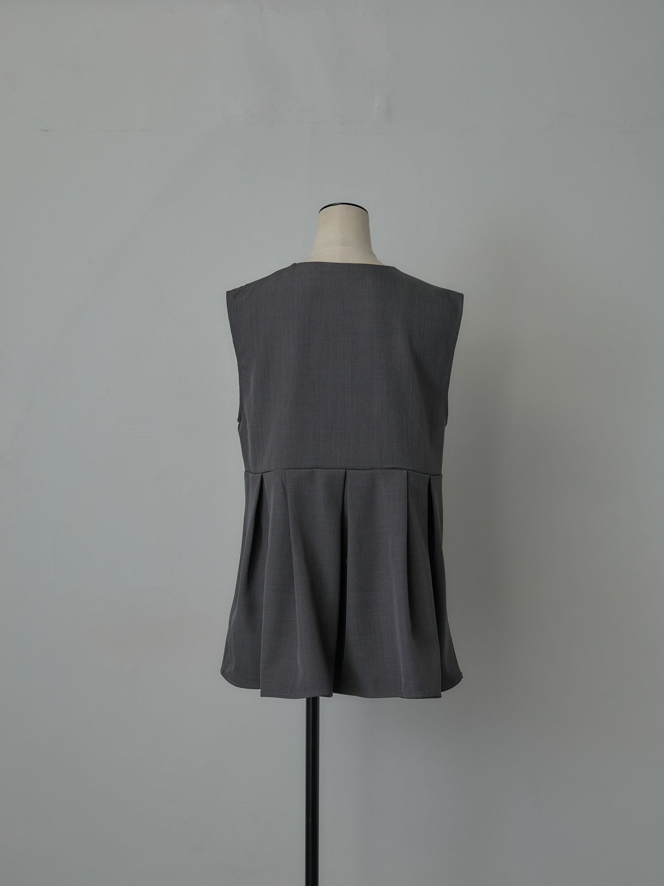きちんと感のあるベスト。同素材のパンツとのセットアップがおすすめ。タック入りで女性らしい印象に仕上がります。ボトムスにチュールスカートなどボリューム感のあるアイテムを合わせても大人可愛く着ていただけます。