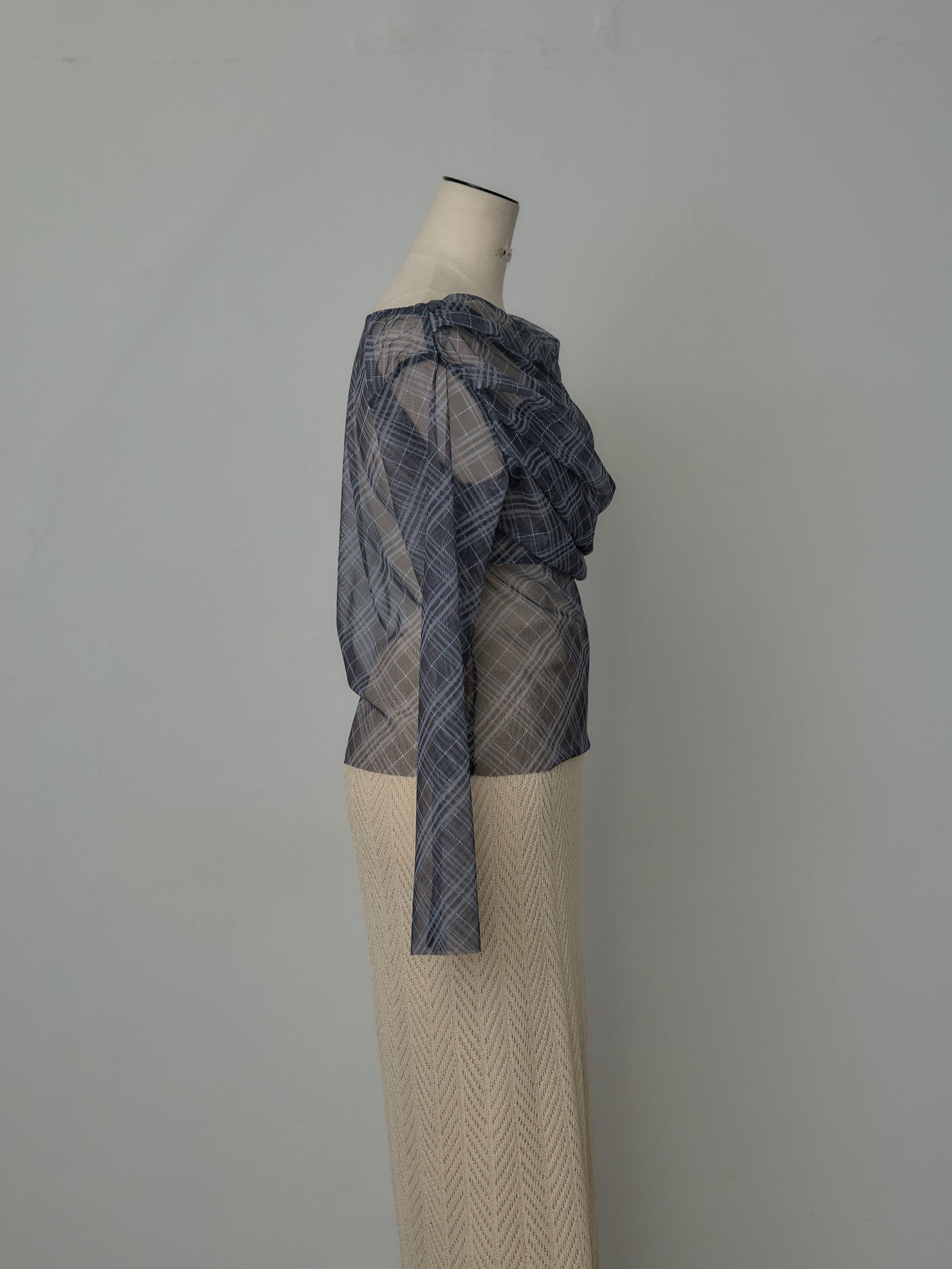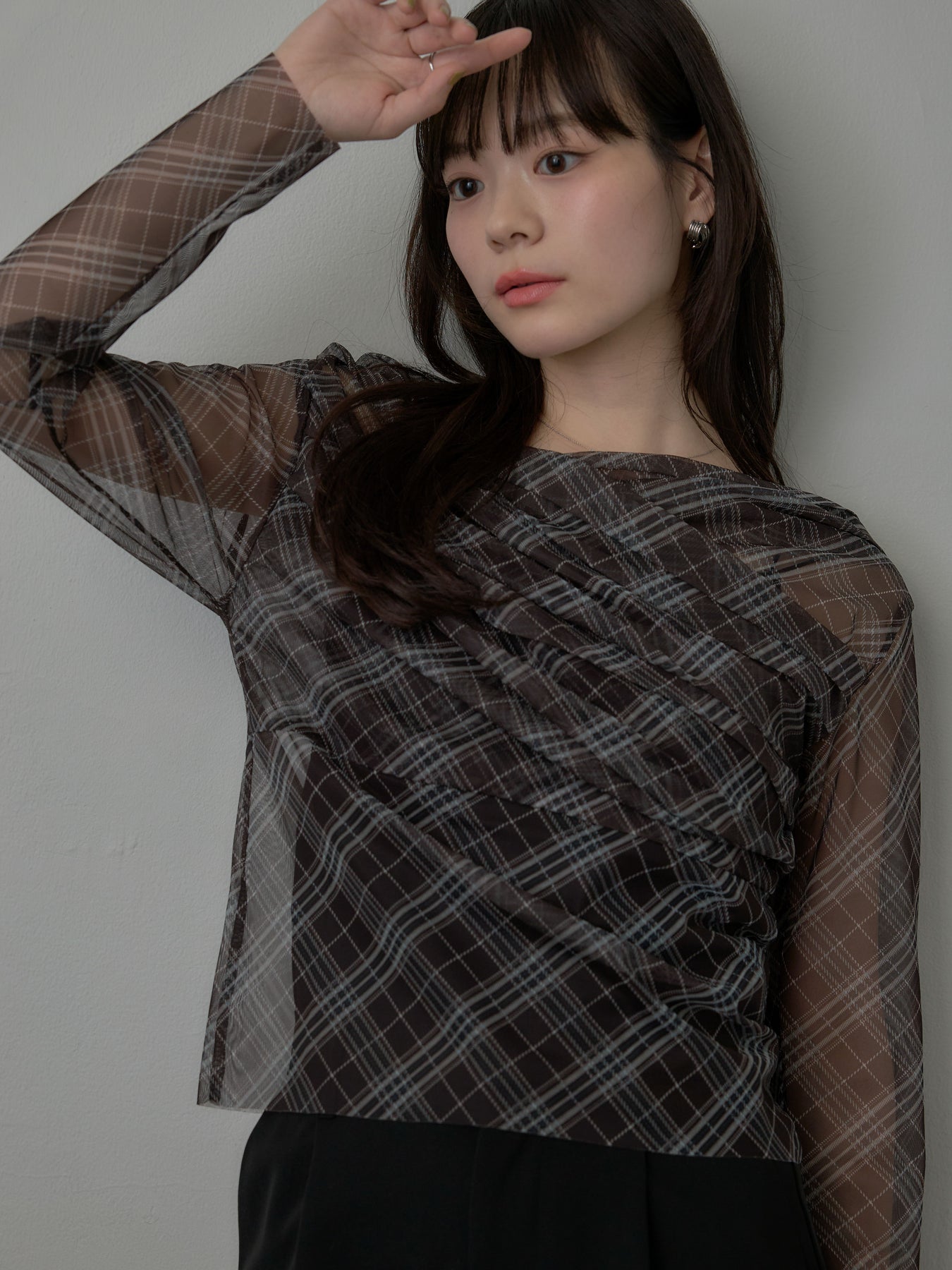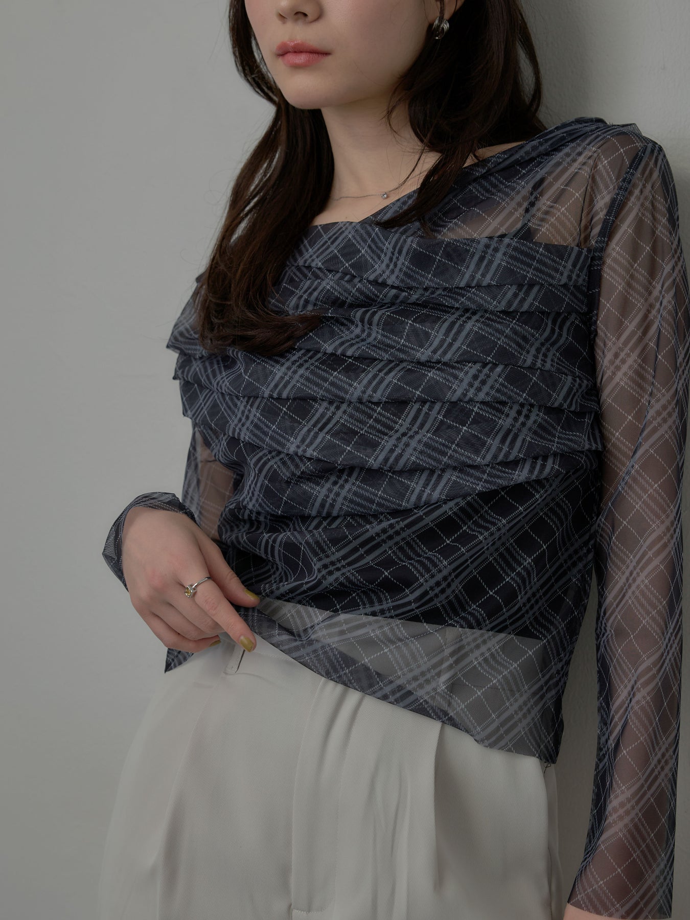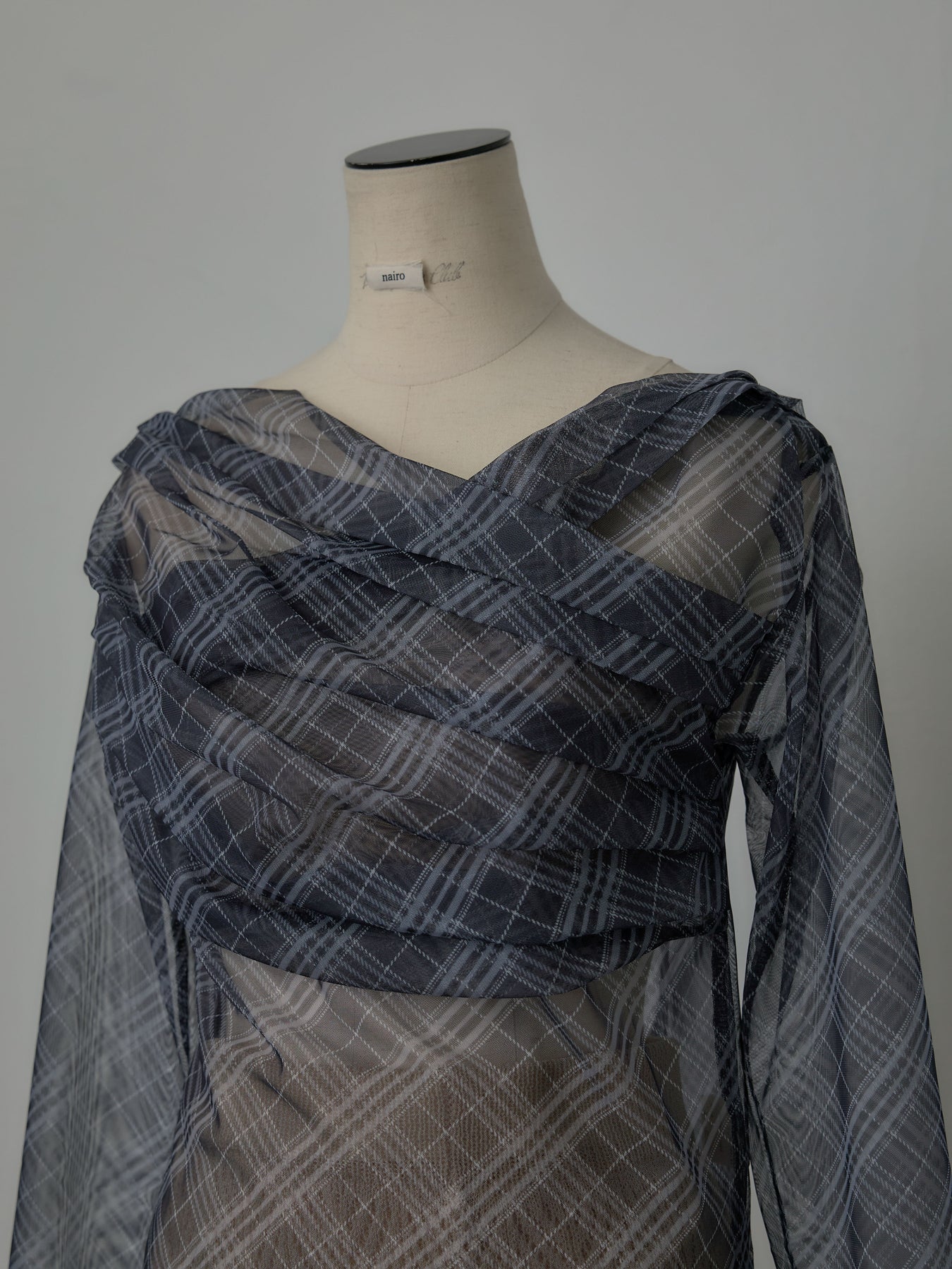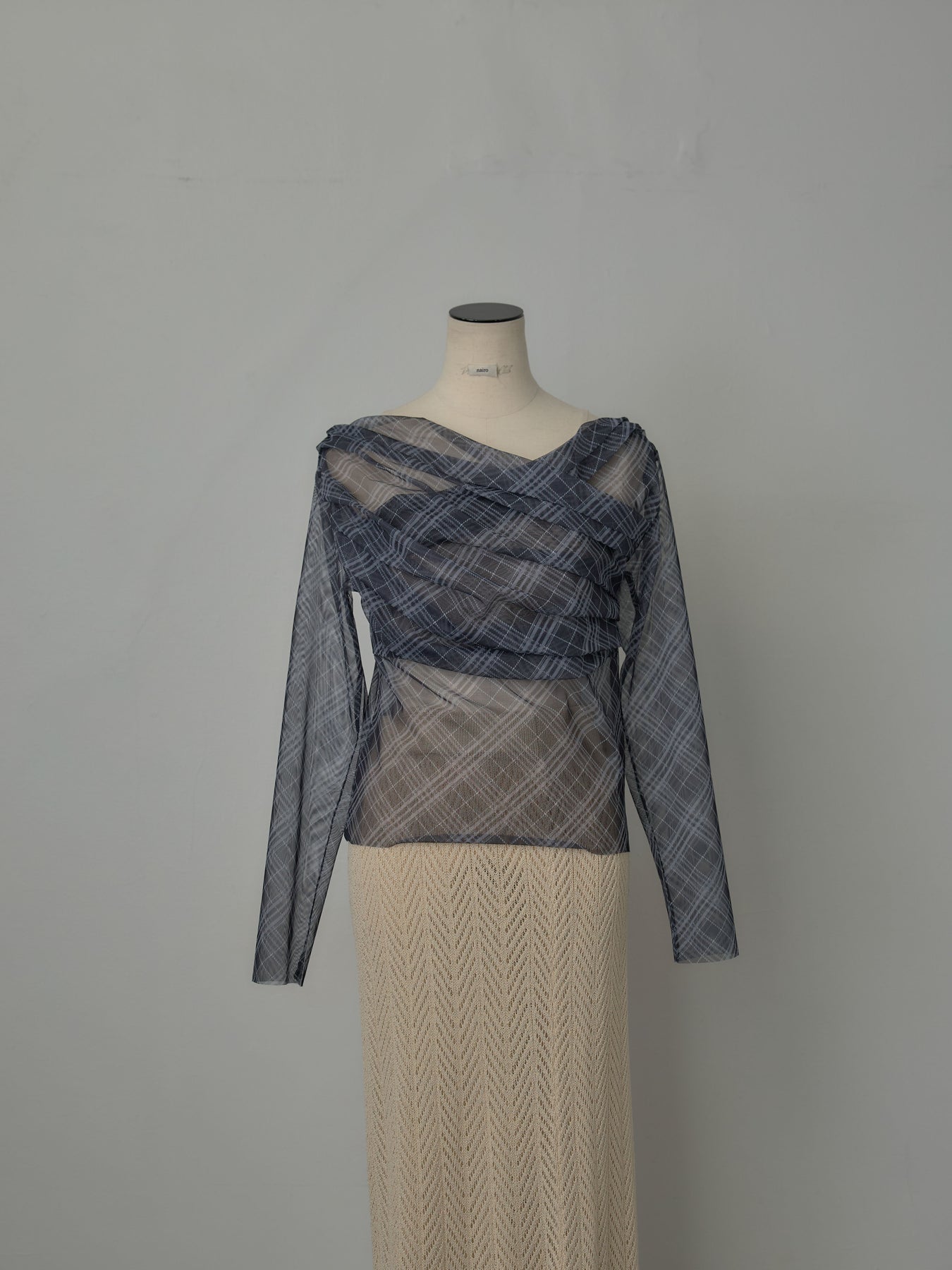 たっぷりのドレープがポイントになったトップス。シアーメッシュ素材でさらりとした着心地、程よい肌の透け感を楽しんでいただけます。トレンドのシアーチェックをnairoらしく取り入れられるアイテムです。