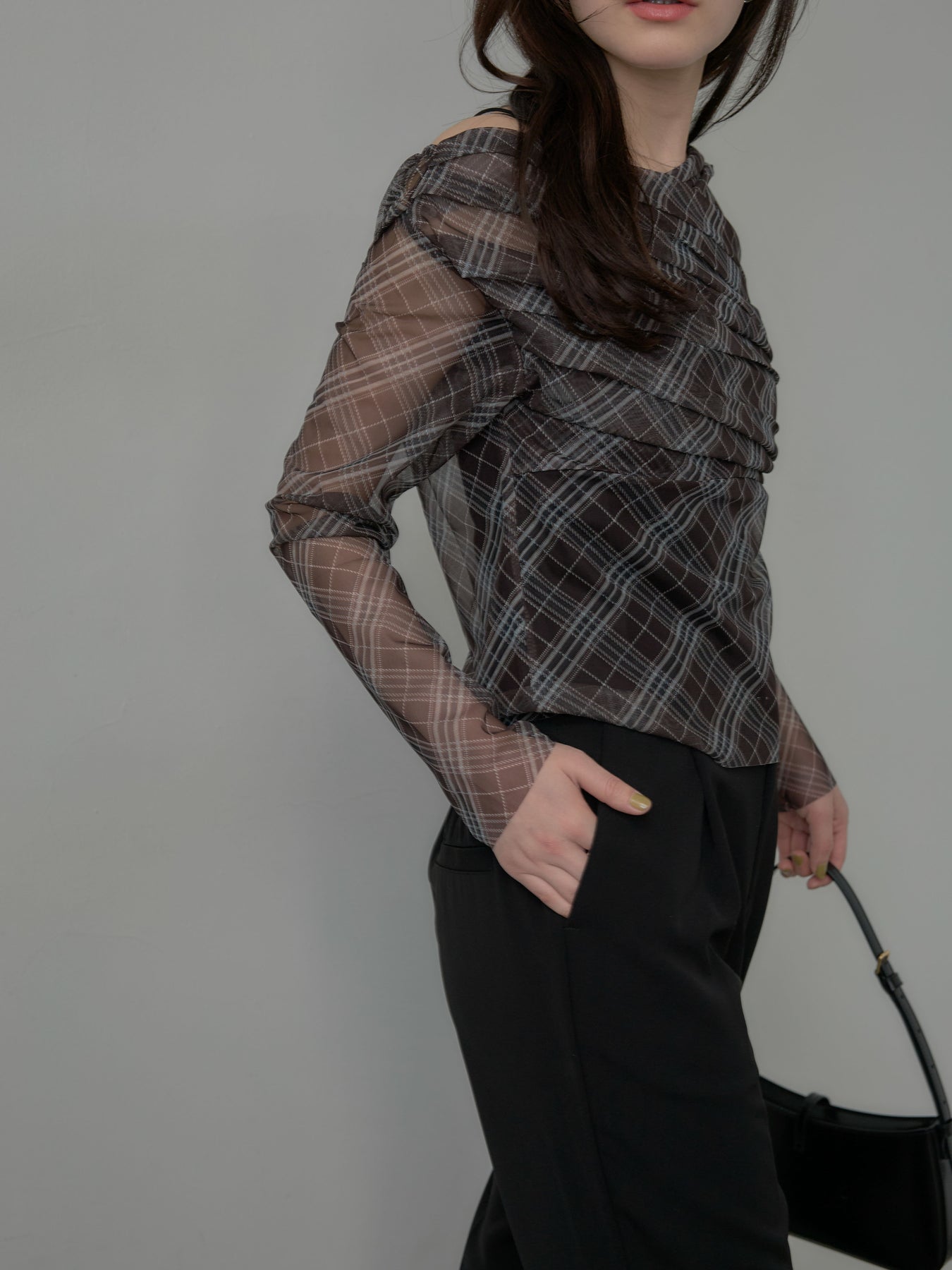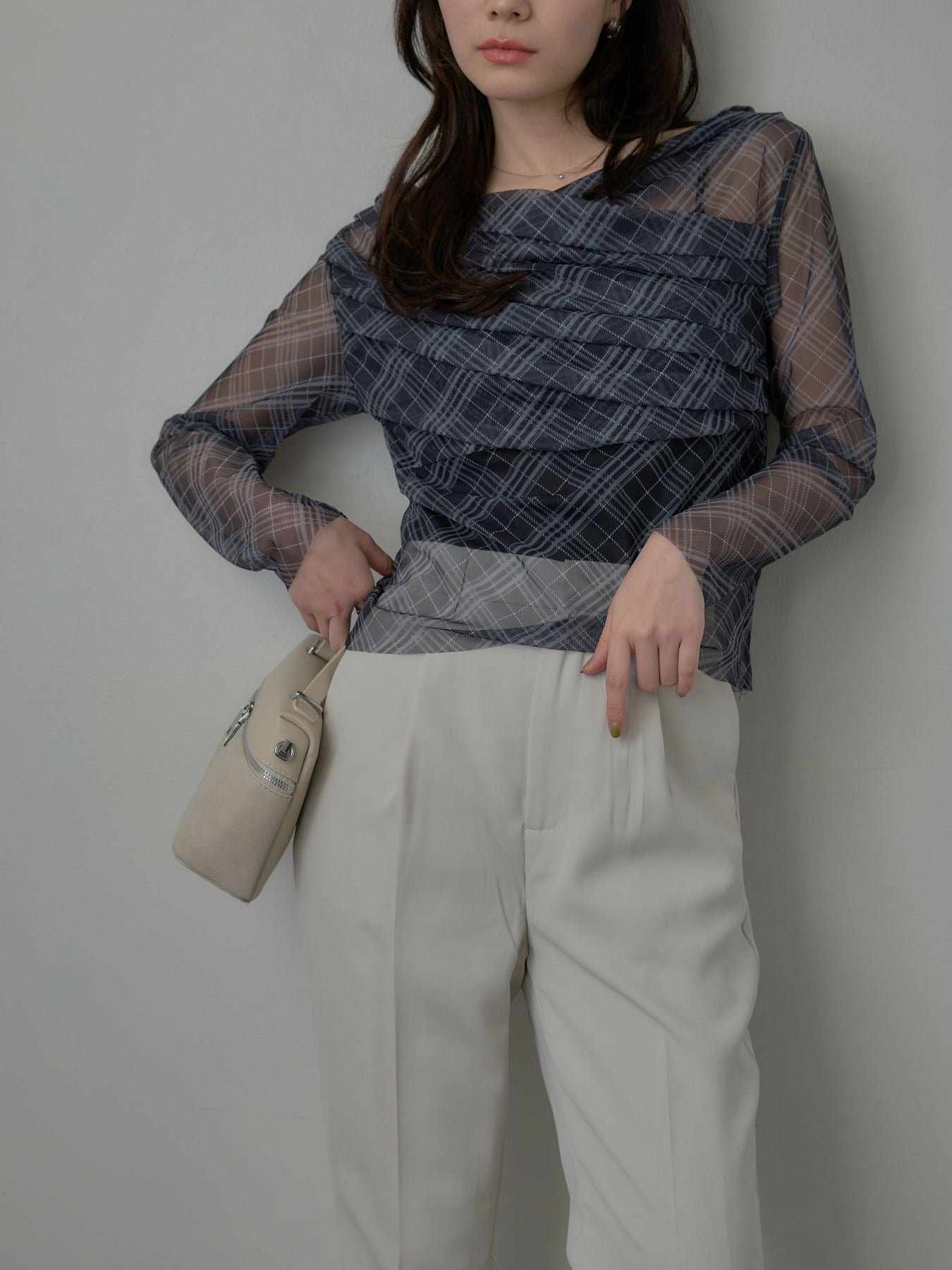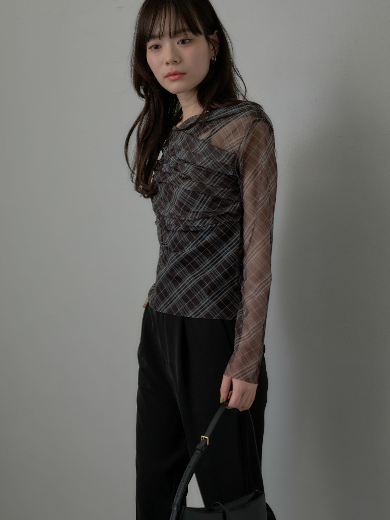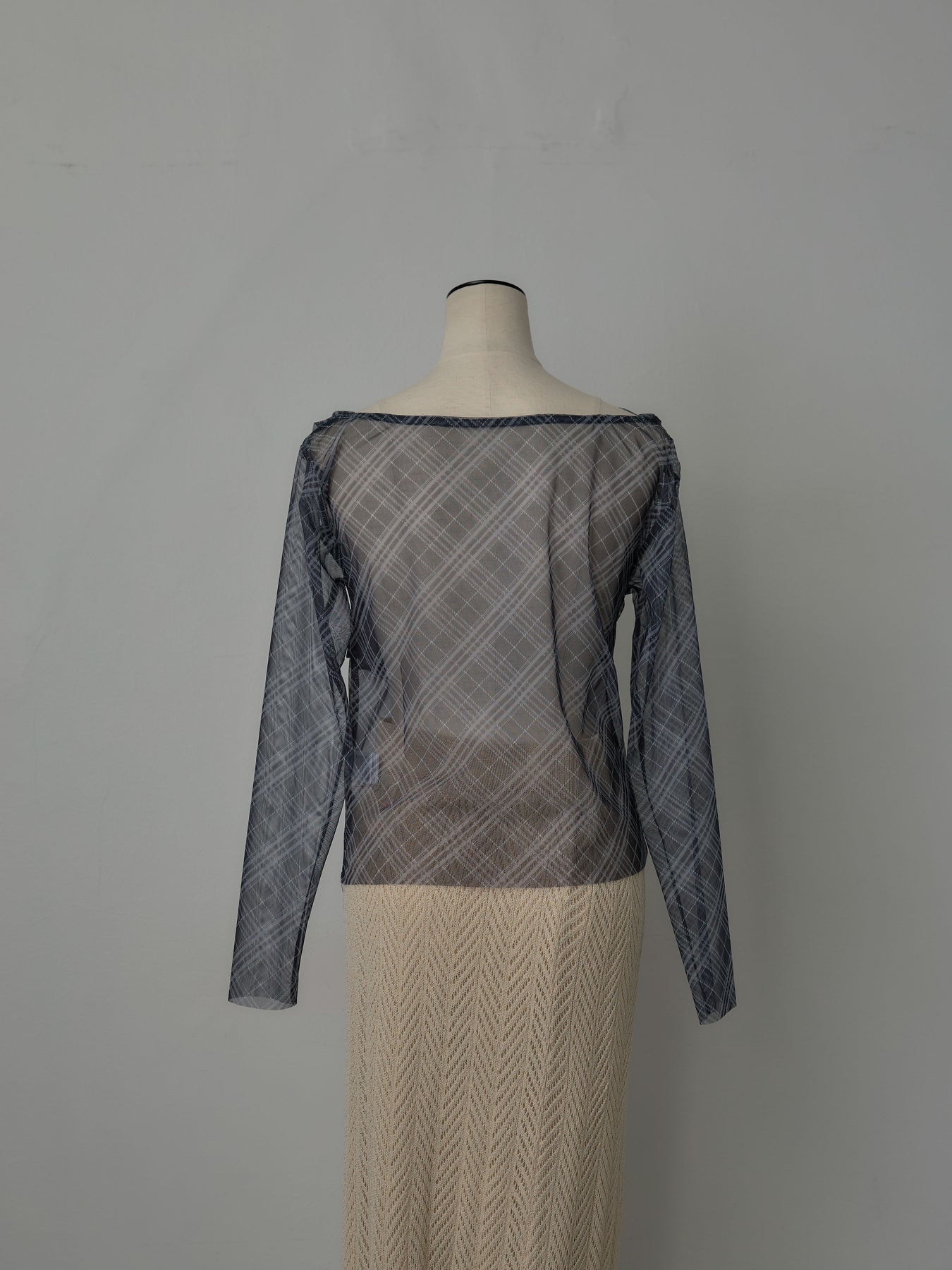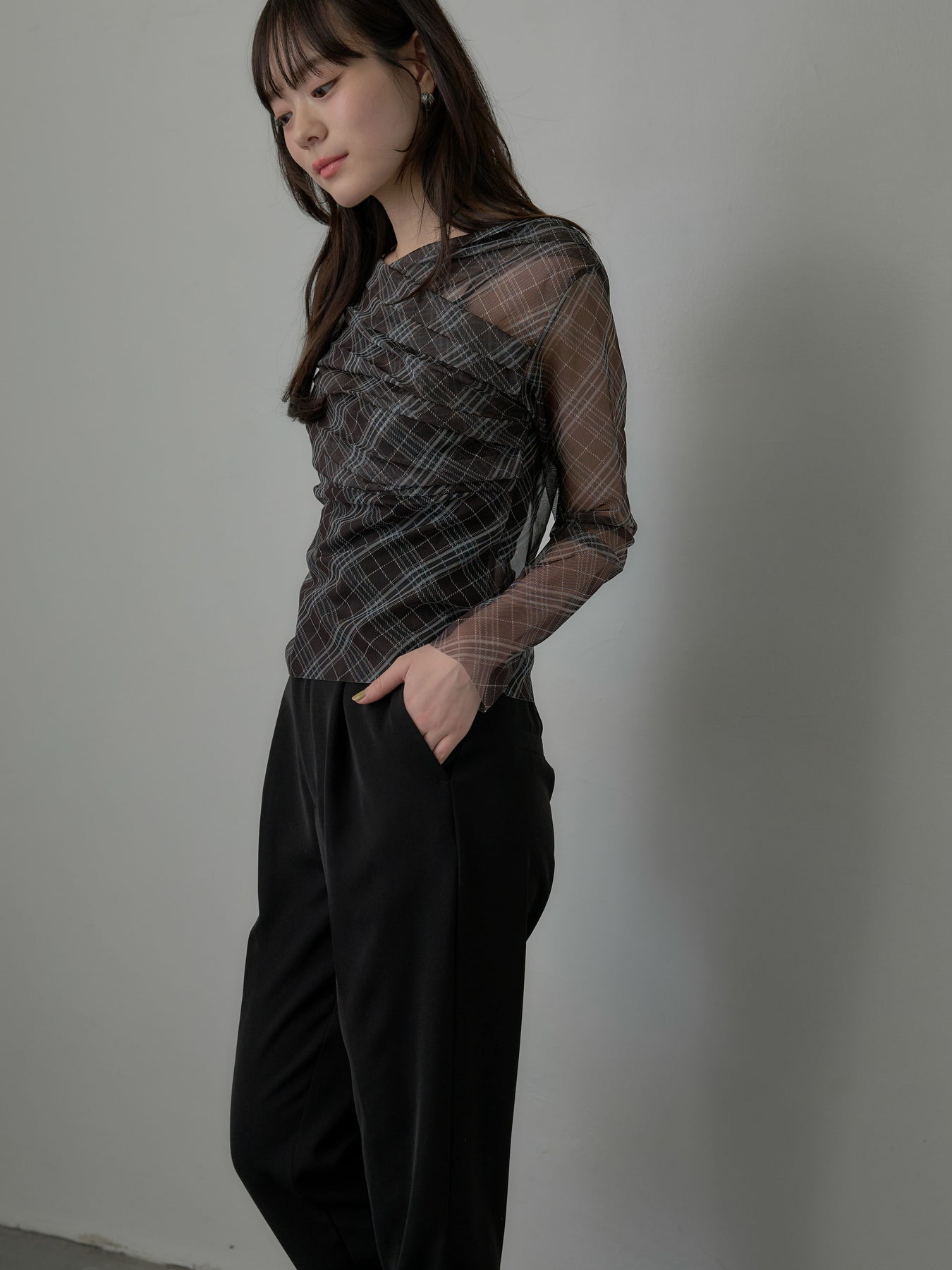 たっぷりのドレープがポイントになったトップス。シアーメッシュ素材でさらりとした着心地、程よい肌の透け感を楽しんでいただけます。トレンドのシアーチェックをnairoらしく取り入れられるアイテムです。