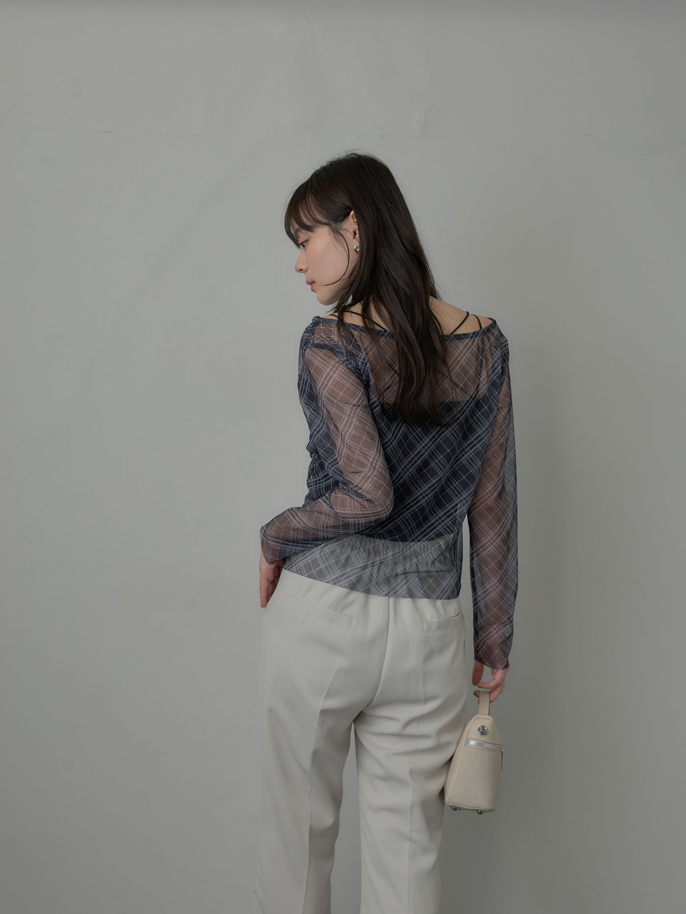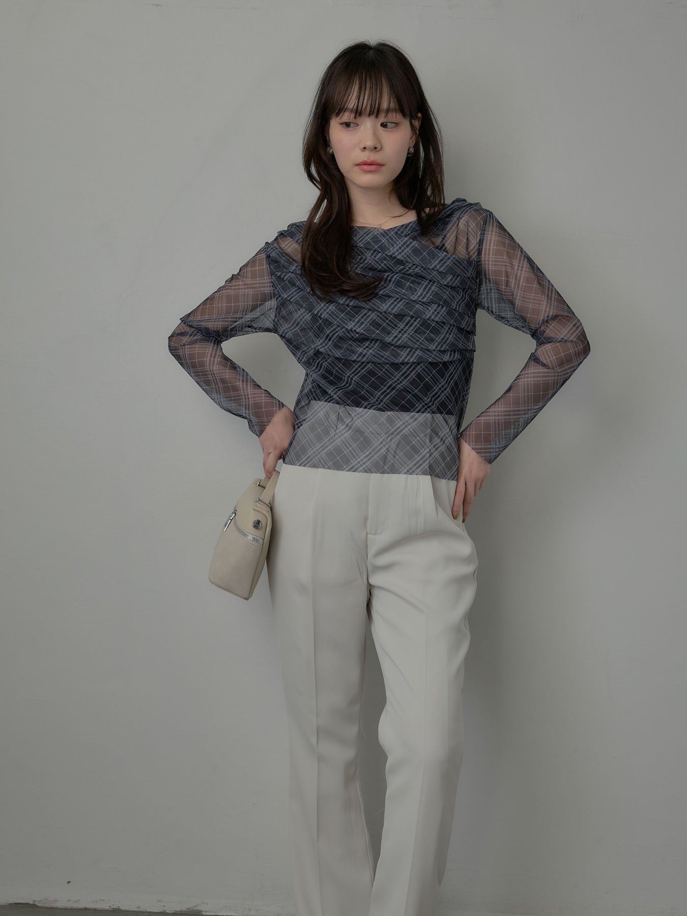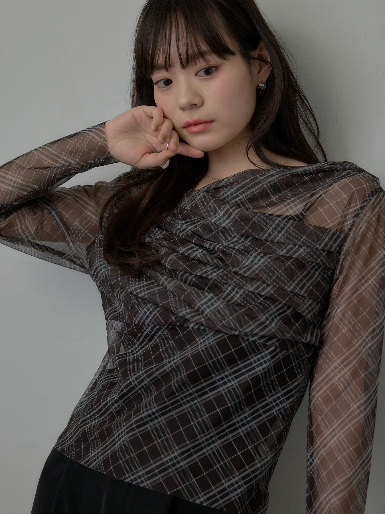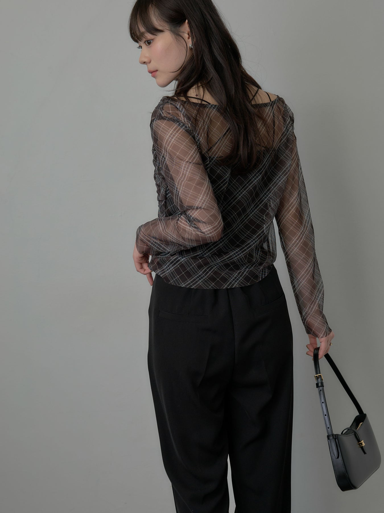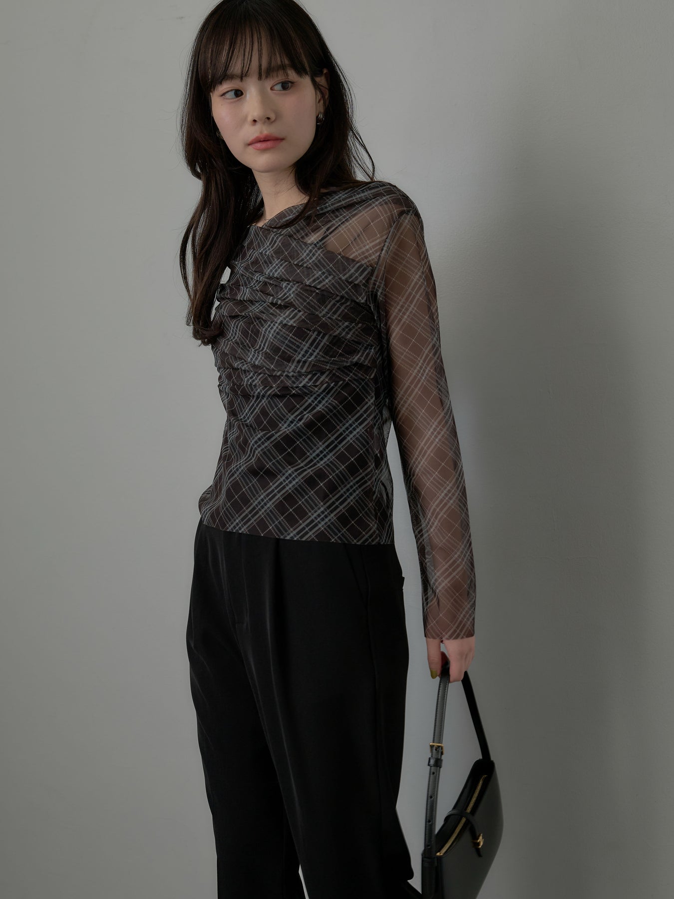 たっぷりのドレープがポイントになったトップス。シアーメッシュ素材でさらりとした着心地、程よい肌の透け感を楽しんでいただけます。トレンドのシアーチェックをnairoらしく取り入れられるアイテムです。