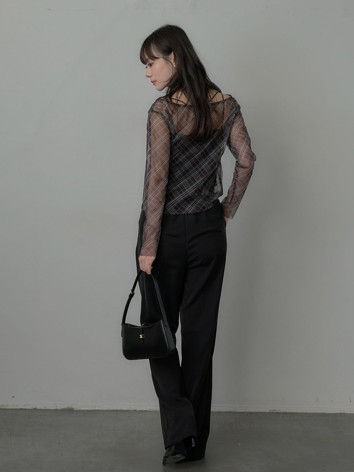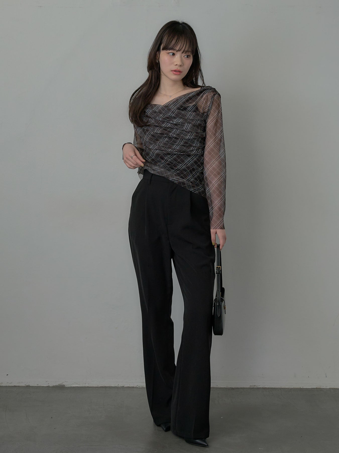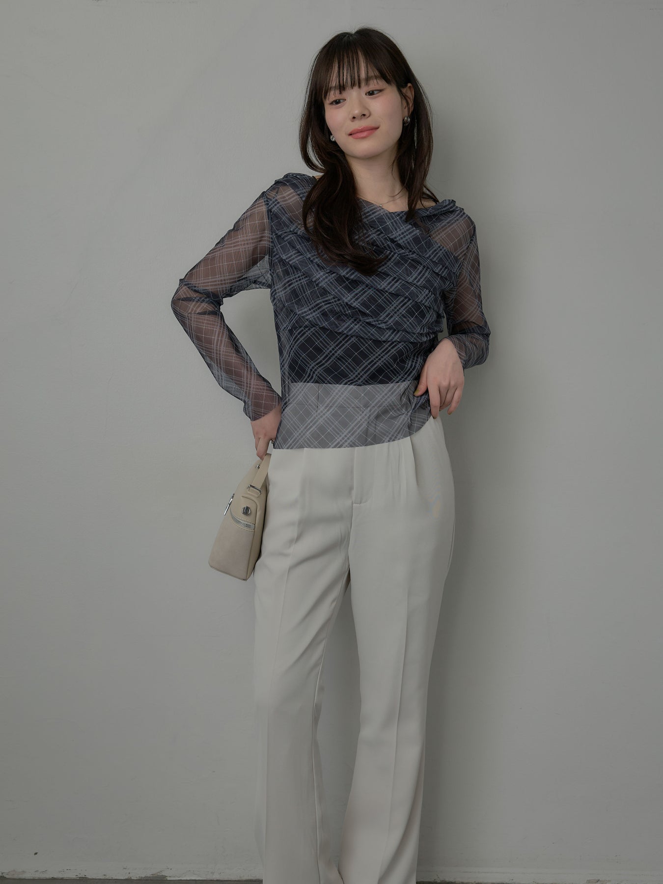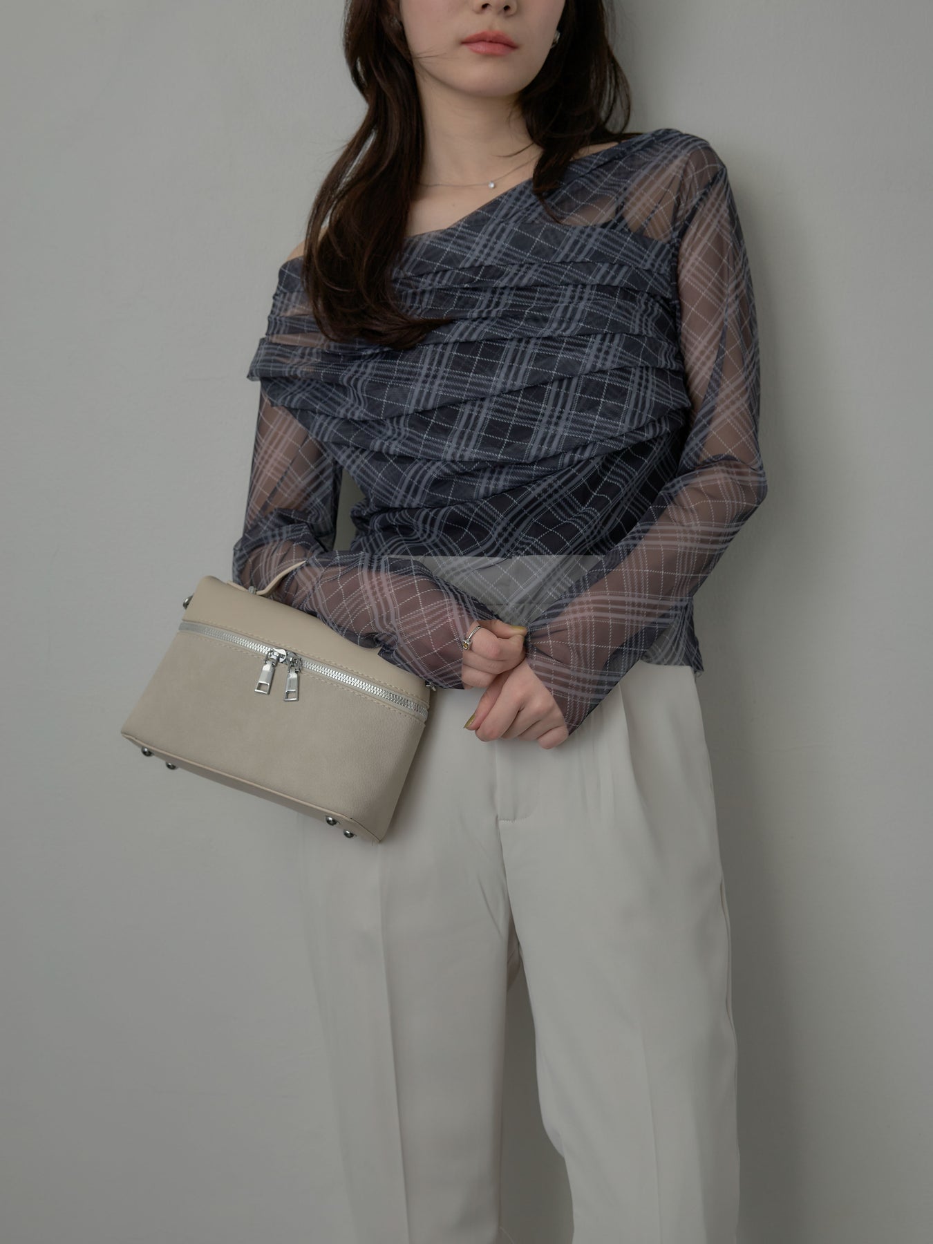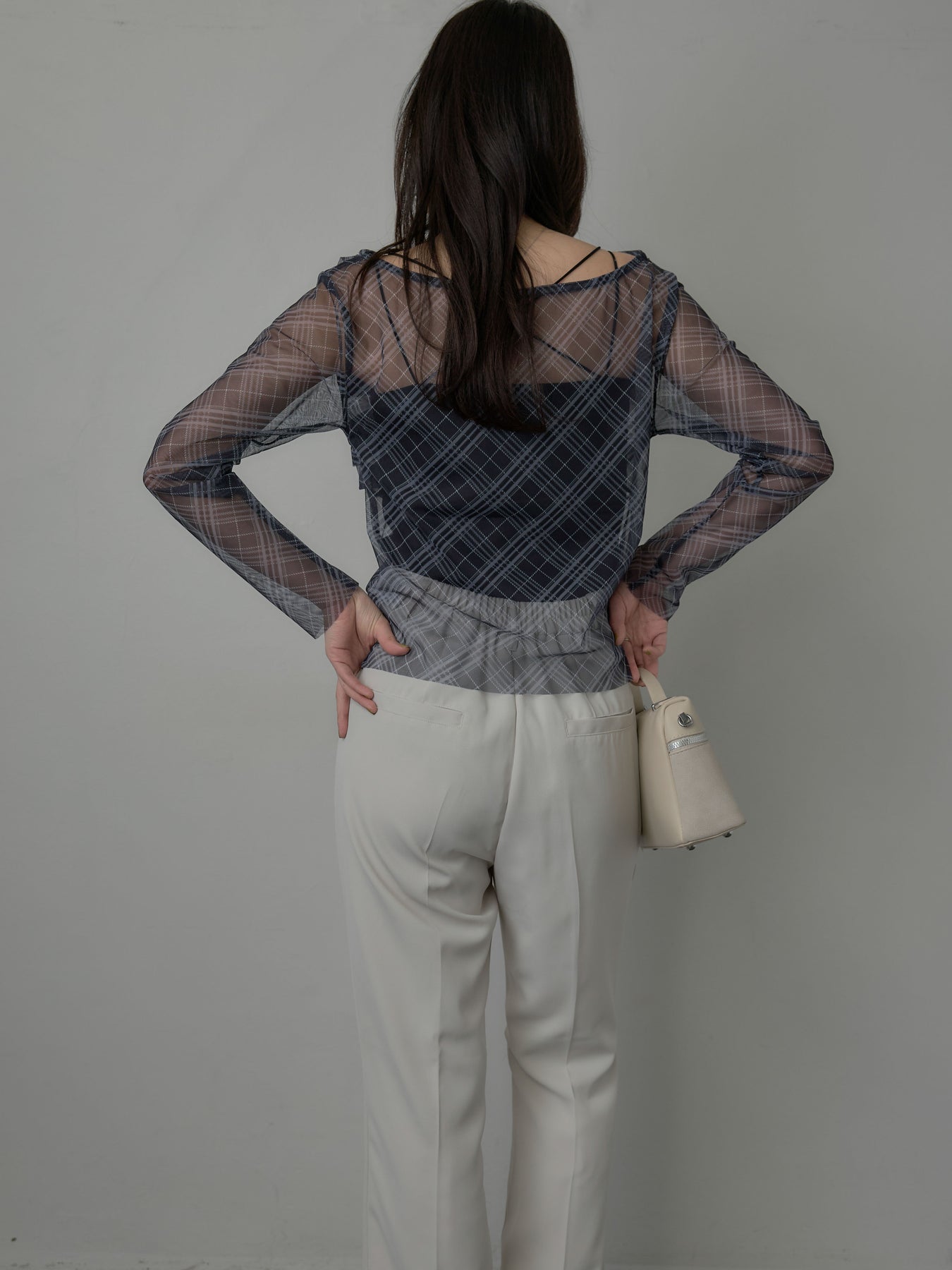 たっぷりのドレープがポイントになったトップス。シアーメッシュ素材でさらりとした着心地、程よい肌の透け感を楽しんでいただけます。トレンドのシアーチェックをnairoらしく取り入れられるアイテムです。