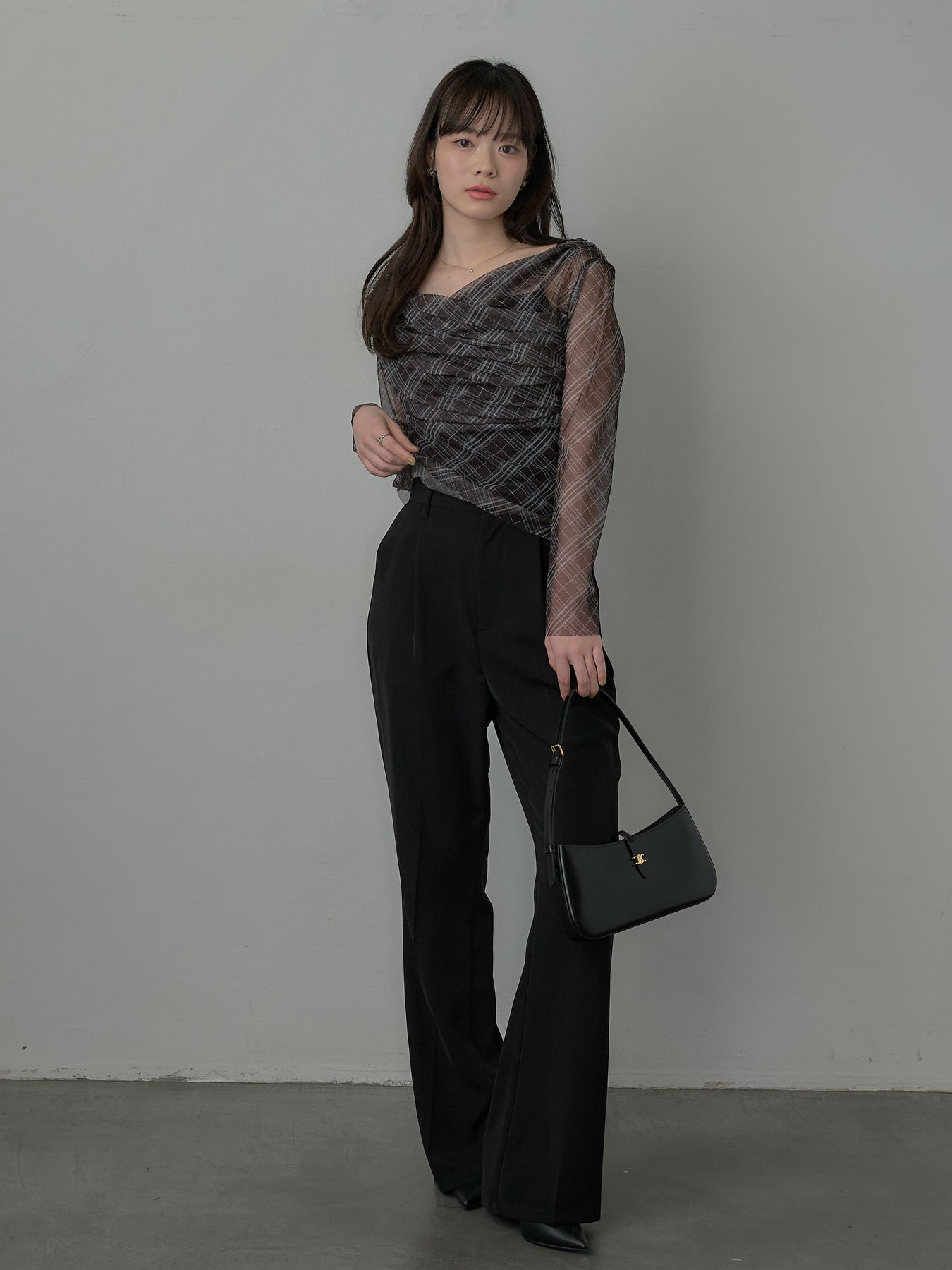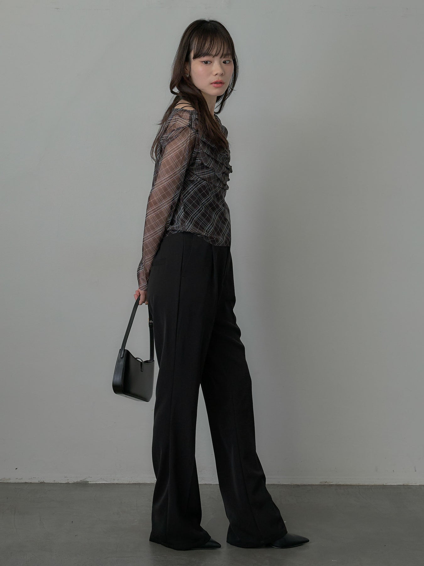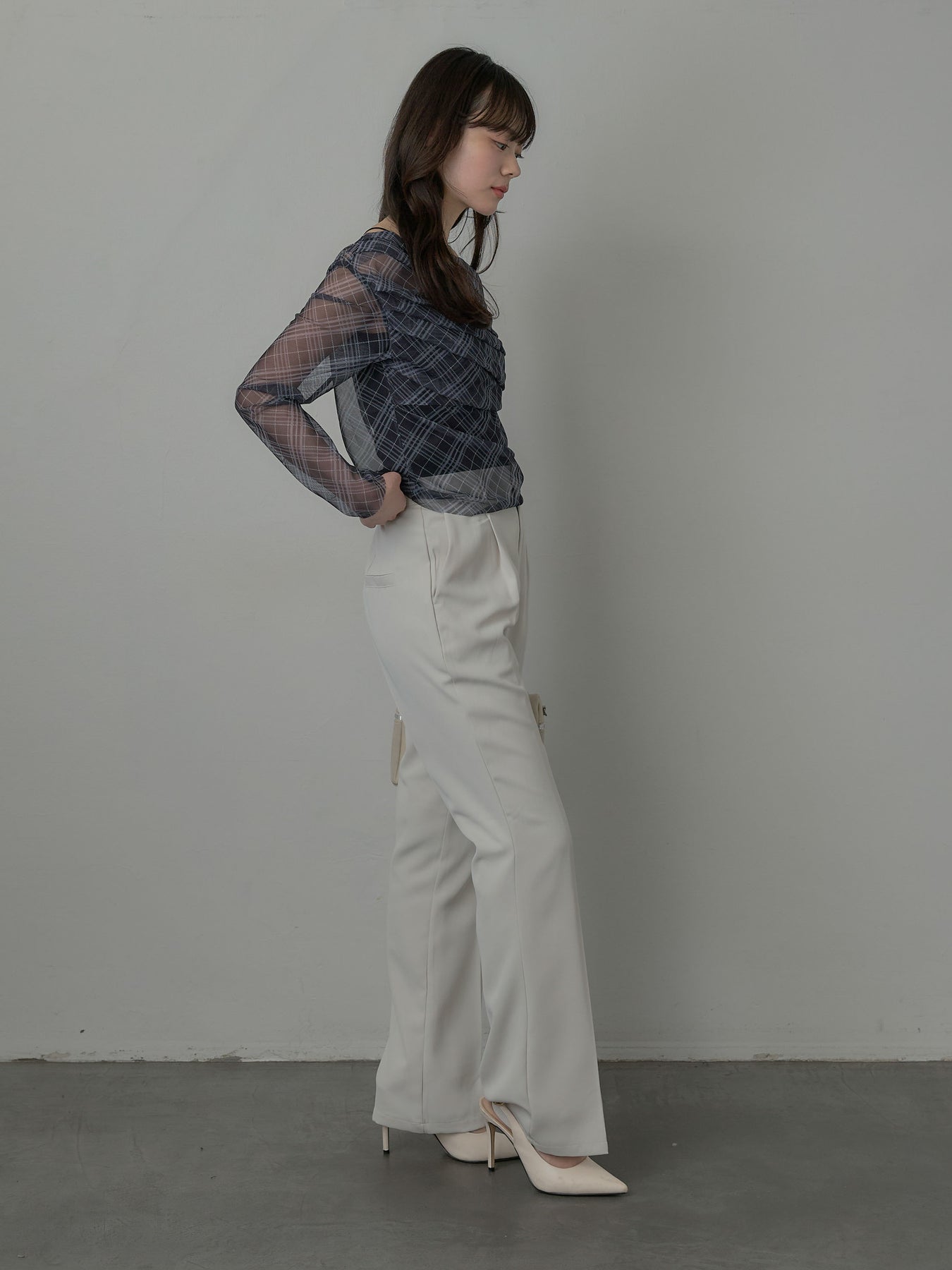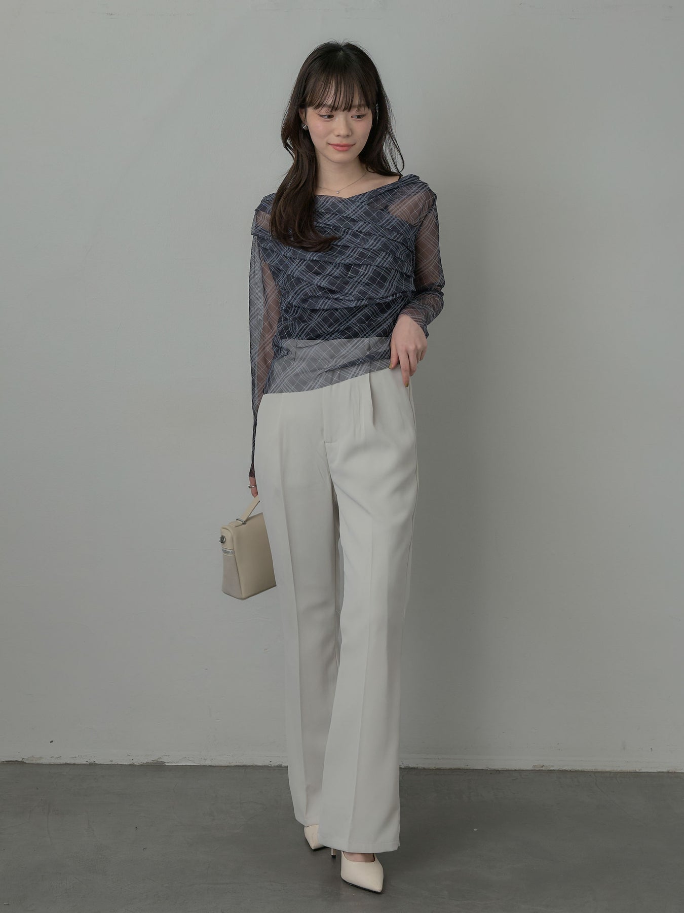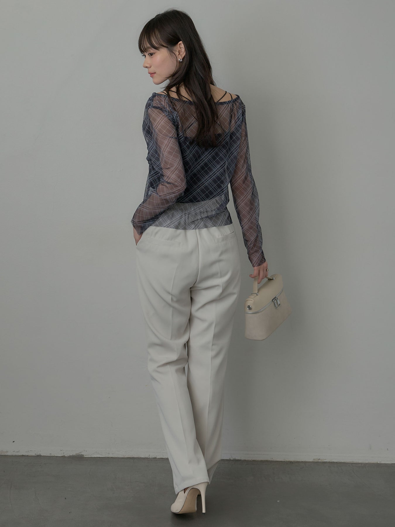たっぷりのドレープがポイントになったトップス。シアーメッシュ素材でさらりとした着心地、程よい肌の透け感を楽しんでいただけます。トレンドのシアーチェックをnairoらしく取り入れられるアイテムです。