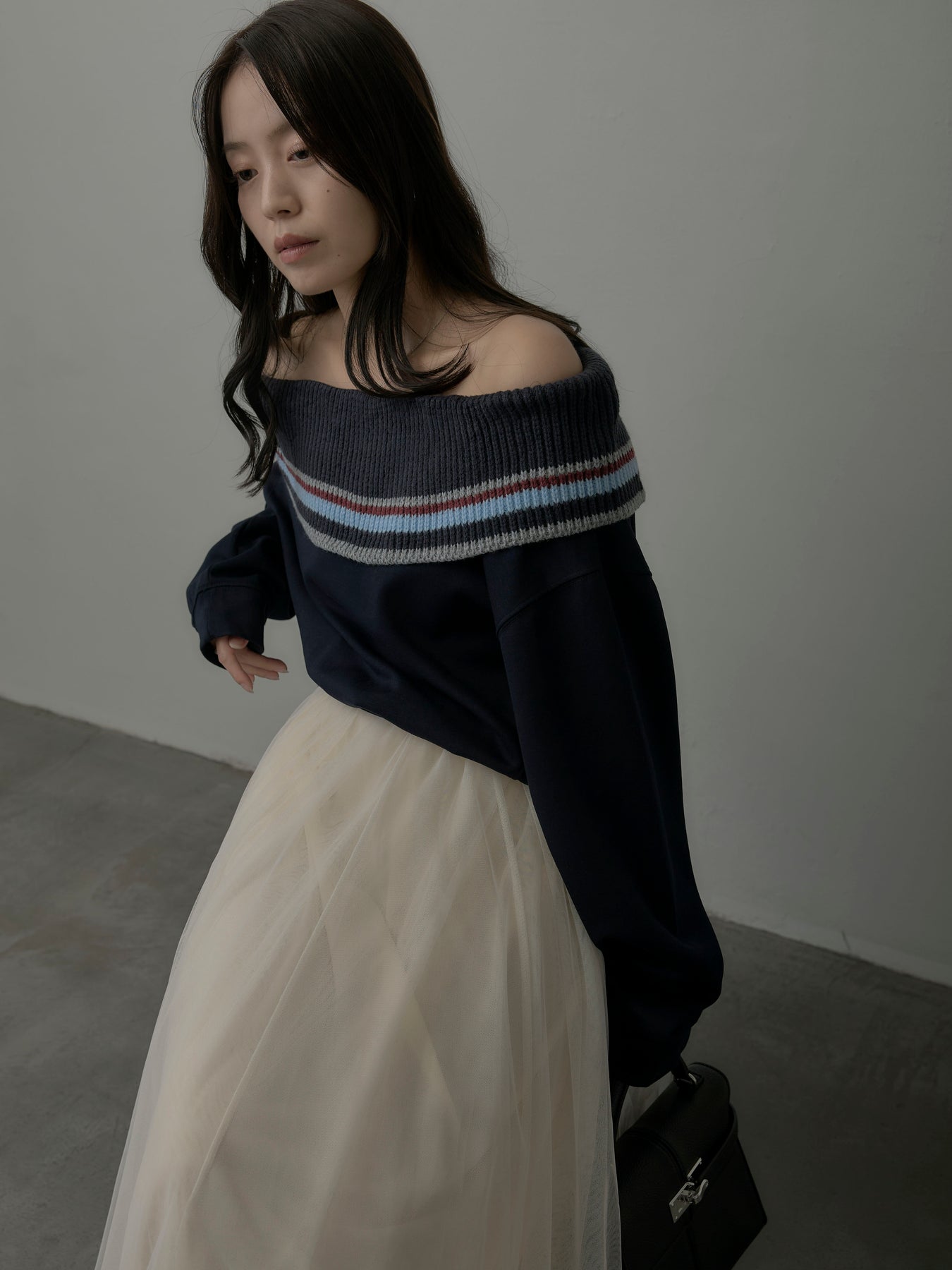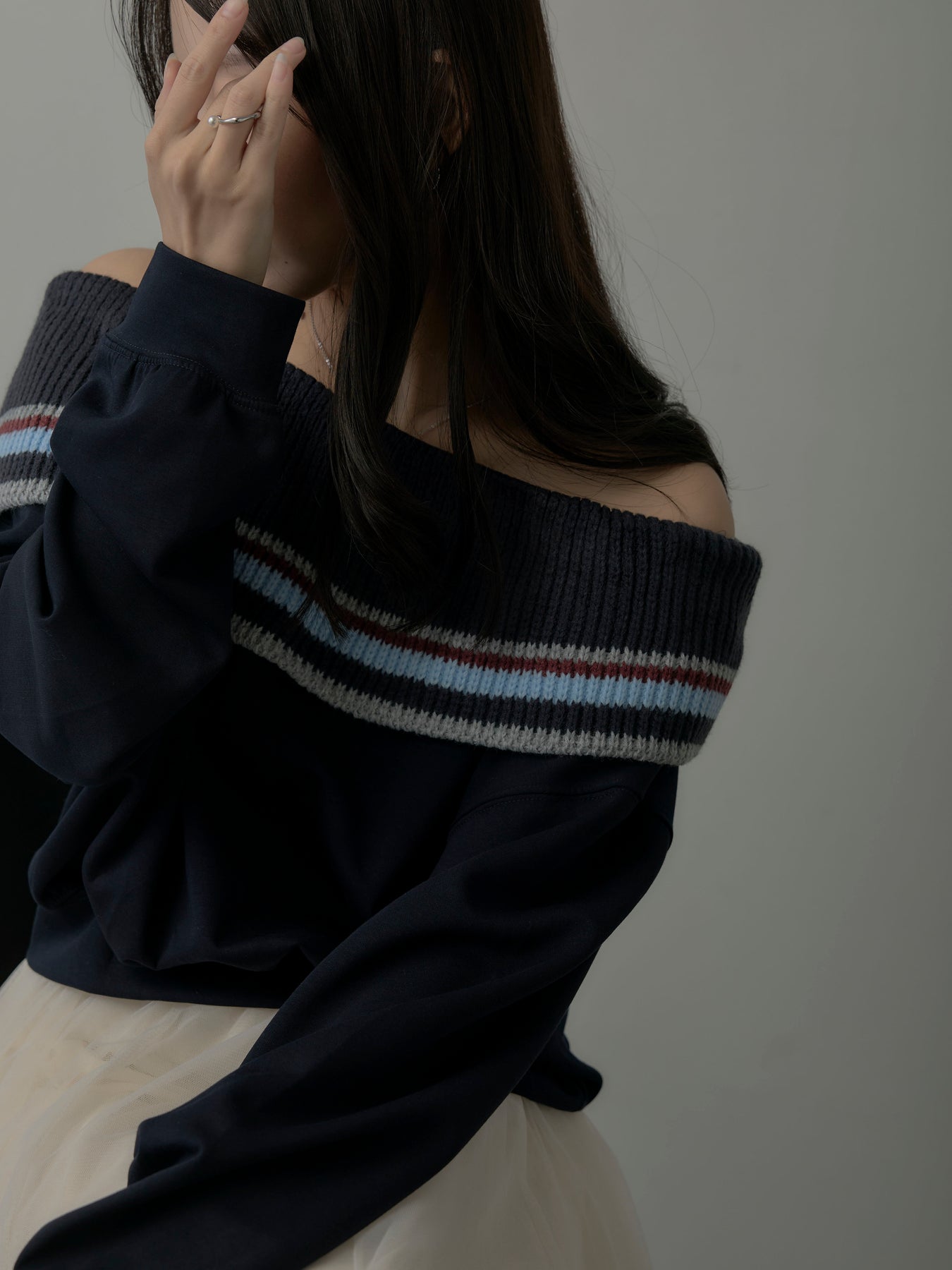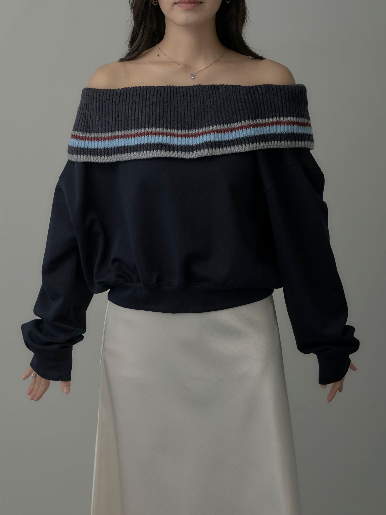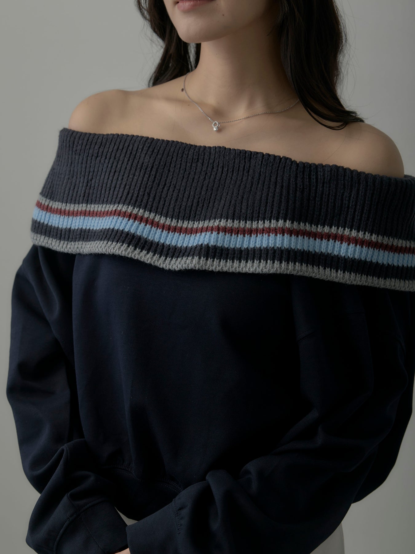 配色ボーダースウェットオフショルトップス
