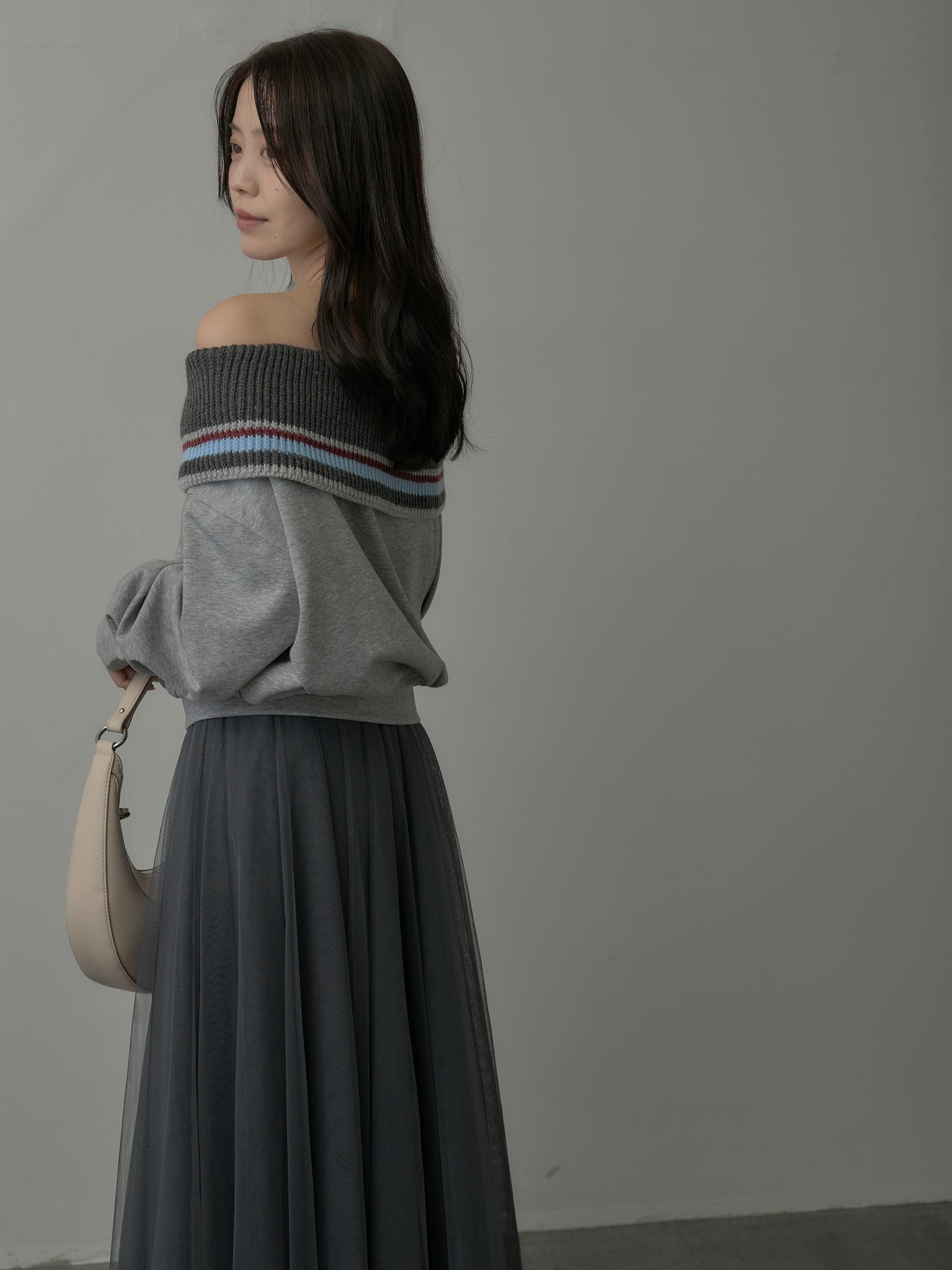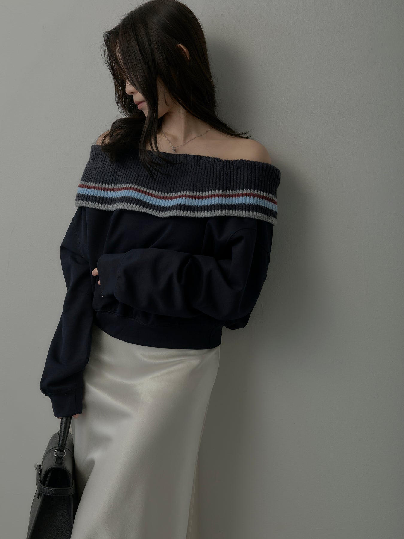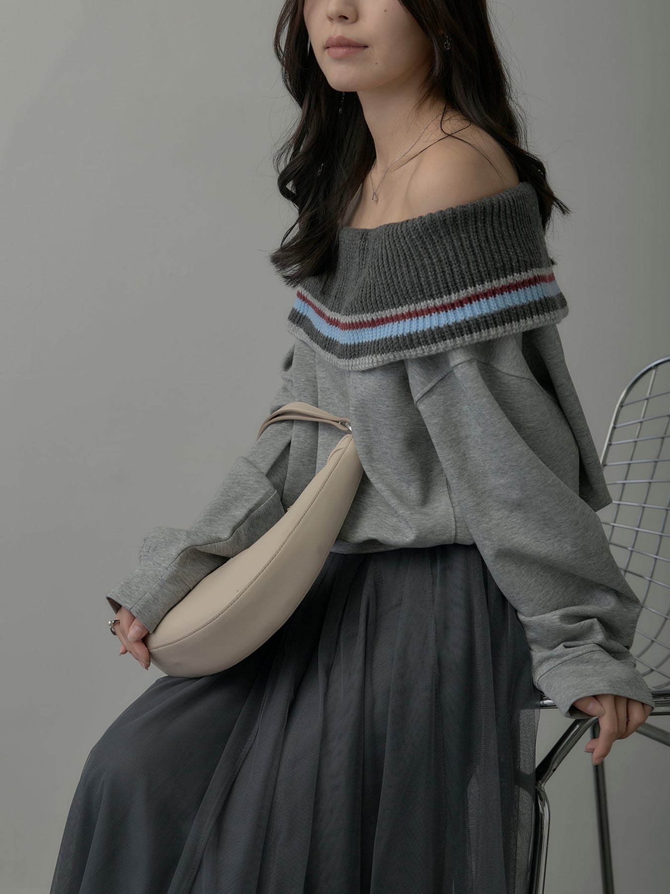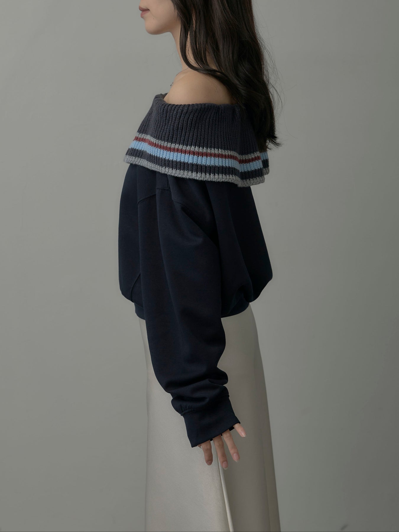 リブ部分に配色ボーダーをあしらったオフショルダースウェット。肩を落とした抜け感のあるデザインが、リラックスムードの中に華やかさをプラス。柔らかな素材で着心地も良く、デイリーコーデに旬なアクセントを添える一枚。