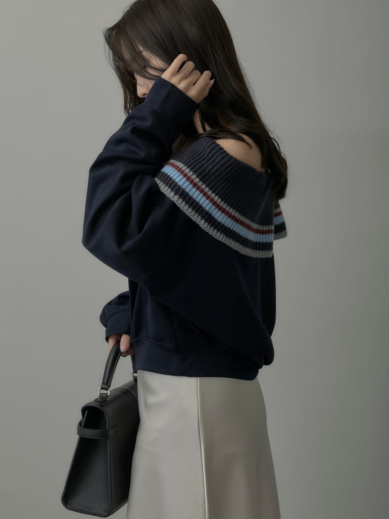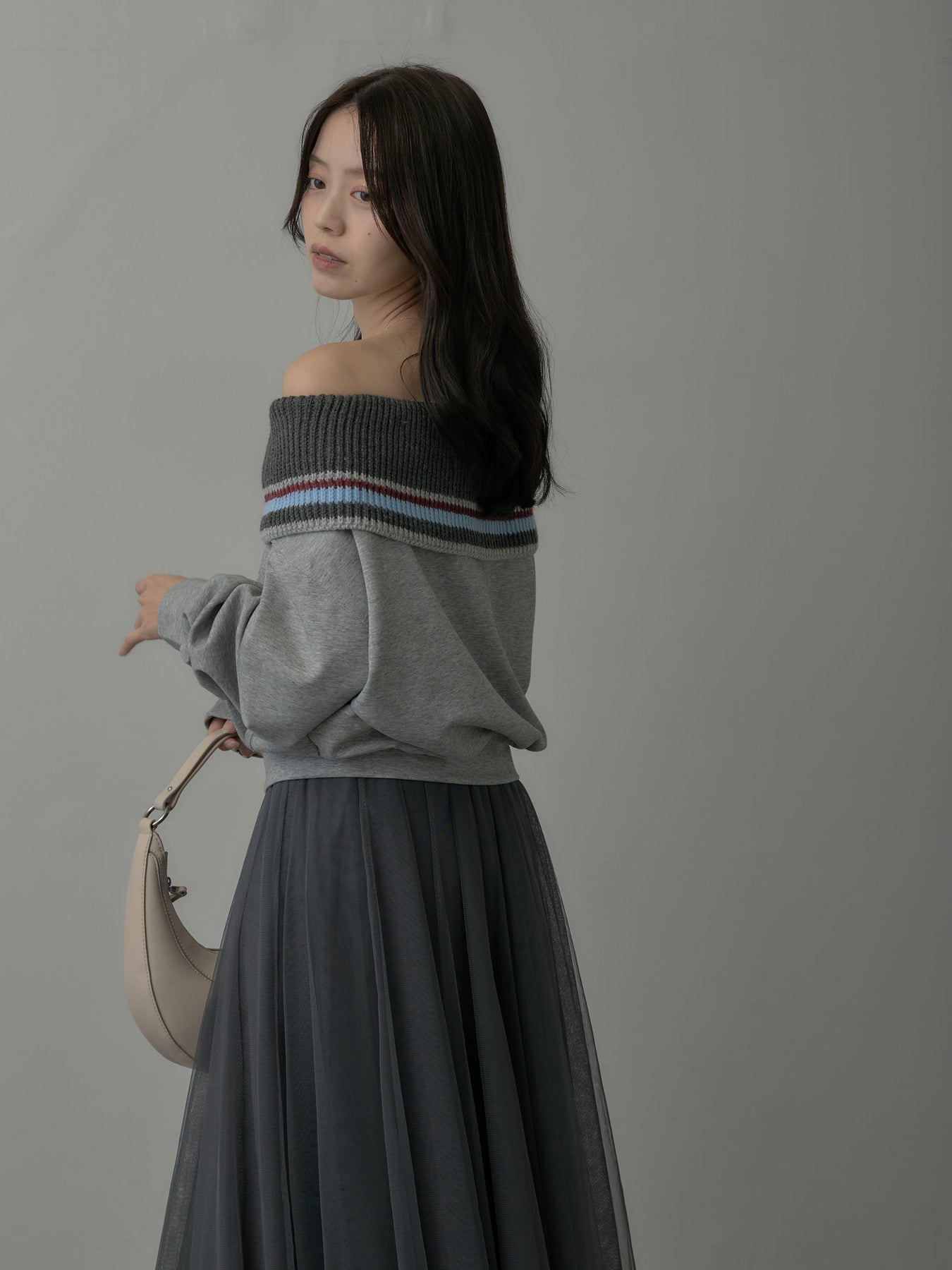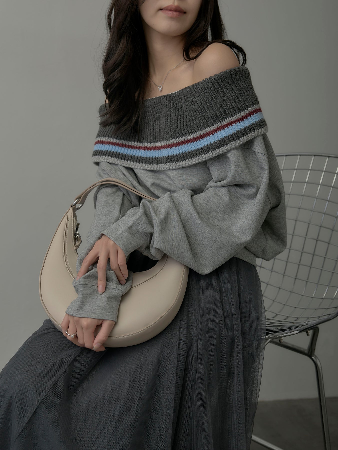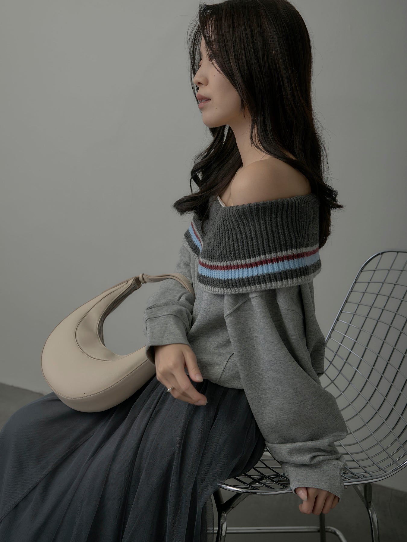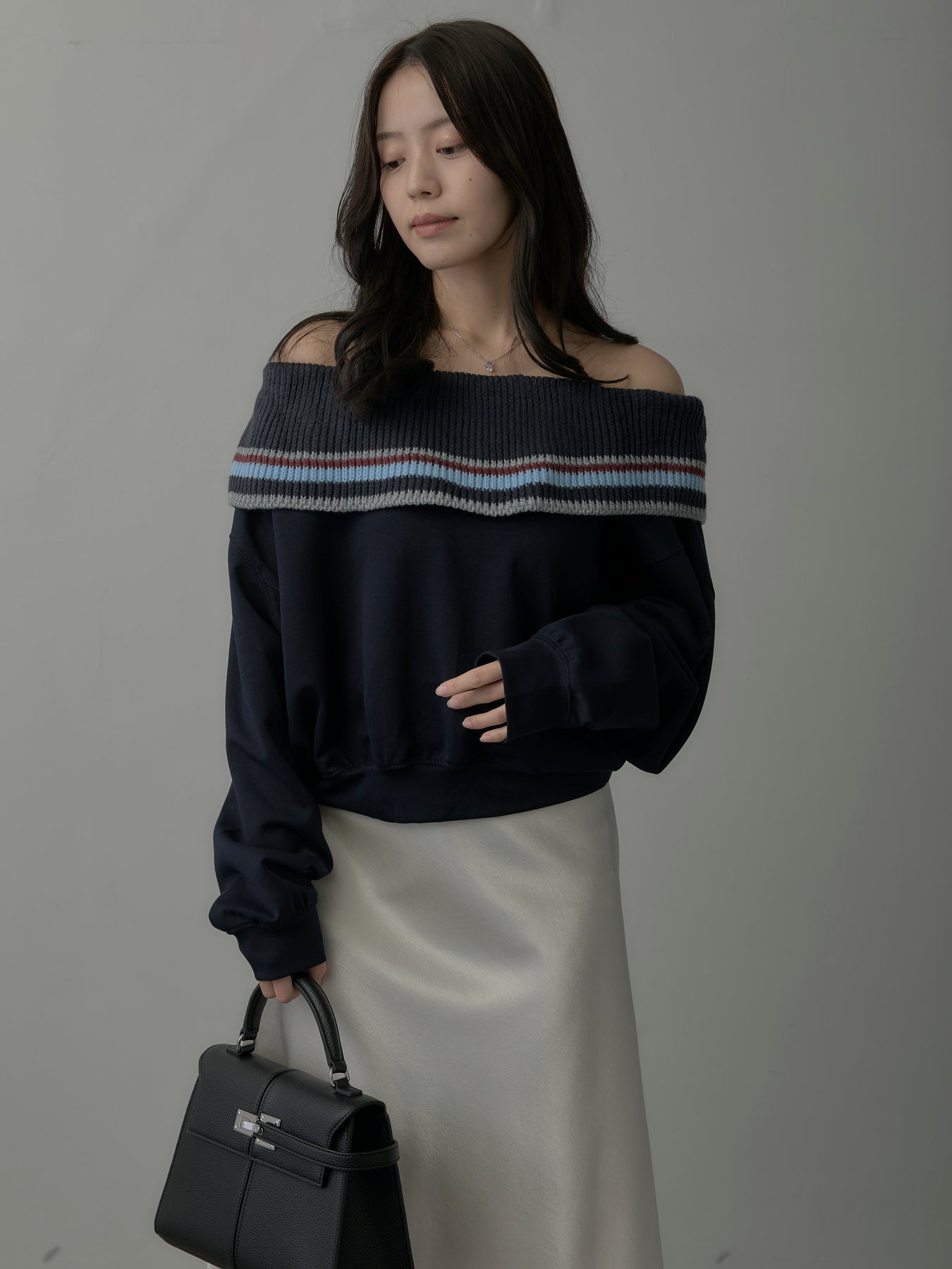 リブ部分に配色ボーダーをあしらったオフショルダースウェット。肩を落とした抜け感のあるデザインが、リラックスムードの中に華やかさをプラス。柔らかな素材で着心地も良く、デイリーコーデに旬なアクセントを添える一枚。