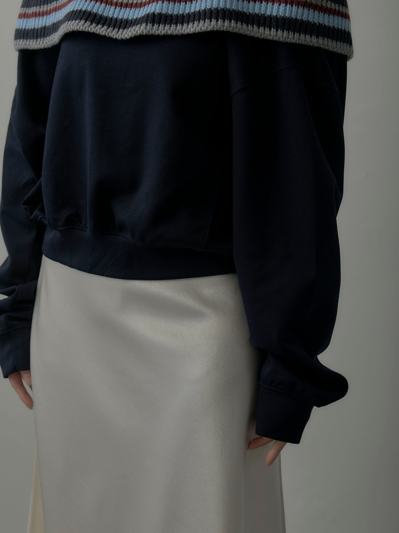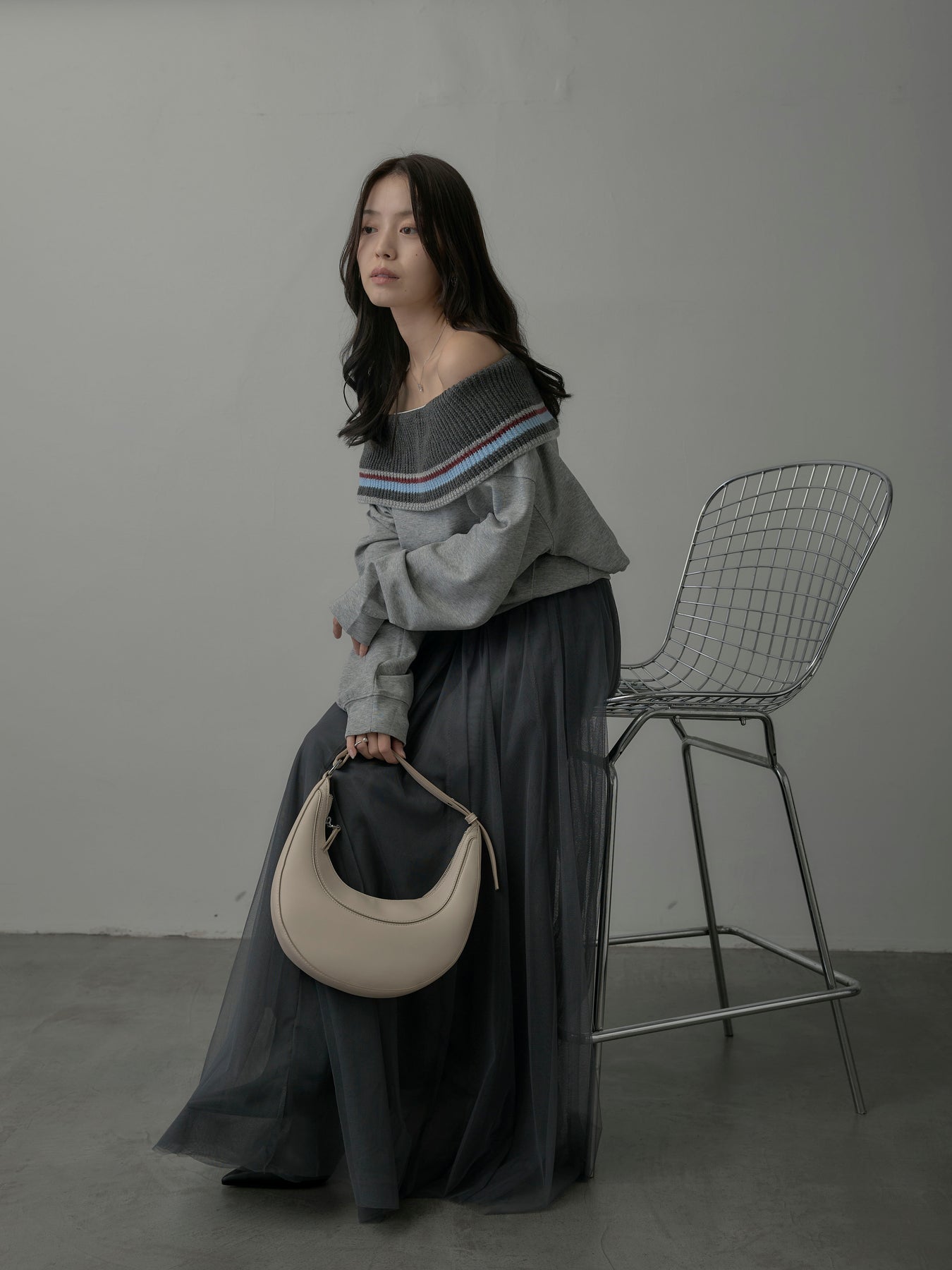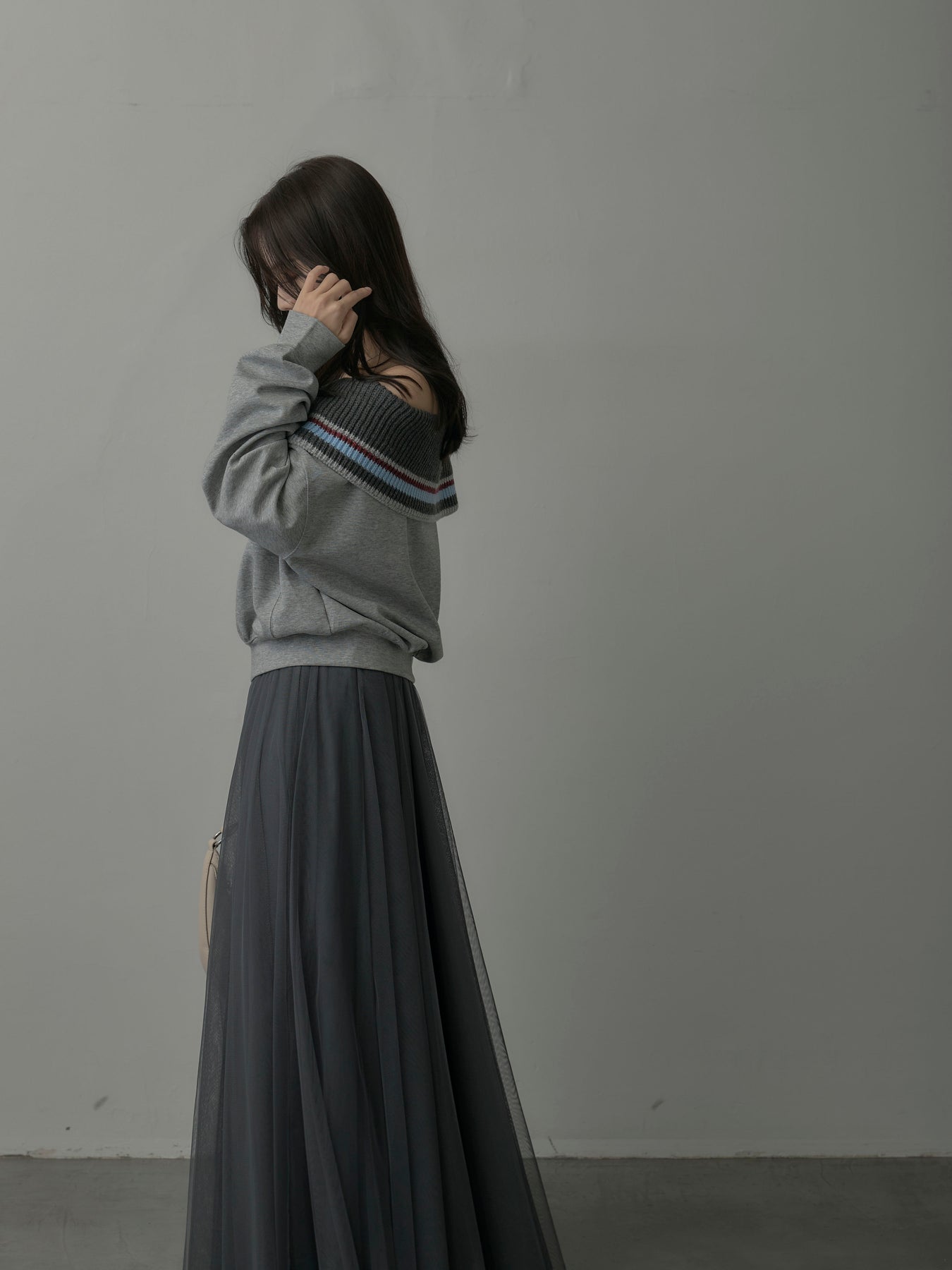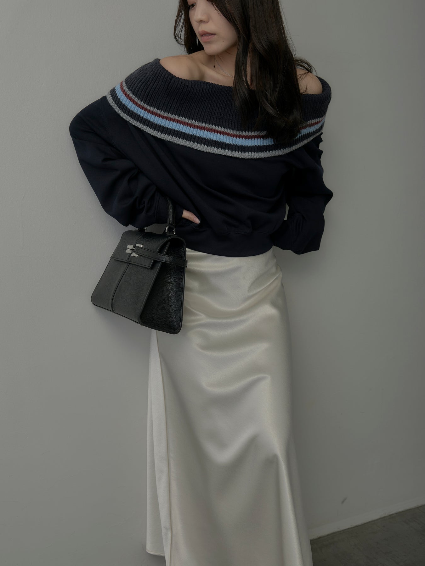 リブ部分に配色ボーダーをあしらったオフショルダースウェット。肩を落とした抜け感のあるデザインが、リラックスムードの中に華やかさをプラス。柔らかな素材で着心地も良く、デイリーコーデに旬なアクセントを添える一枚。