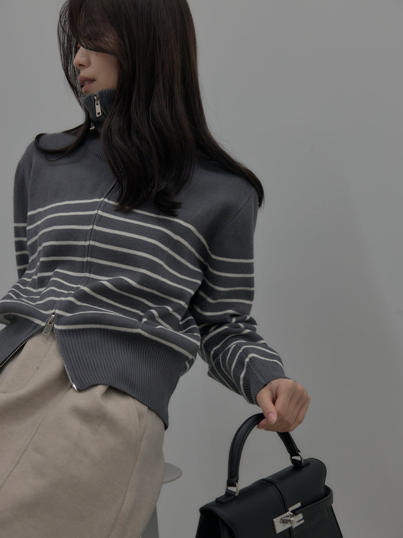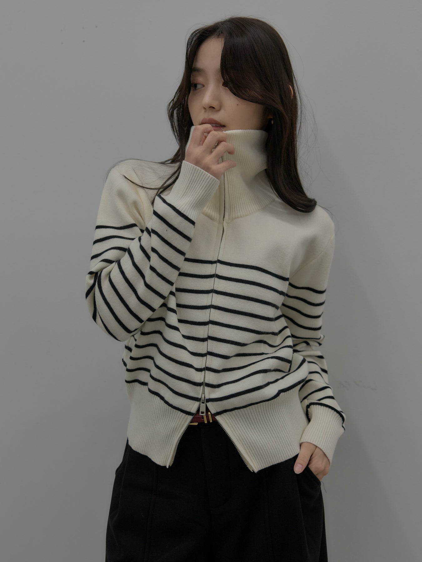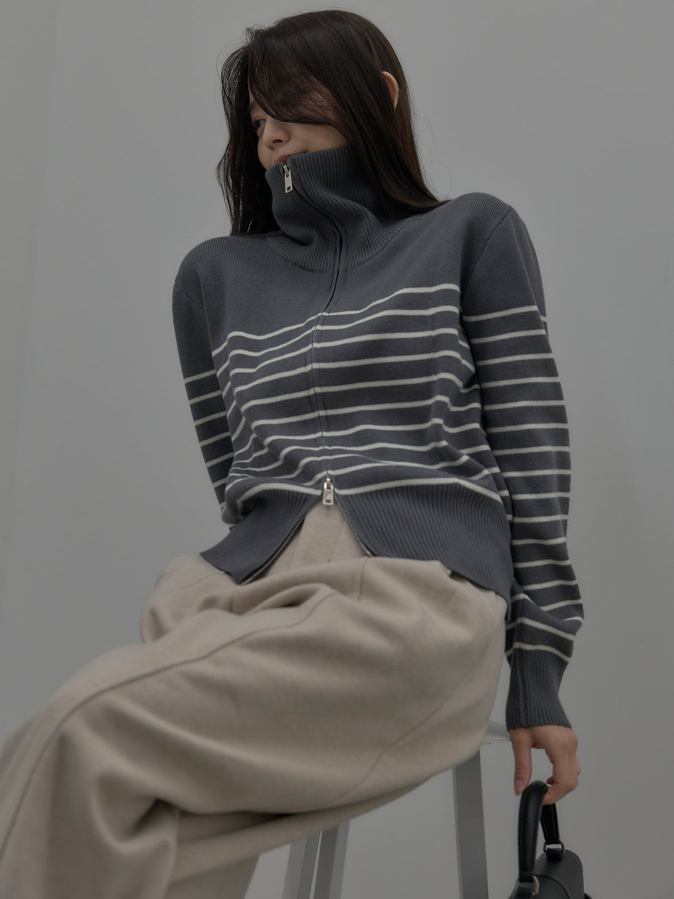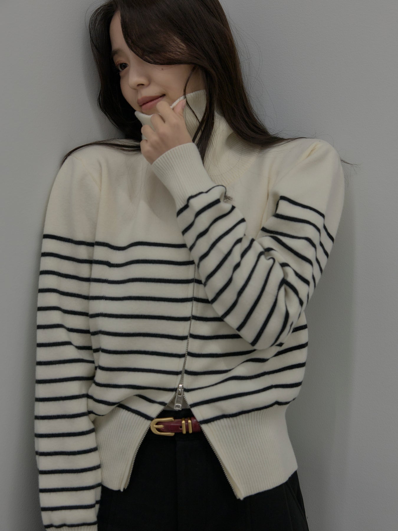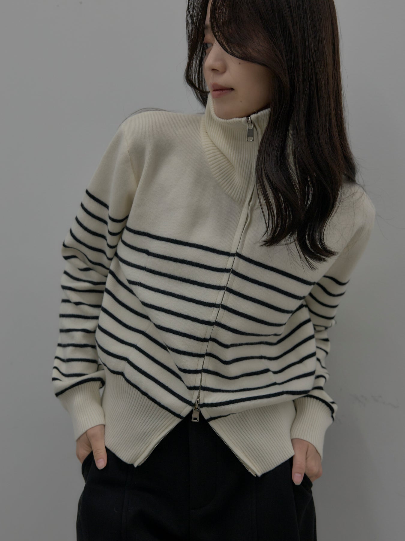 ダブルZIPがアクセントになったハイネックのボーダーニットトップス。