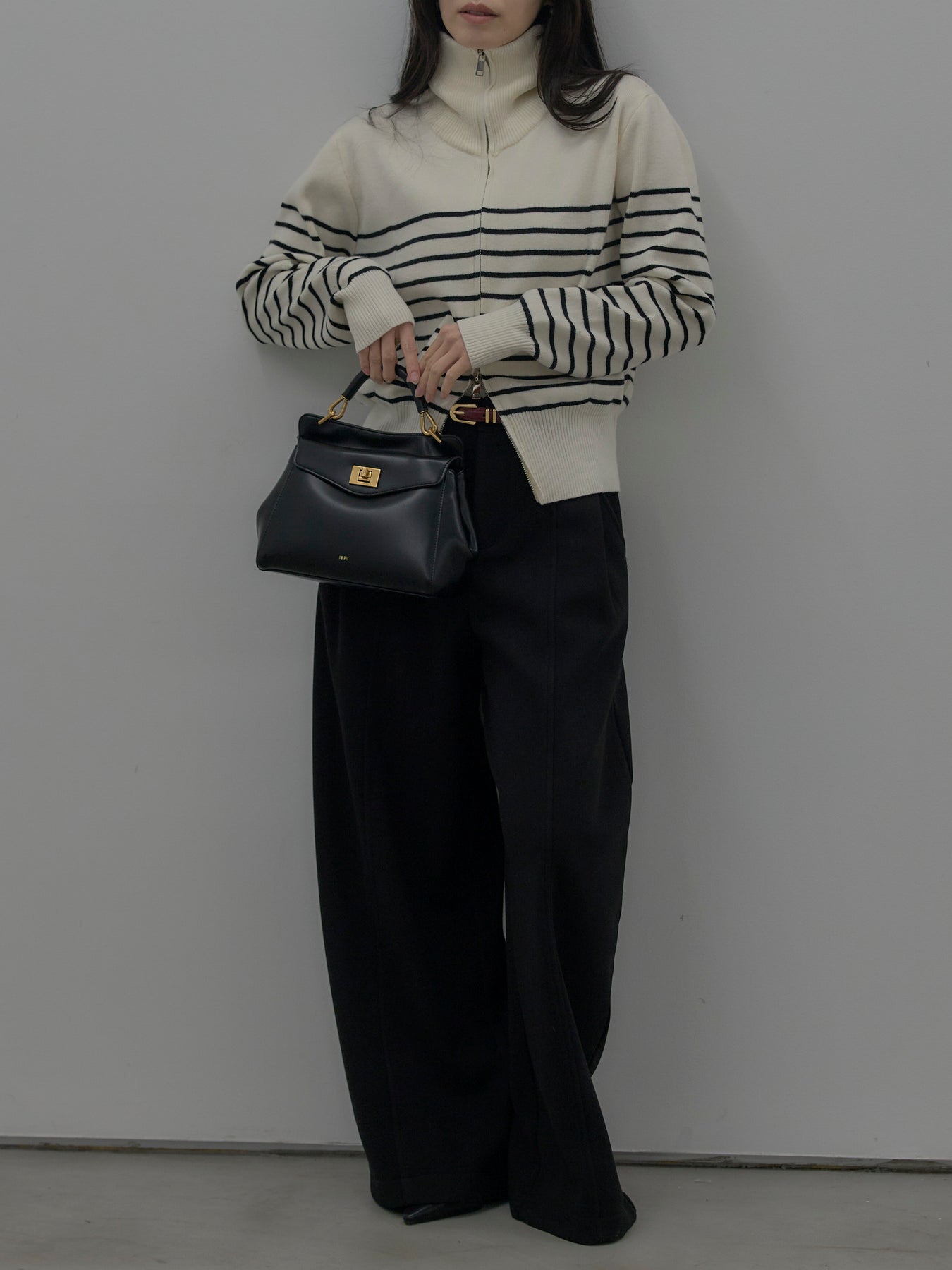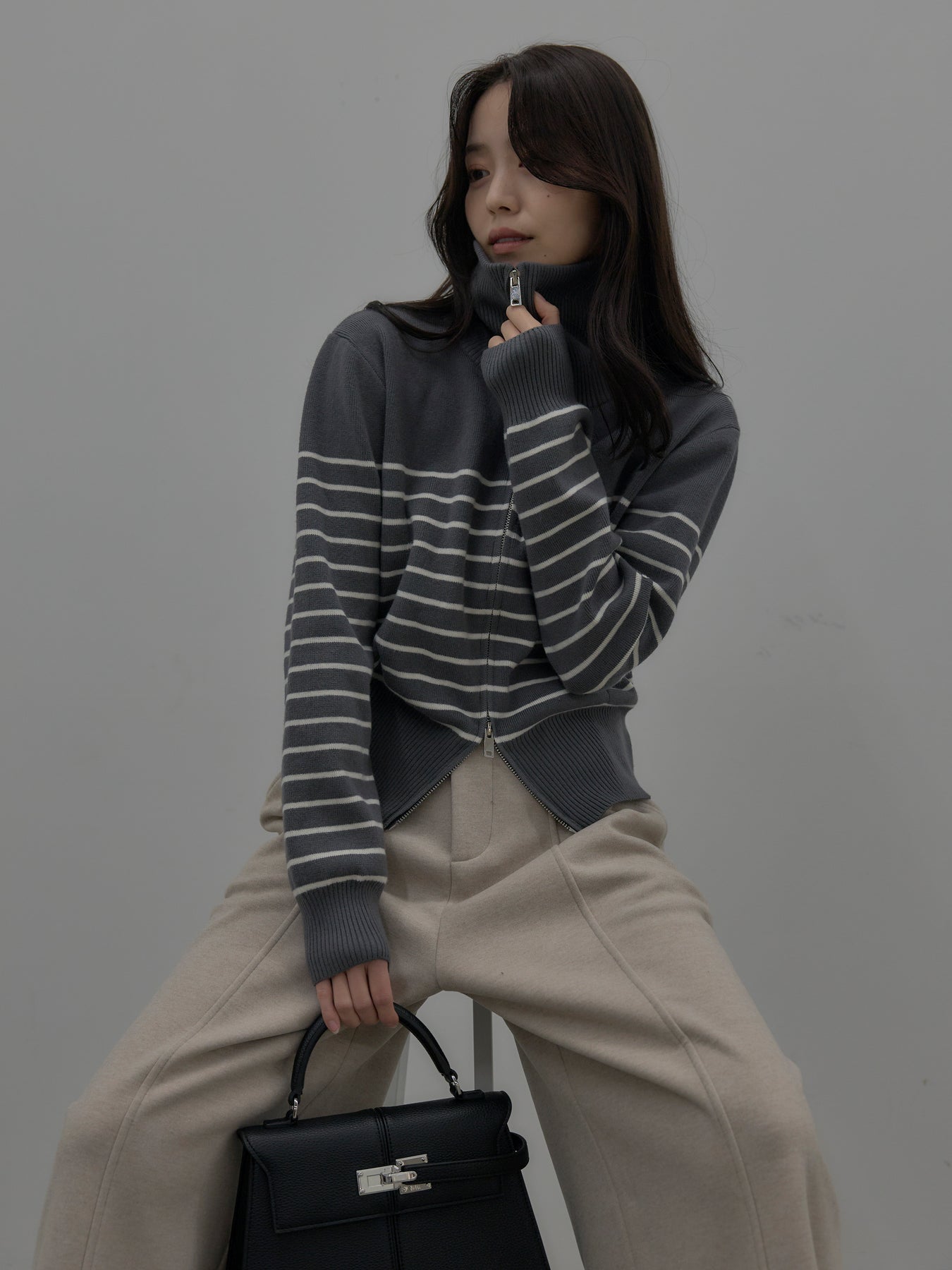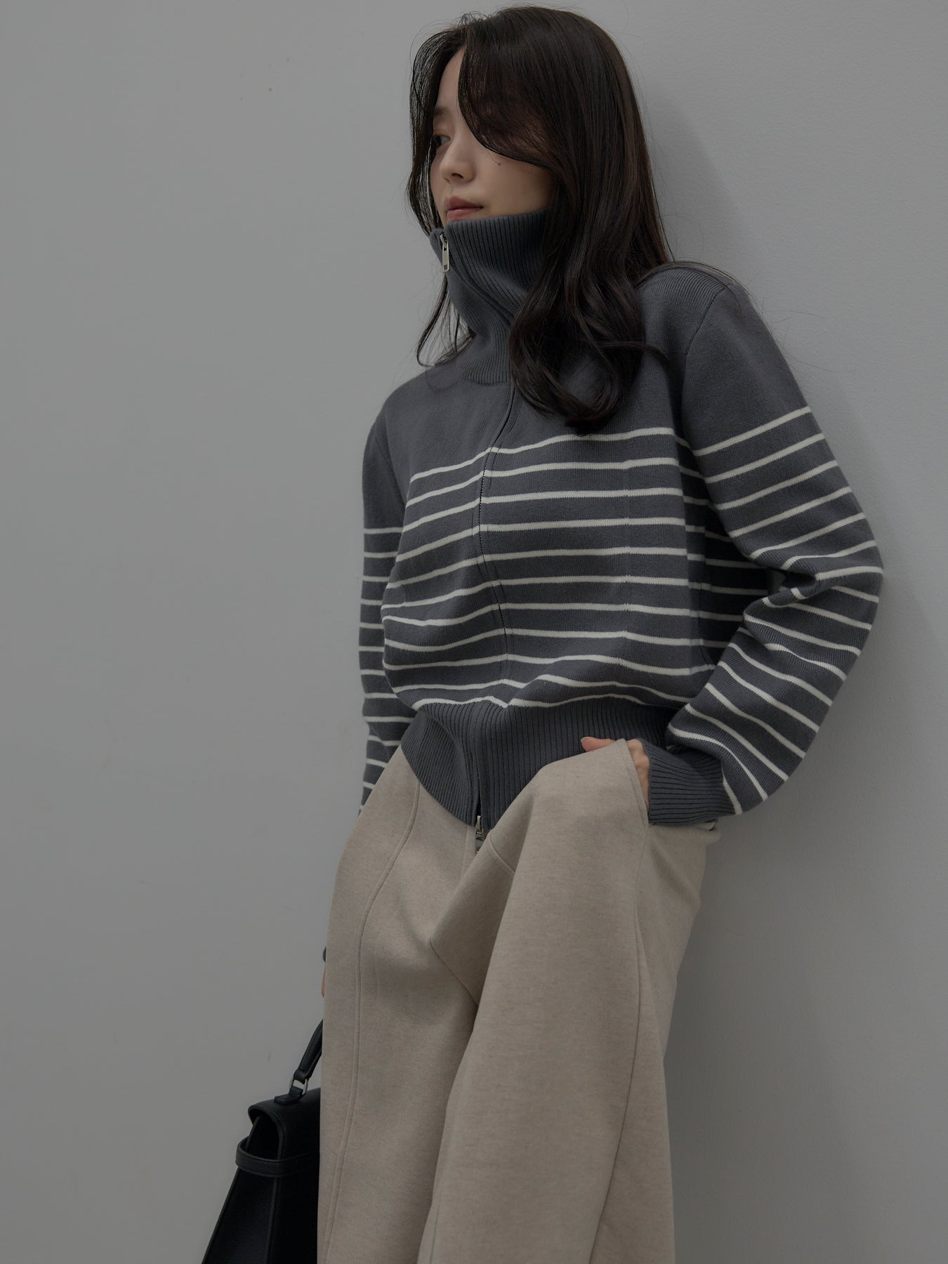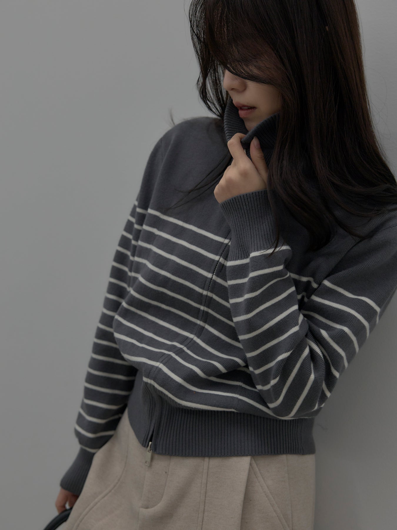 ダブルZIPがアクセントになったハイネックのボーダーニットトップス。