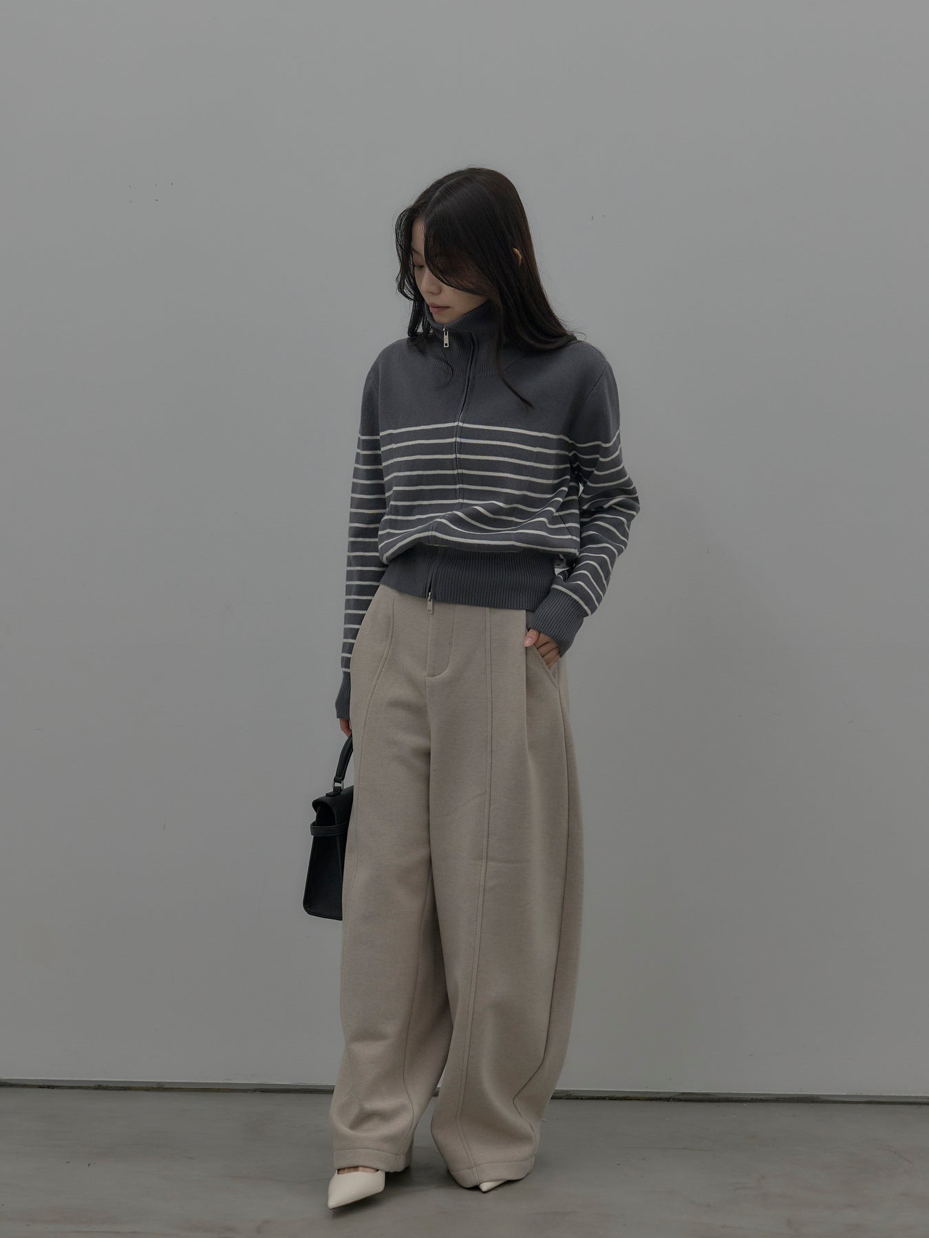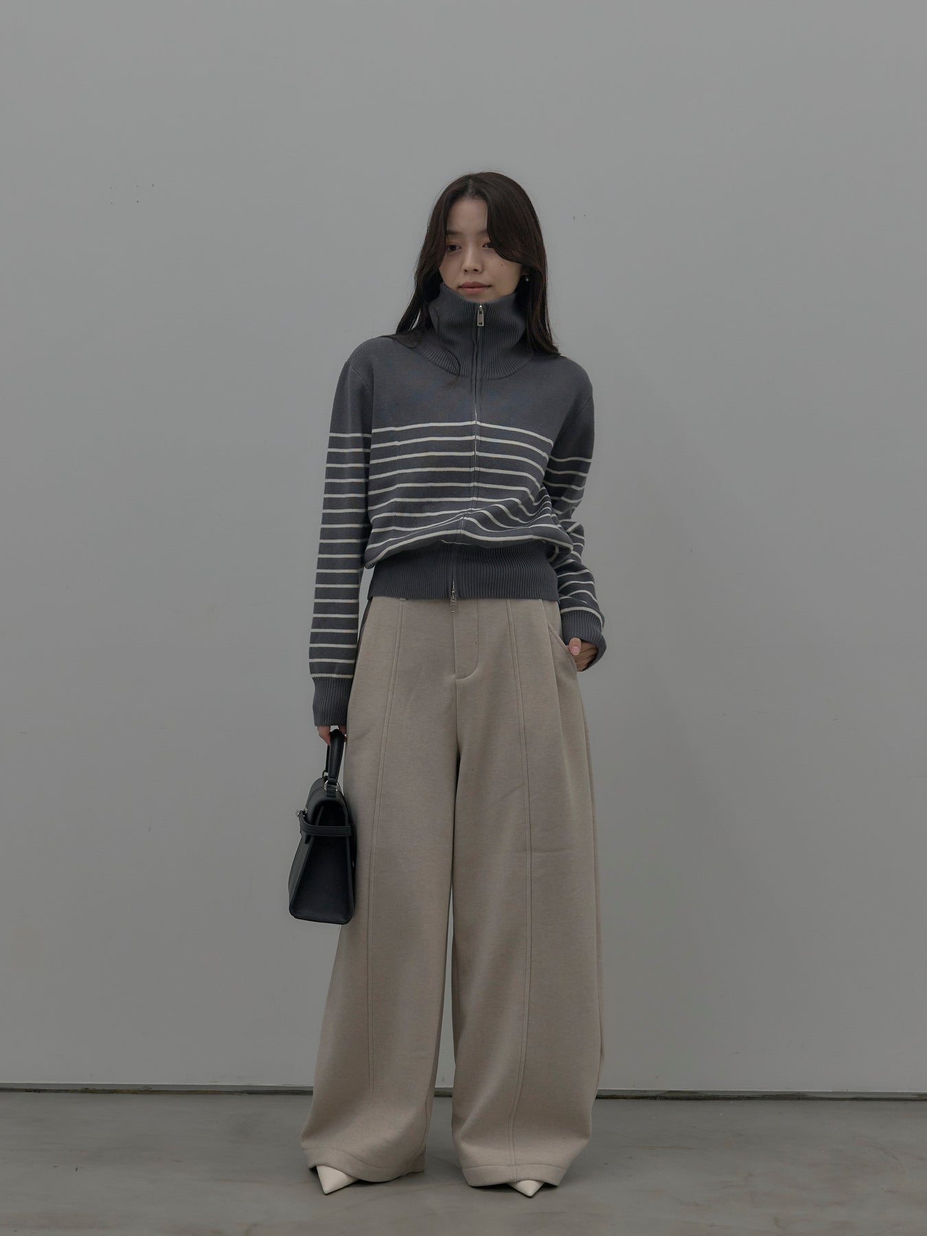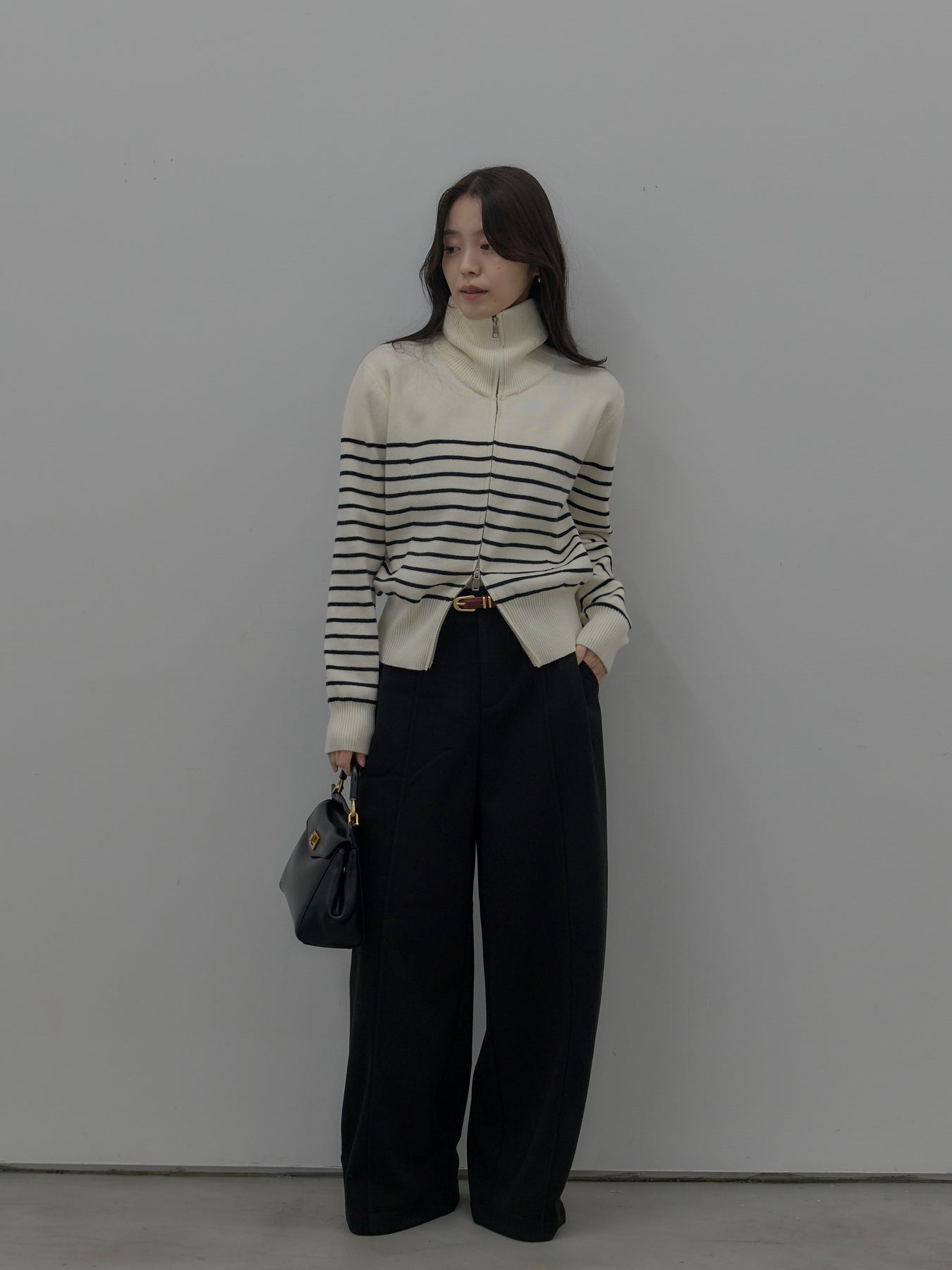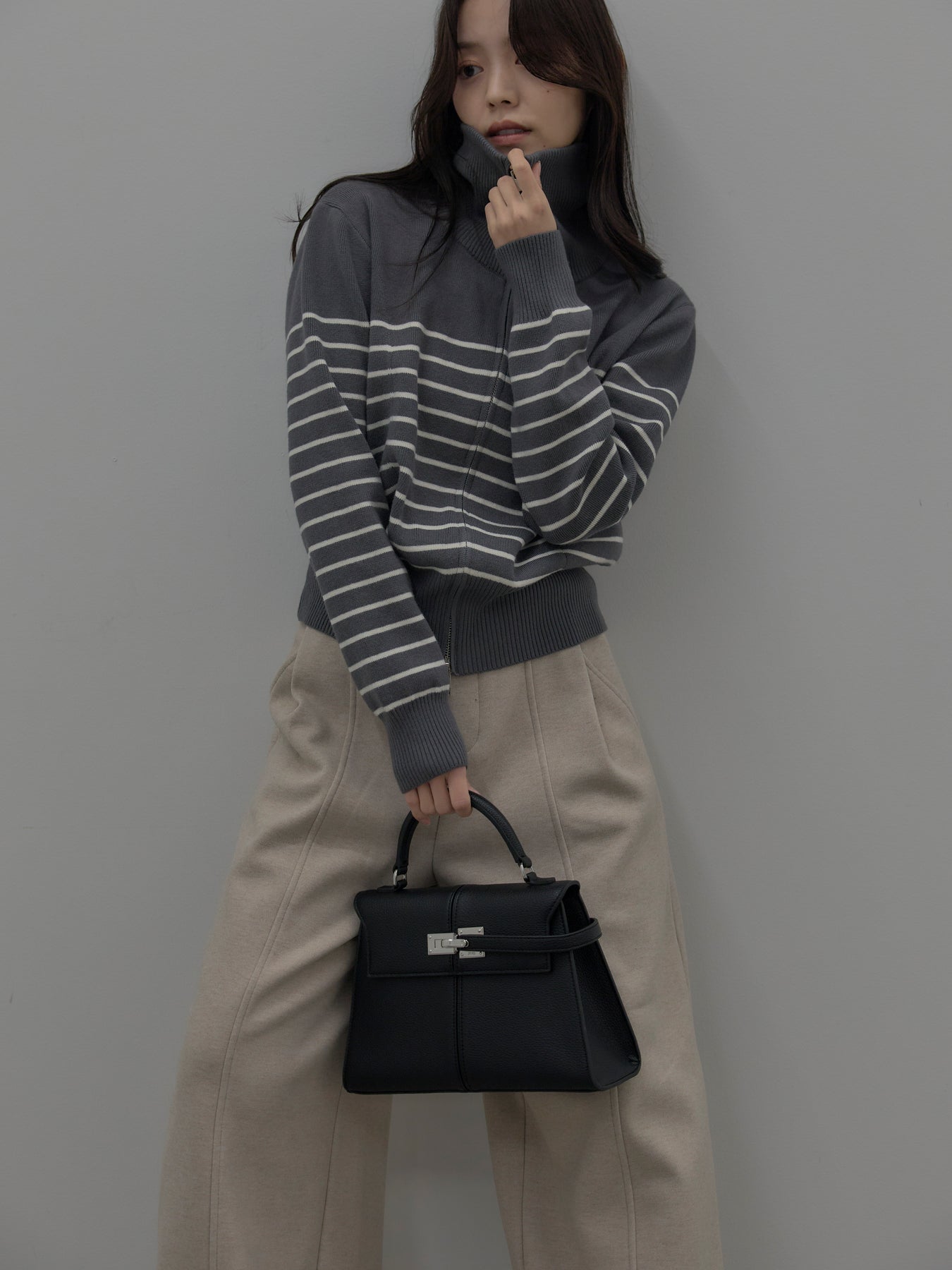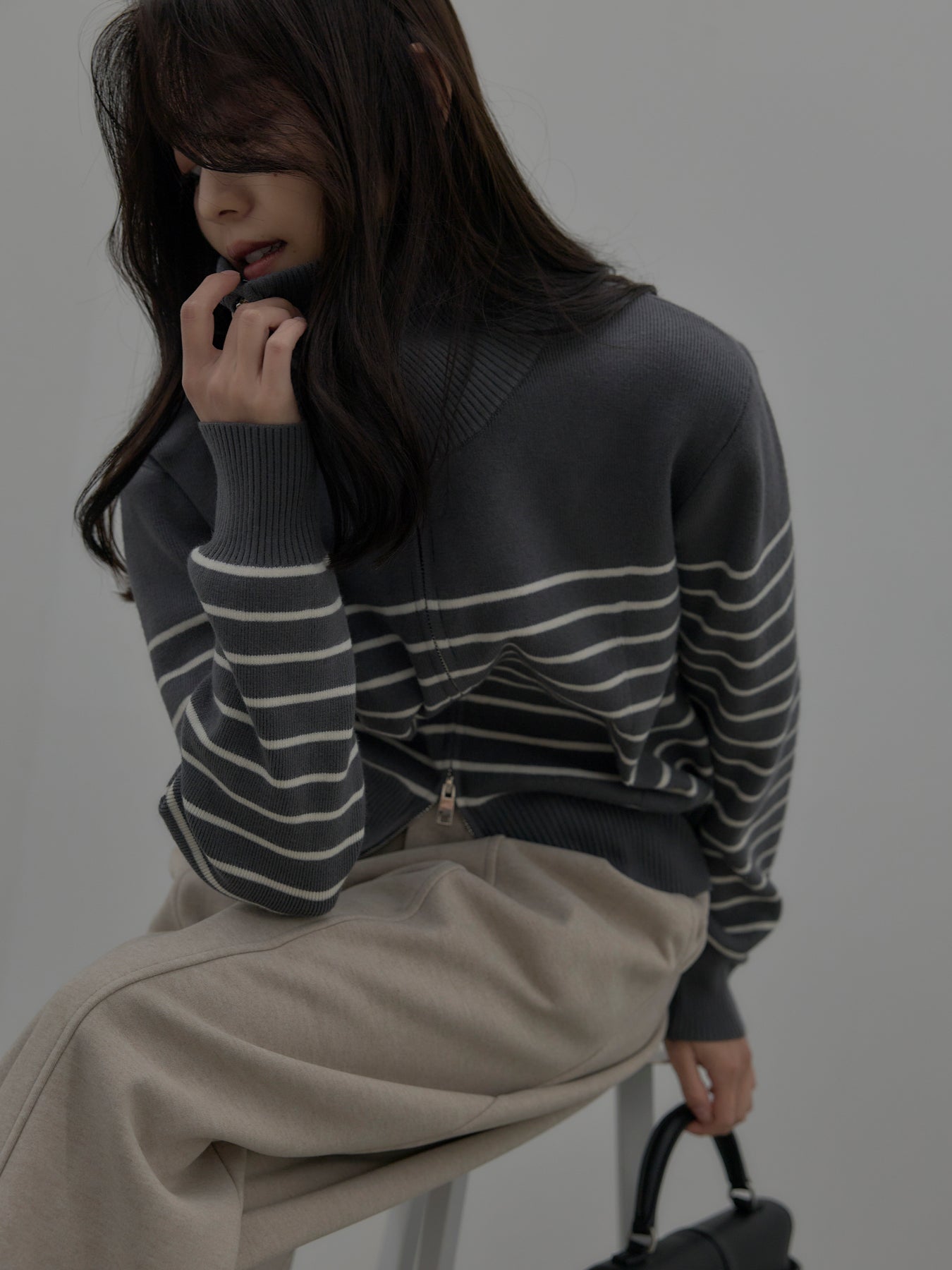 ダブルZIPがアクセントになったハイネックのボーダーニットトップス。