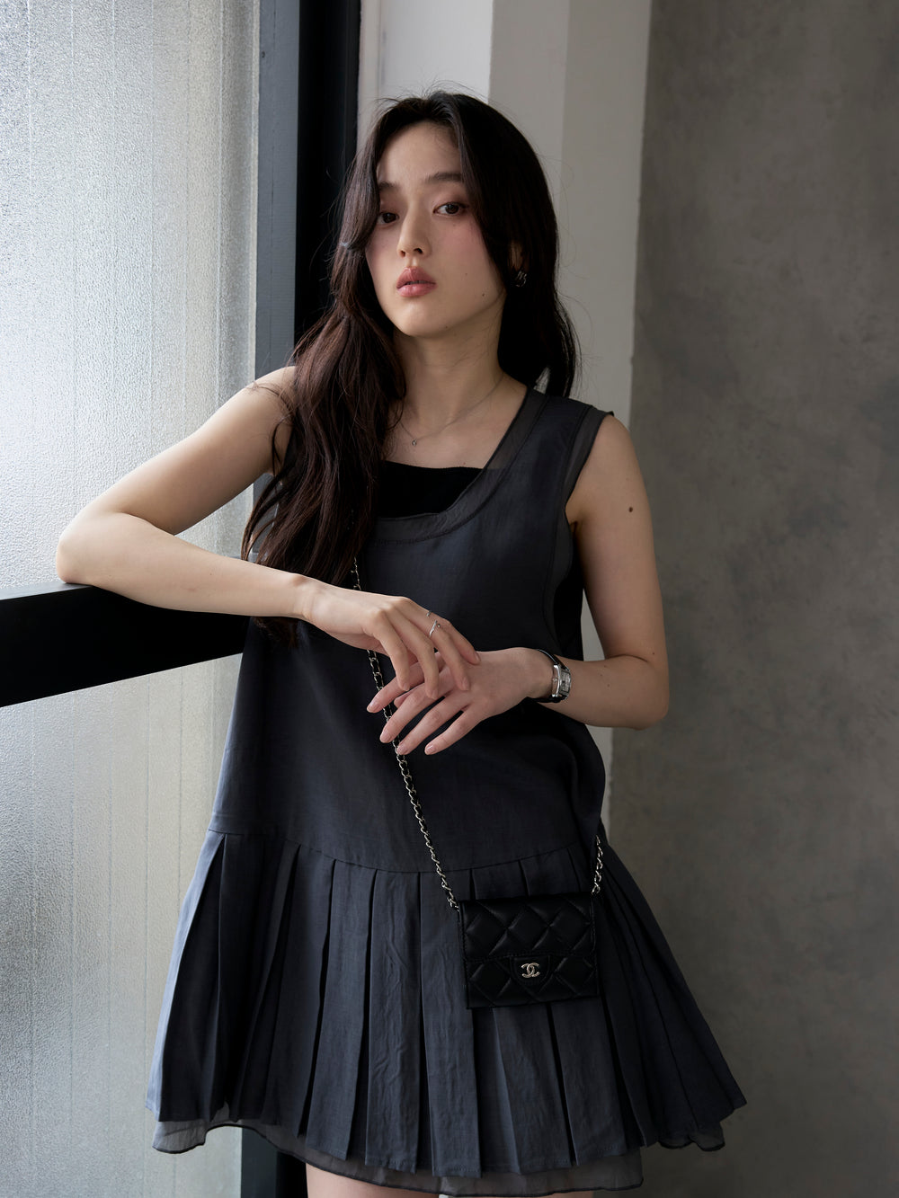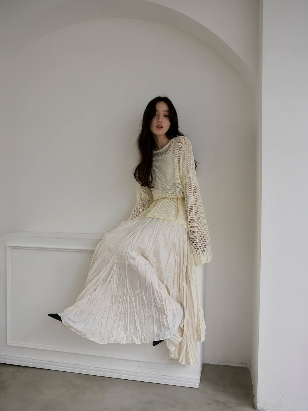 【SET】リネンタッチメッシュルーズトップス+グロッシーワッシャープリーツスカート(2set)