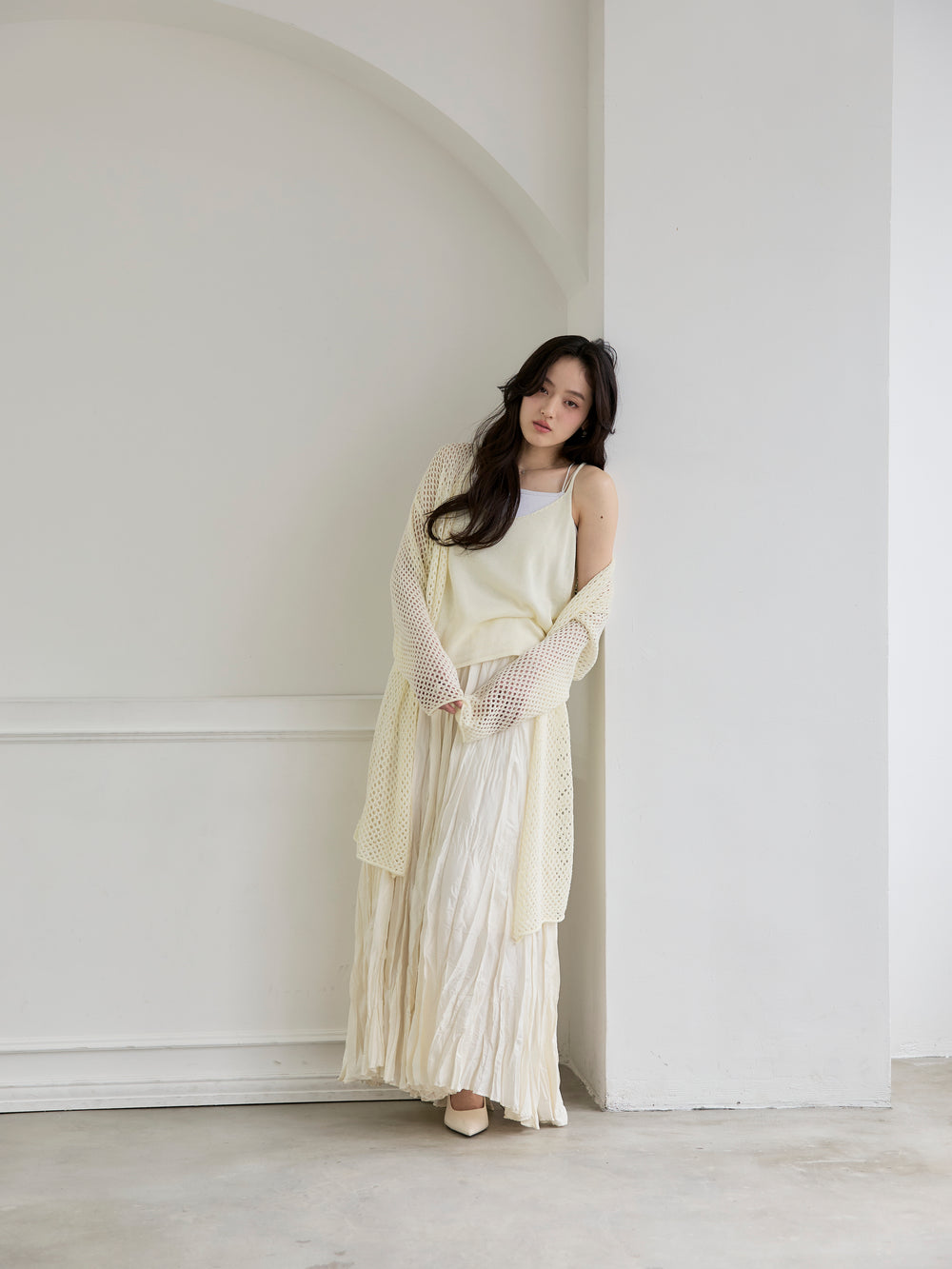 【SET】リネンタッチ透かし編みカーディガン&キャミソールSET+グロッシーワッシャープリーツスカート(2set)