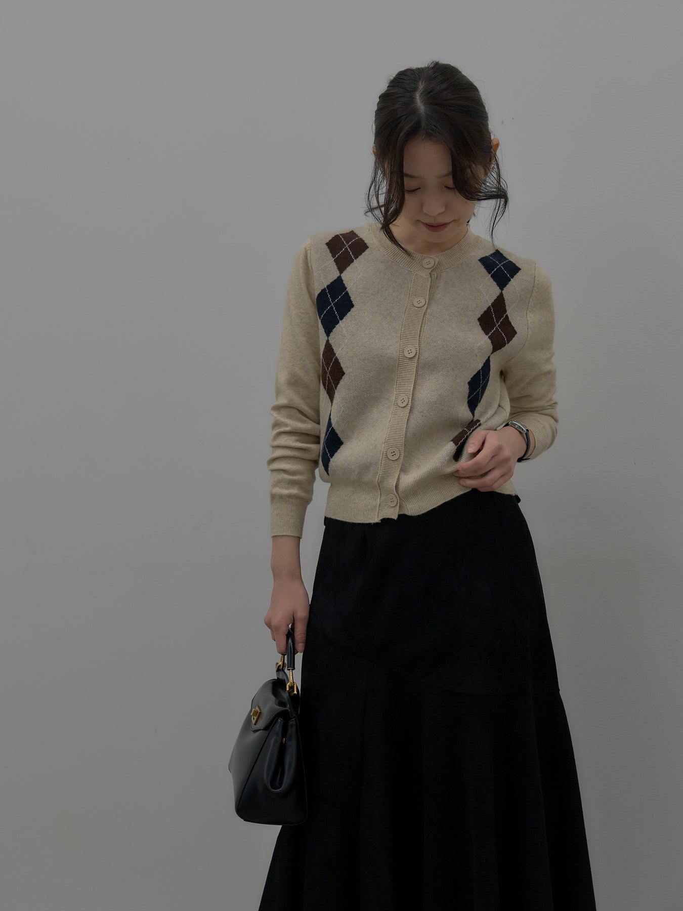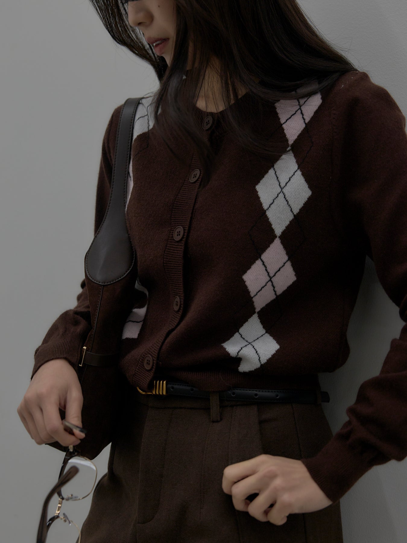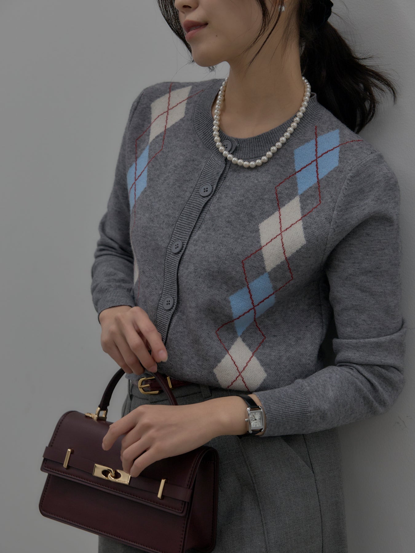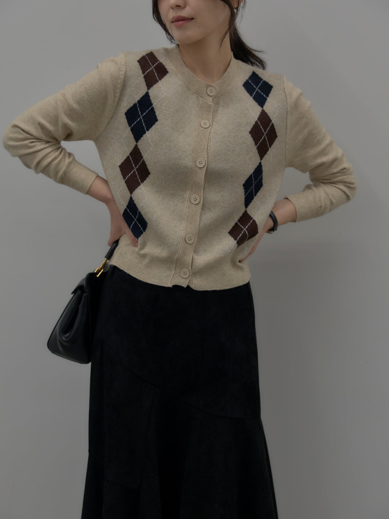 クラシカルなアーガイル柄が目を惹くニットカーディガン。 ほどよいゆるさのシルエットが抜け感を演出し、羽織るだけでコーデの主役になる一枚です。 やわらかな風合いで着心地も良く、スカートにもパンツにも合わせやすい万能アイテム。 デイリーからきれいめまで幅広く活躍します。