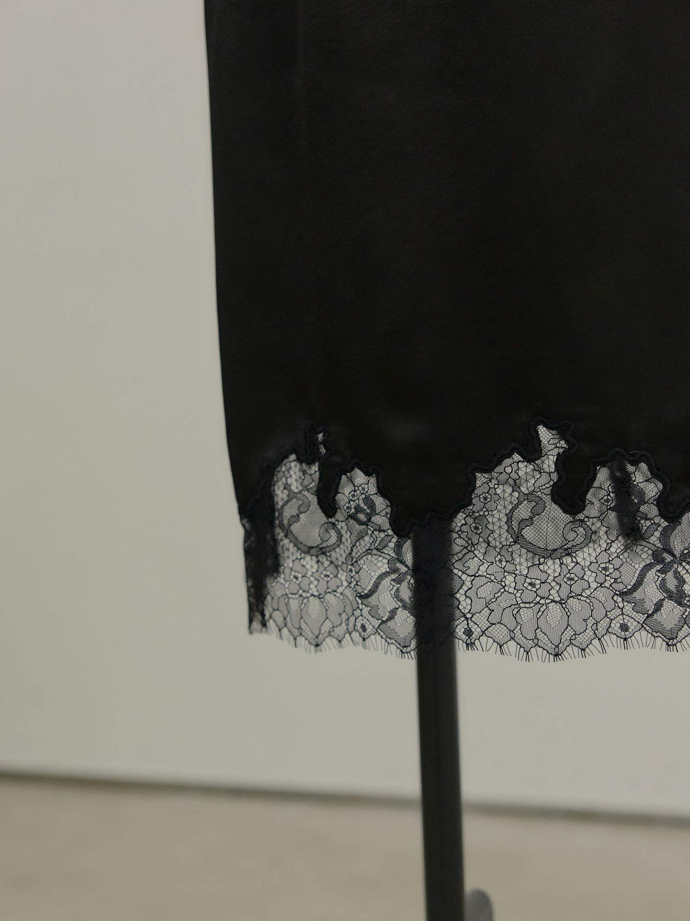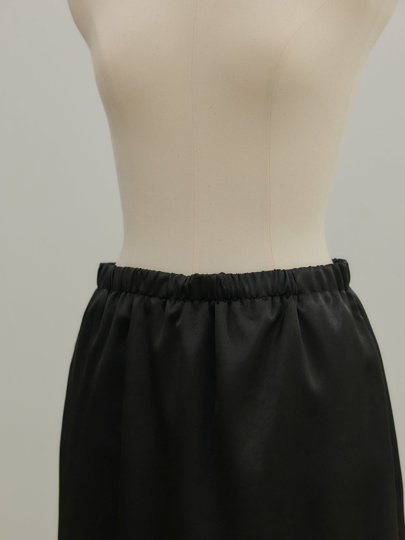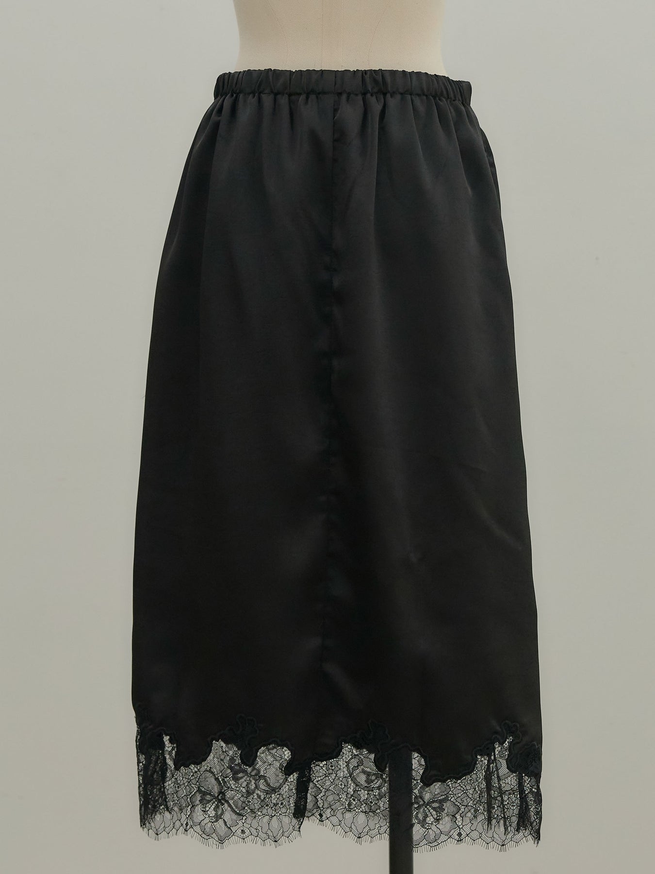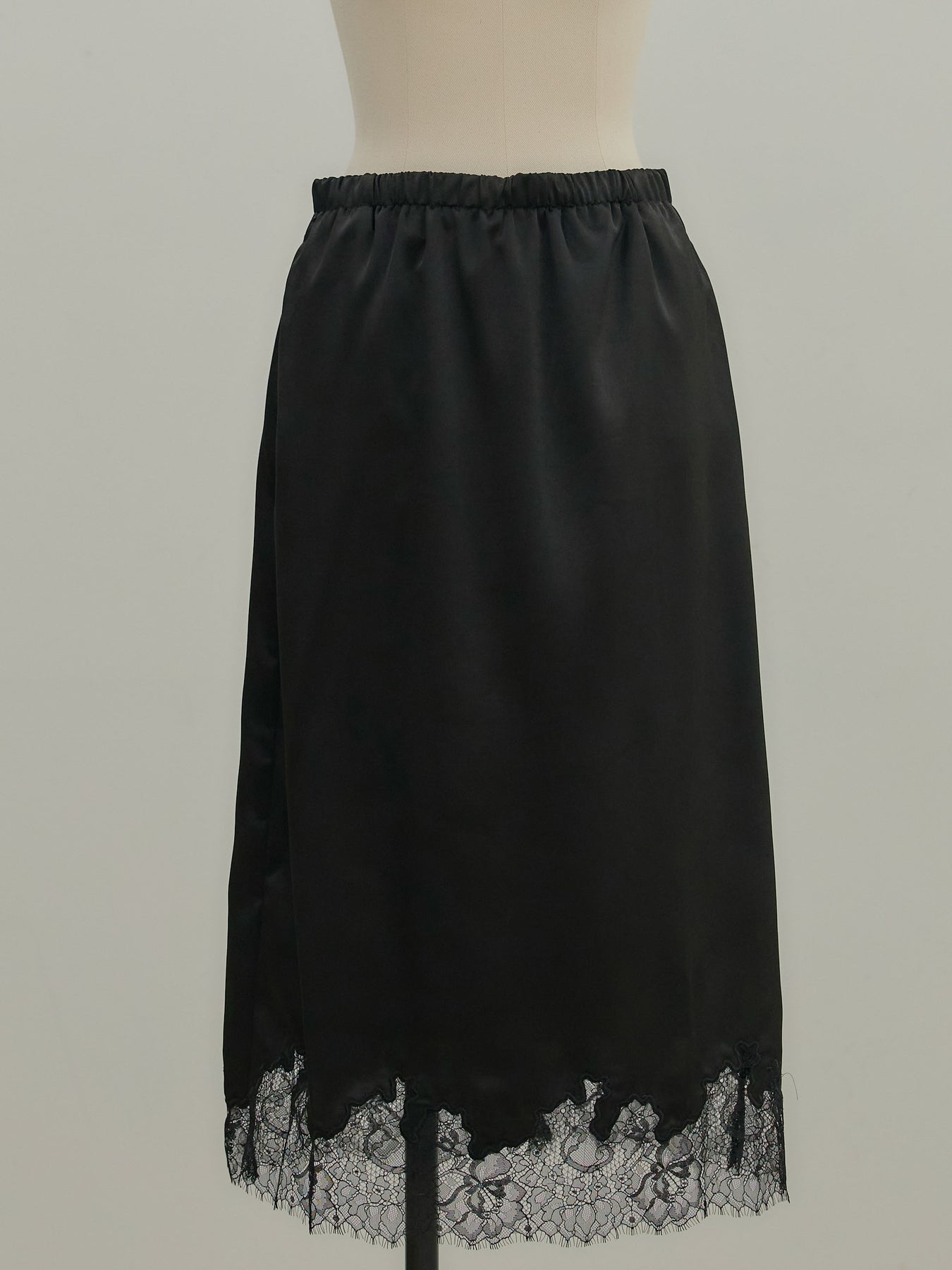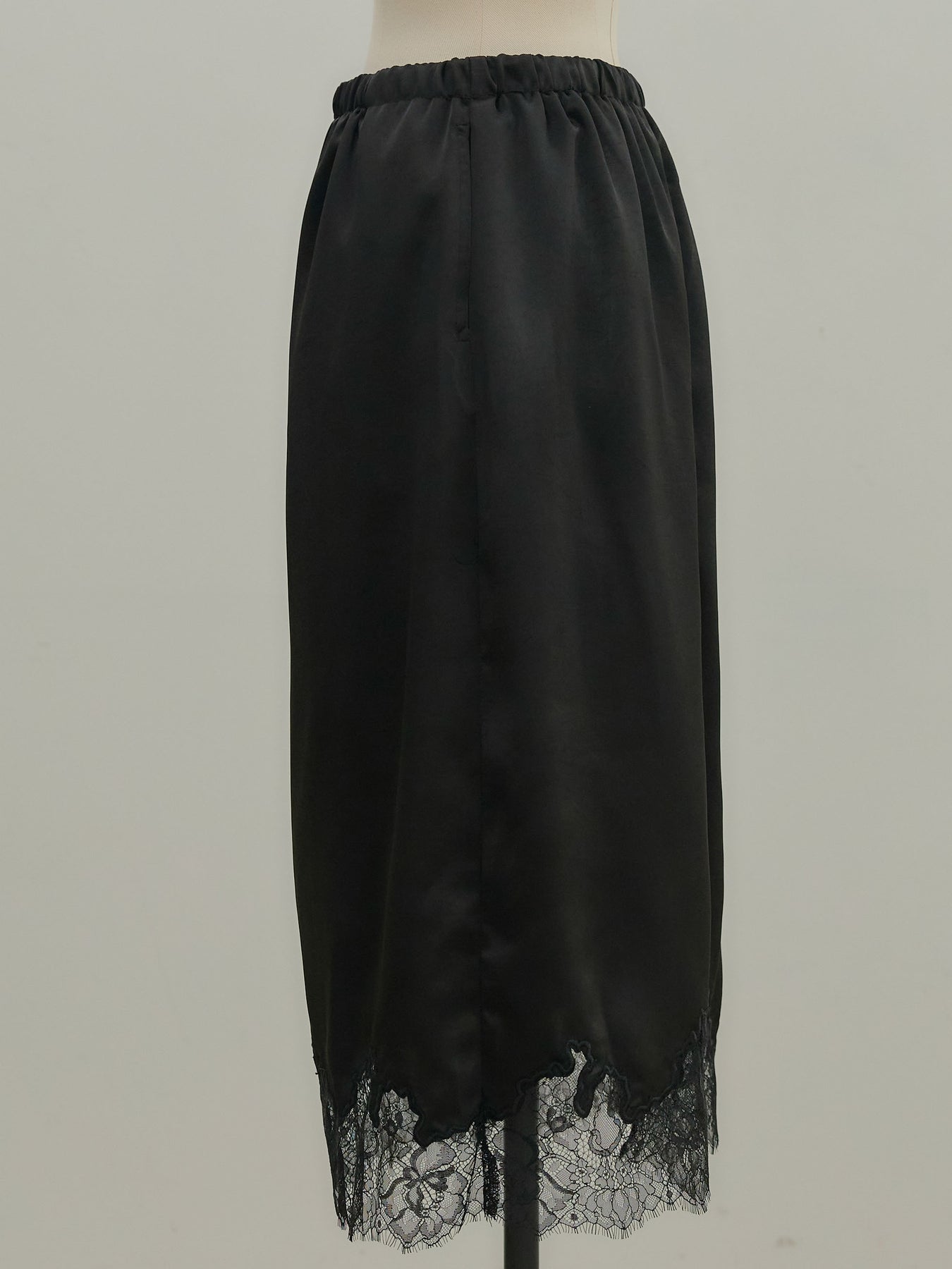 裾に施した美しいレースディテールがラグジュアリーな雰囲気をプラスしてくれるサテンミディスカート。ミディ丈で足首が綺麗に見えるアイテムです。ゆとりのあるシルエットで足捌きも◎ ウエストは総ゴム仕様かつ紐がついているので、ゆったり着たい日とジャストで着たい日と、気分によってアレンジできます。ジャケット合わせでオケージョンシーンにもマッチ。夏はTシャツやシャツをさらっと合わせてミニマルなコーディネートをお楽しみいただけます。