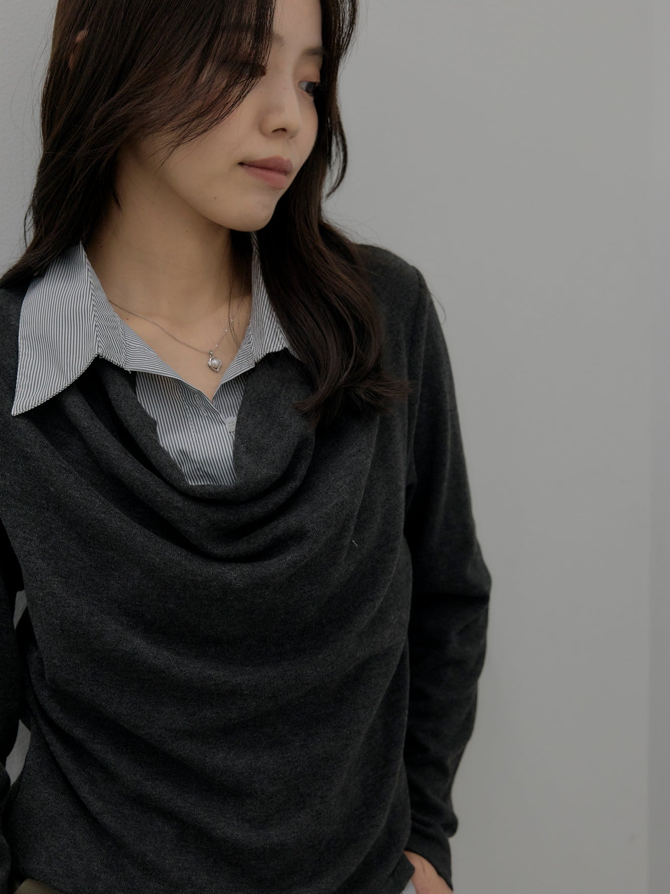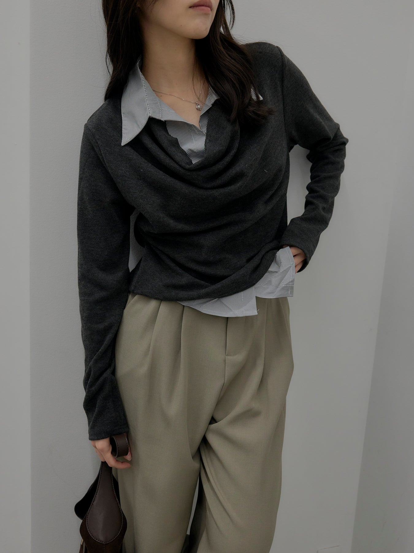 シャツをレイヤードしたようなデザインが魅力のドレープニットトップス。