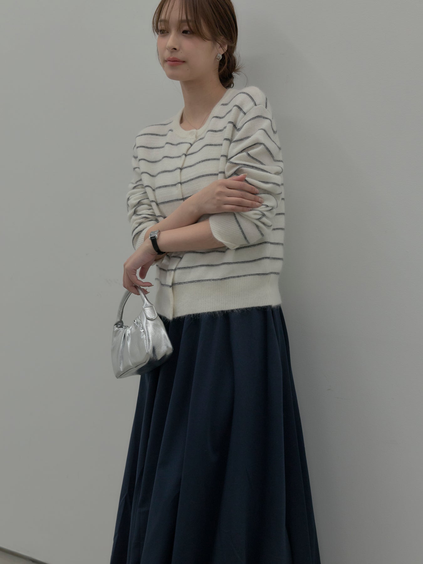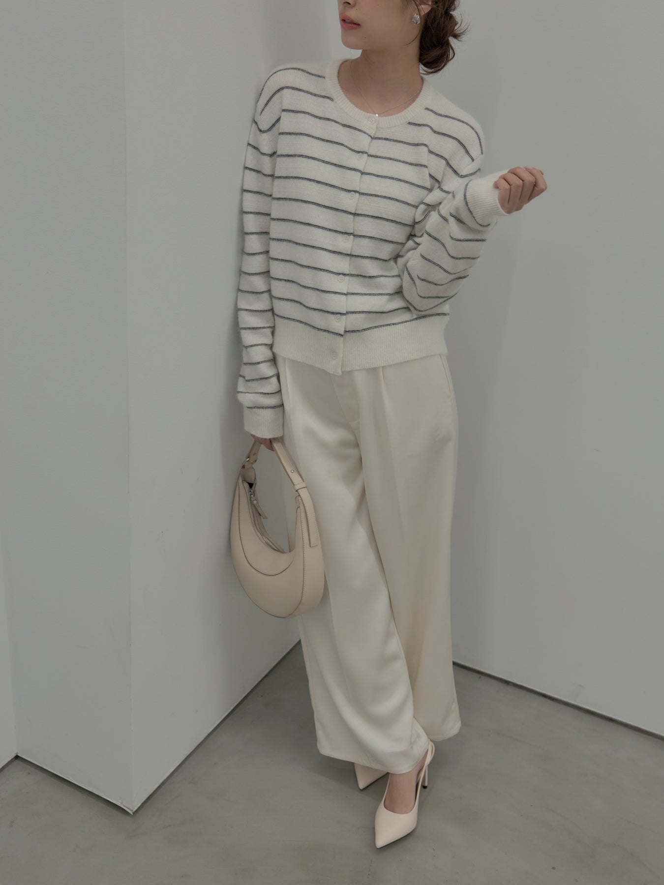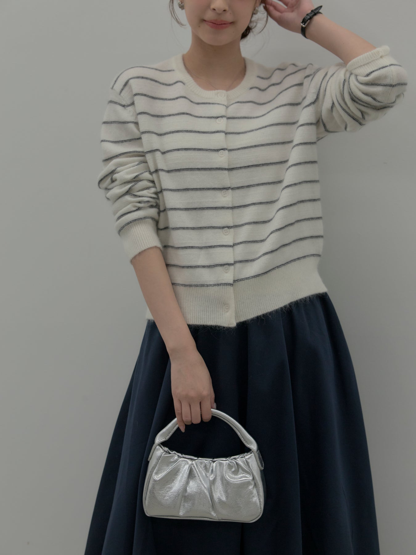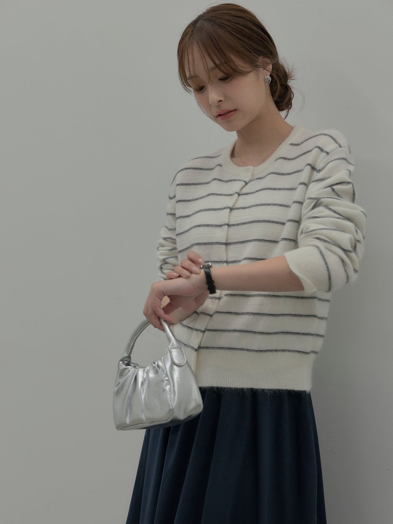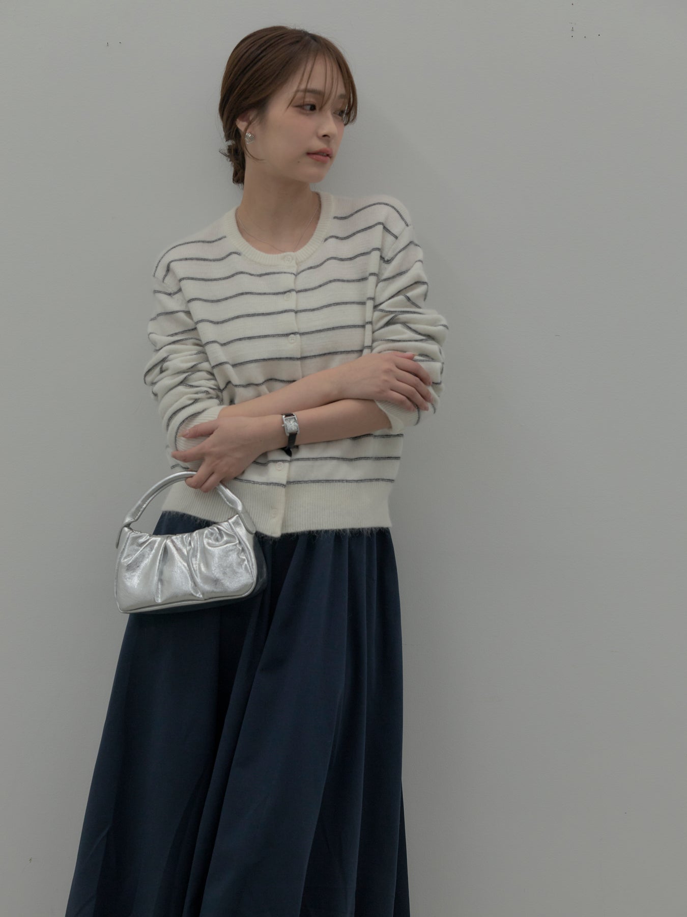 アルパカタッチのふんわり起毛感がリッチな印象を高めてくれるカーディガン。柔らかく包み込まれるような肌触りです。カジュアルなイメージの強いボーダーですが、素材感とピッチ細めのボーダーでnairoらしく上品に仕上がります。短めの丈でスタイリングしやすいのも嬉しいポイント。春先まで活躍してくれるカーディガンです。
