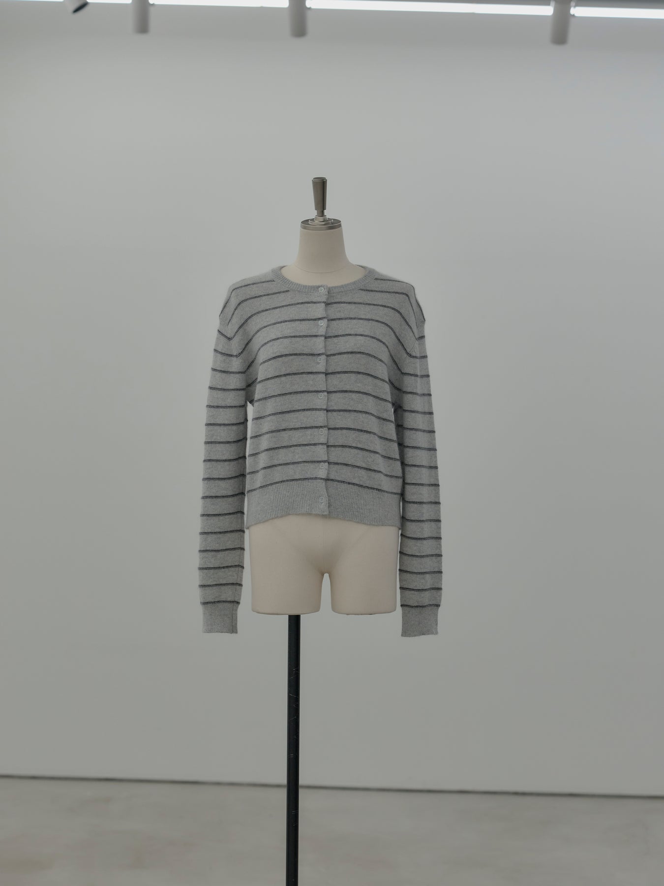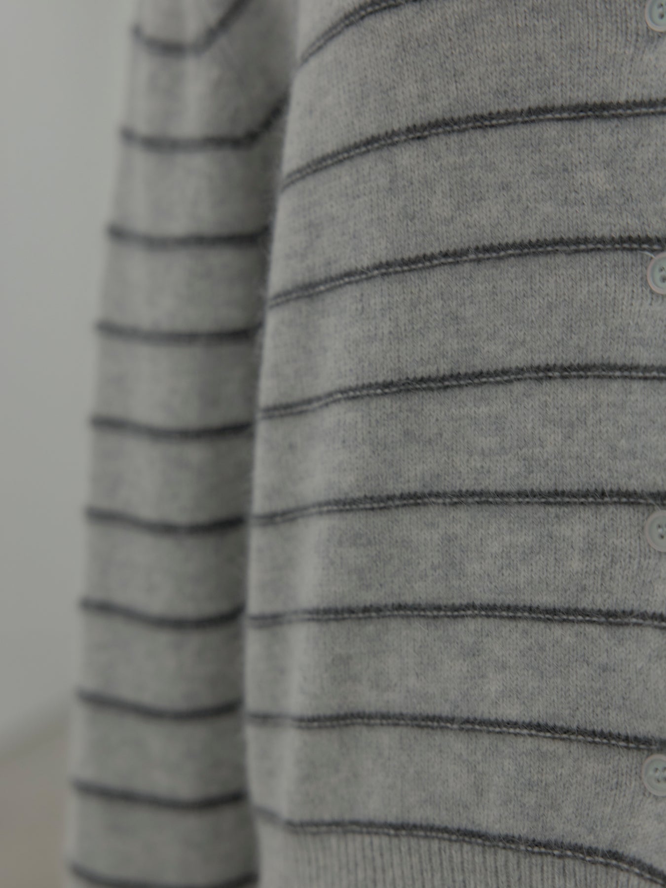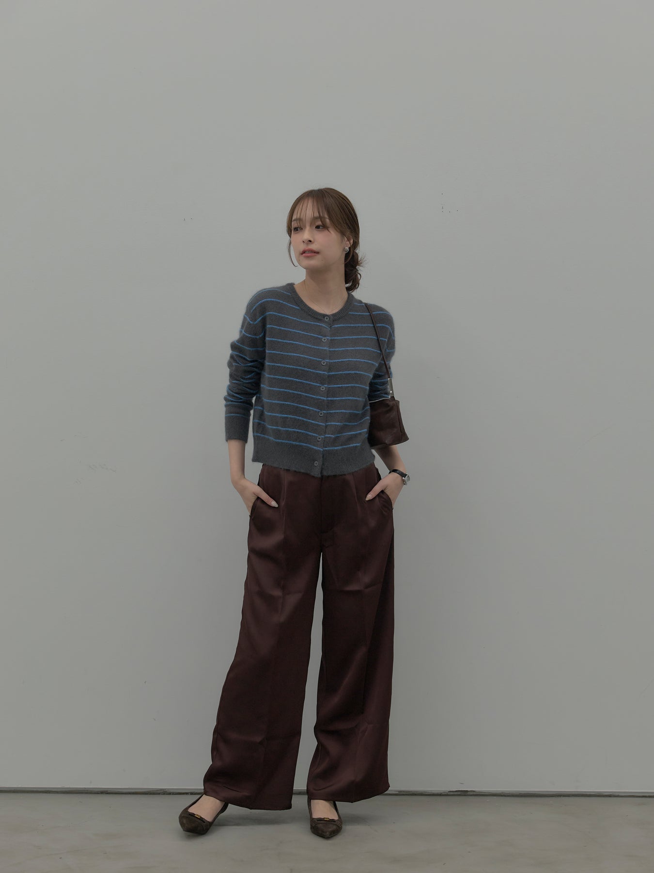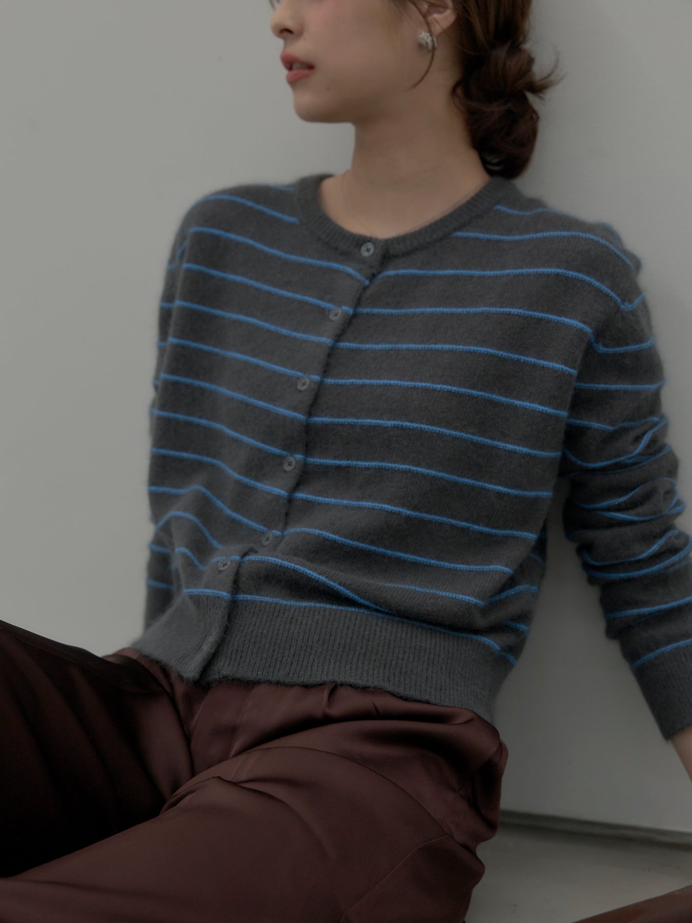 アルパカタッチのふんわり起毛感がリッチな印象を高めてくれるカーディガン。柔らかく包み込まれるような肌触りです。カジュアルなイメージの強いボーダーですが、素材感とピッチ細めのボーダーでnairoらしく上品に仕上がります。短めの丈でスタイリングしやすいのも嬉しいポイント。春先まで活躍してくれるカーディガンです。