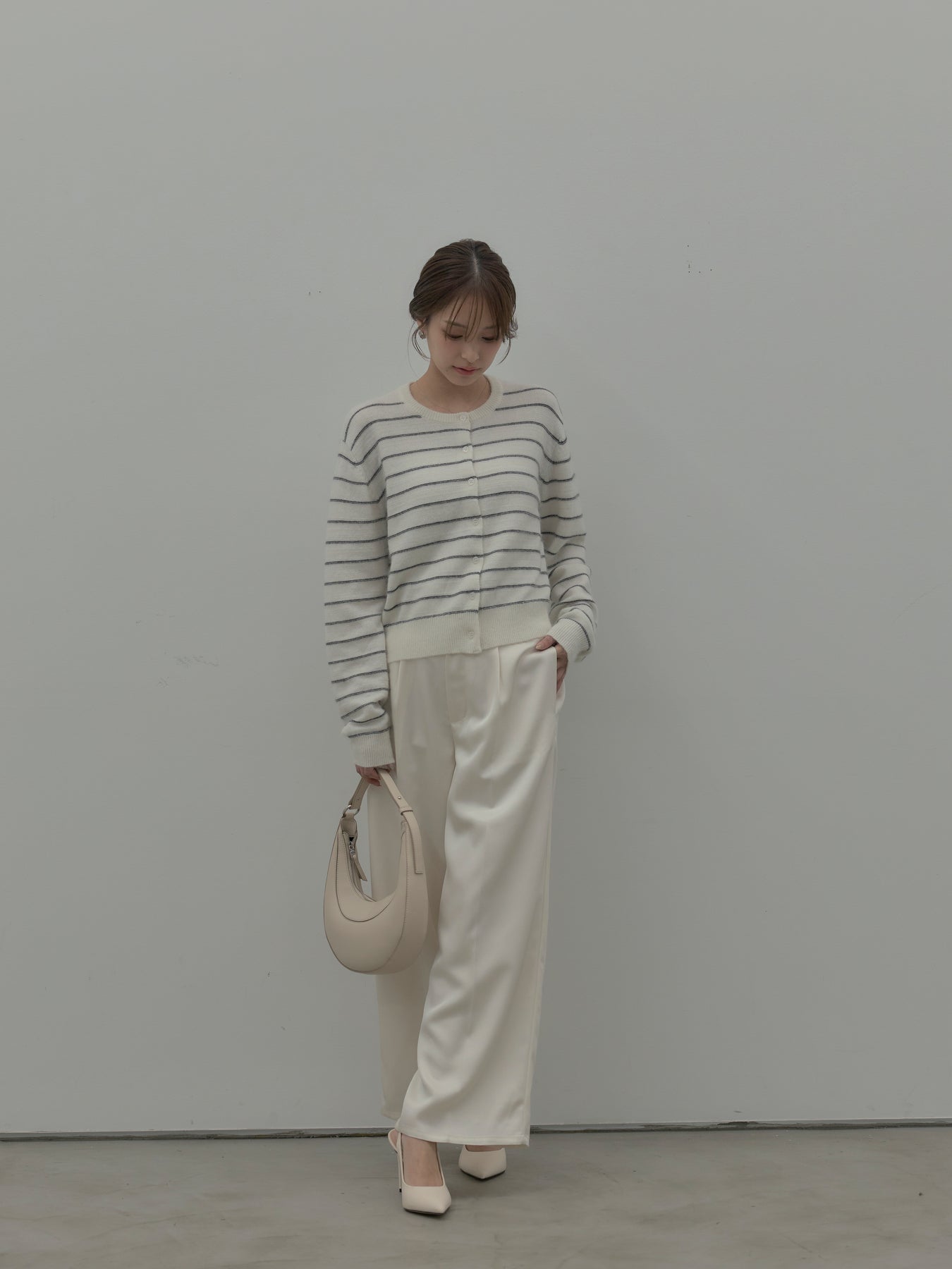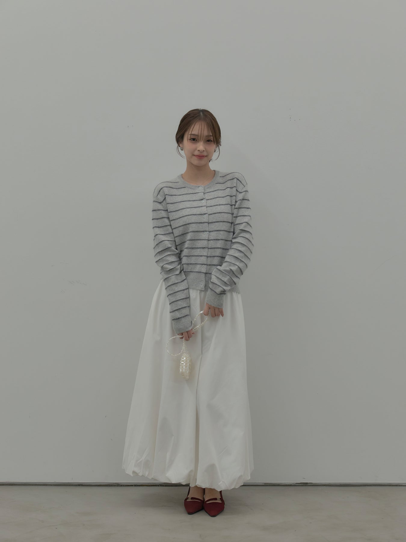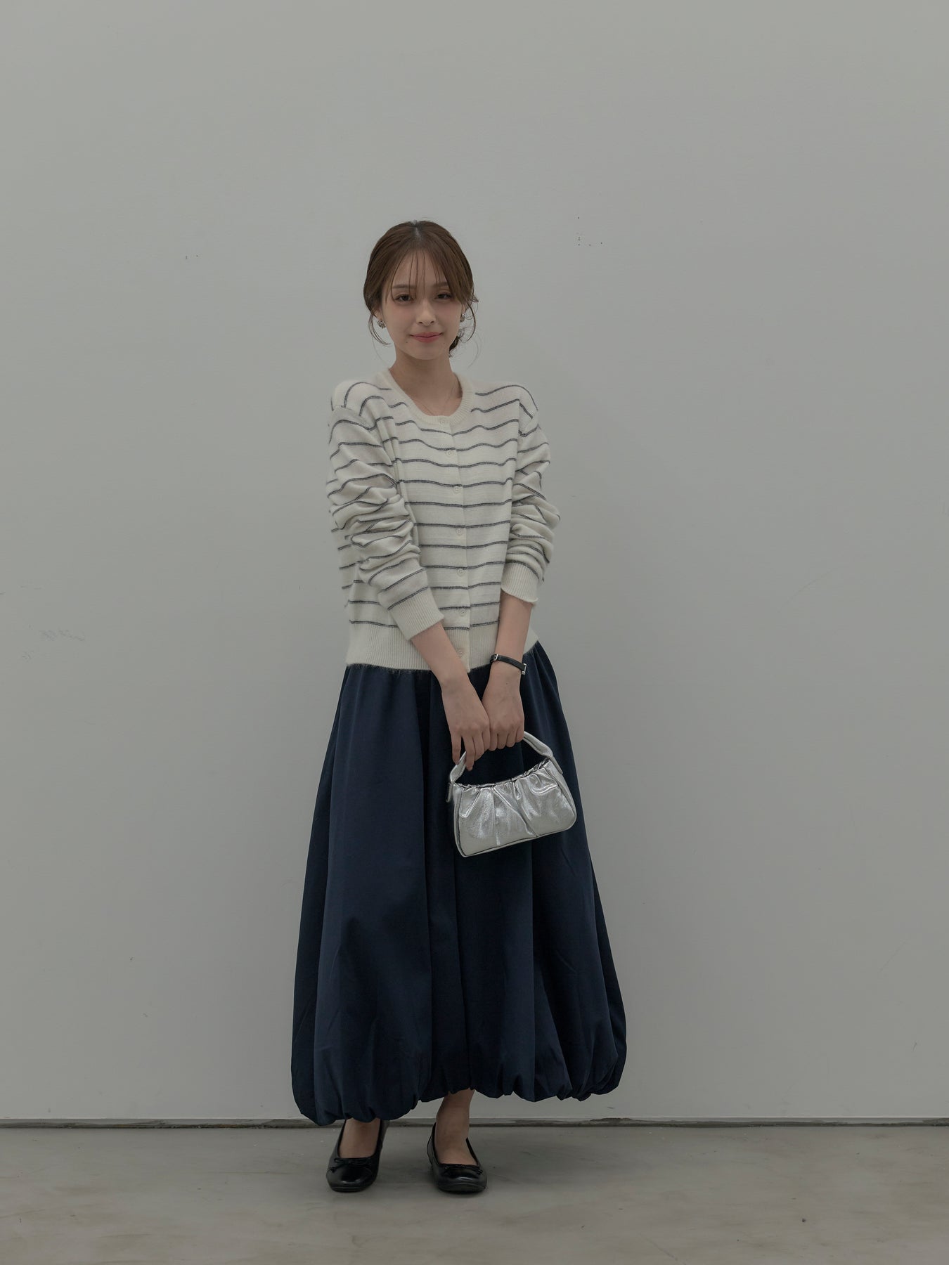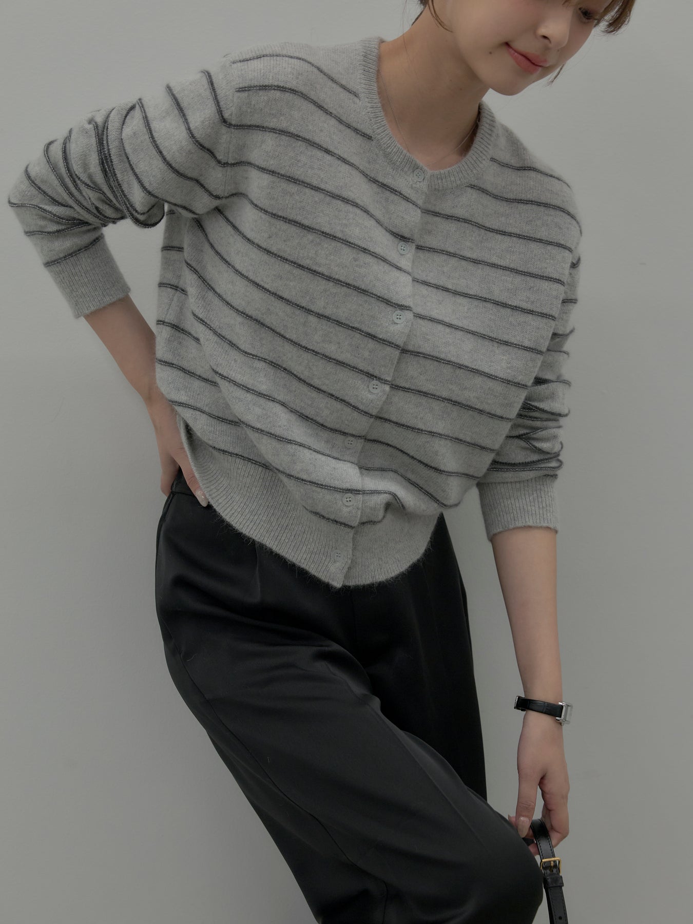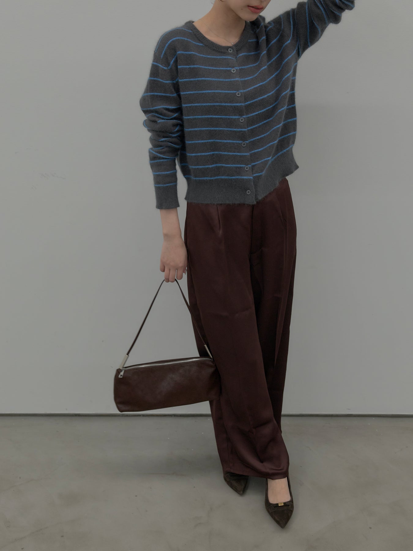 アルパカタッチのふんわり起毛感がリッチな印象を高めてくれるカーディガン。柔らかく包み込まれるような肌触りです。カジュアルなイメージの強いボーダーですが、素材感とピッチ細めのボーダーでnairoらしく上品に仕上がります。短めの丈でスタイリングしやすいのも嬉しいポイント。春先まで活躍してくれるカーディガンです。