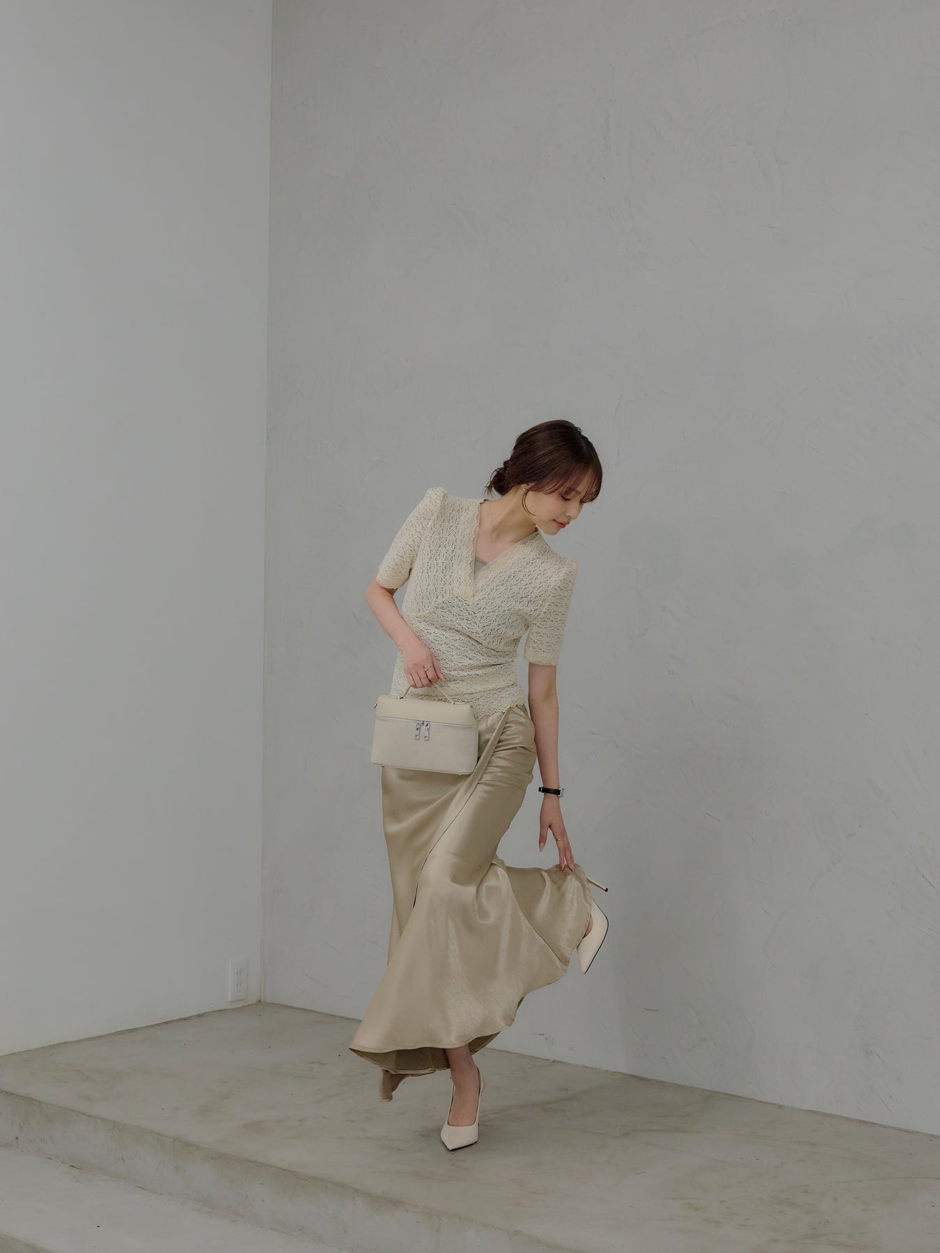 落ち感のあるサテン素材で仕立てた、マーメイドシルエットのスカート。 腰まわりはすっきりと、裾に向かって自然に広がるラインが、歩く所作まできれいに見せます。 ラップされたようなデザインで、直線的になりすぎず、さりげない動きをプラス。 トップスをインしてもアウトしてもバランスが取りやすく、合わせるアイテムを選びません。 女性らしさは残しつつ、甘さに寄らない設計。 日常にもきちんとした場面にも対応できる一枚です。
