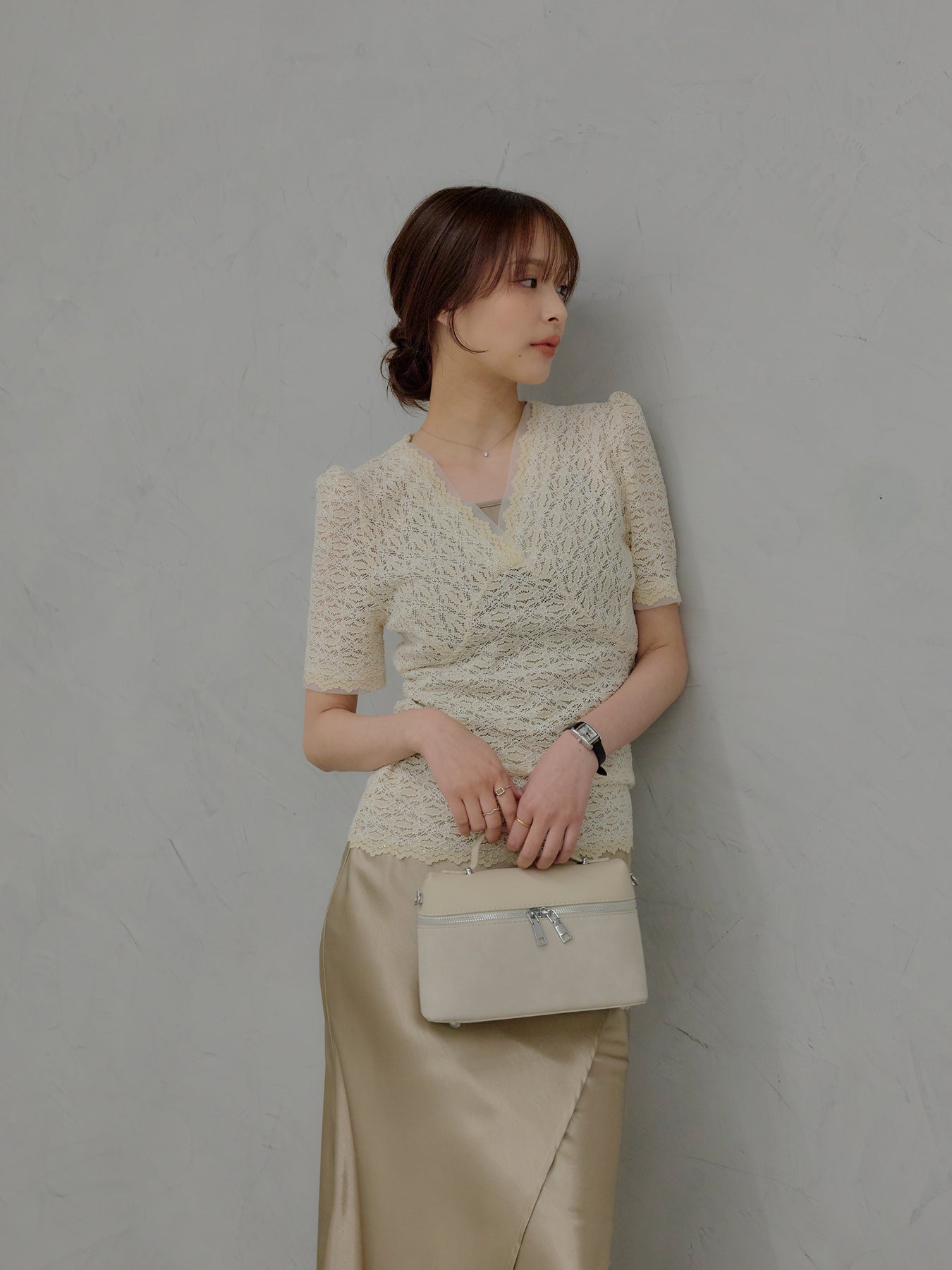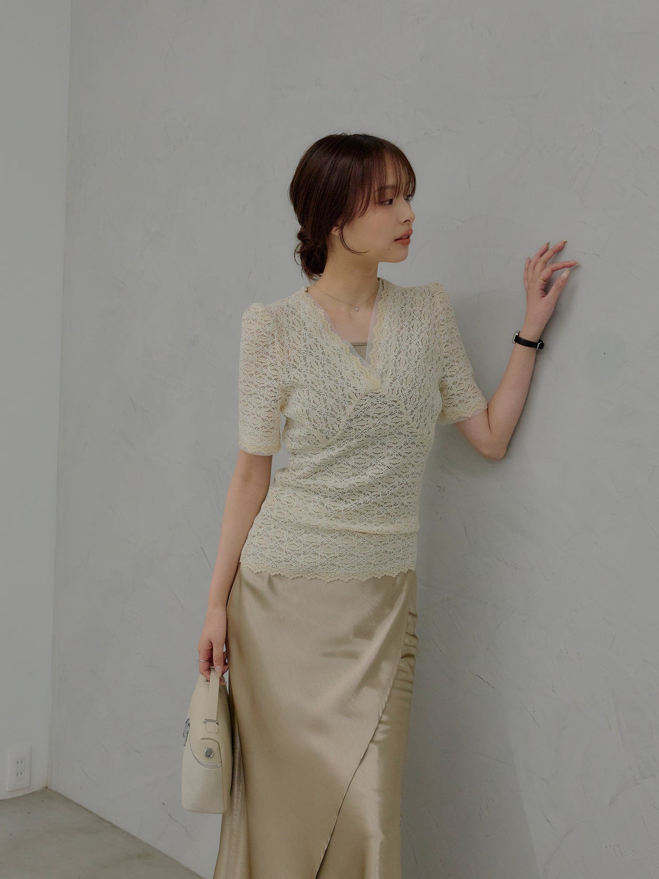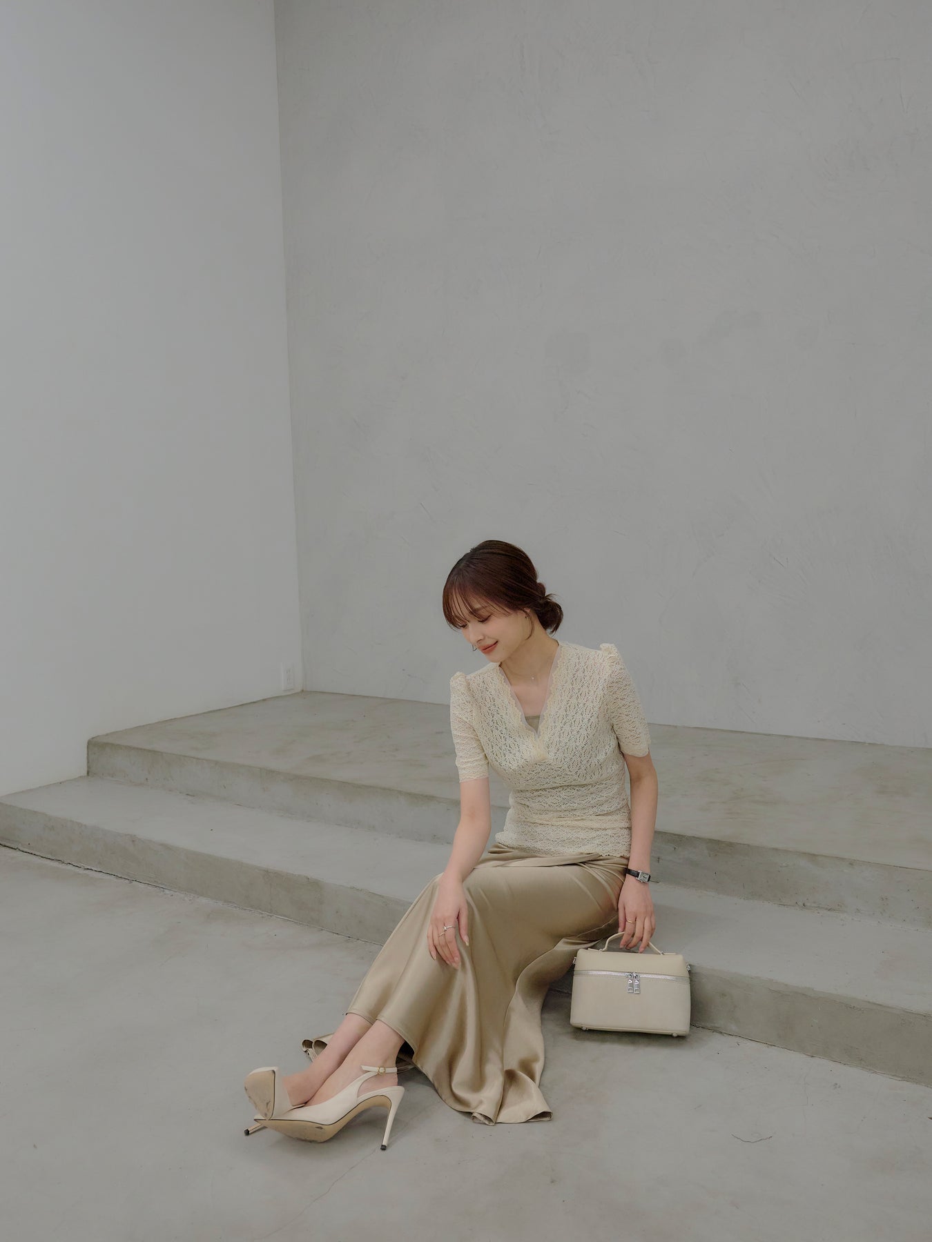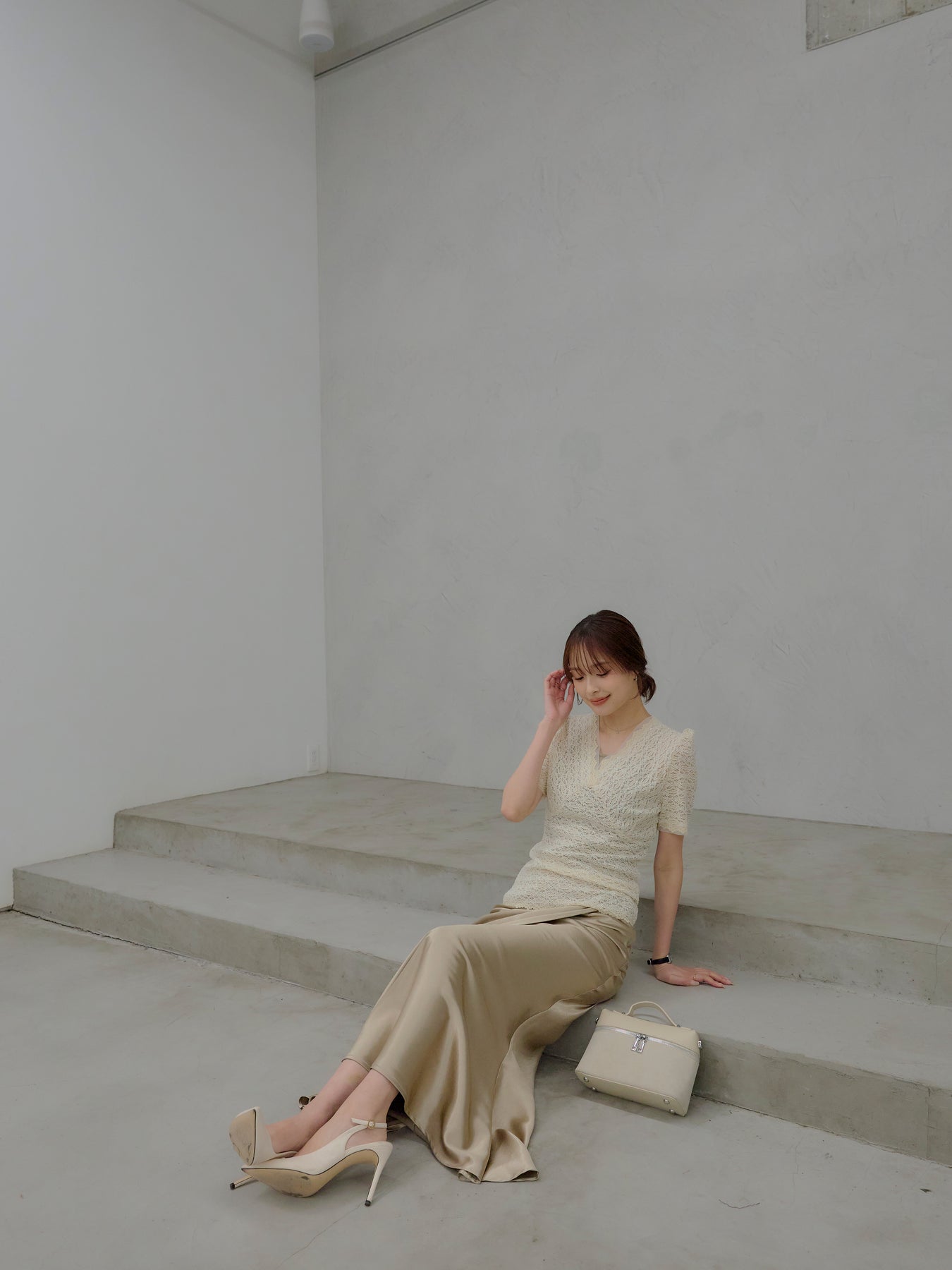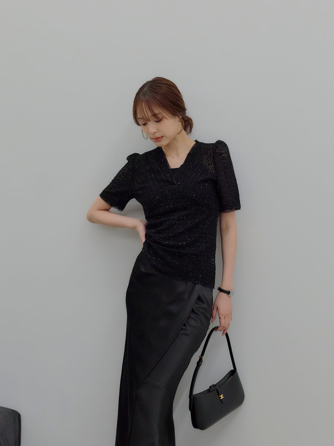 【SET】チュールレイヤードグリッターレースパフスリーブトップス+【Essential】Wrap design satin mermaid skirt(2set)