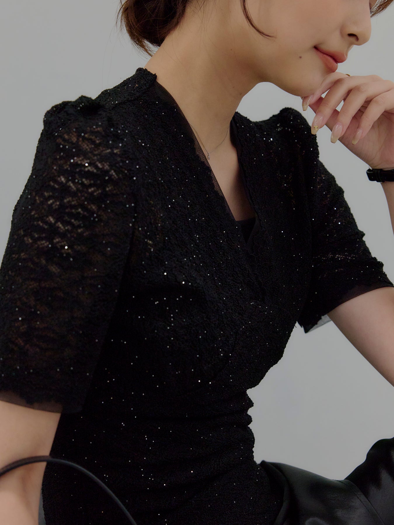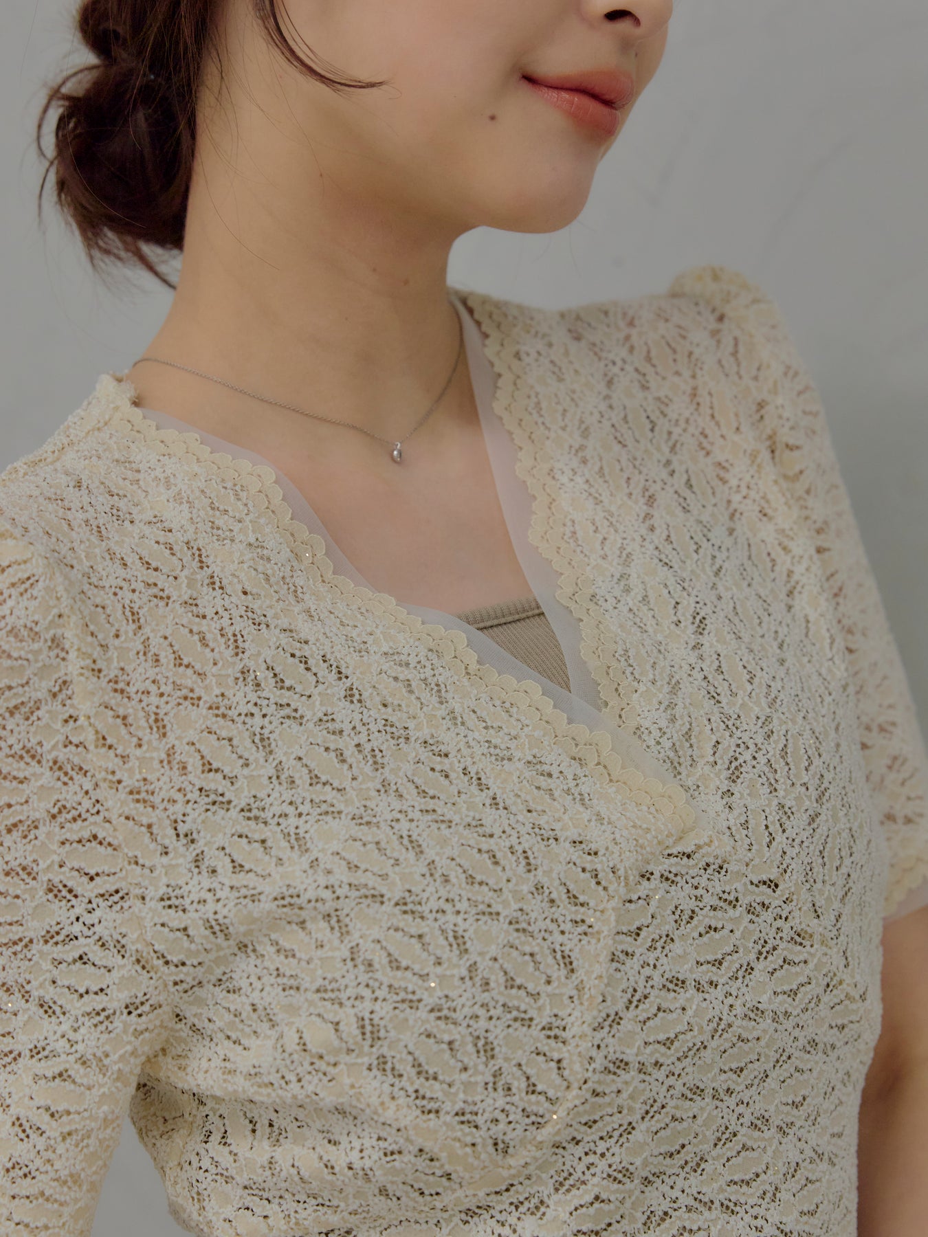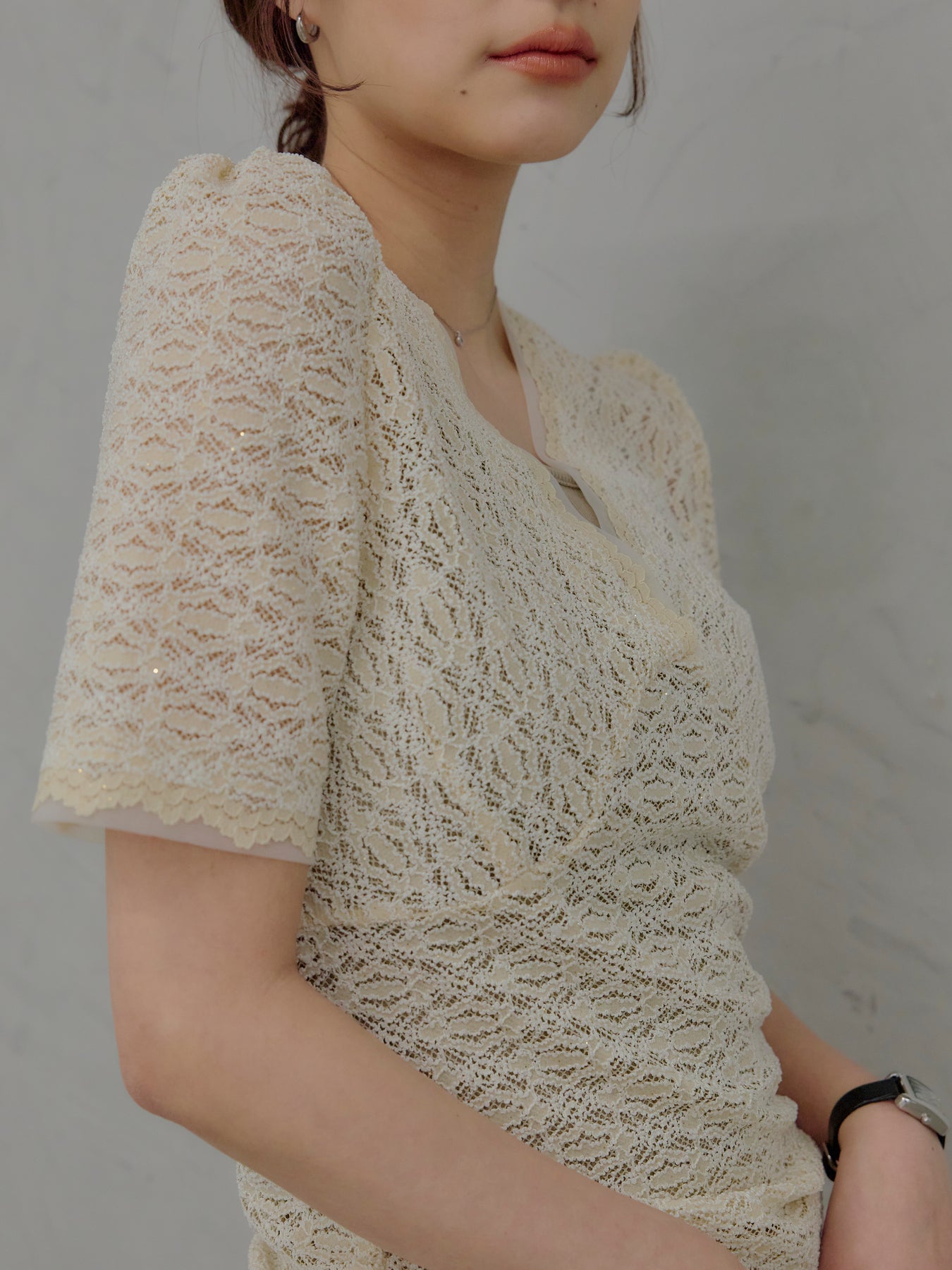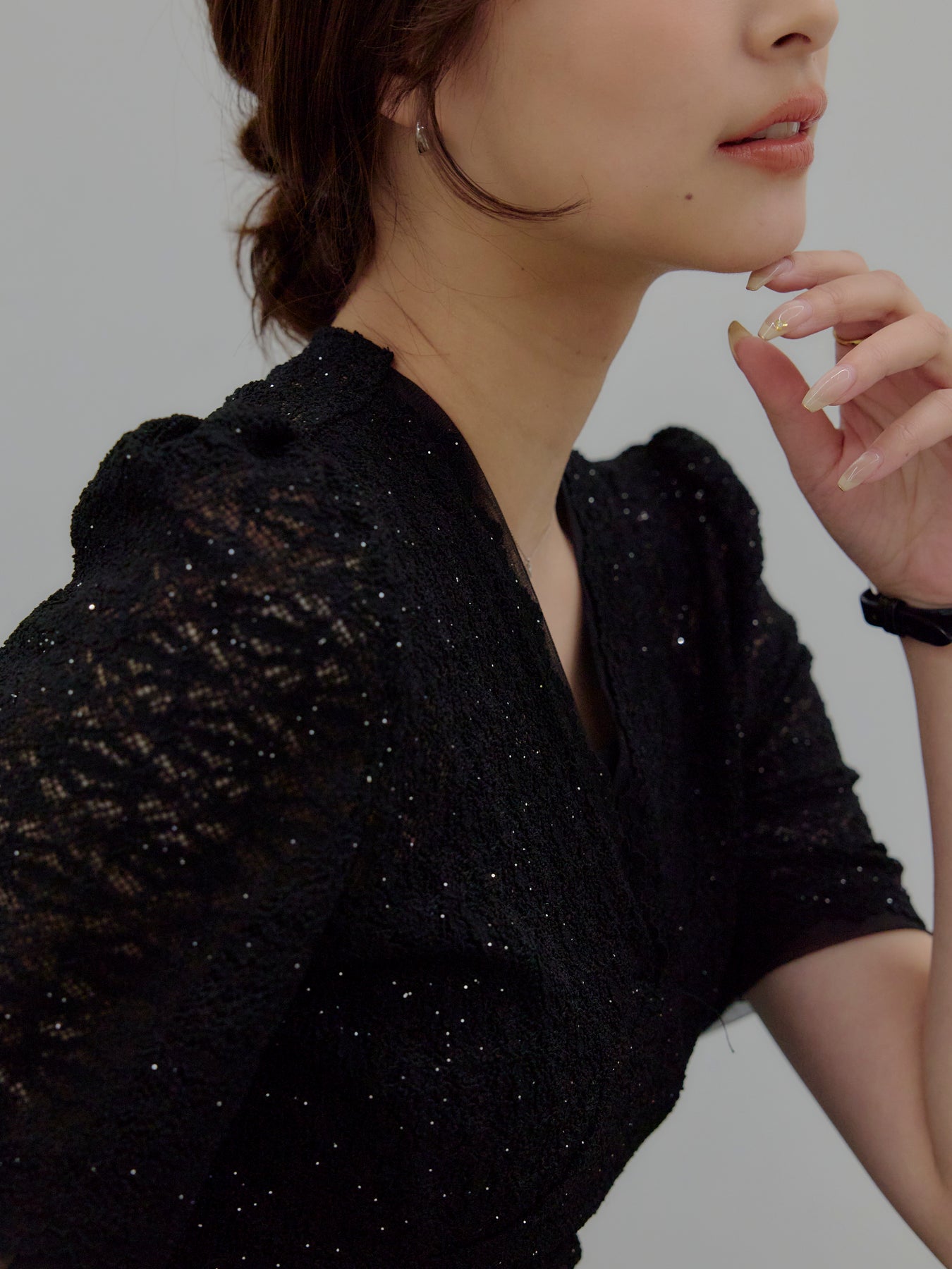 ◆ チュールレイヤードグリッターレースパフスリーブトップス