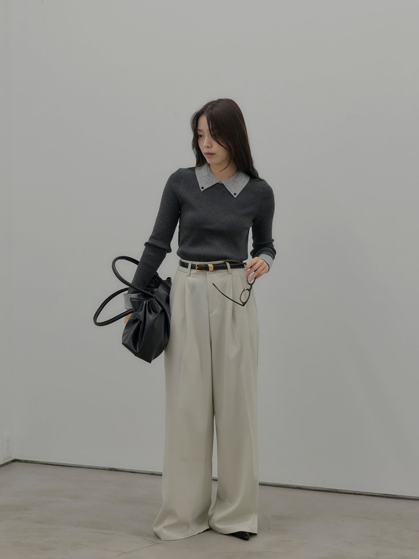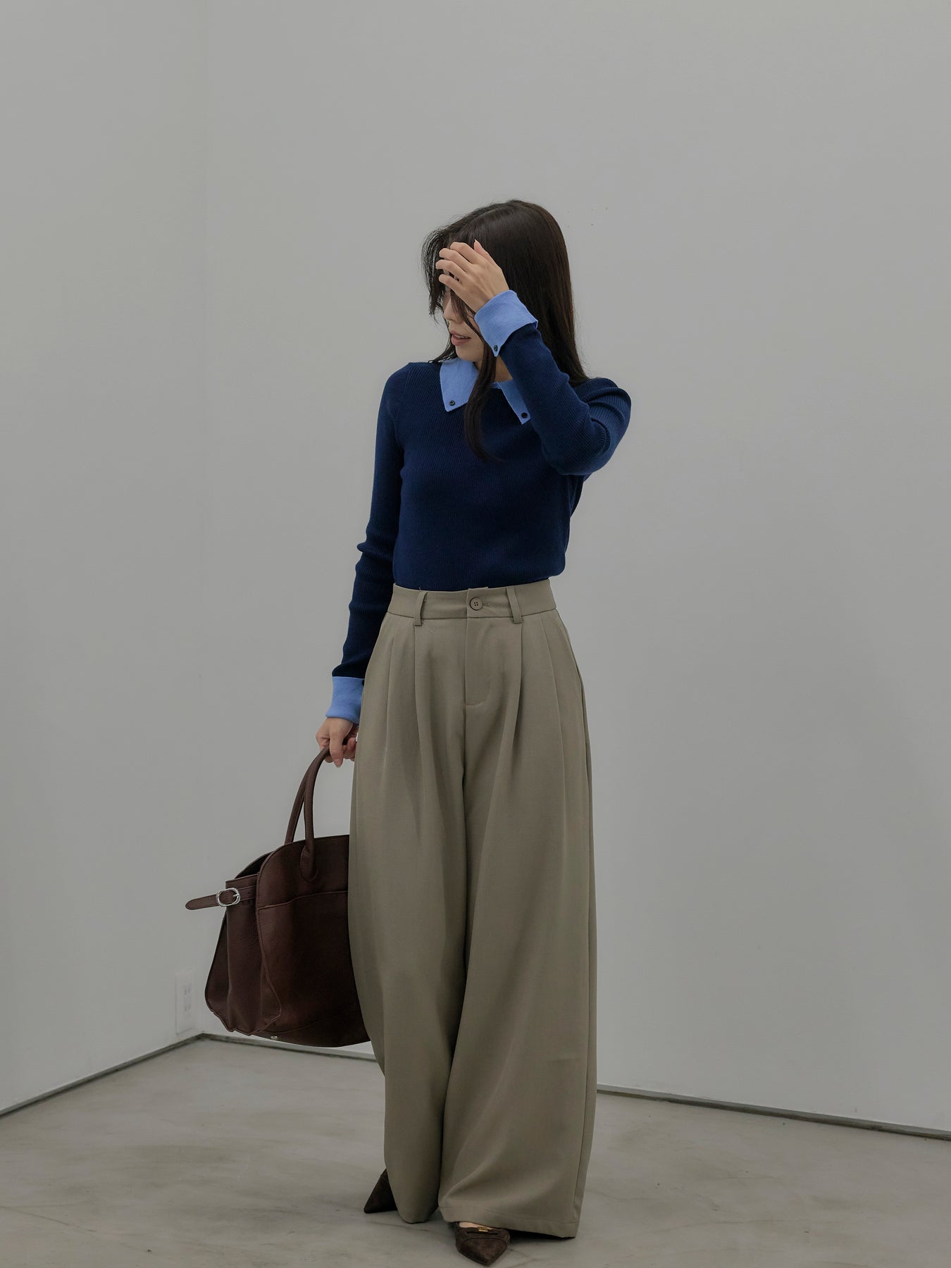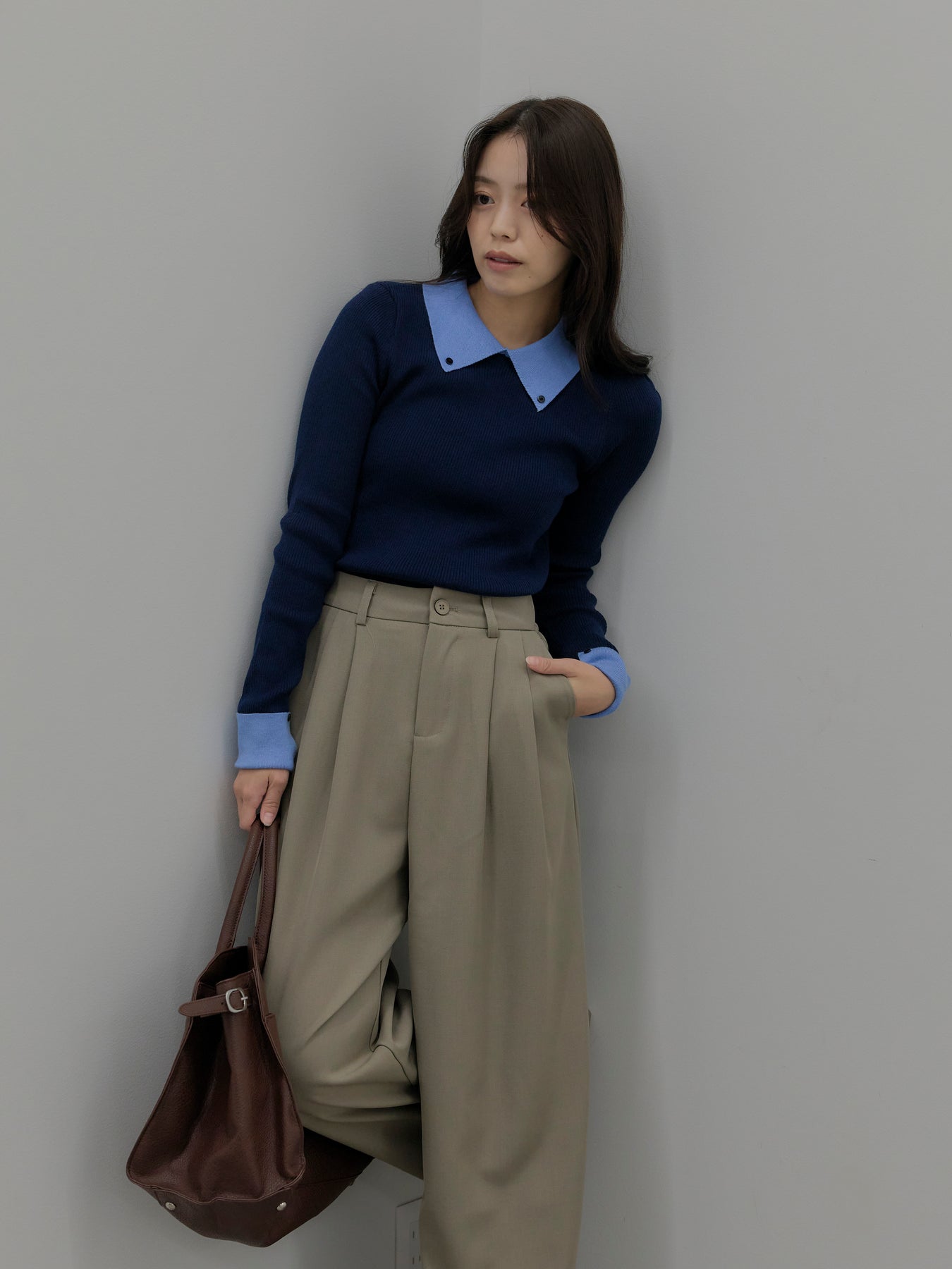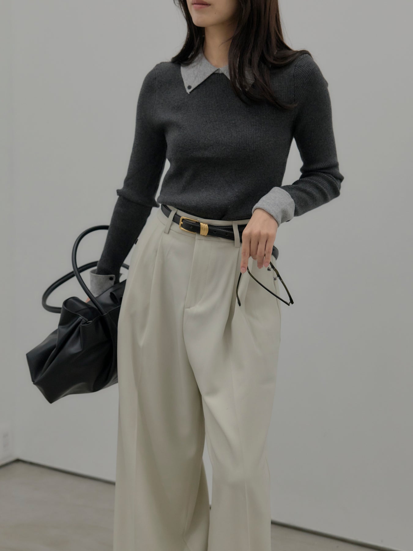 【SET】配色カフスニットポロ+デザインタックワイドパンツ(2set)