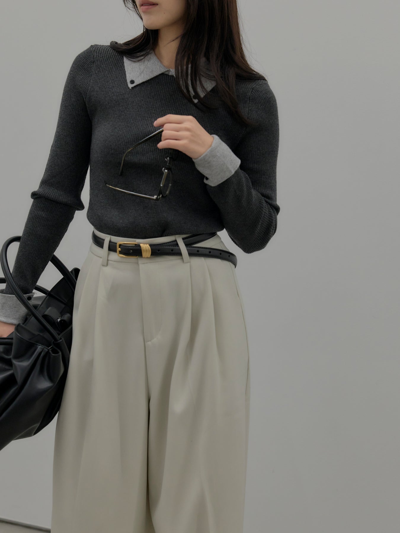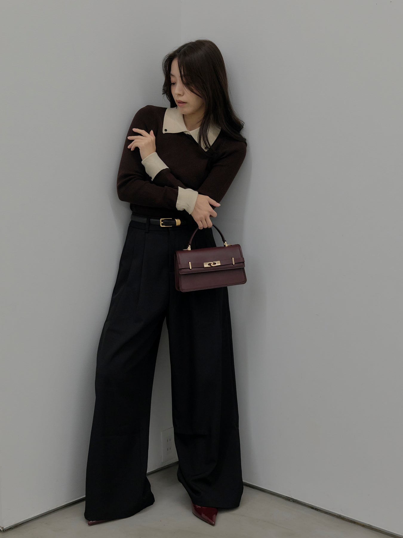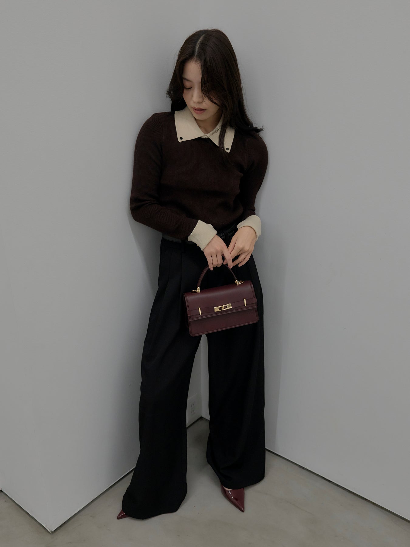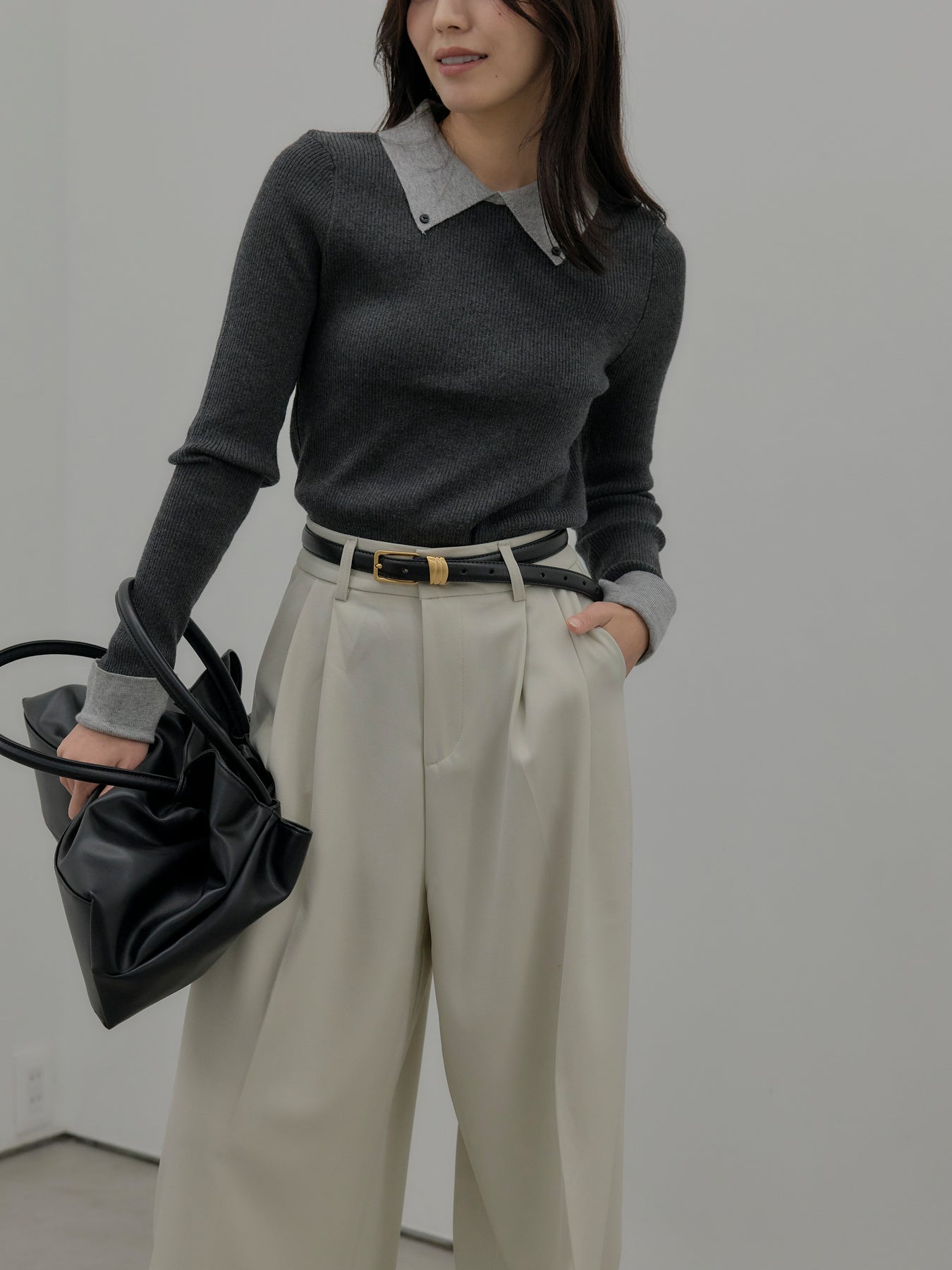 【SET】配色カフスニットポロ+デザインタックワイドパンツ(2set)